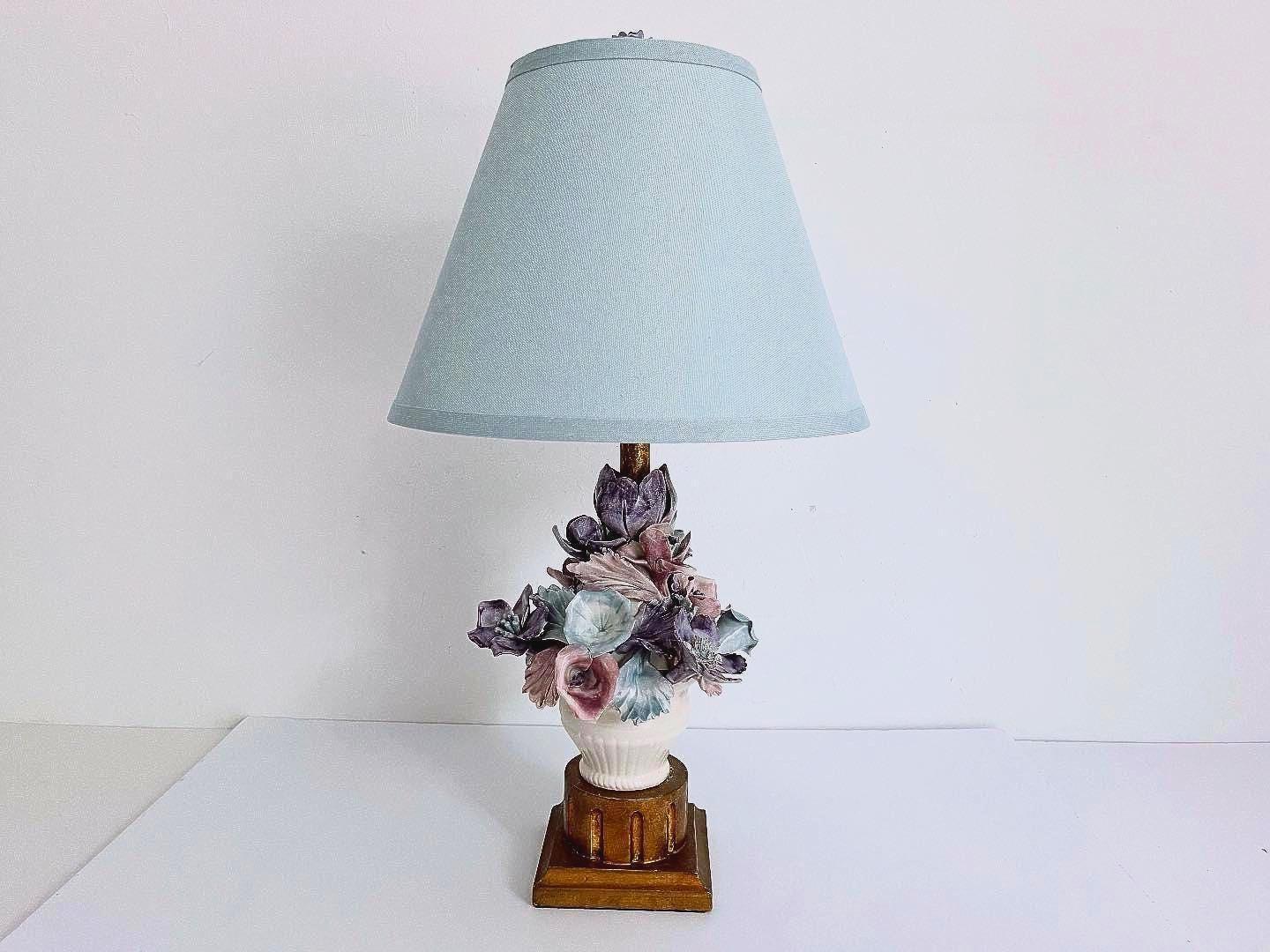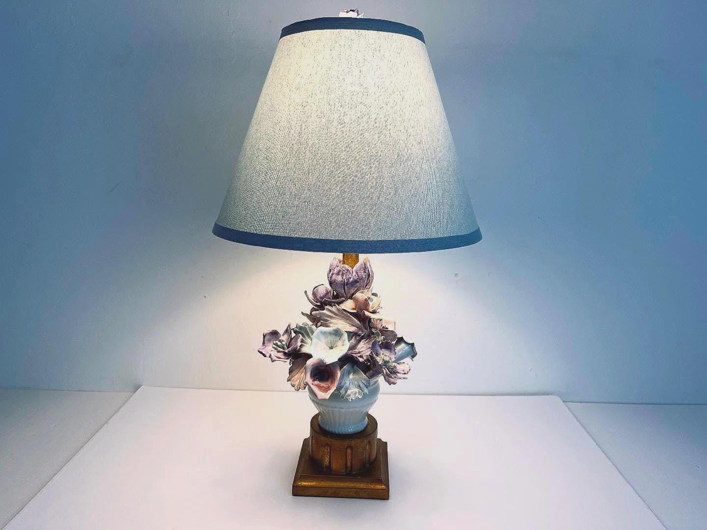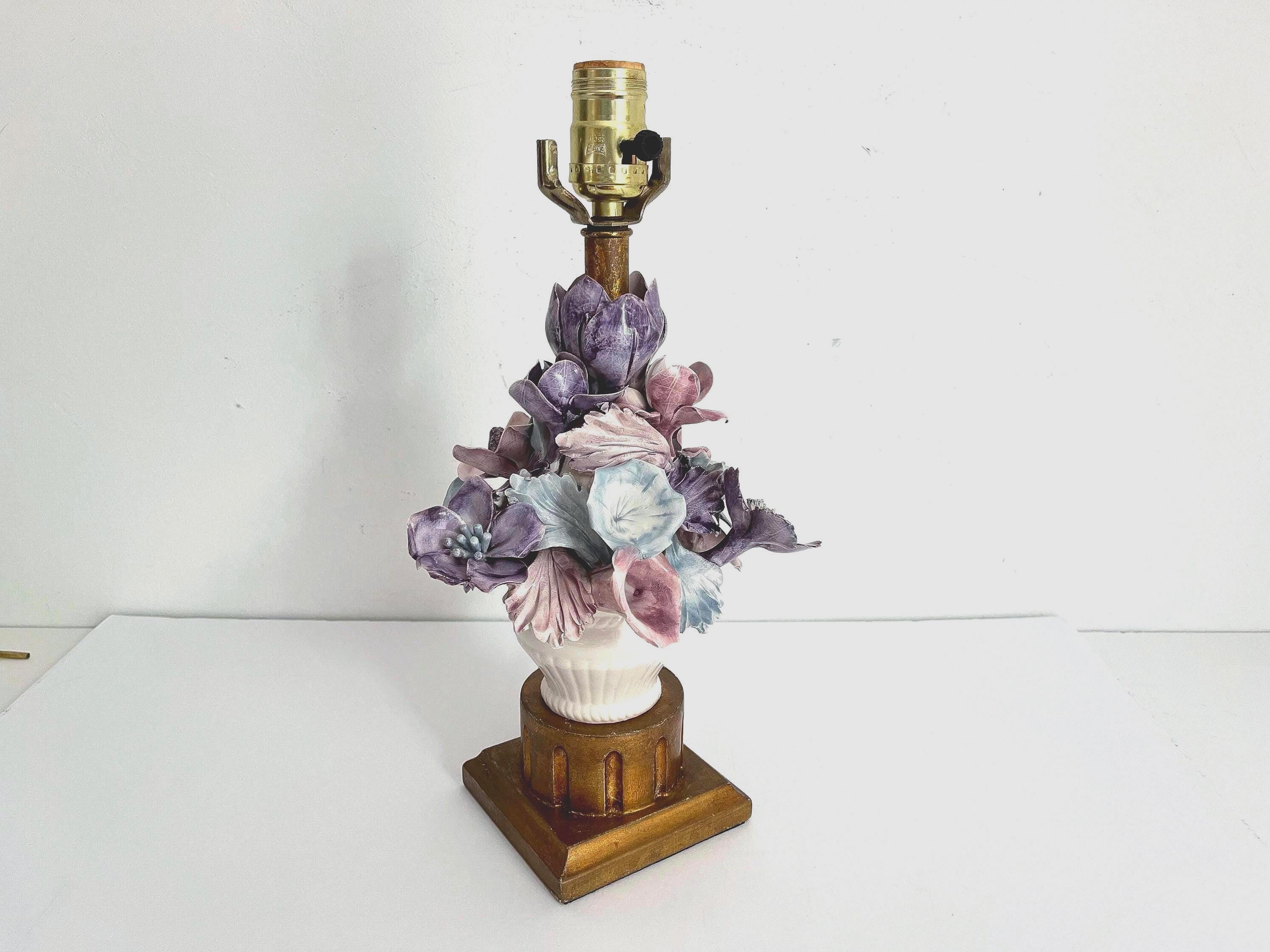 Lovely 1950s Italian Capodimonte porcelain bouquet lamp of hand crafted and applied soft blue, purple, and pink flowers artfully arranged in a fluted pot set into a gilt wood column base. Reminds me of a bridal bouquet.