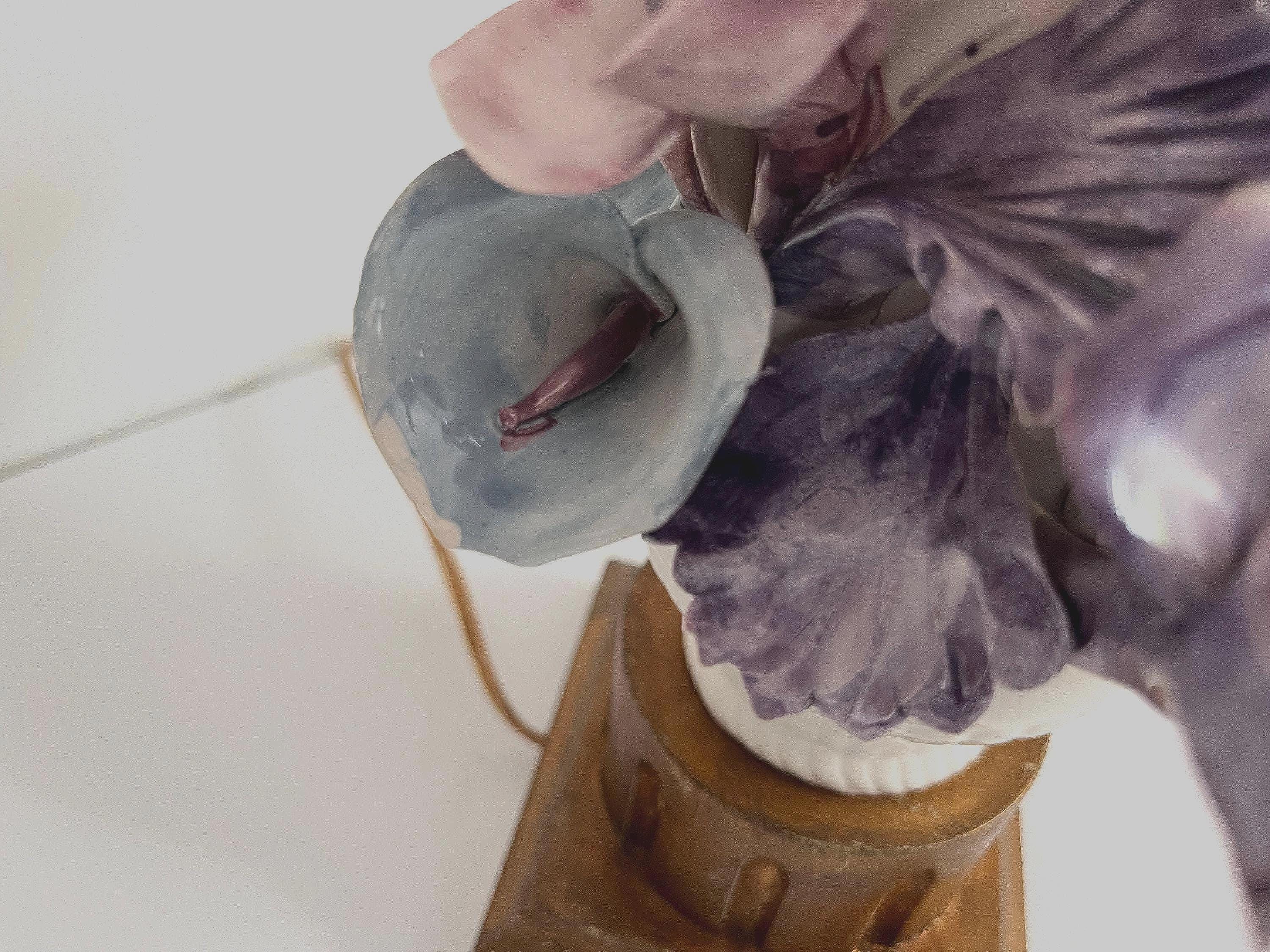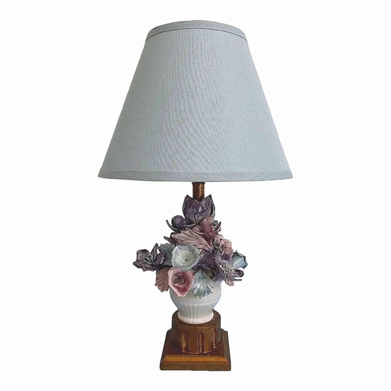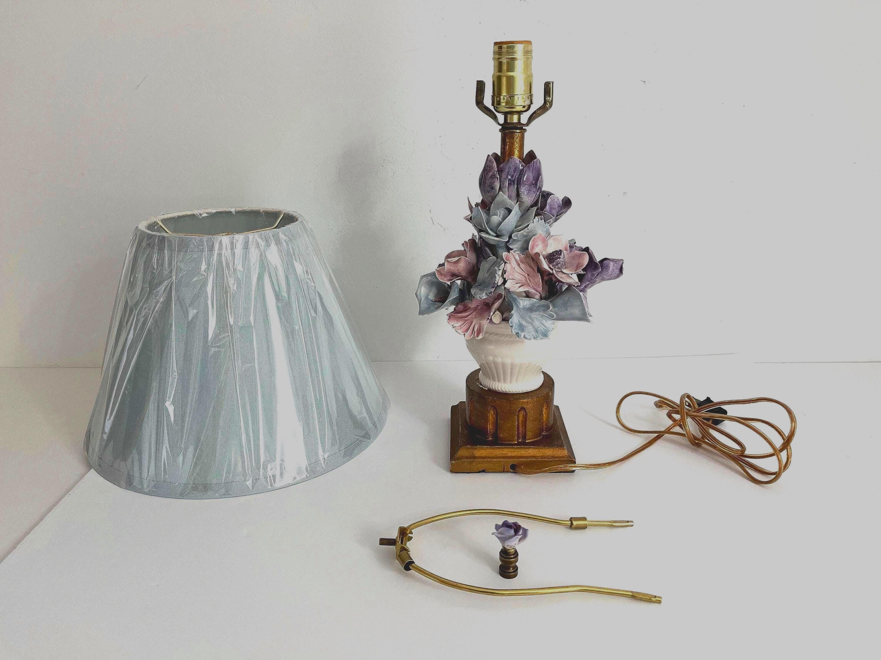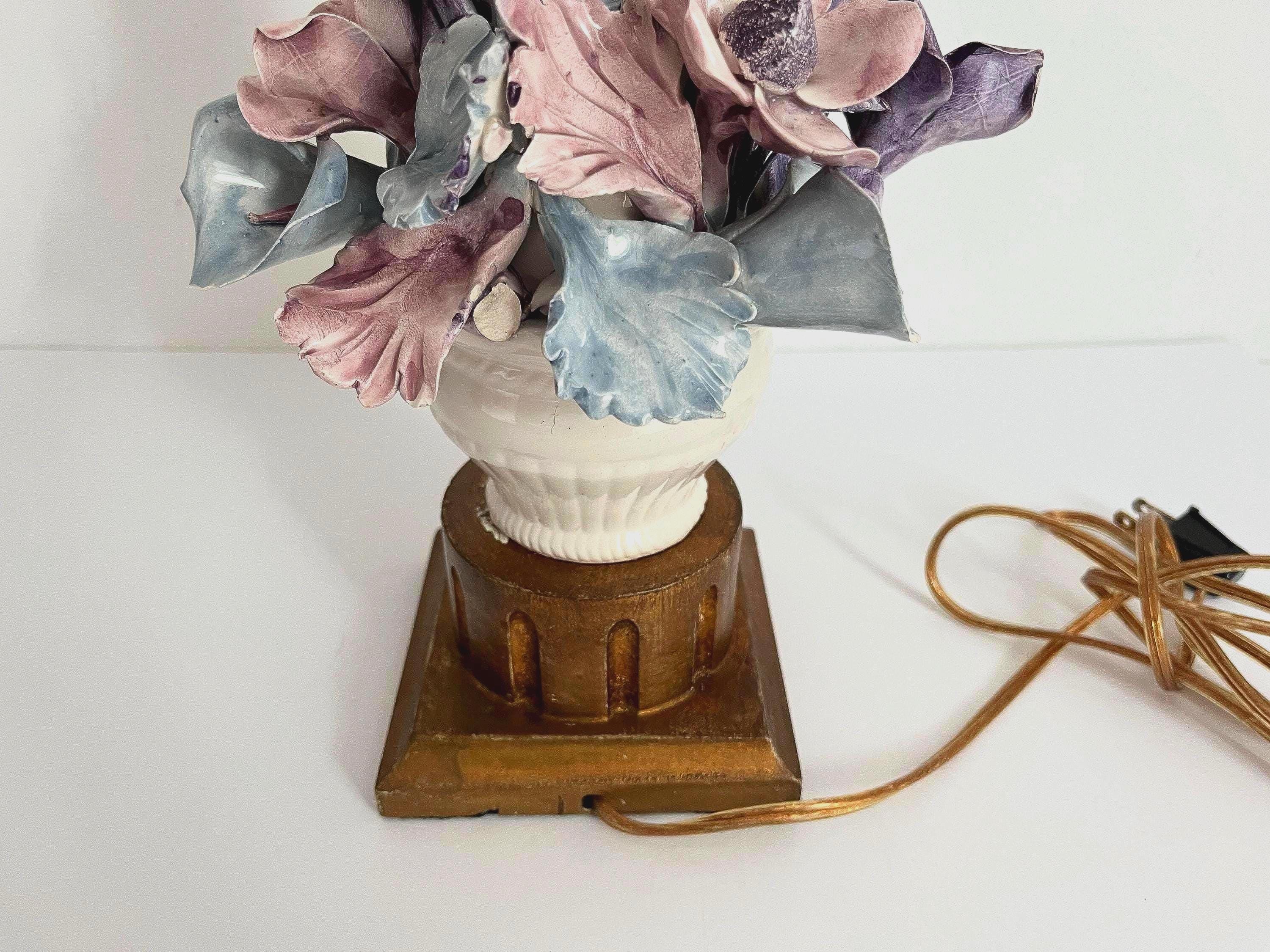 Lovely 1950s Italian Capodimonte porcelain bouquet lamp of hand crafted and applied soft blue, purple, and pink flowers artfully arranged in a fluted pot set into a gilt wood column base. Reminds me of a bridal bouquet.