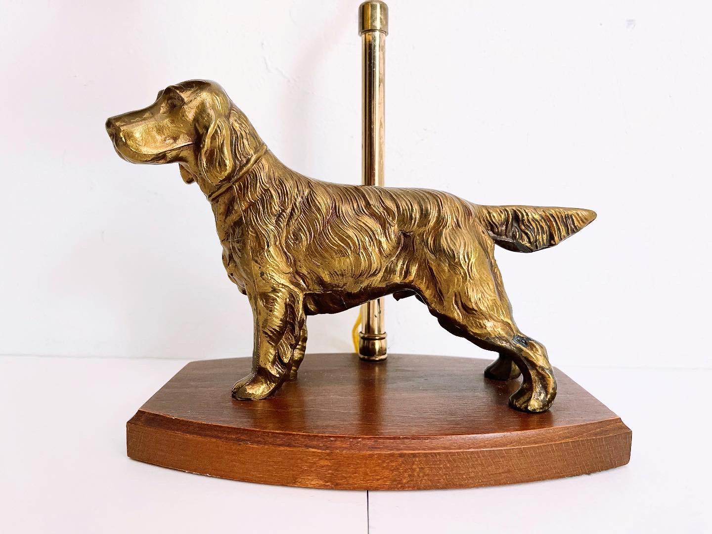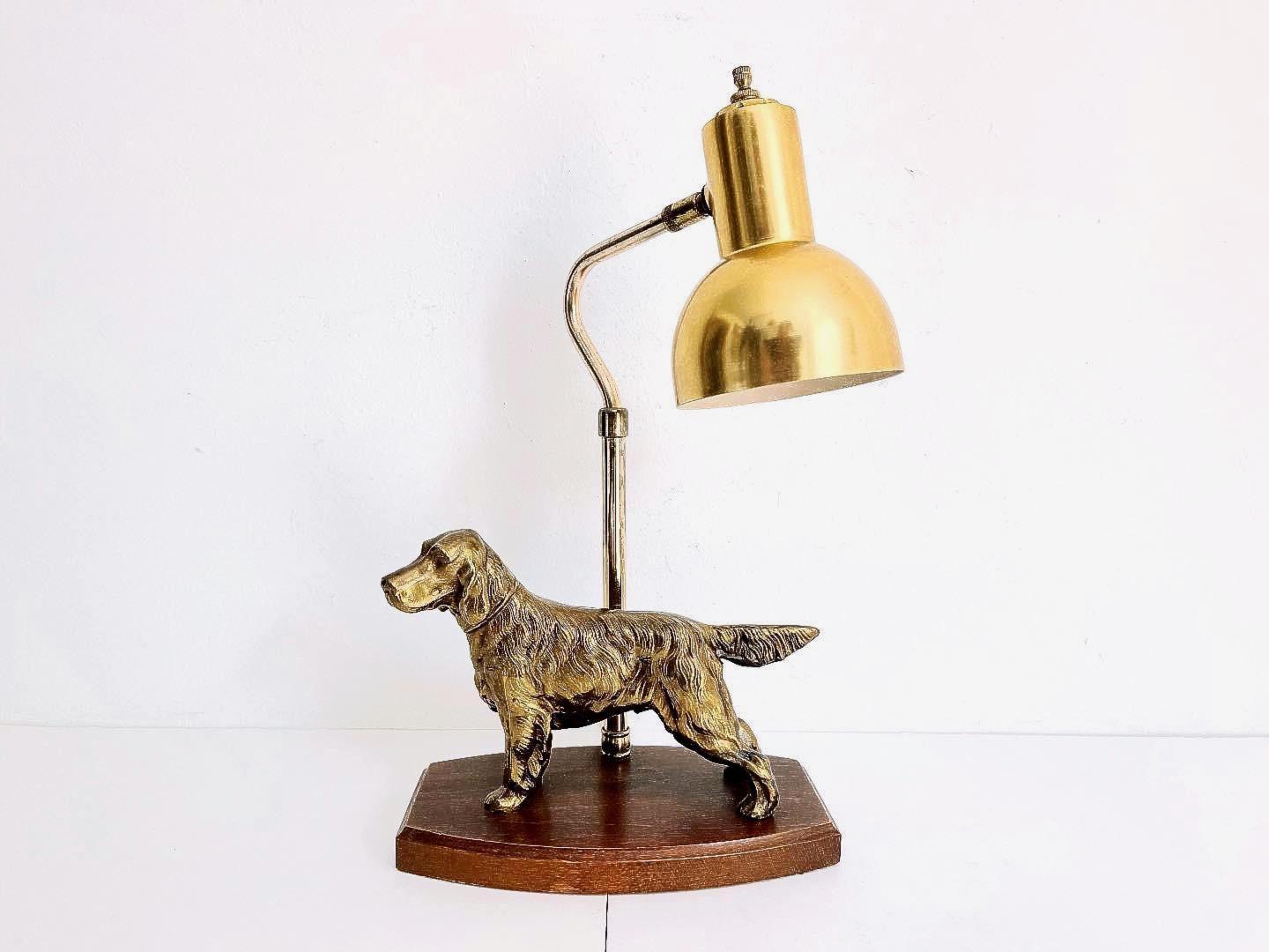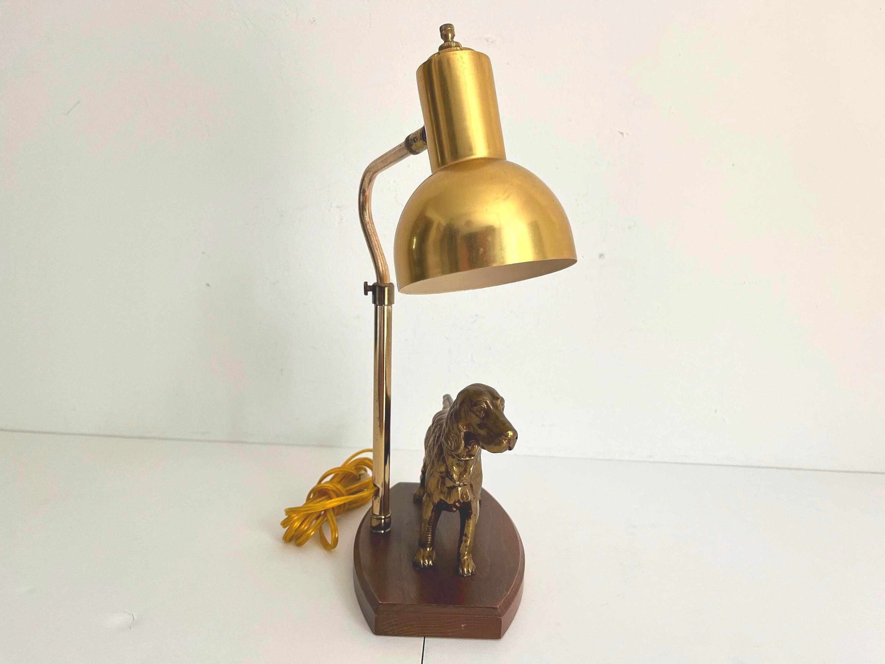 Fabulous dog statue desk lamp from the 1960s with cast metal golden retriever standing in profile with lifelike detailing, pivotal gold metal shade, and swing-arm neck on original oval wood base.