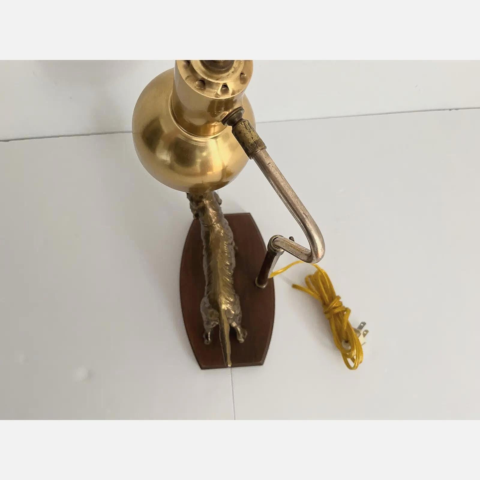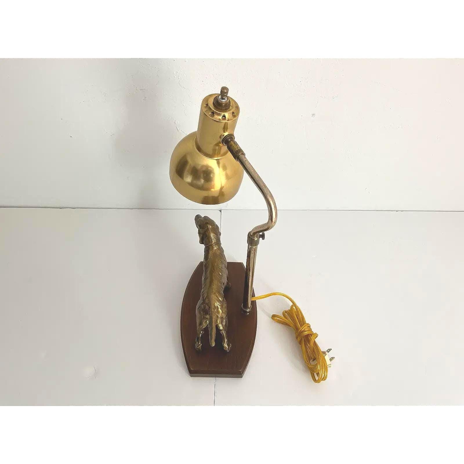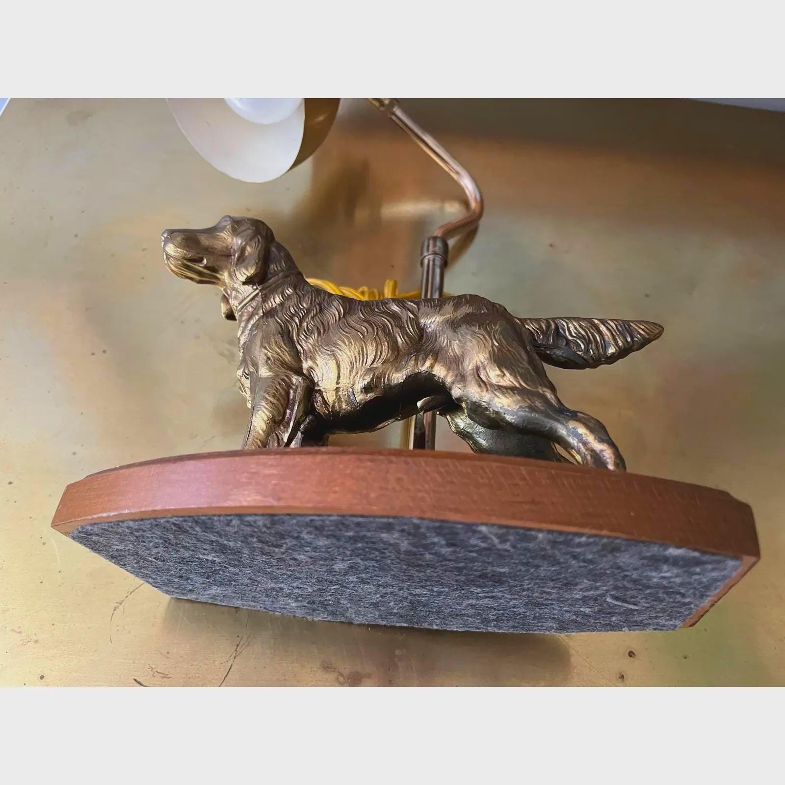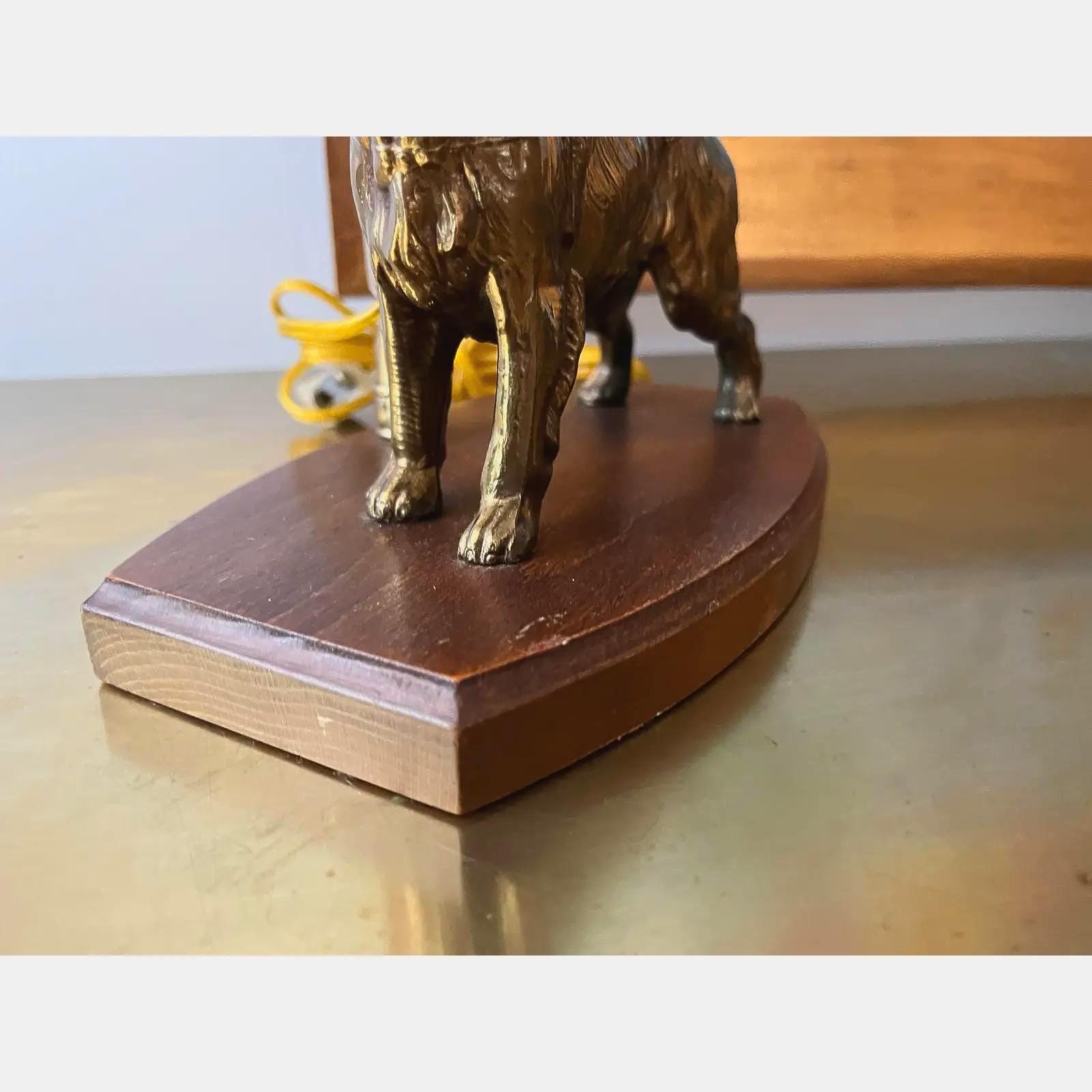 Fabulous dog statue desk lamp from the 1960s with cast metal golden retriever standing in profile with lifelike detailing, pivotal gold metal shade, and swing-arm neck on original oval wood base.
