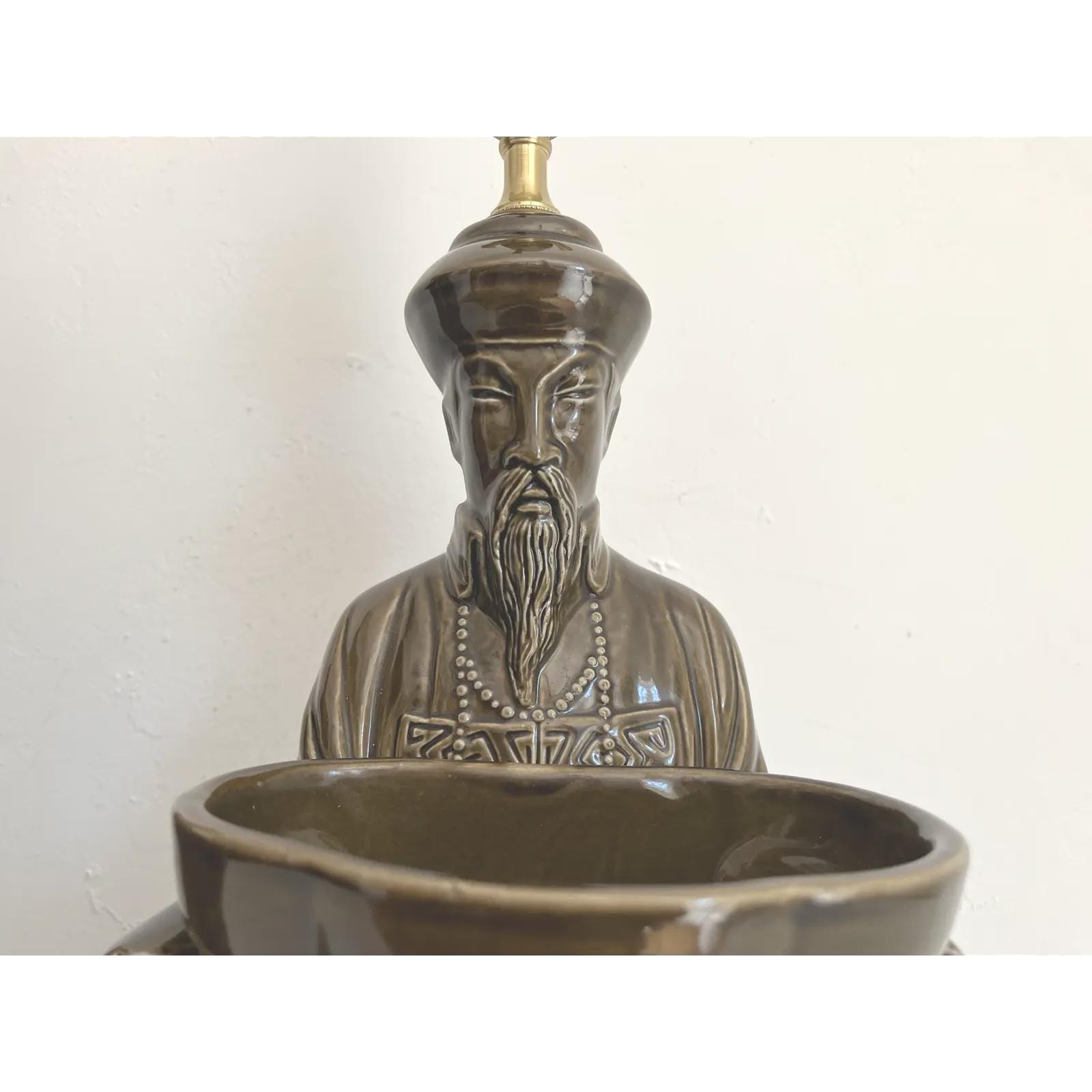 Exquisite, big pair of mid century glazed olive green ceramic Asian scholar lamps in ceremonial robes holding open planters on scalloped and embossed metal bases. Finished on all sides with incised Greek key motifs, beading, braiding, and guilloche borders.