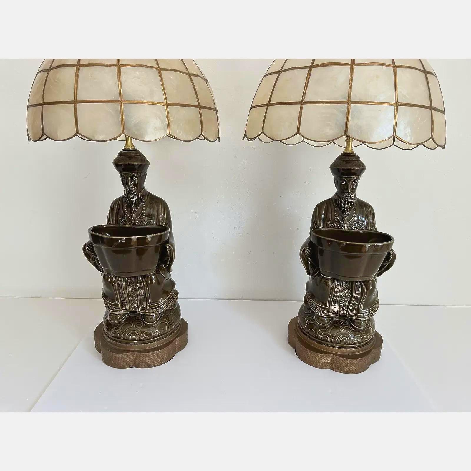 Professionally restored with new wiring, sockets, and fittings for standard bulbs. Vintage mid century Capiz shell shades, harps, and vintage finials are included. The basins may be filled with plants, keys, jewelry, remotes, etc.