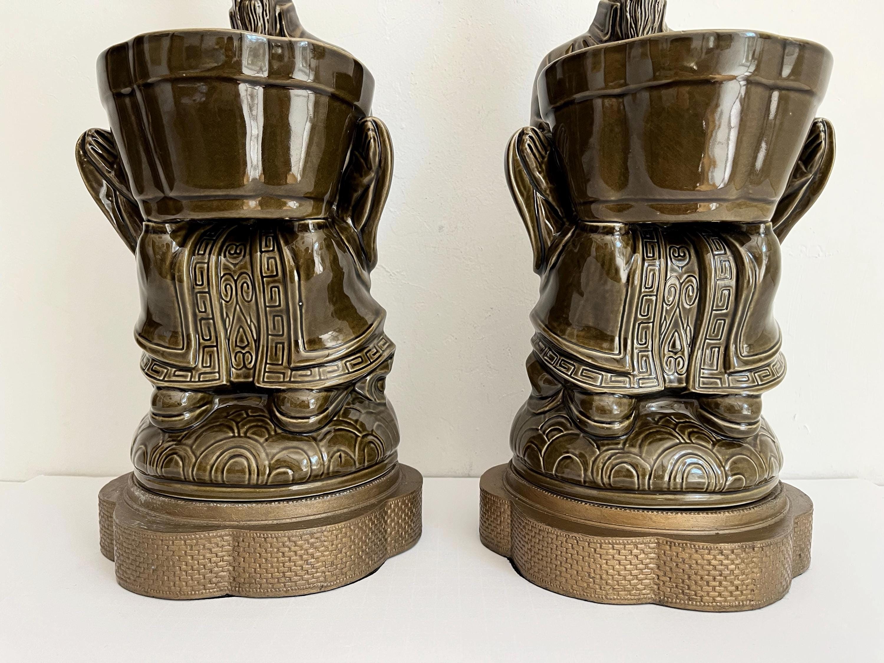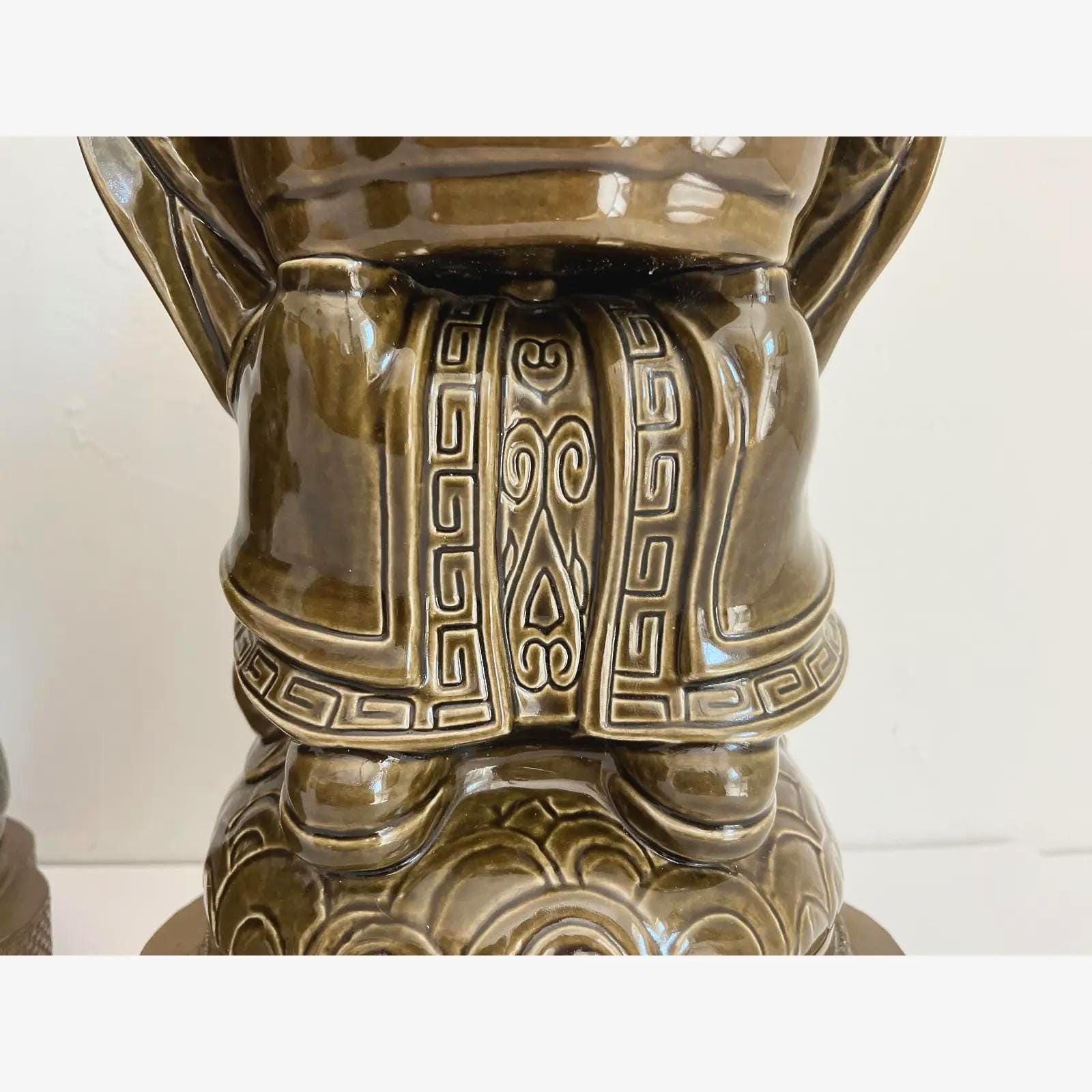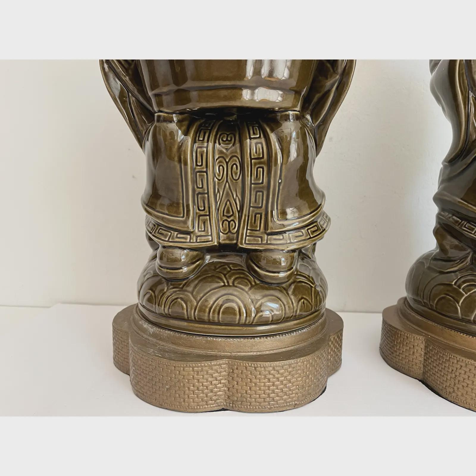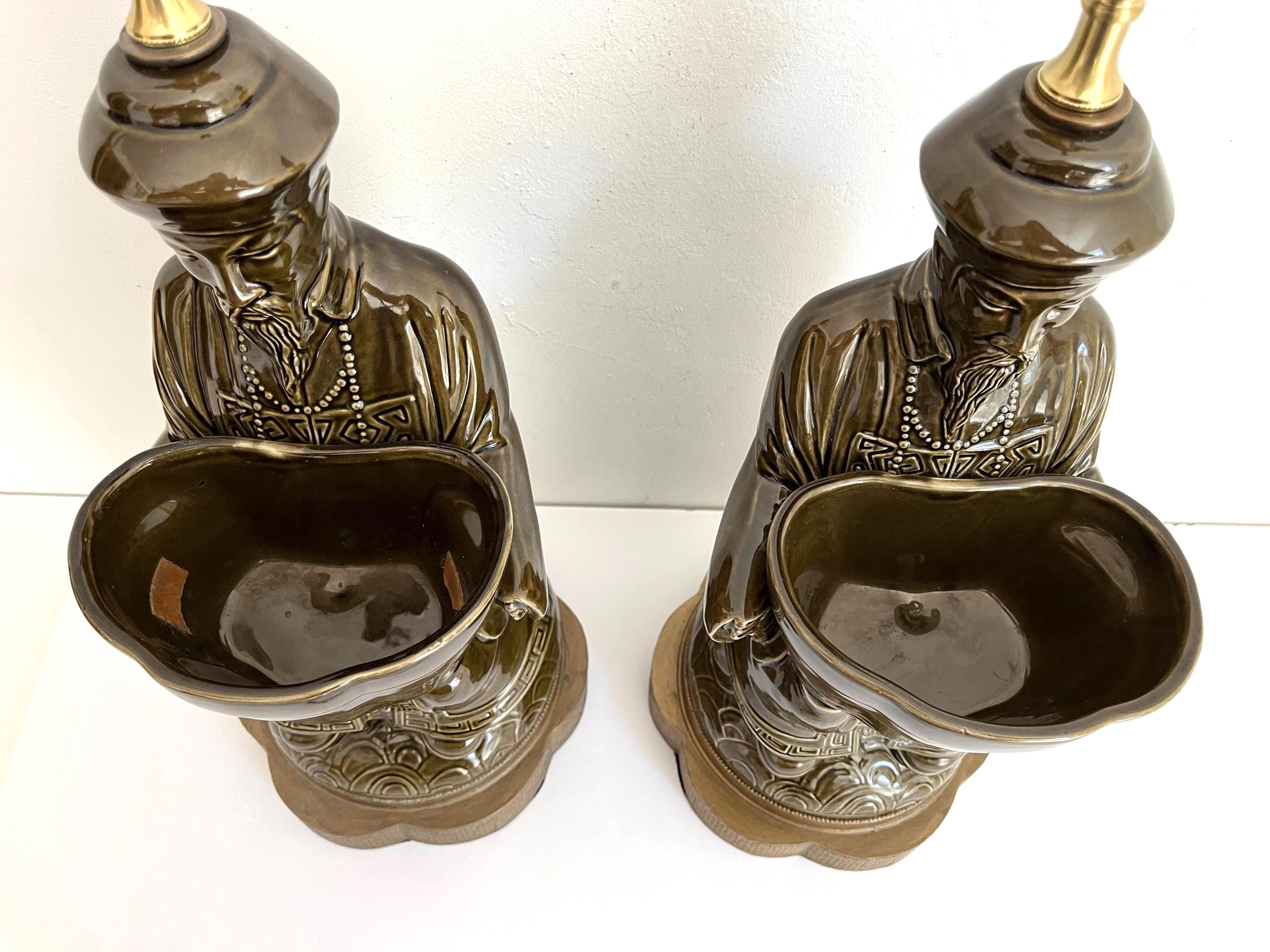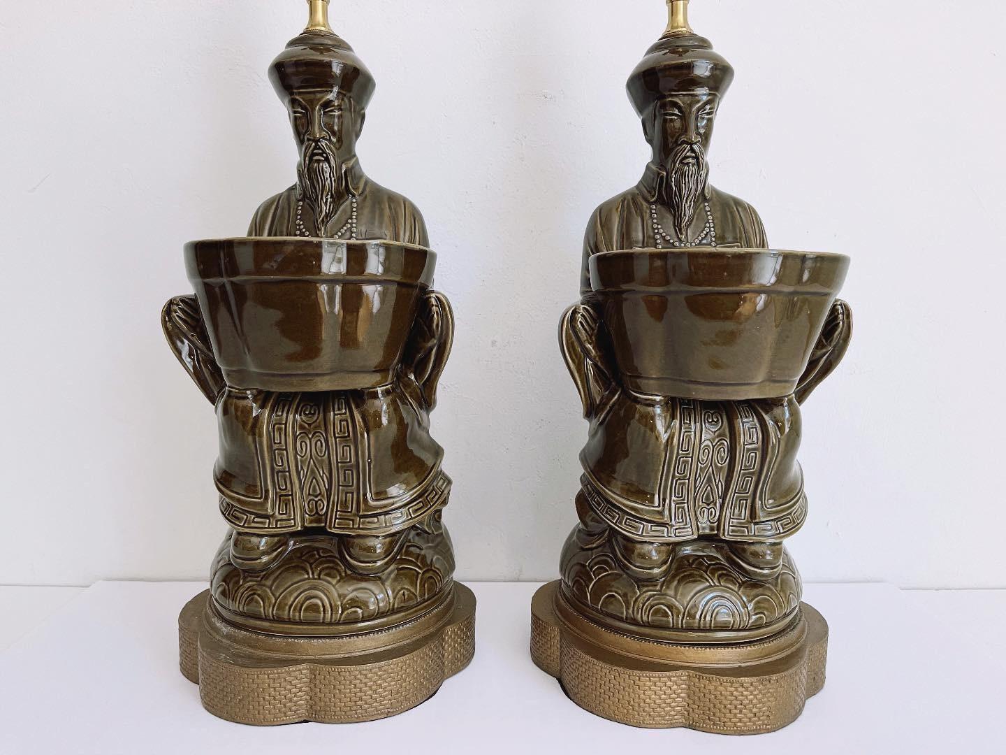 Exquisite sculptural pair of mid century glazed ceramic lamps featuring seated Asian scholars in ceremonial robes holding open planters on scalloped, raised, and embossed metal bases. Big, stunningly beautiful pieces in a rich deep olive green finished on all sides and highly detailed with incised Greek key motifs, beading, braiding, and guilloche borders.
