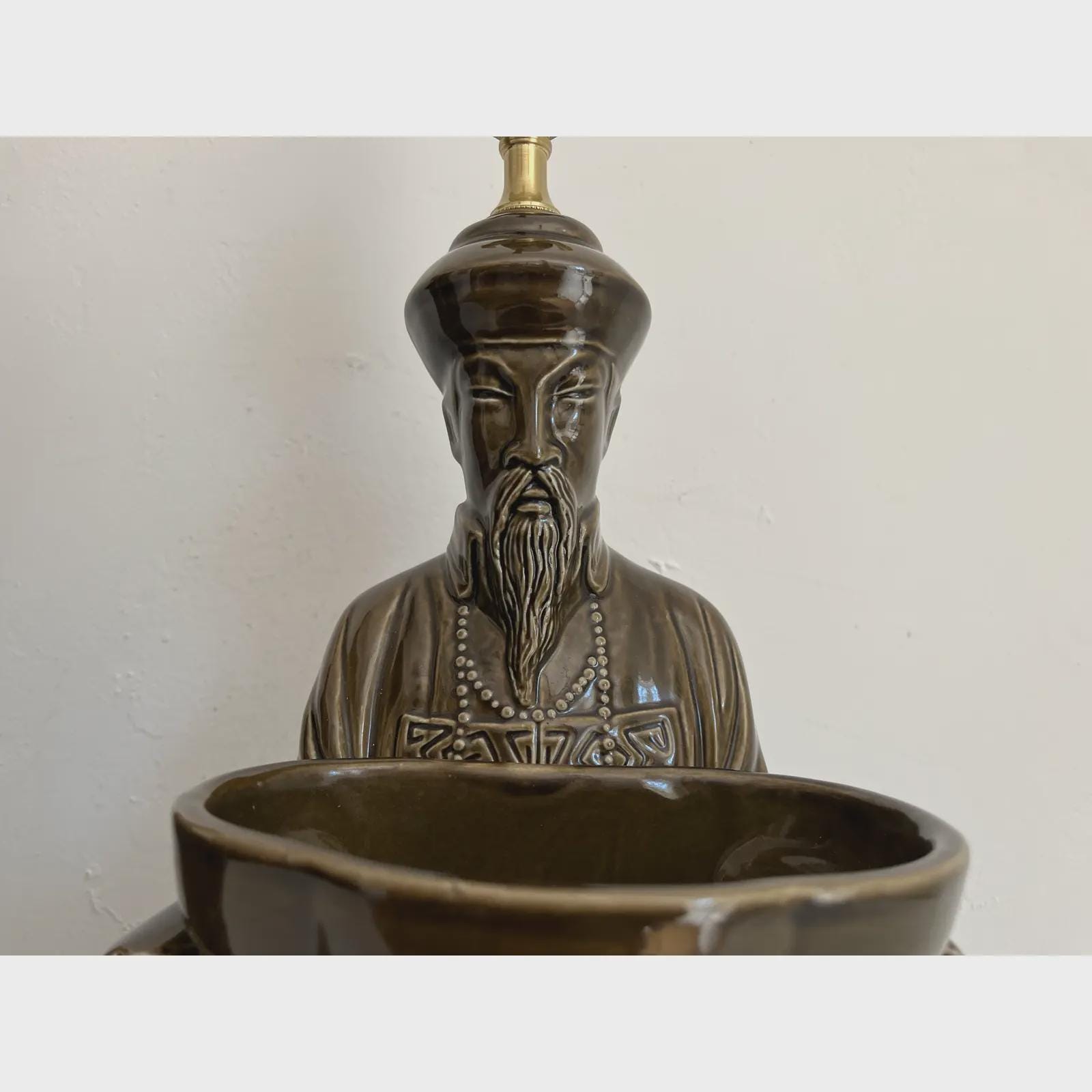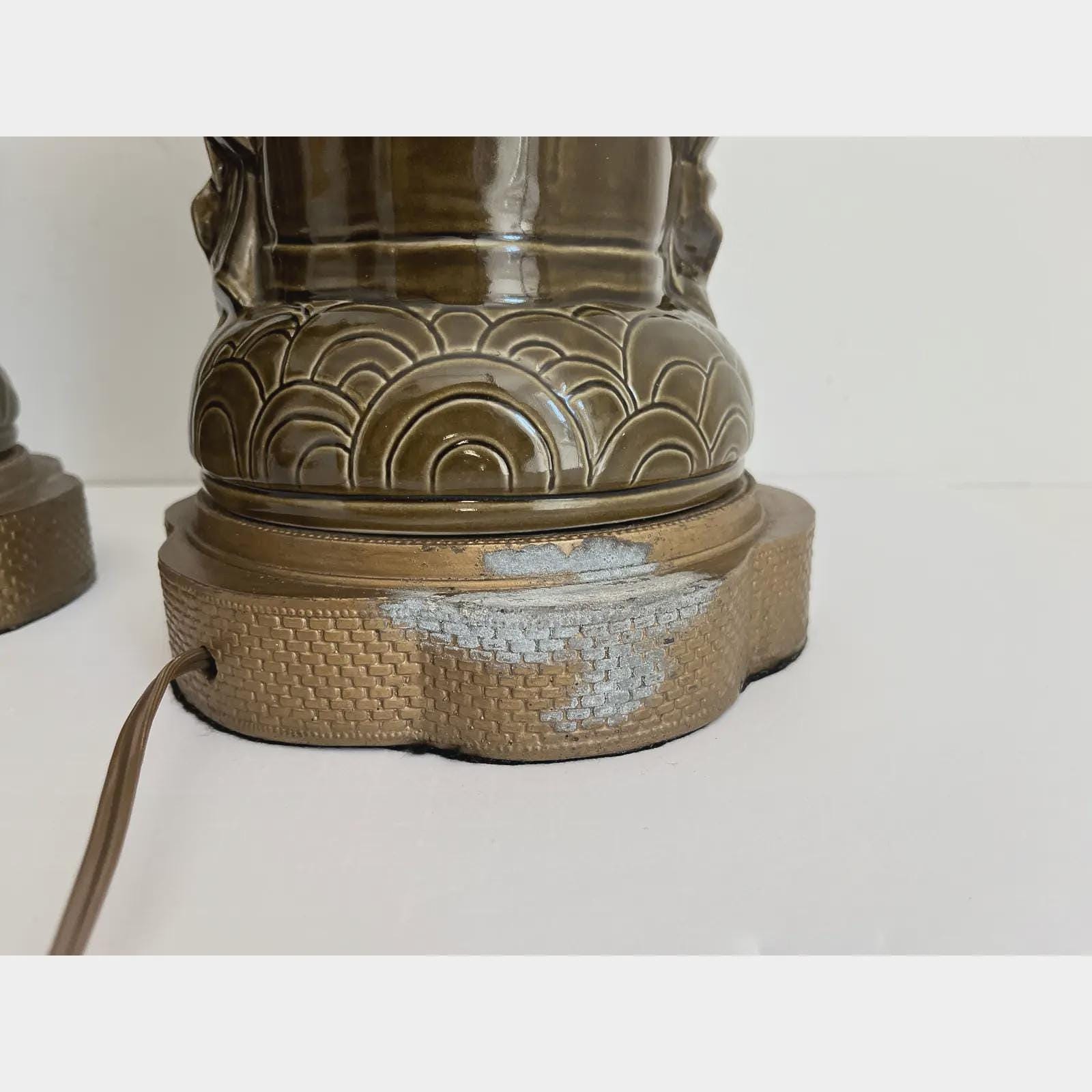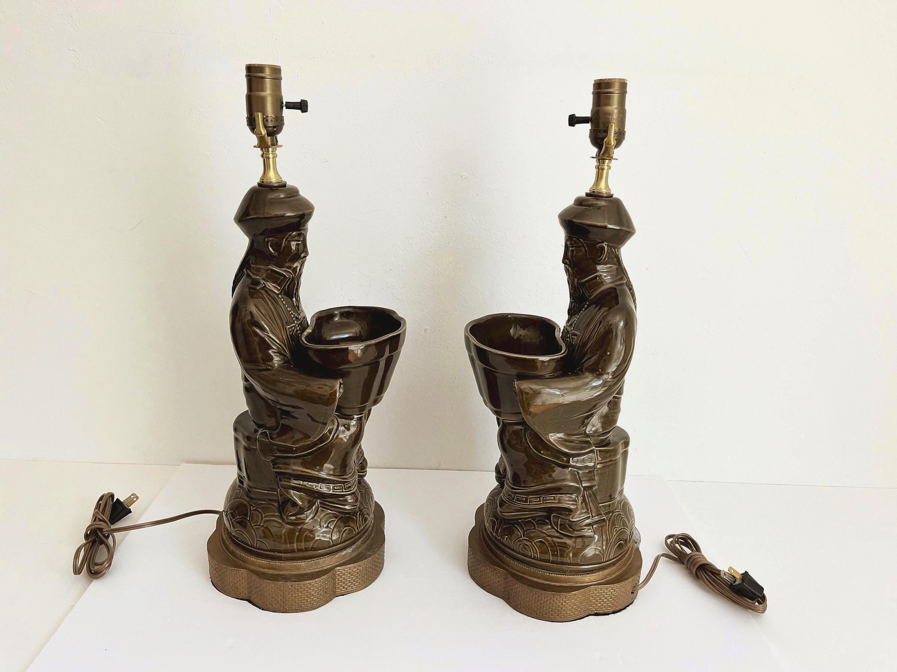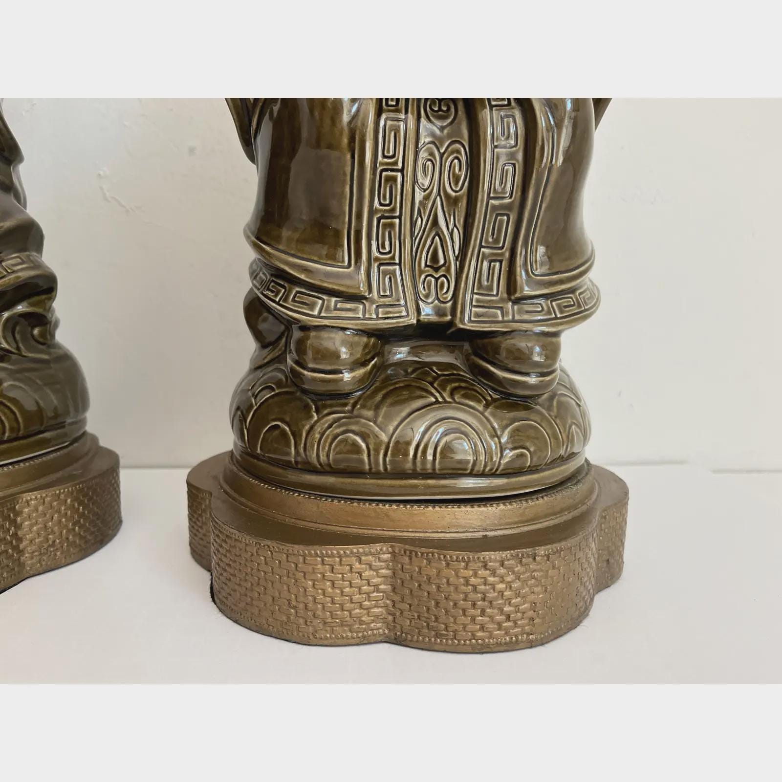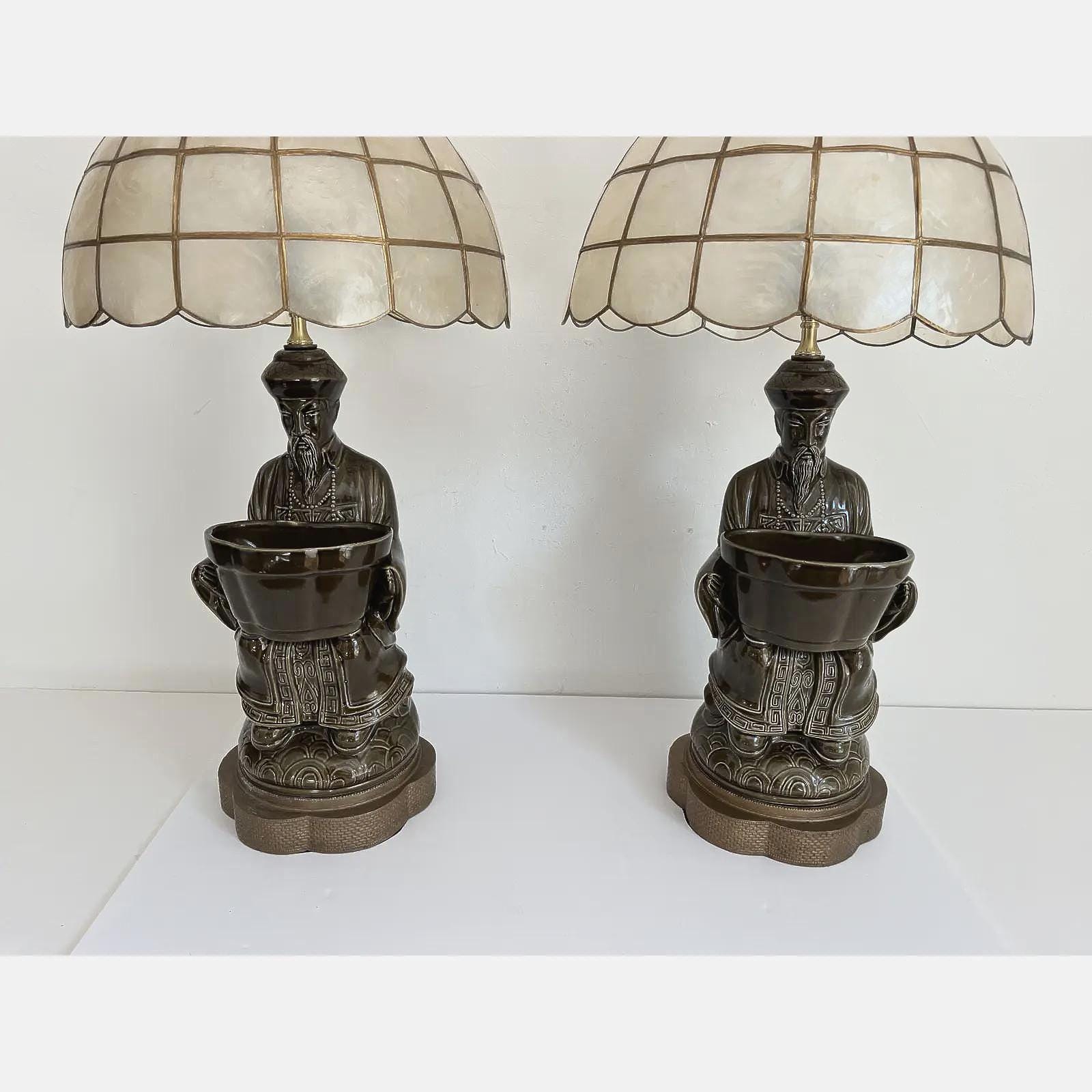 Exquisite sculptural pair of mid century glazed ceramic lamps featuring seated Asian scholars in ceremonial robes holding open planters on scalloped, raised, and embossed metal bases. Big, stunningly beautiful pieces in a rich deep olive green finished on all sides and highly detailed with incised Greek key motifs, beading, braiding, and guilloche borders.