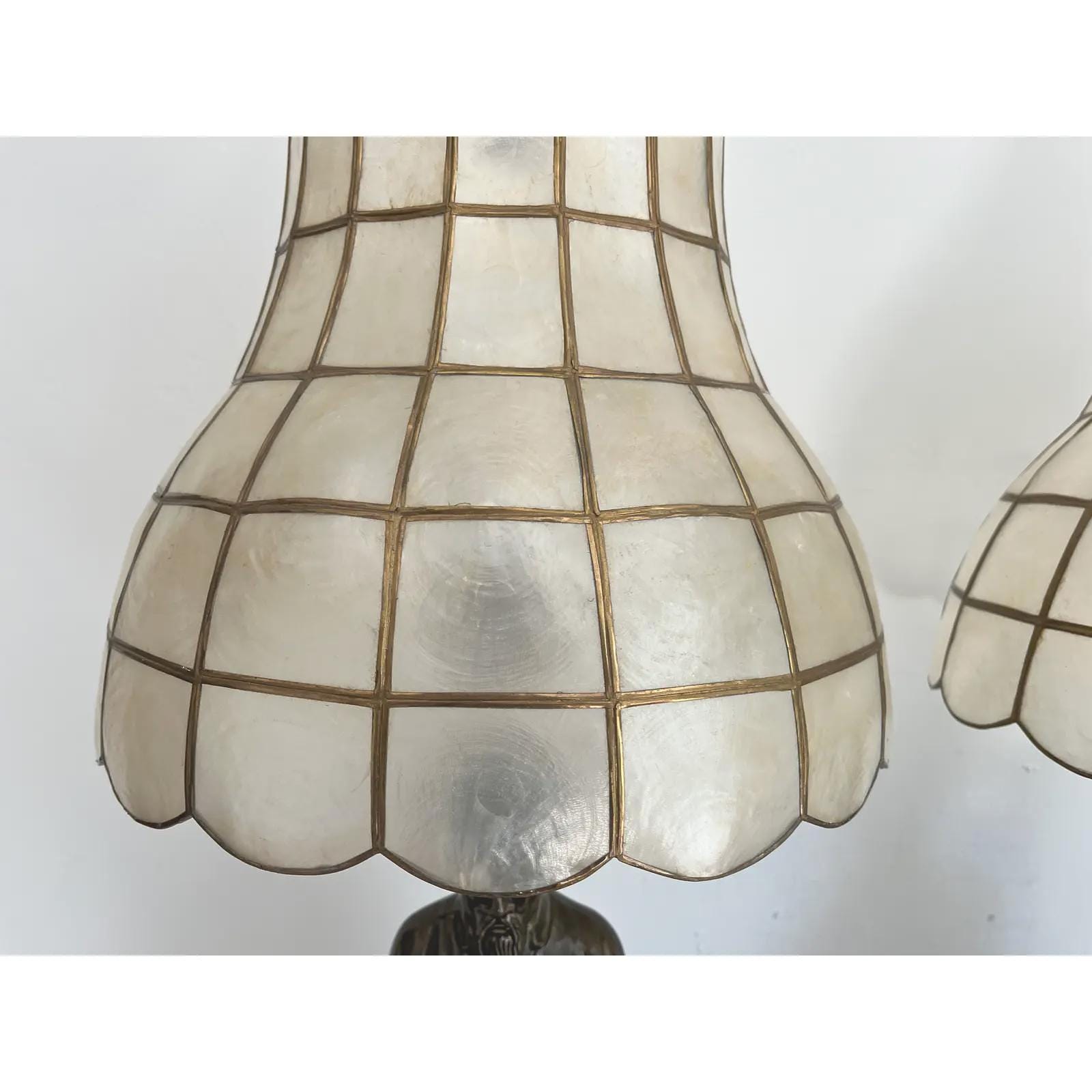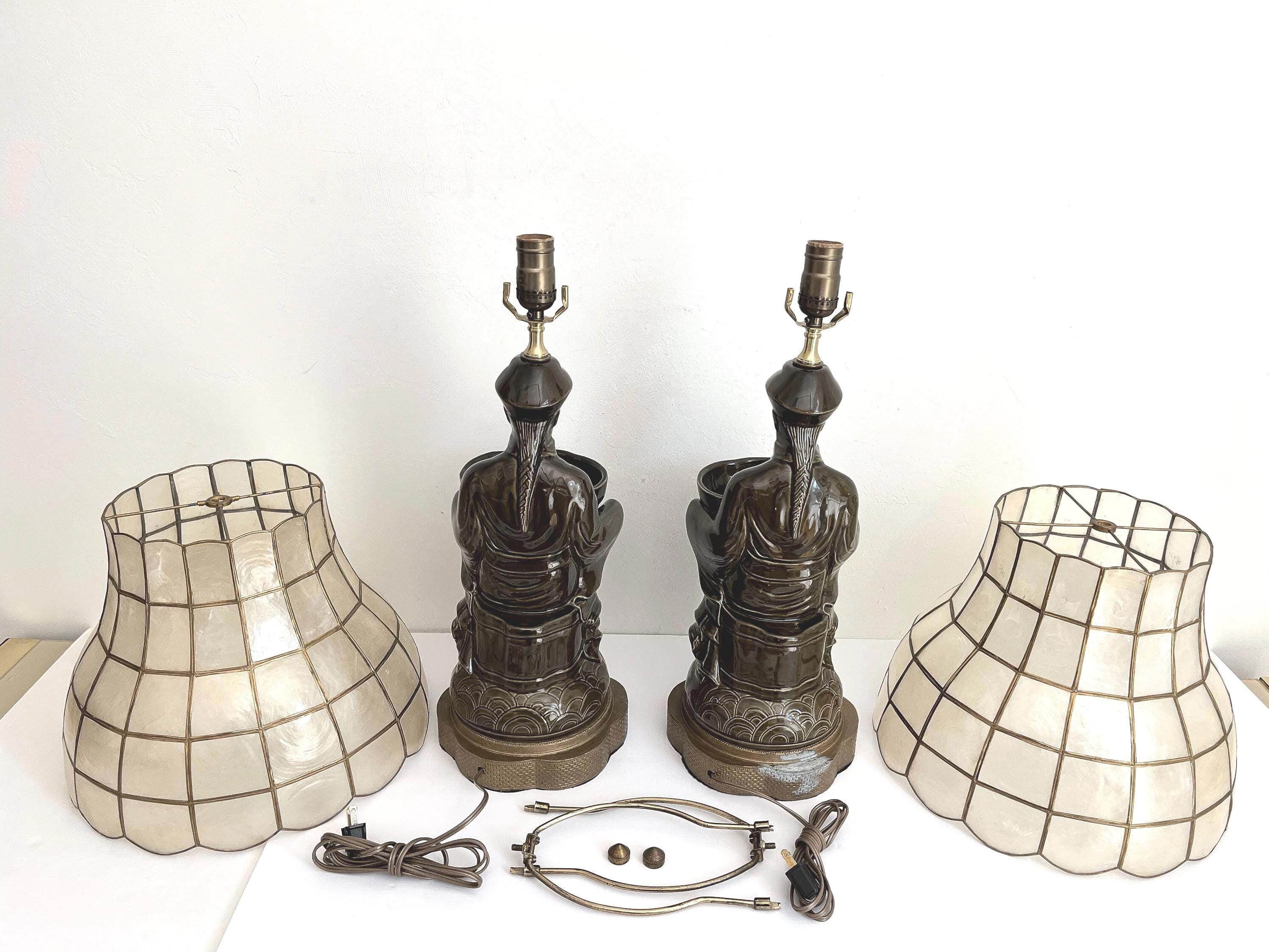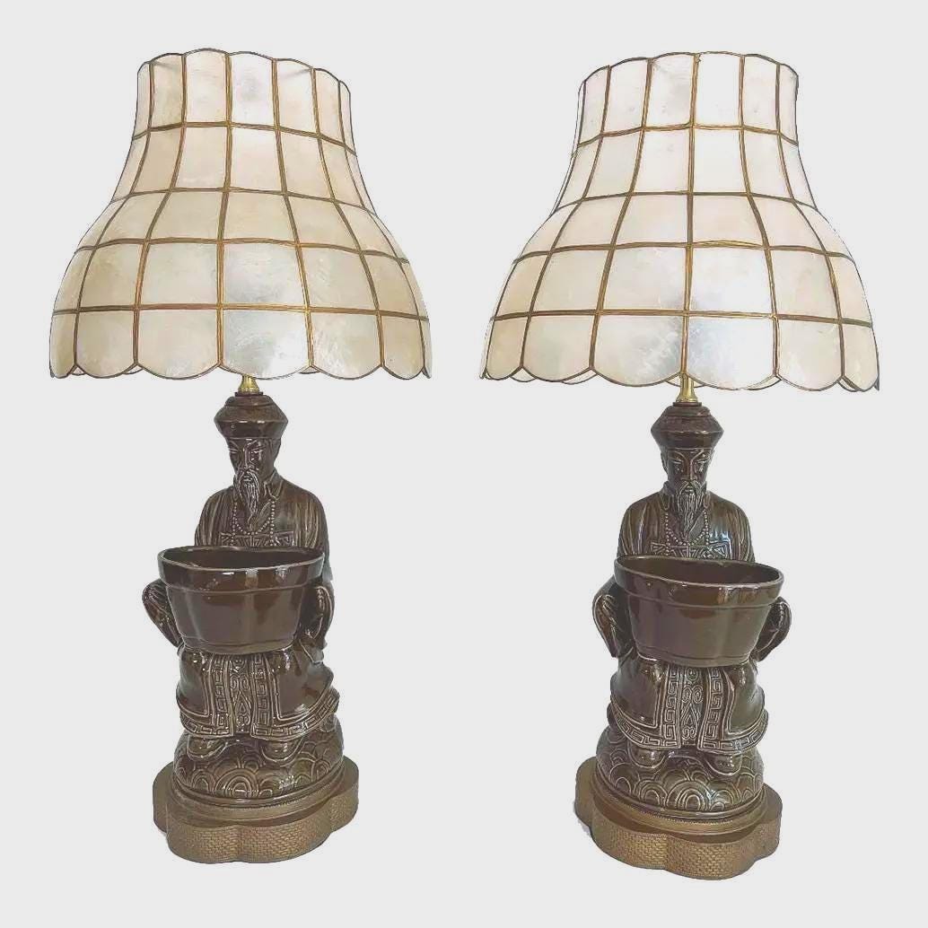 Professionally restored with new wiring, sockets, and fittings for standard bulbs. Vintage mid century Capiz shell shades, harps, and vintage finials are included. The basins may be filled with plants, keys, jewelry, remotes, etc.