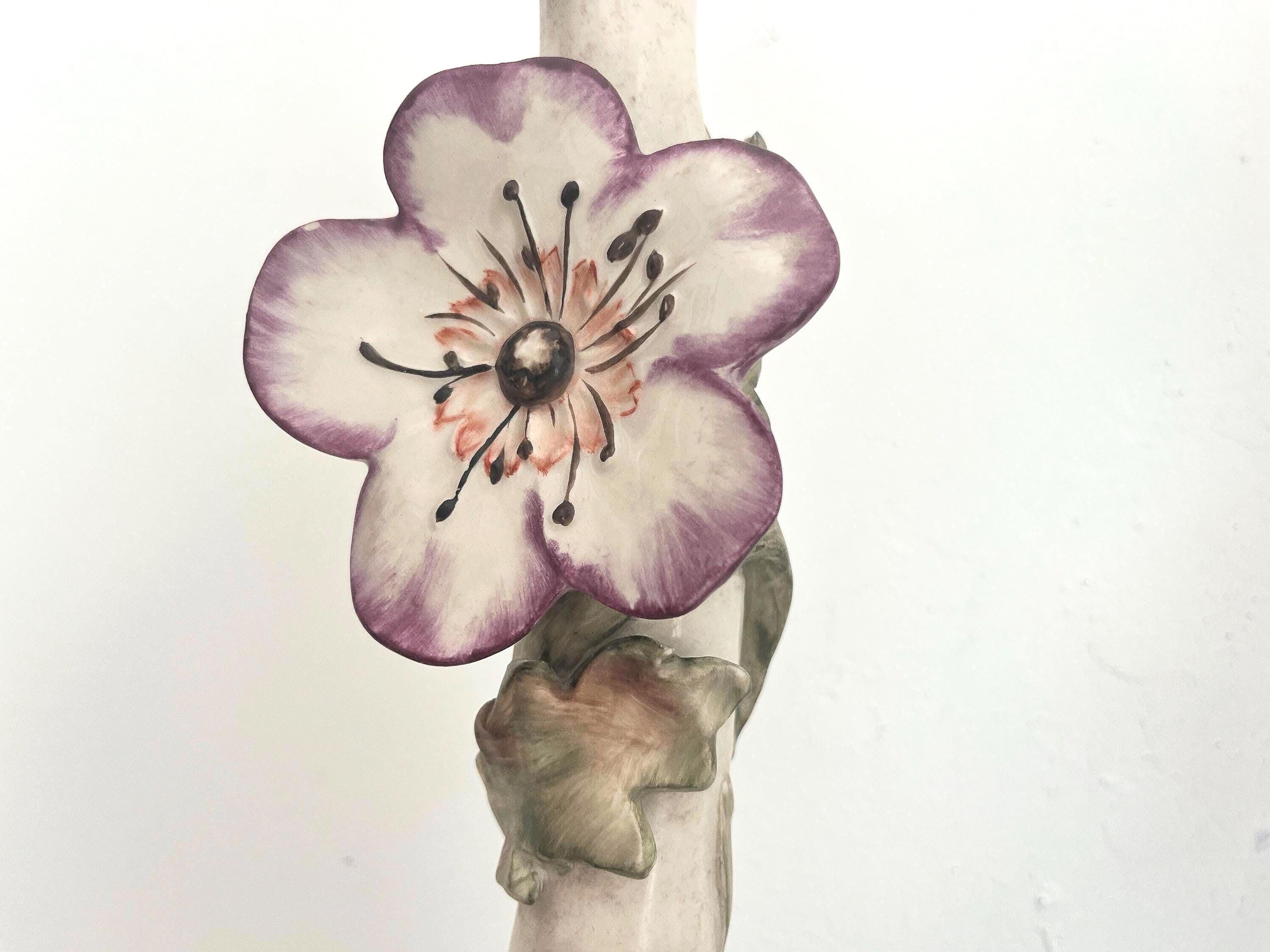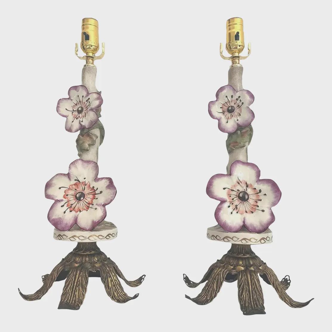 Gorgeous pair of Art Nouveau glazed porcelain lamps by Cordey featuring faux bois leafy branches finished on all sides with hand painted and applied plum blossoms on integrated round pedestals set atop gold metal leafy footed bases. Each retains a Cordey stamp and marks.