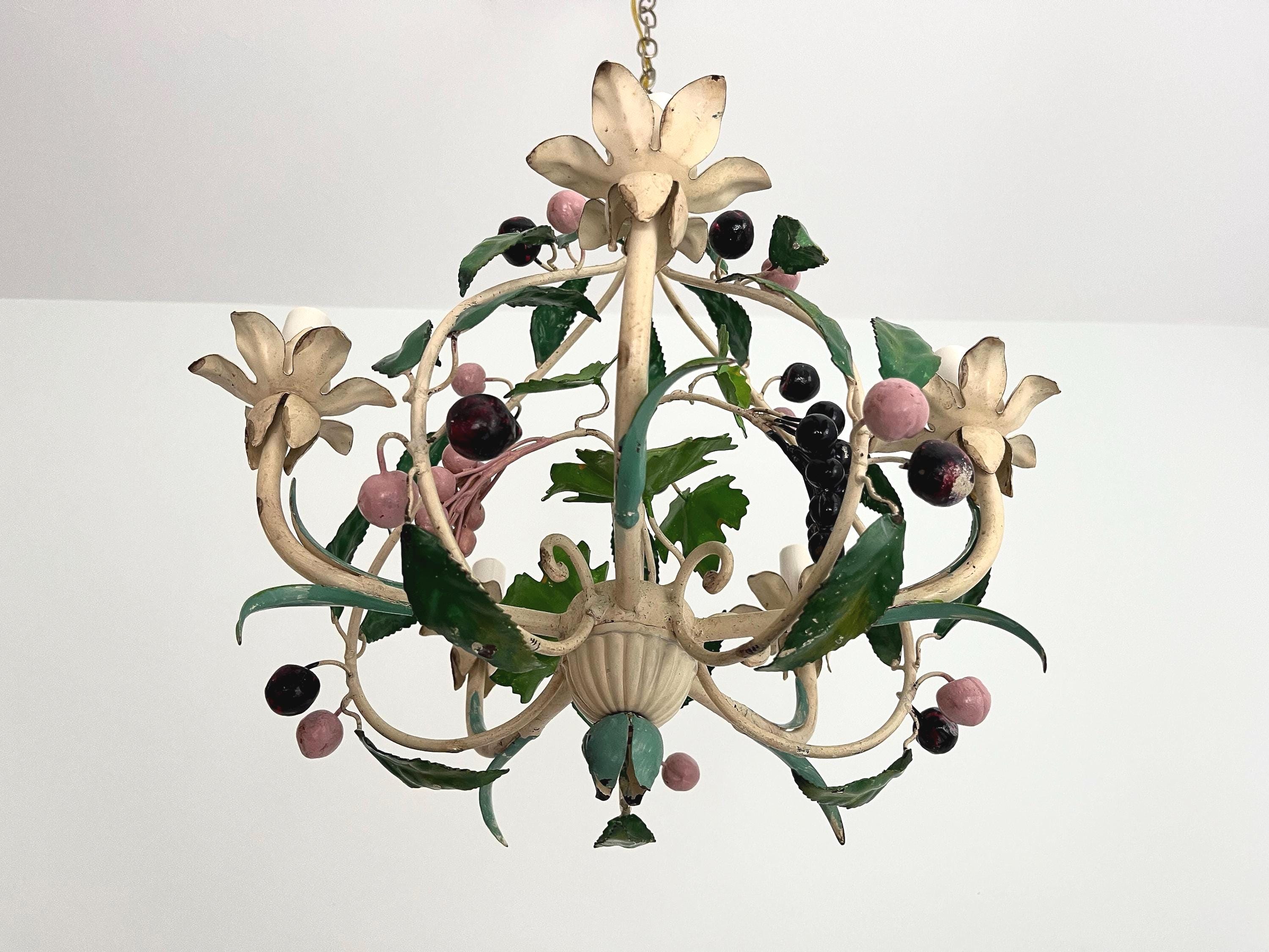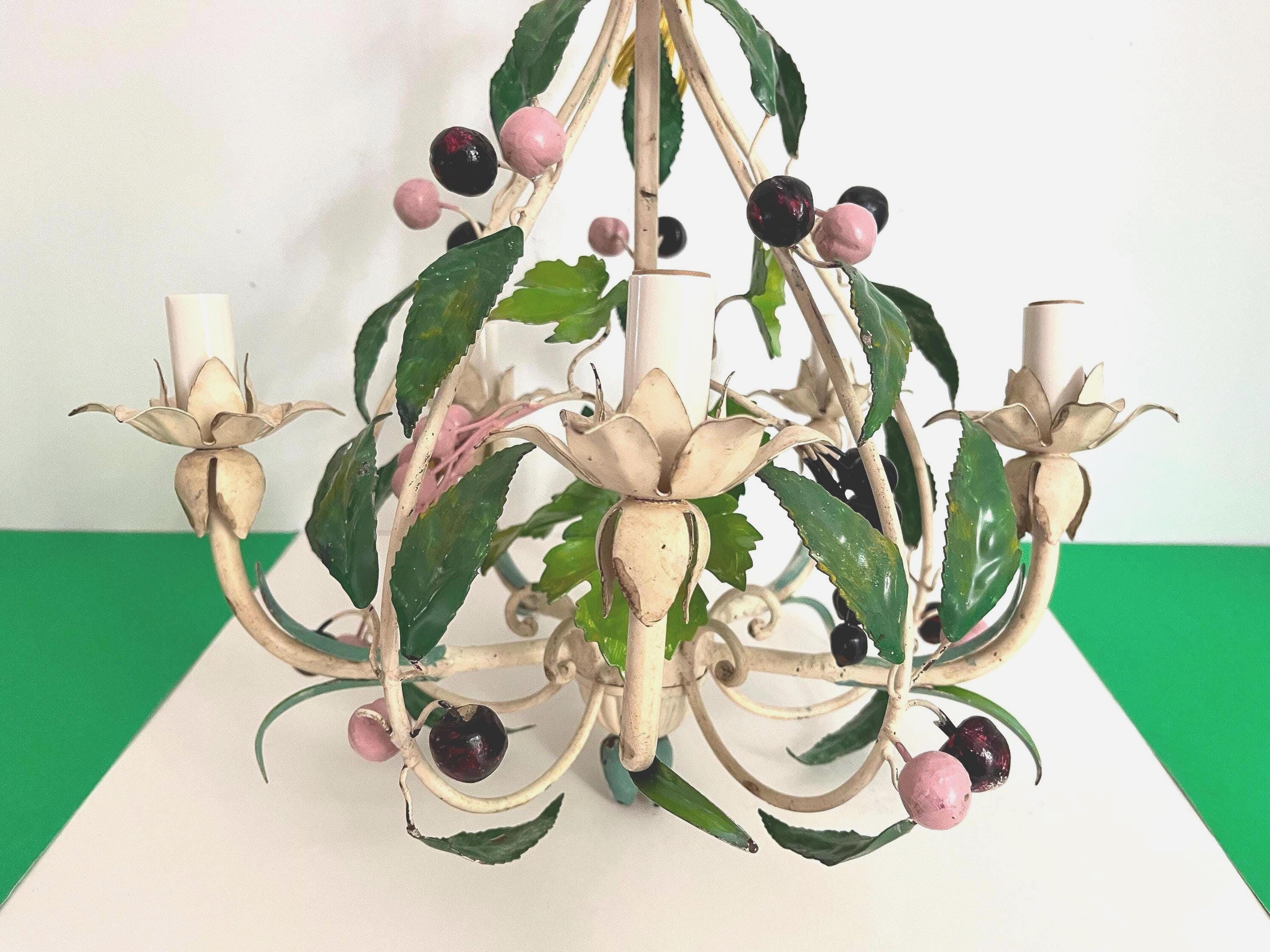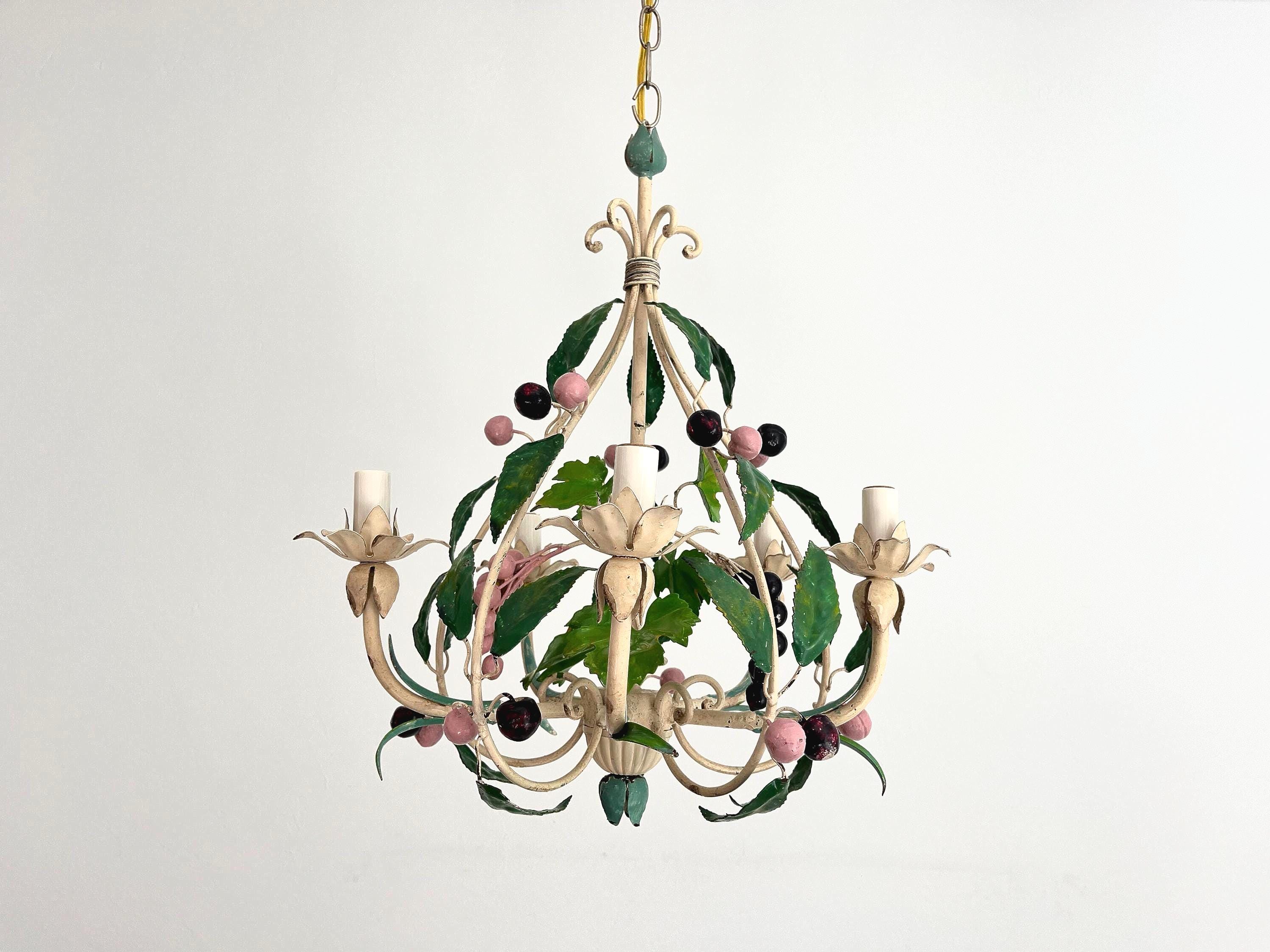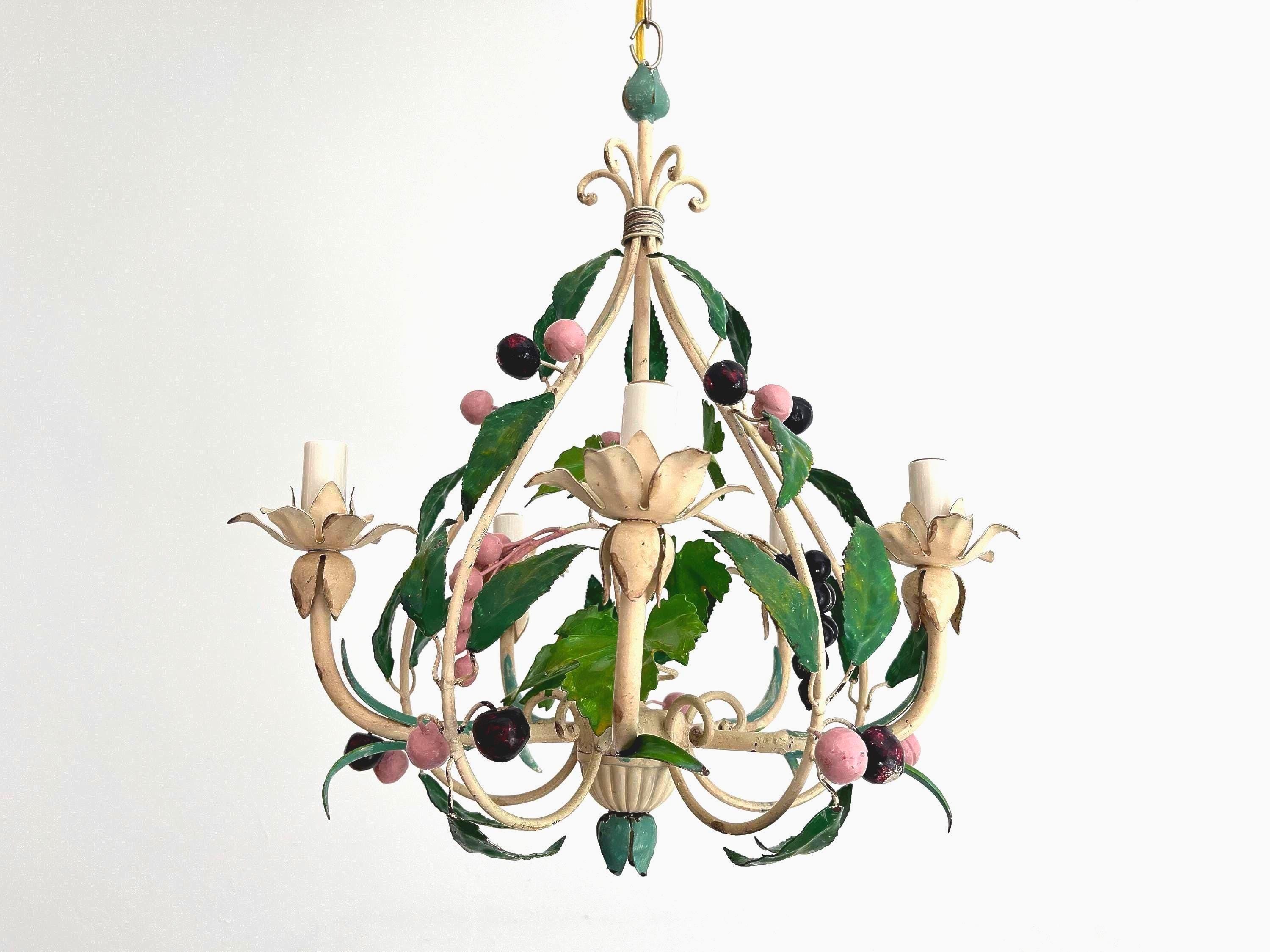 Charming mid century Italian tole five-arm chandelier in its original creamy white hand painted finish with red and pink cherries, bright green leaves, and original painted tulip finials.