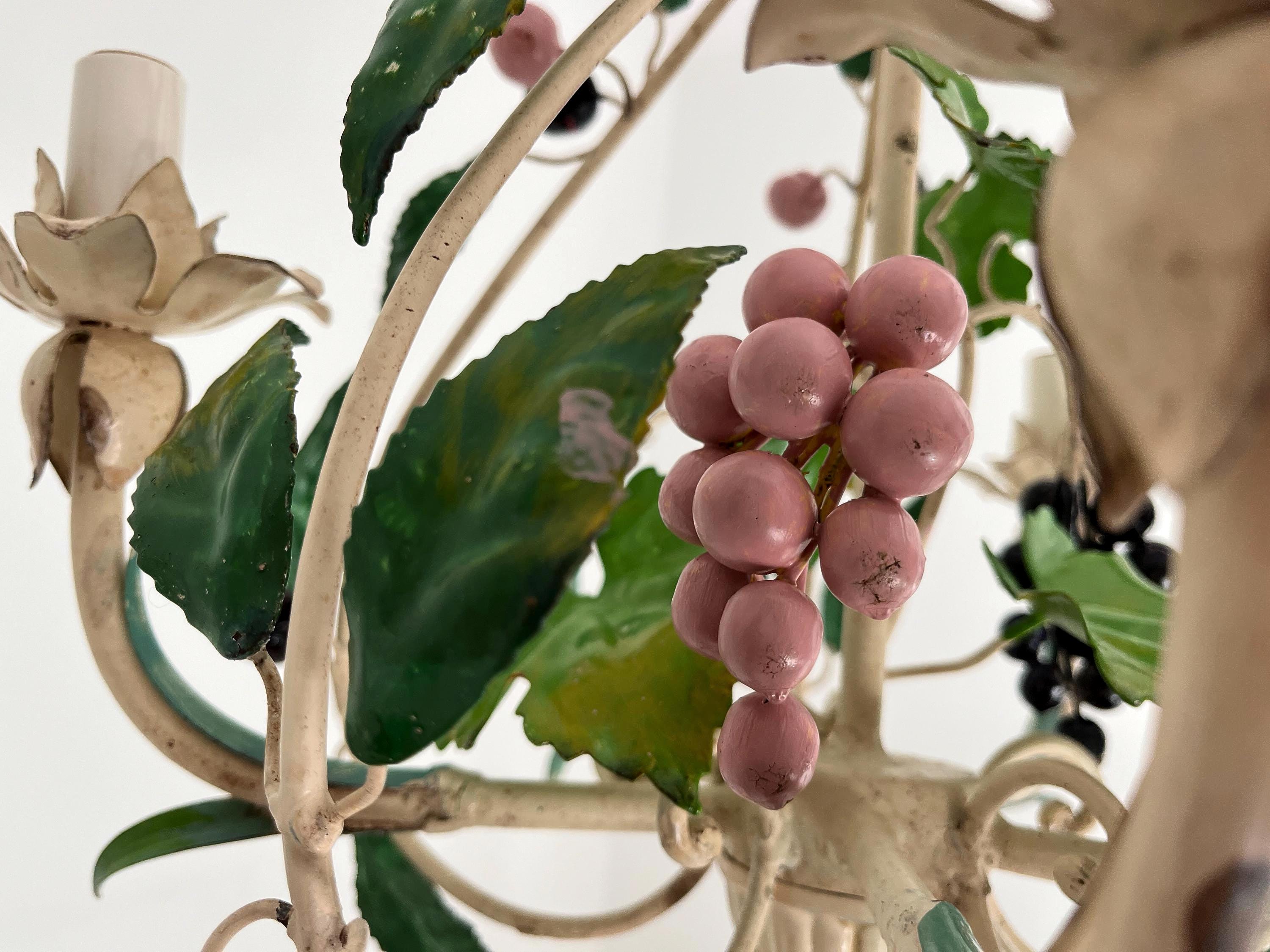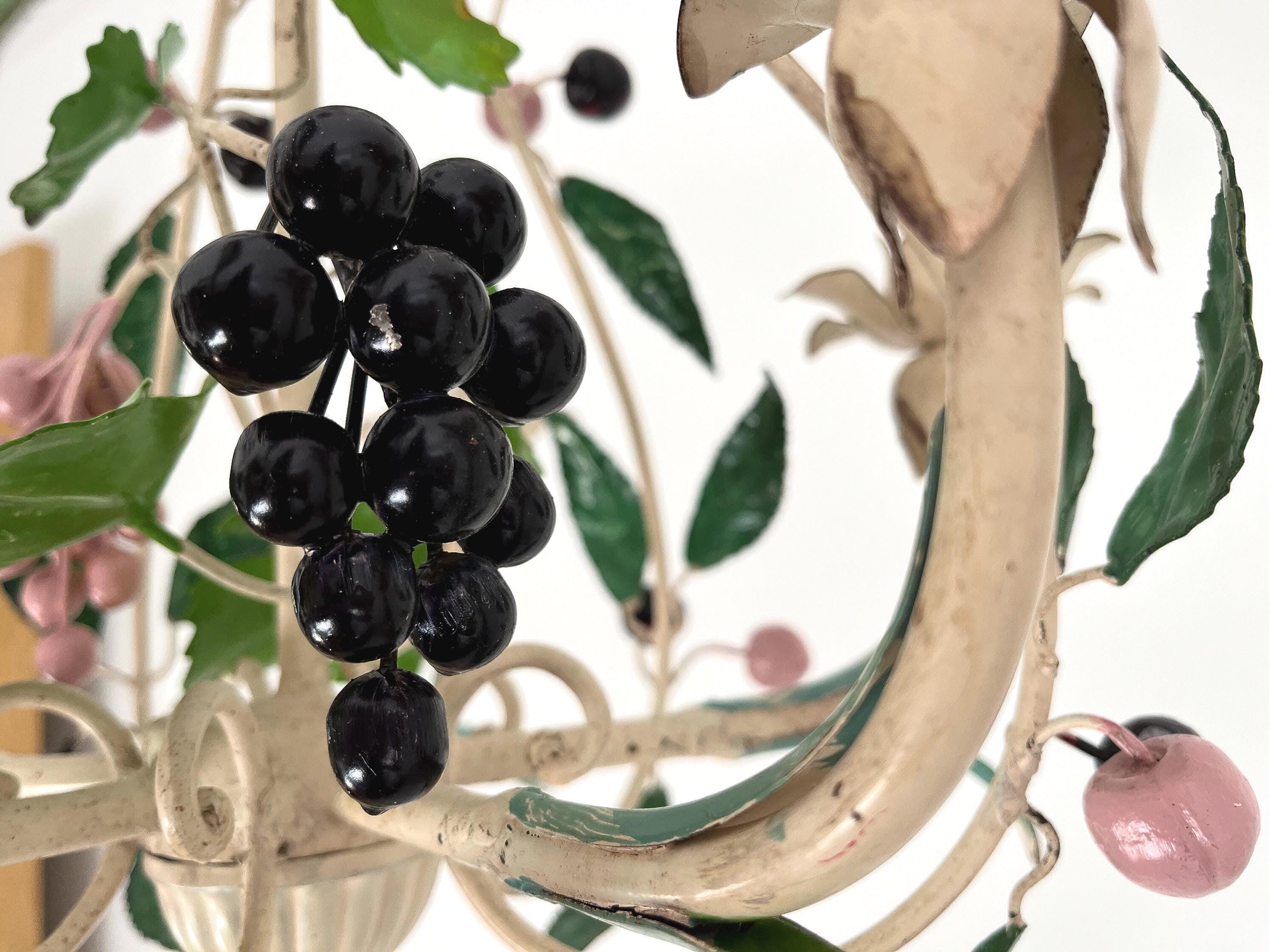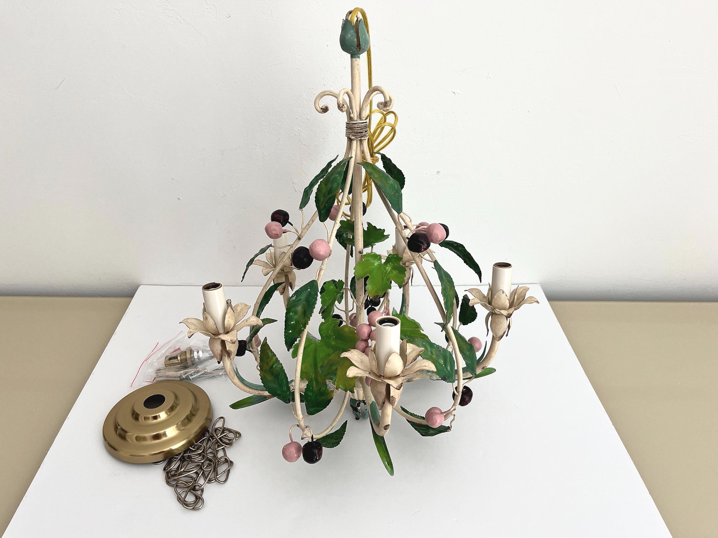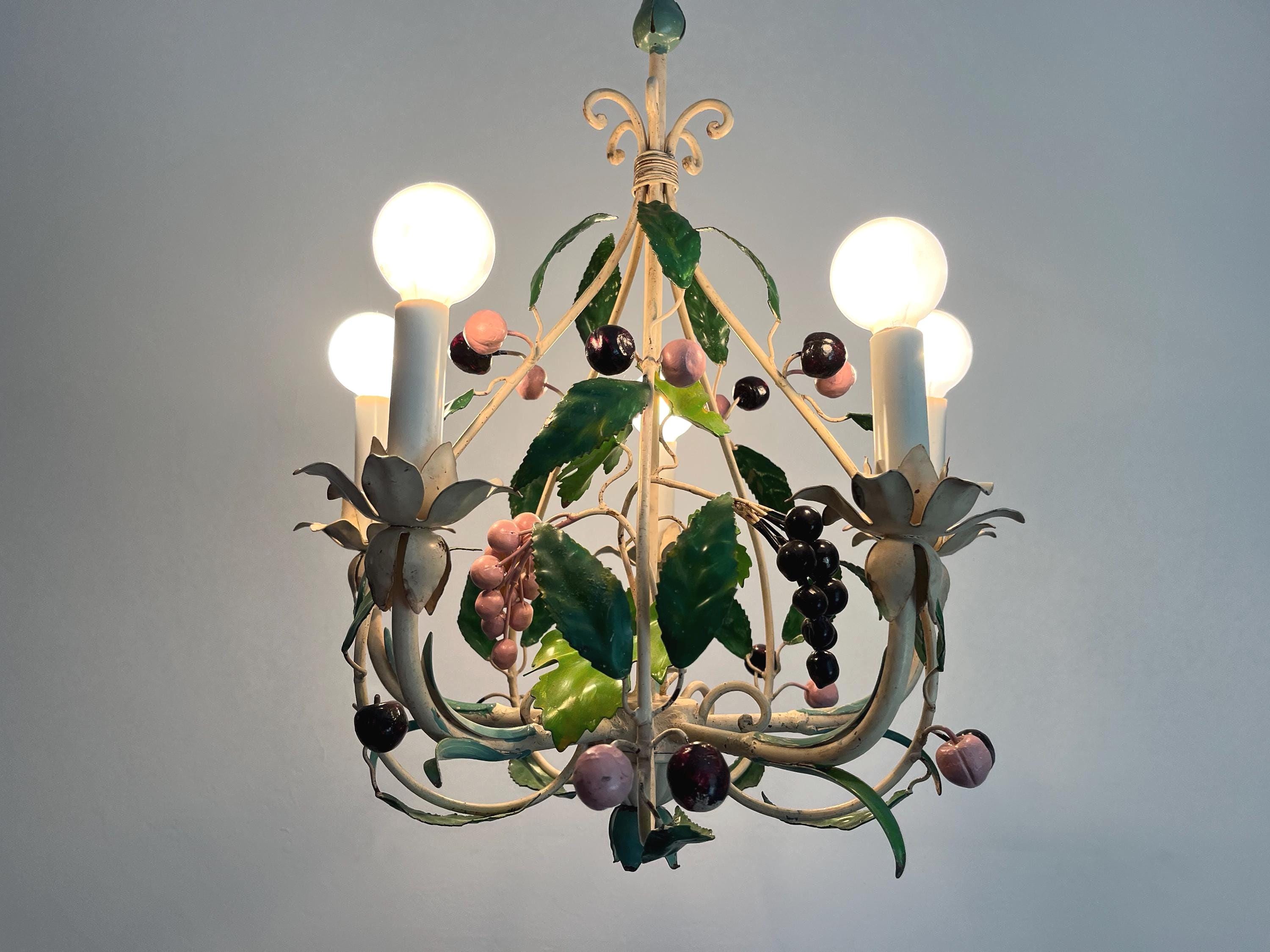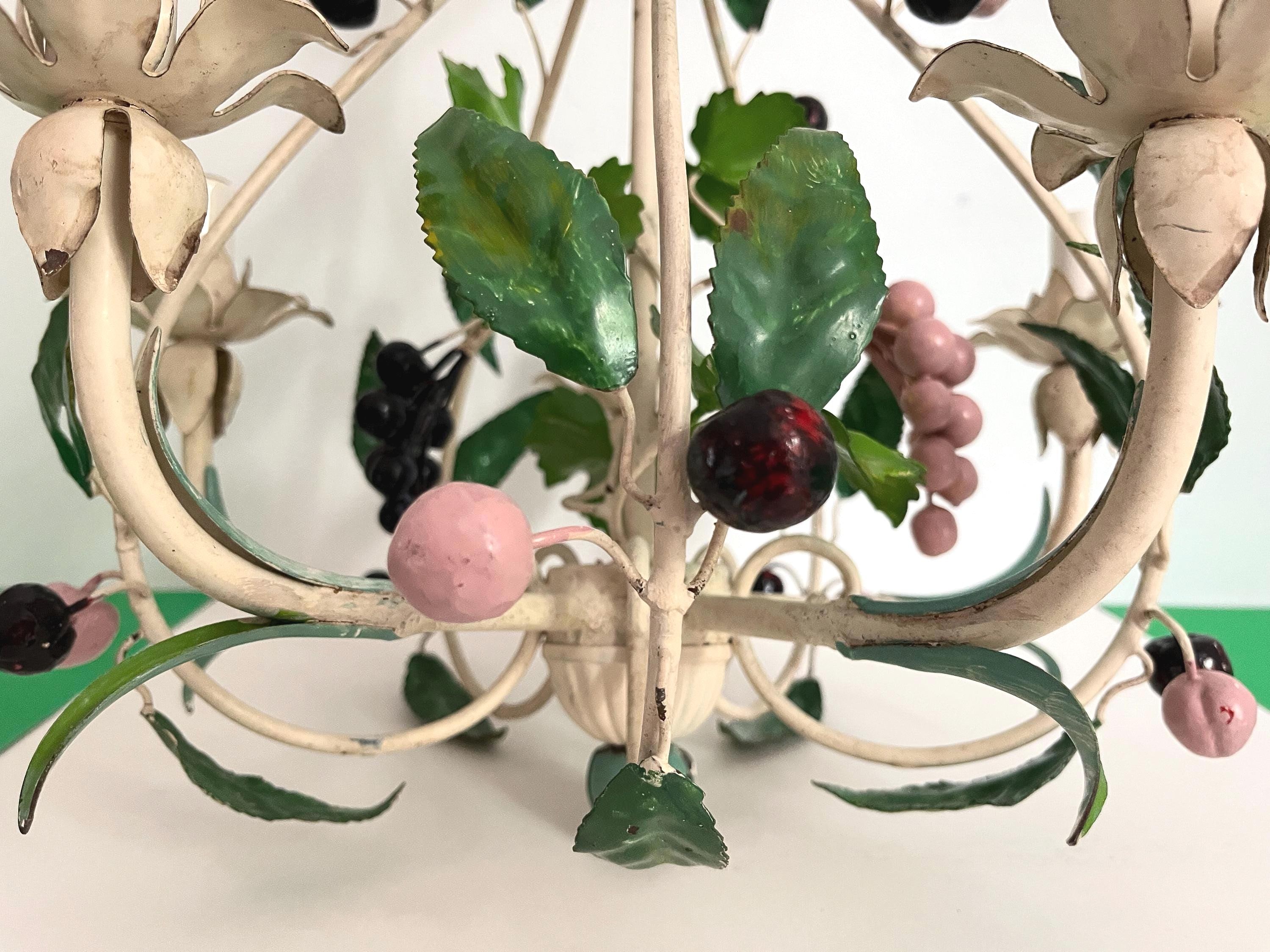 Charming mid century Italian tole five-arm chandelier in its original creamy white hand painted finish with red and pink cherries, bright green leaves, and original painted tulip finials.