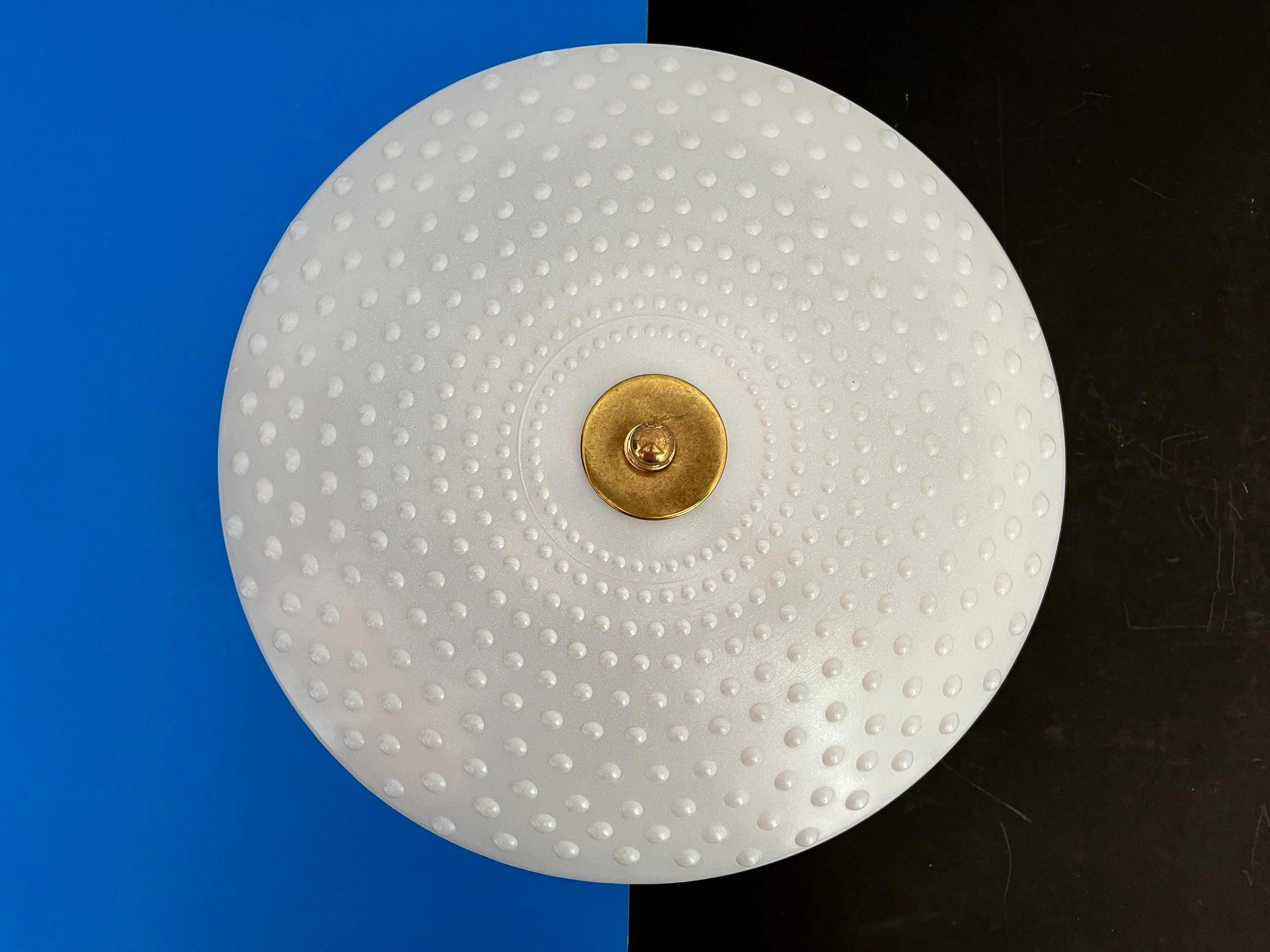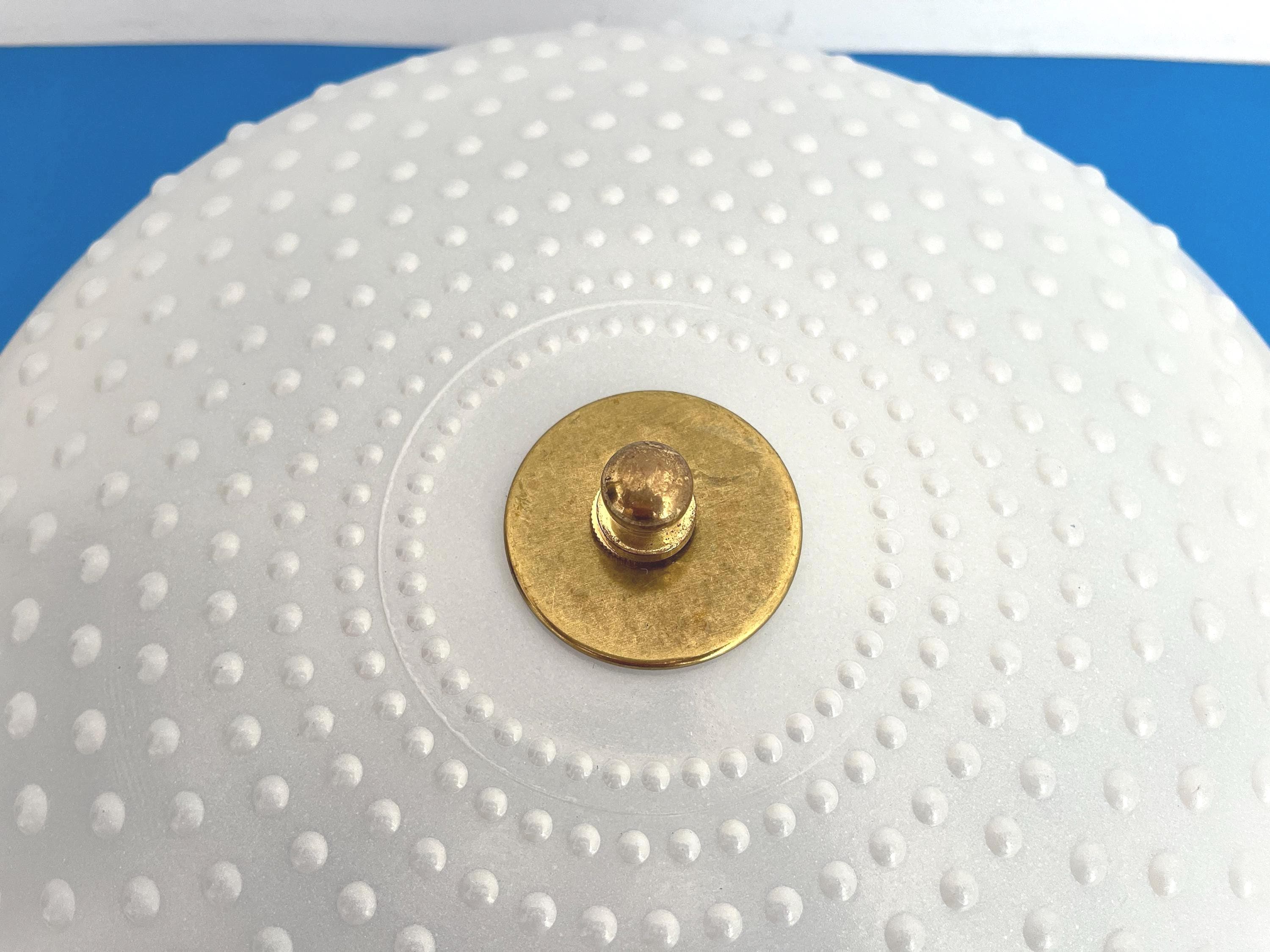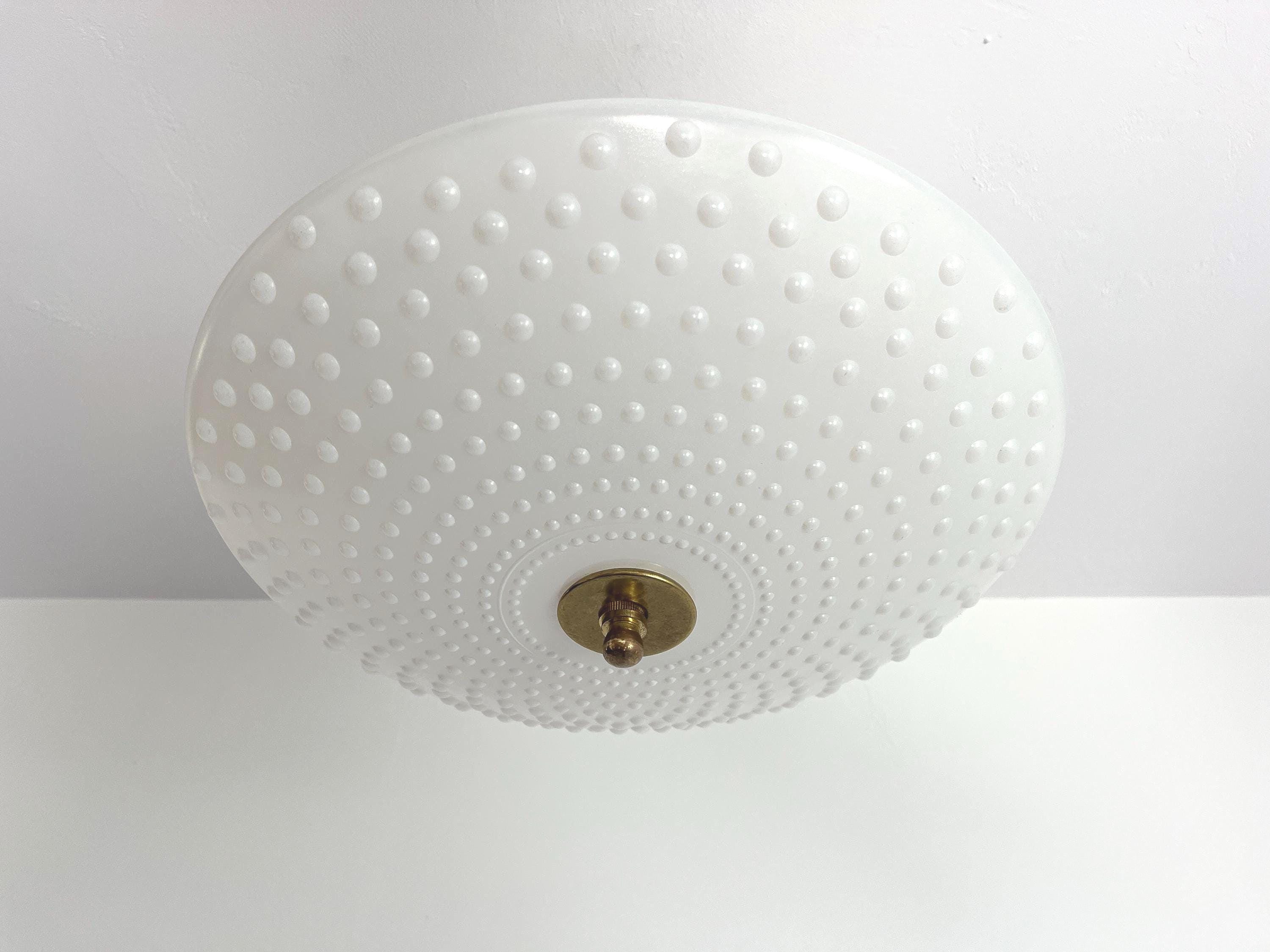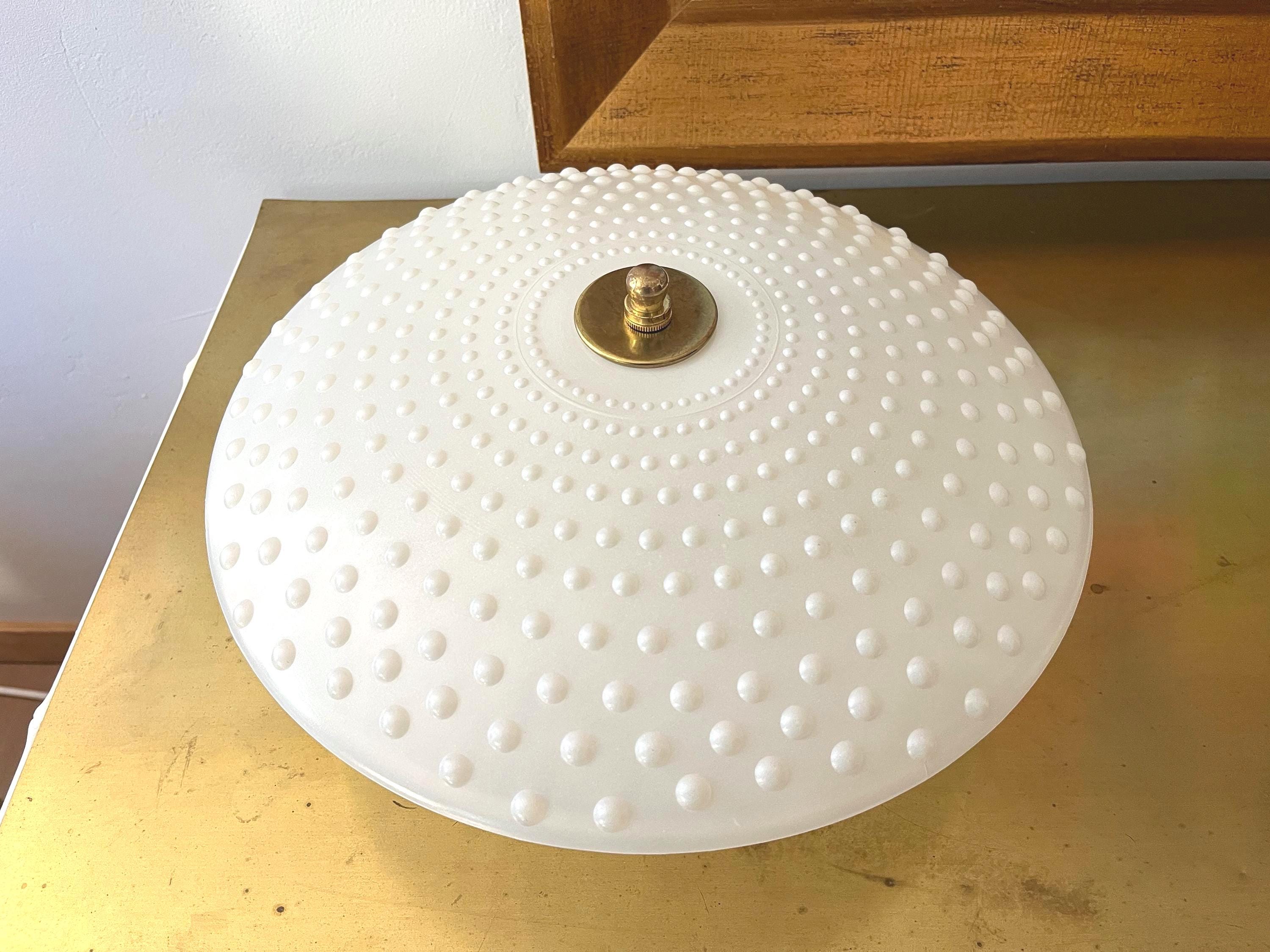 Stunning mid century frosted hobnail glass semi-flush mount ceiling light in a matte white finish with radiant dimensional graduating circular design, four lights, and gold hardware.