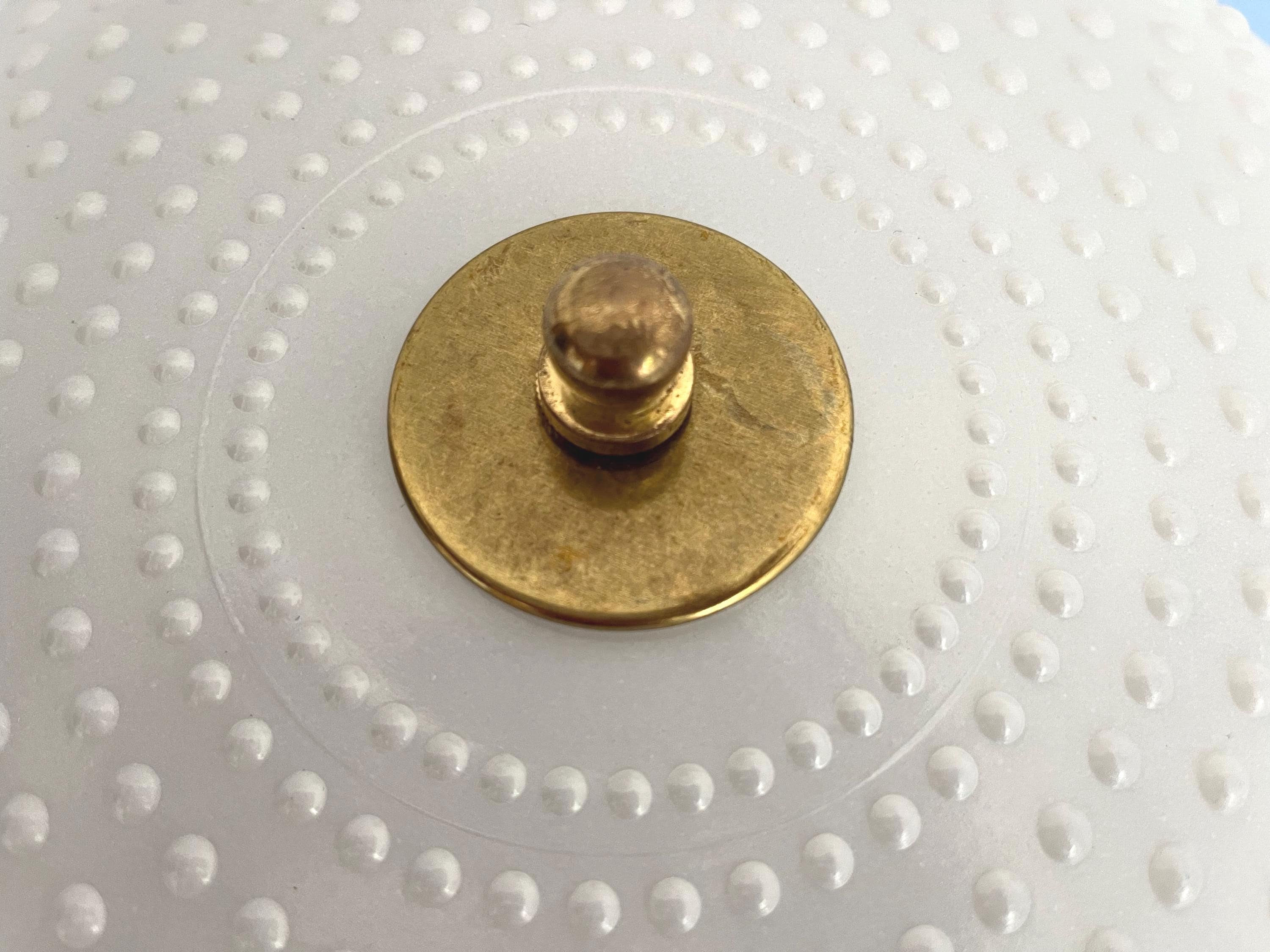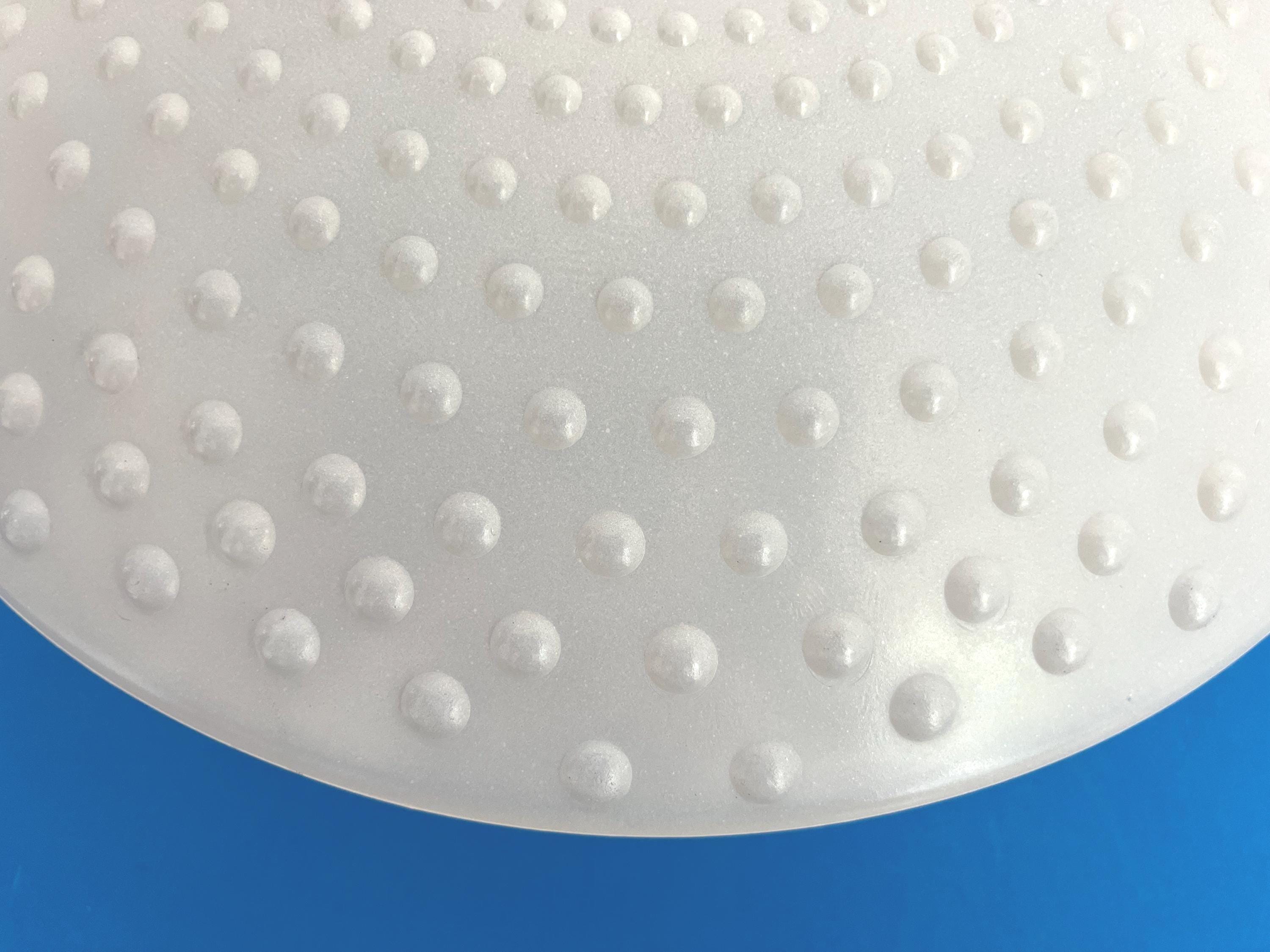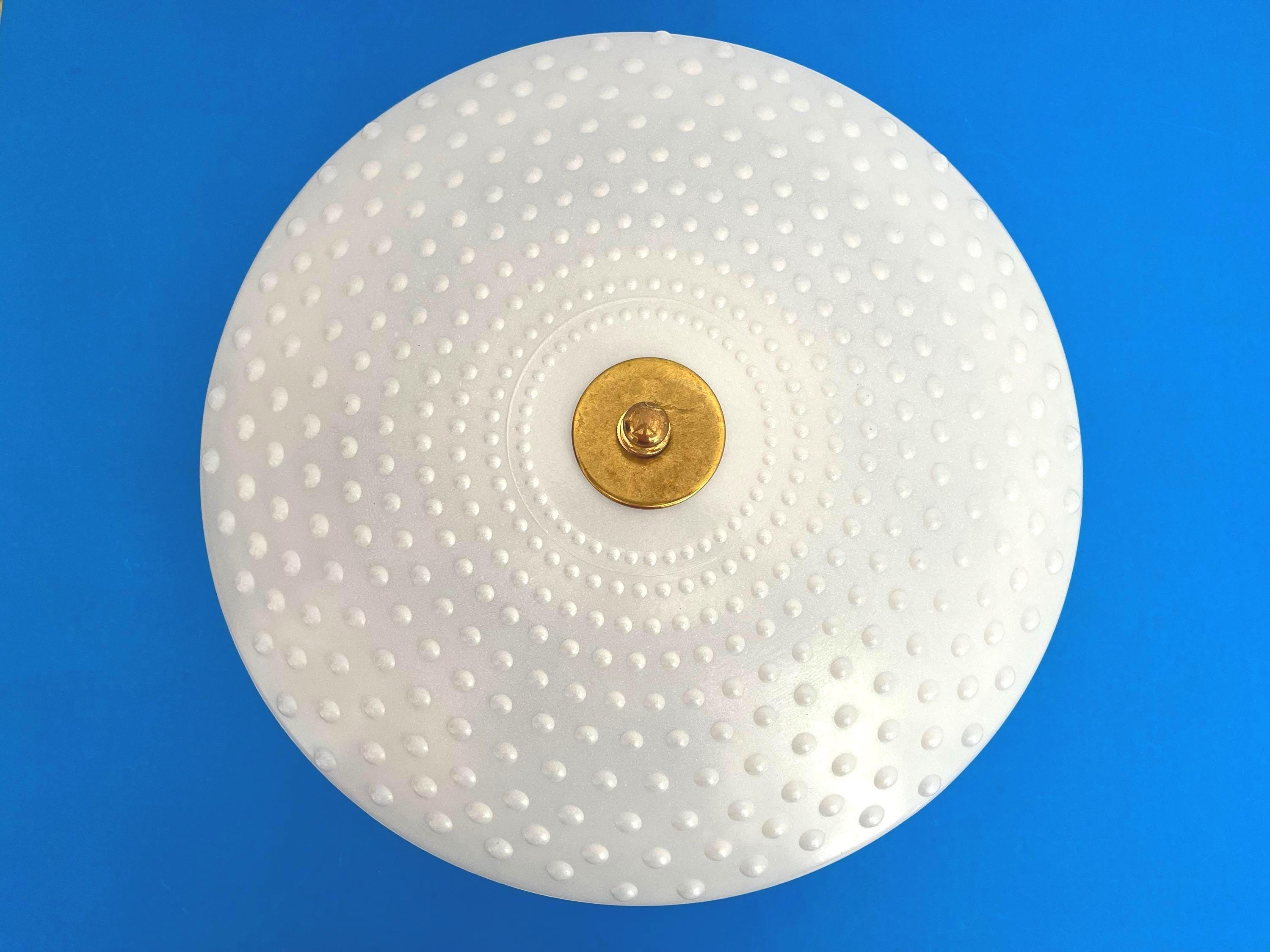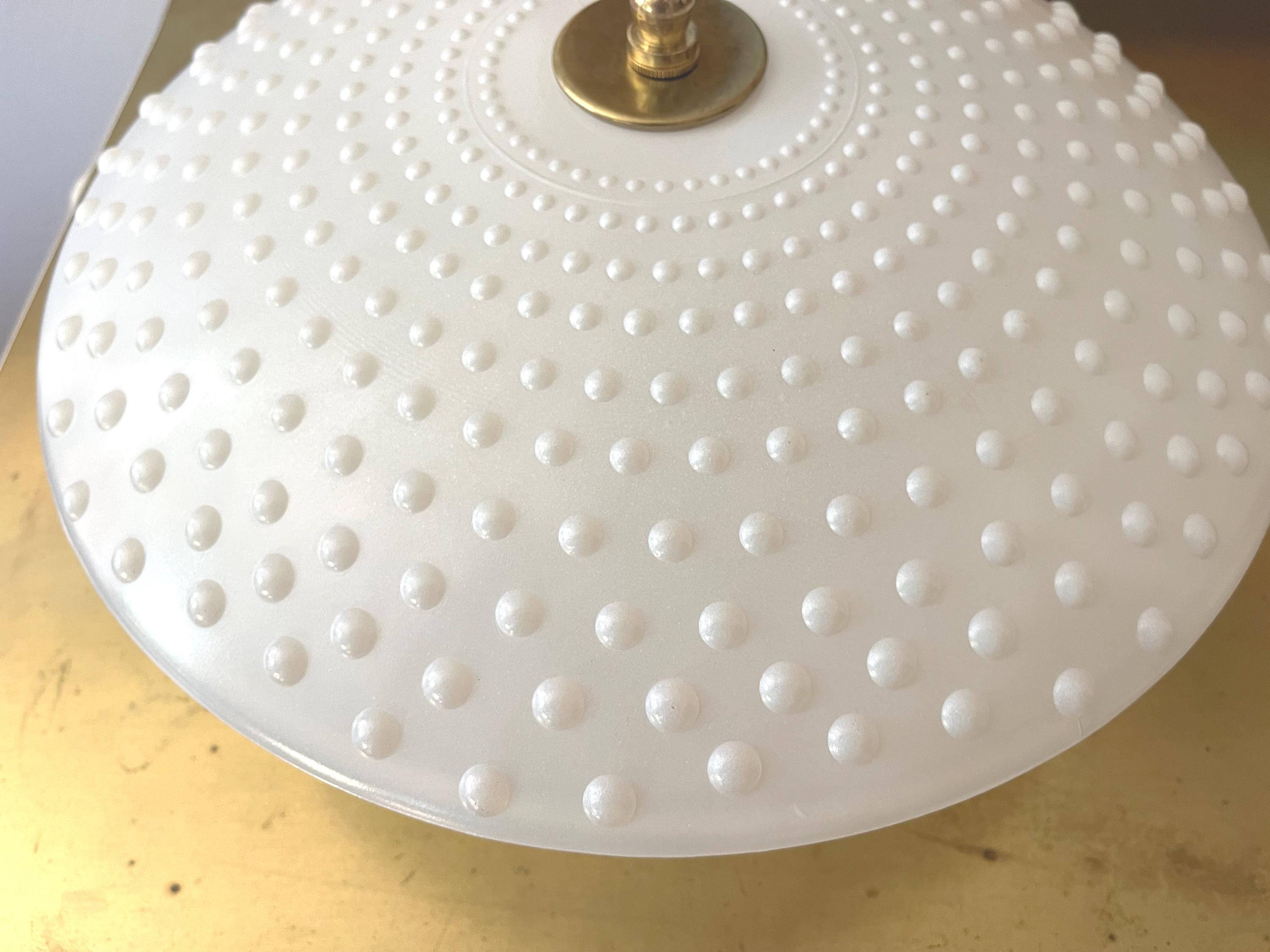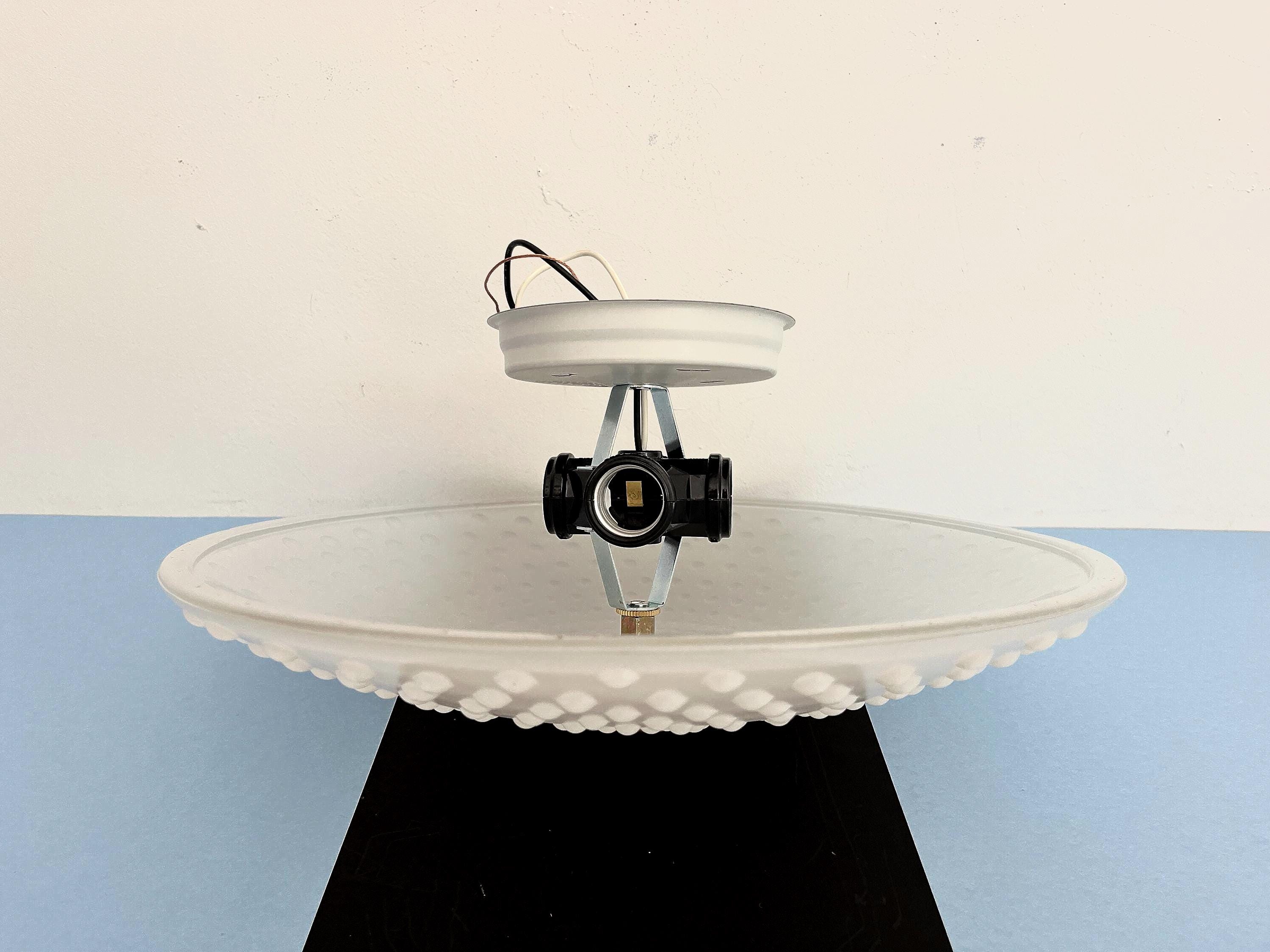 Stunning mid century frosted hobnail glass semi-flush mount ceiling light in a matte white finish with radiant dimensional graduating circular design, four lights, and gold hardware.