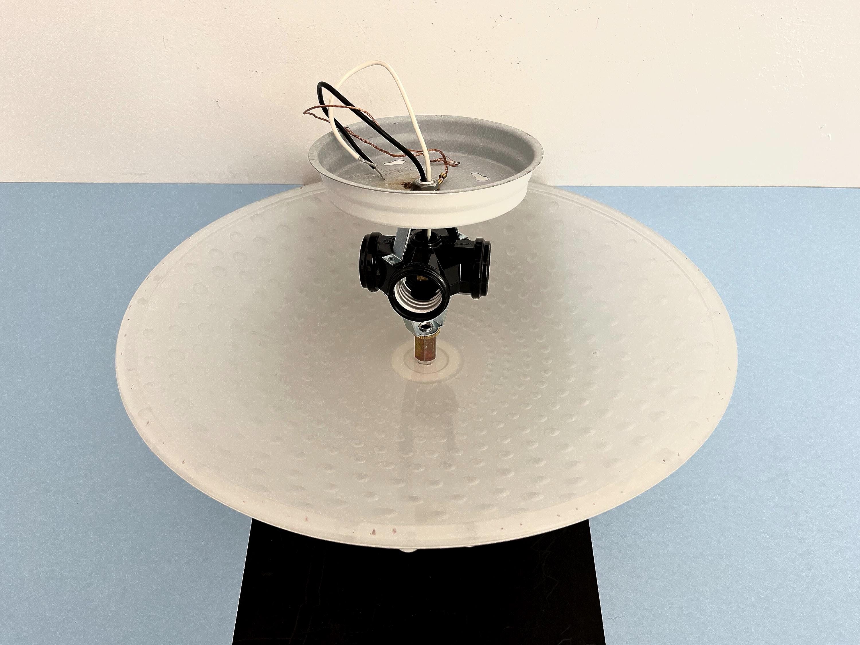 Professionally restored with new wiring and sockets for standard bulbs. Comes ready to install with white metal mounting plate and hardware.