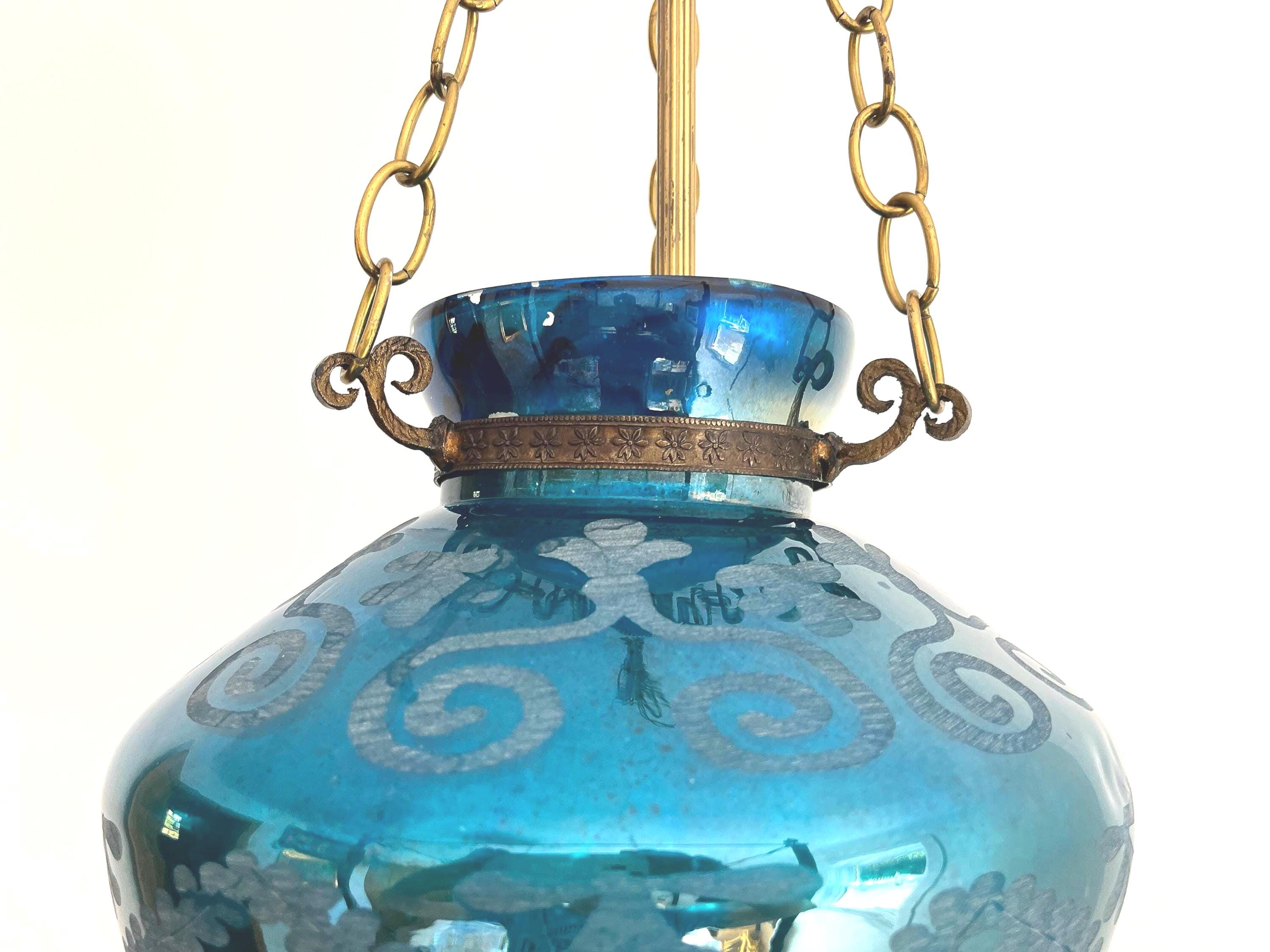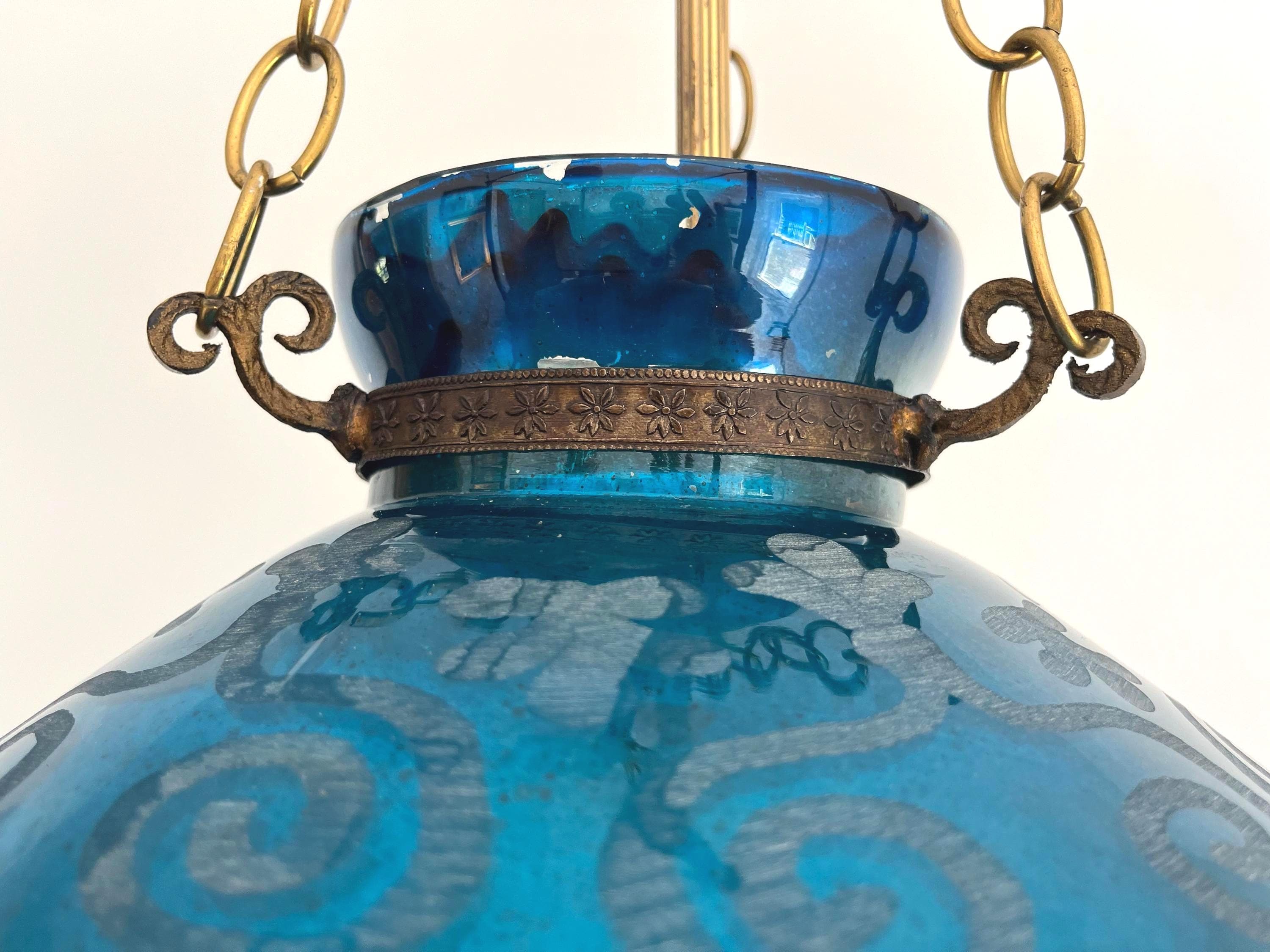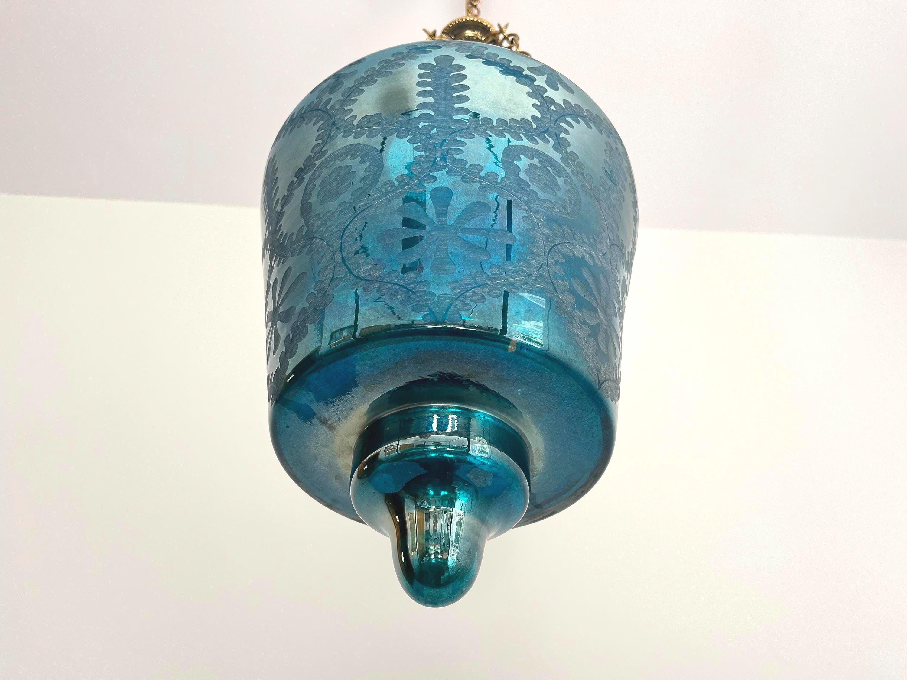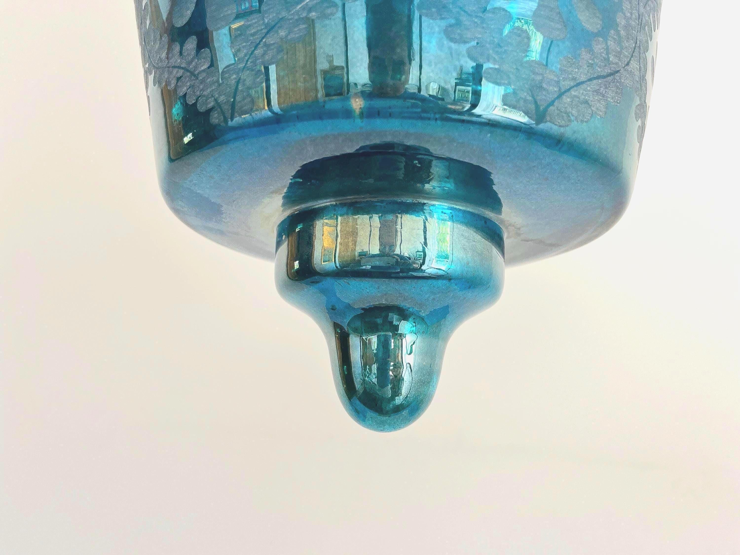 Stunning vintage bell jar hanging light of rich turquoise blue etched glass with geometric foliage patterns, etched metal collar, and tiered bottom suspended from three chains with central light.