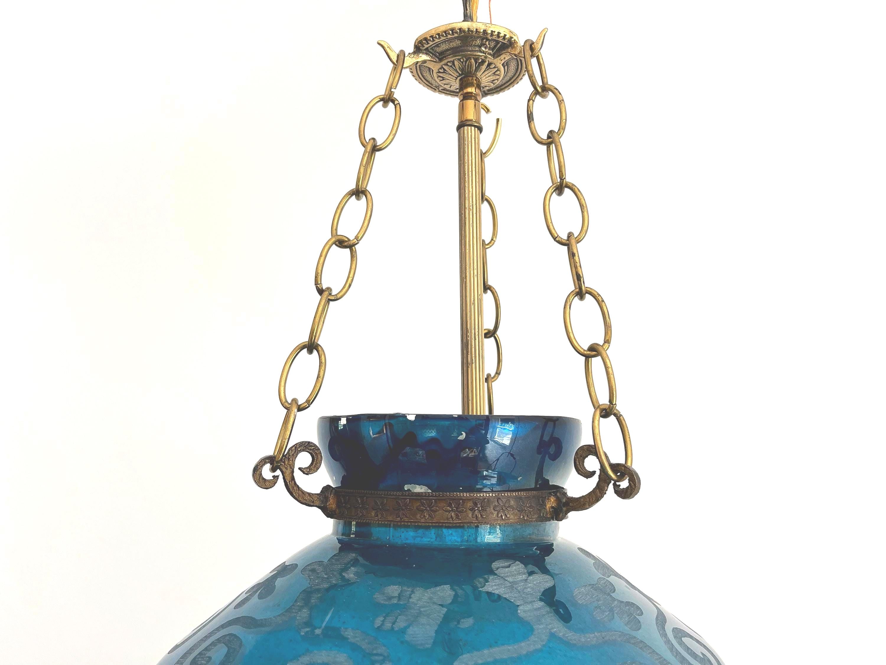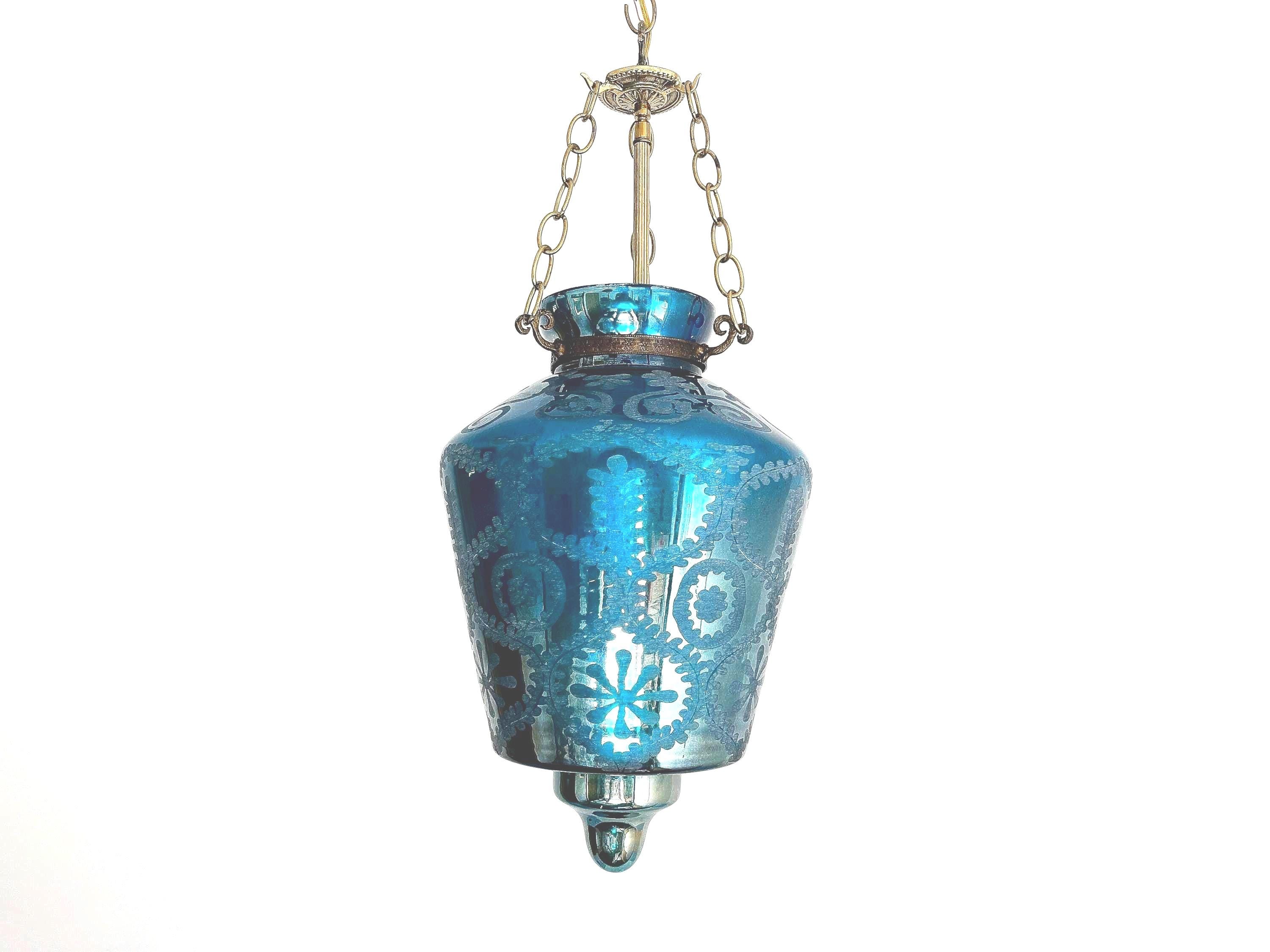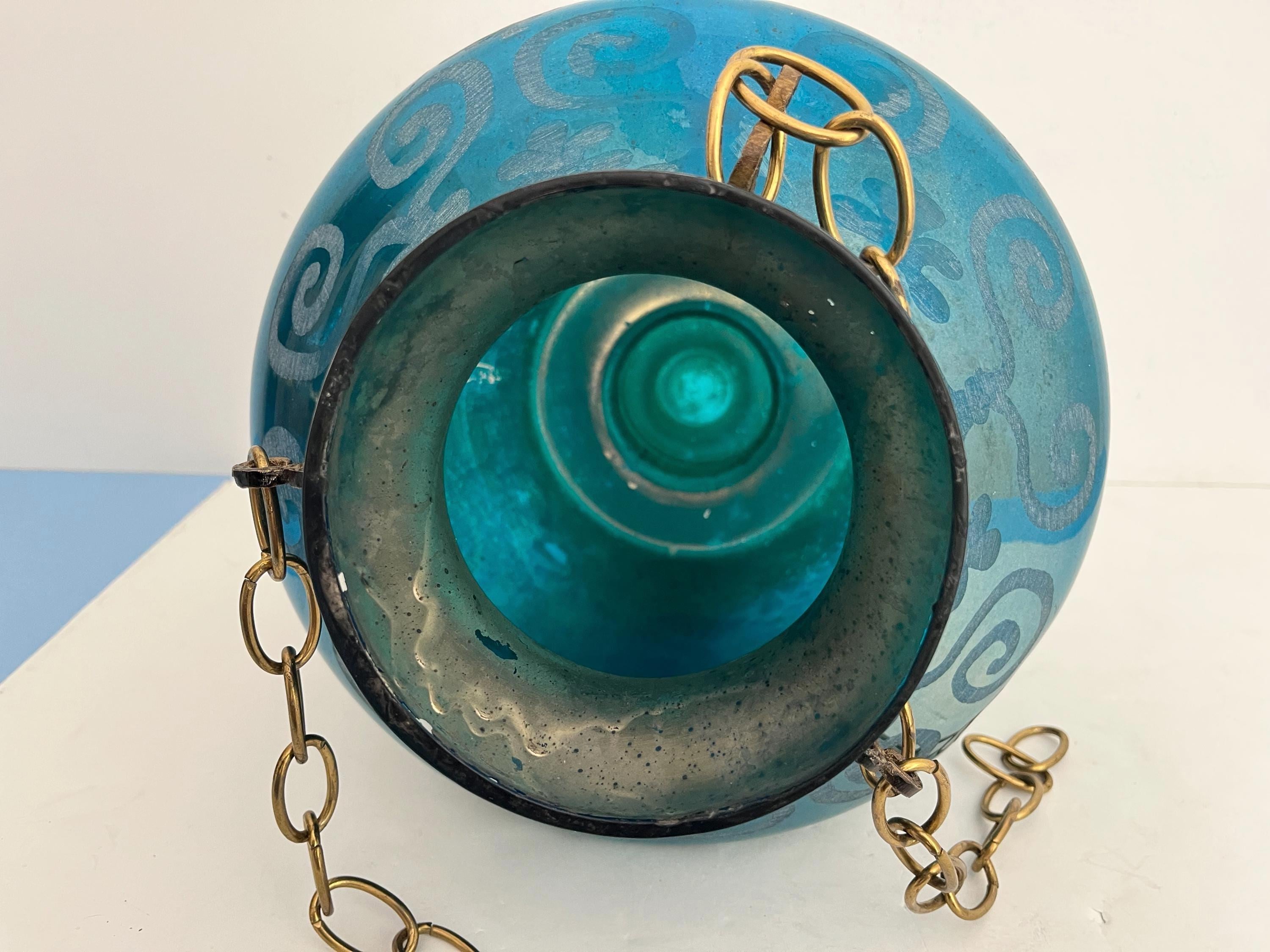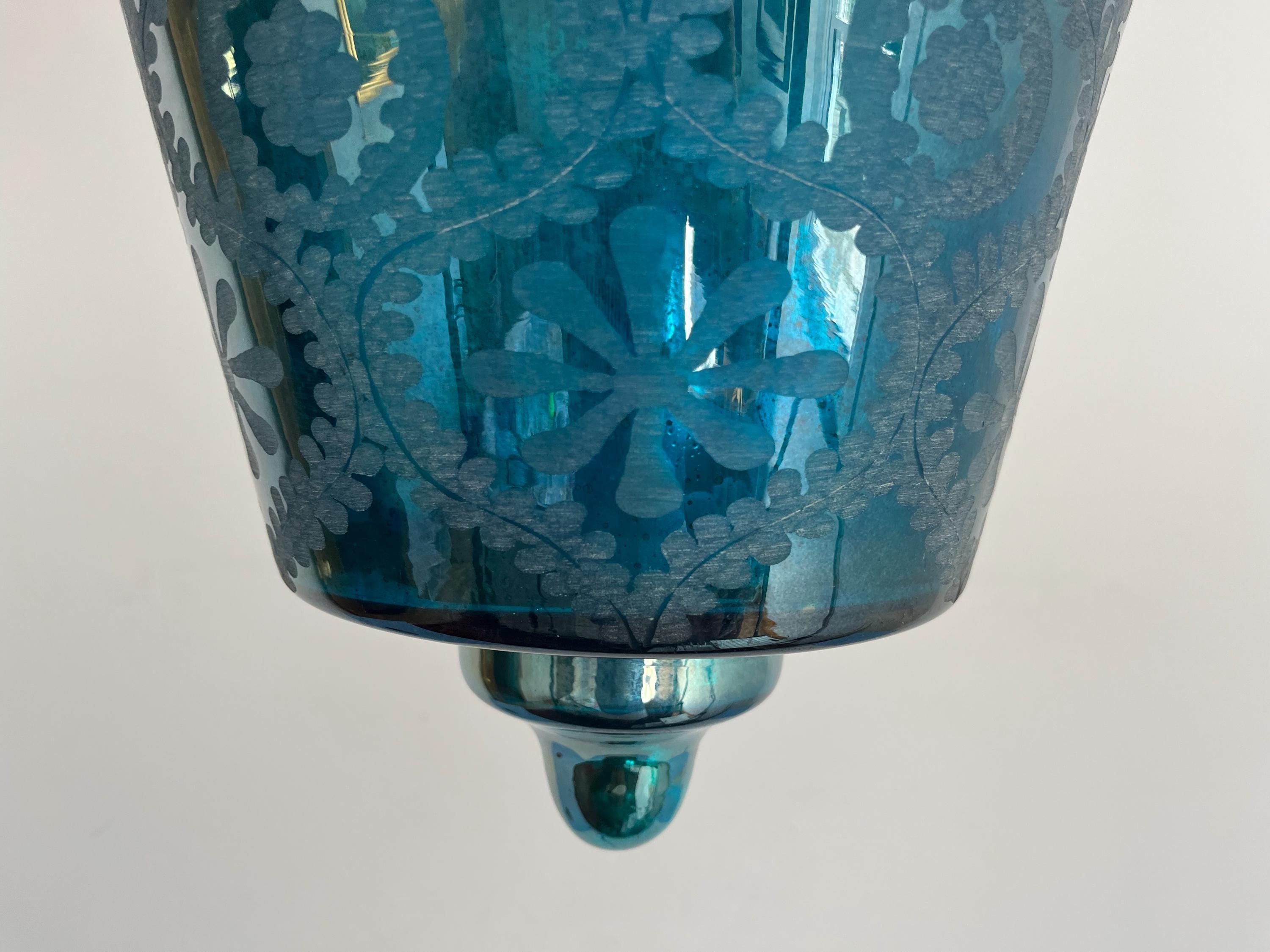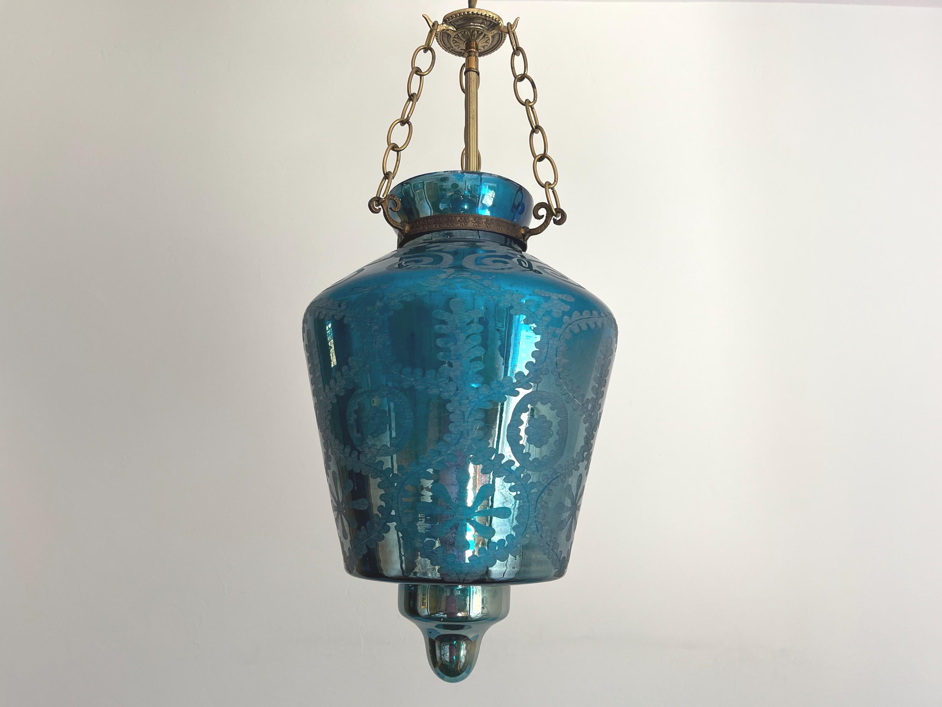 Stunning vintage bell jar hanging light of rich turquoise blue etched glass with geometric foliage patterns, etched metal collar, and tiered bottom suspended from three chains with central light.