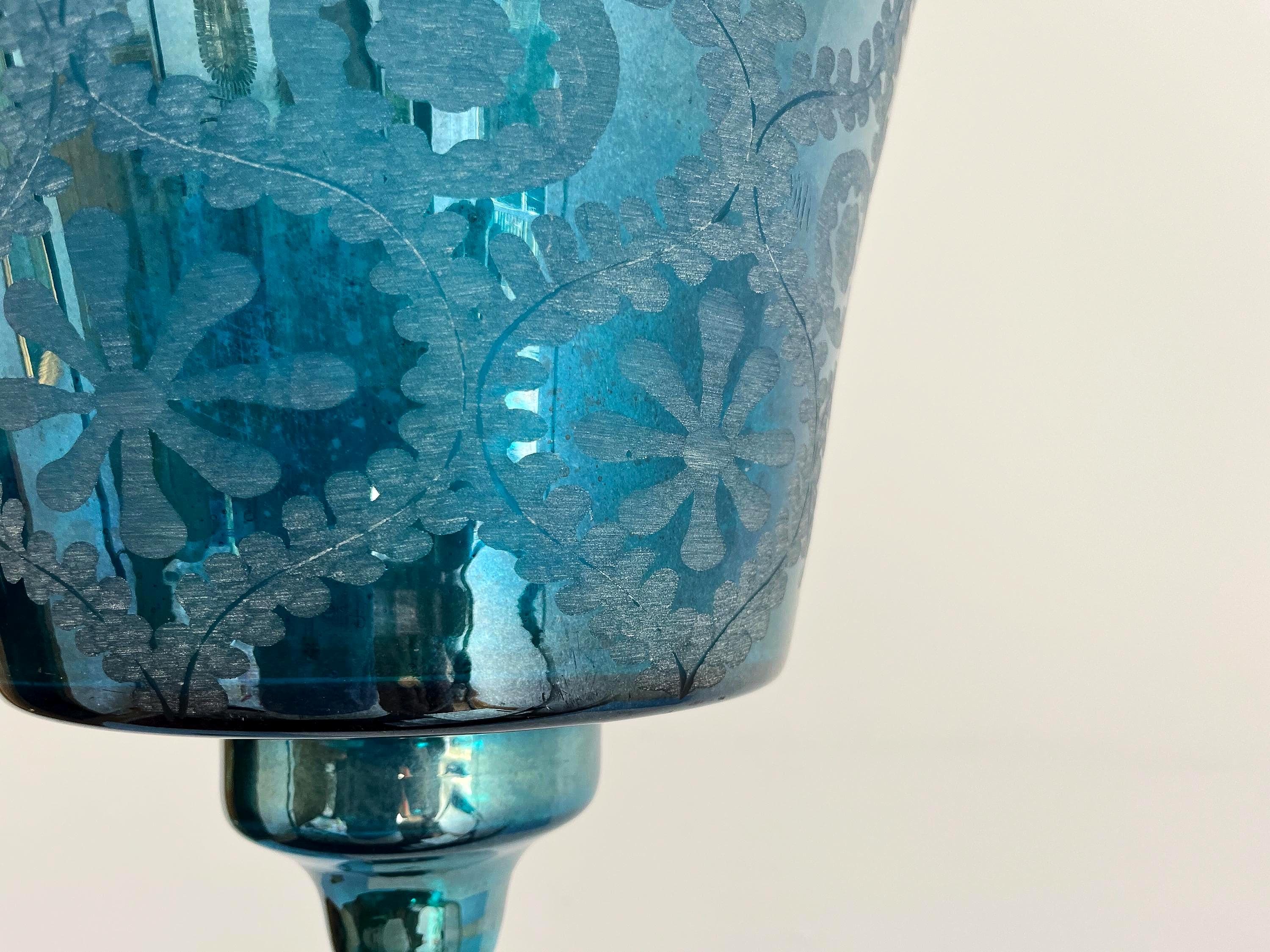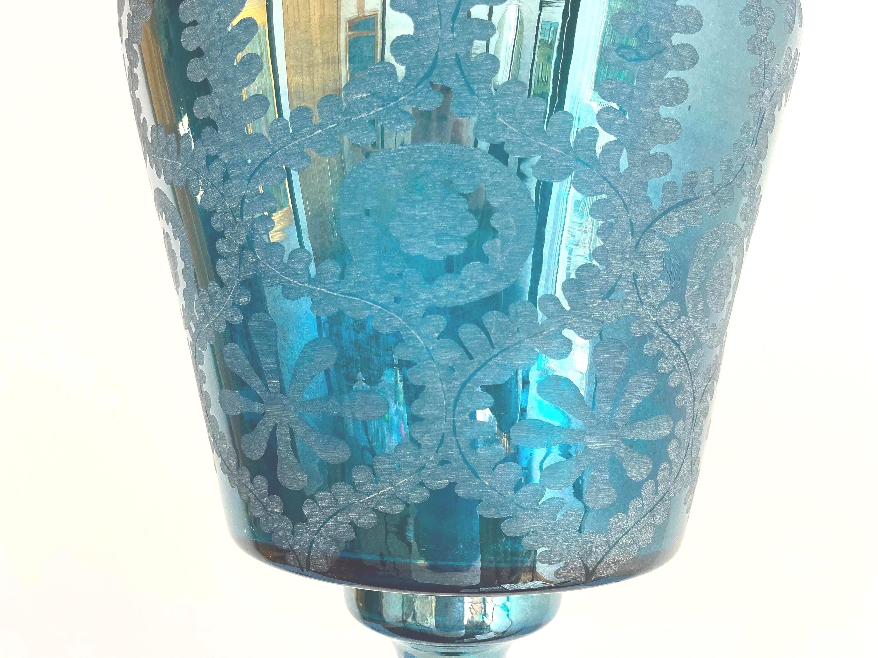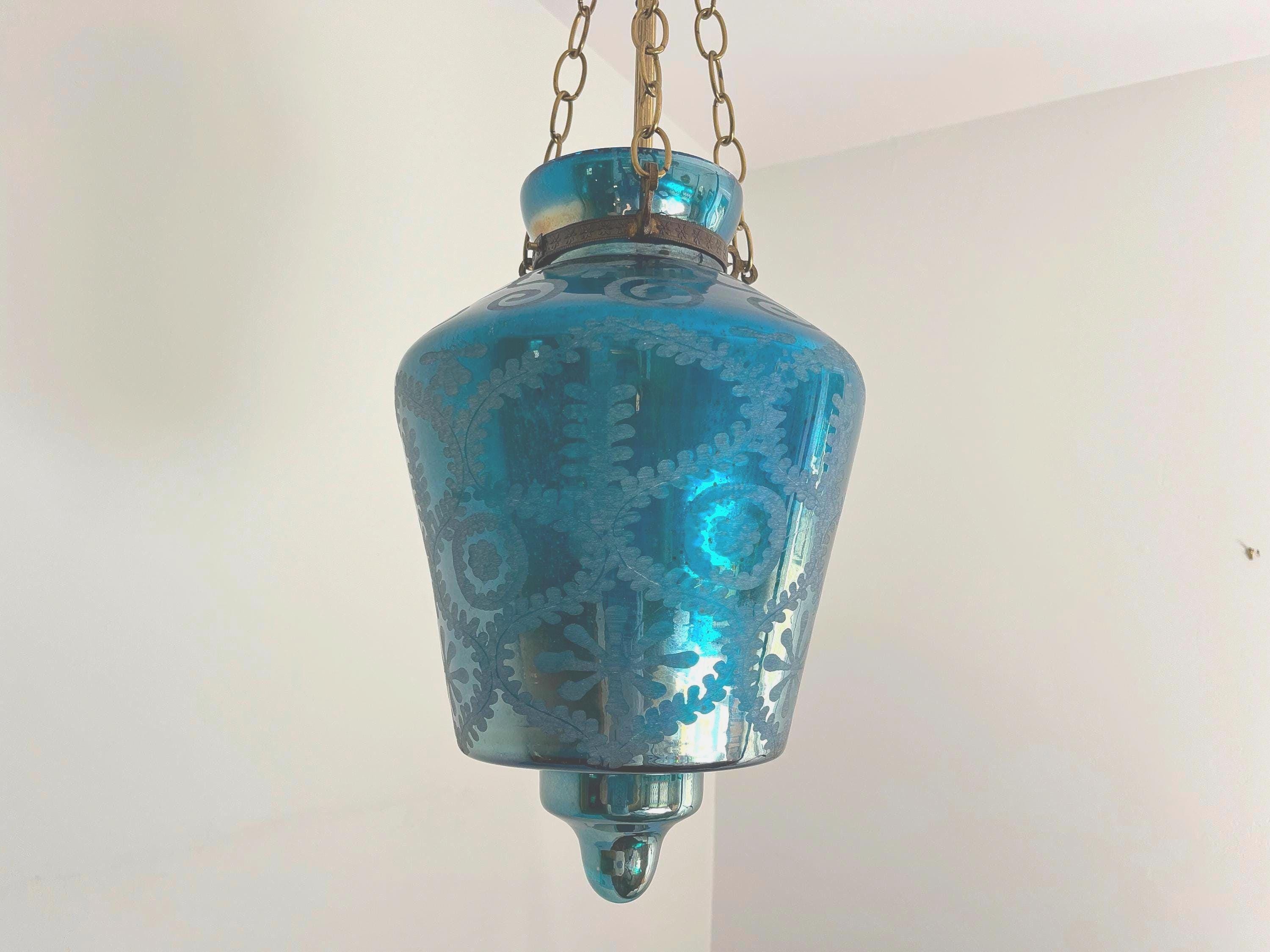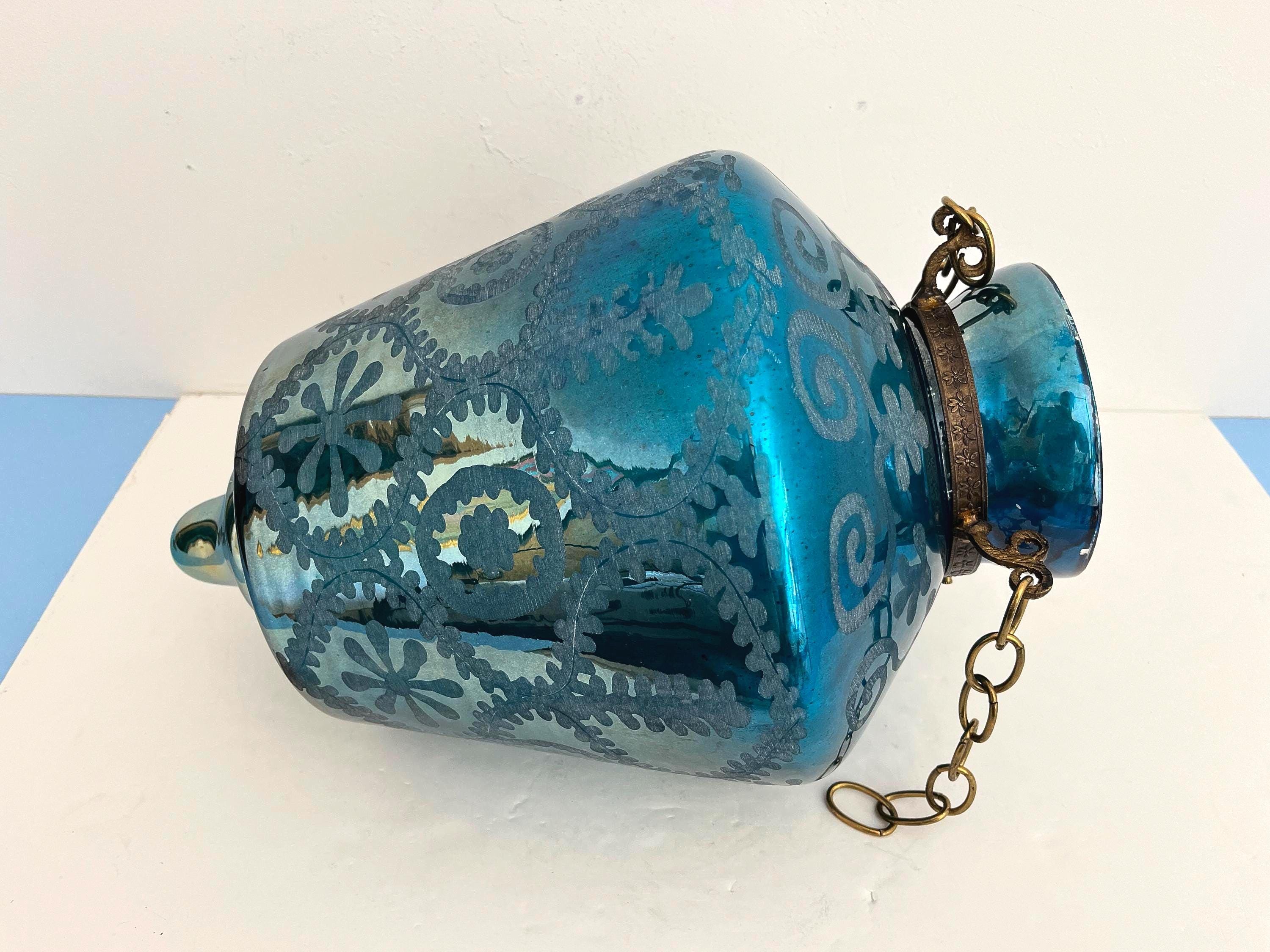 Stunning vintage bell jar hanging light of rich turquoise blue etched glass with geometric foliage patterns, etched metal collar, and tiered bottom suspended from three chains with central light.