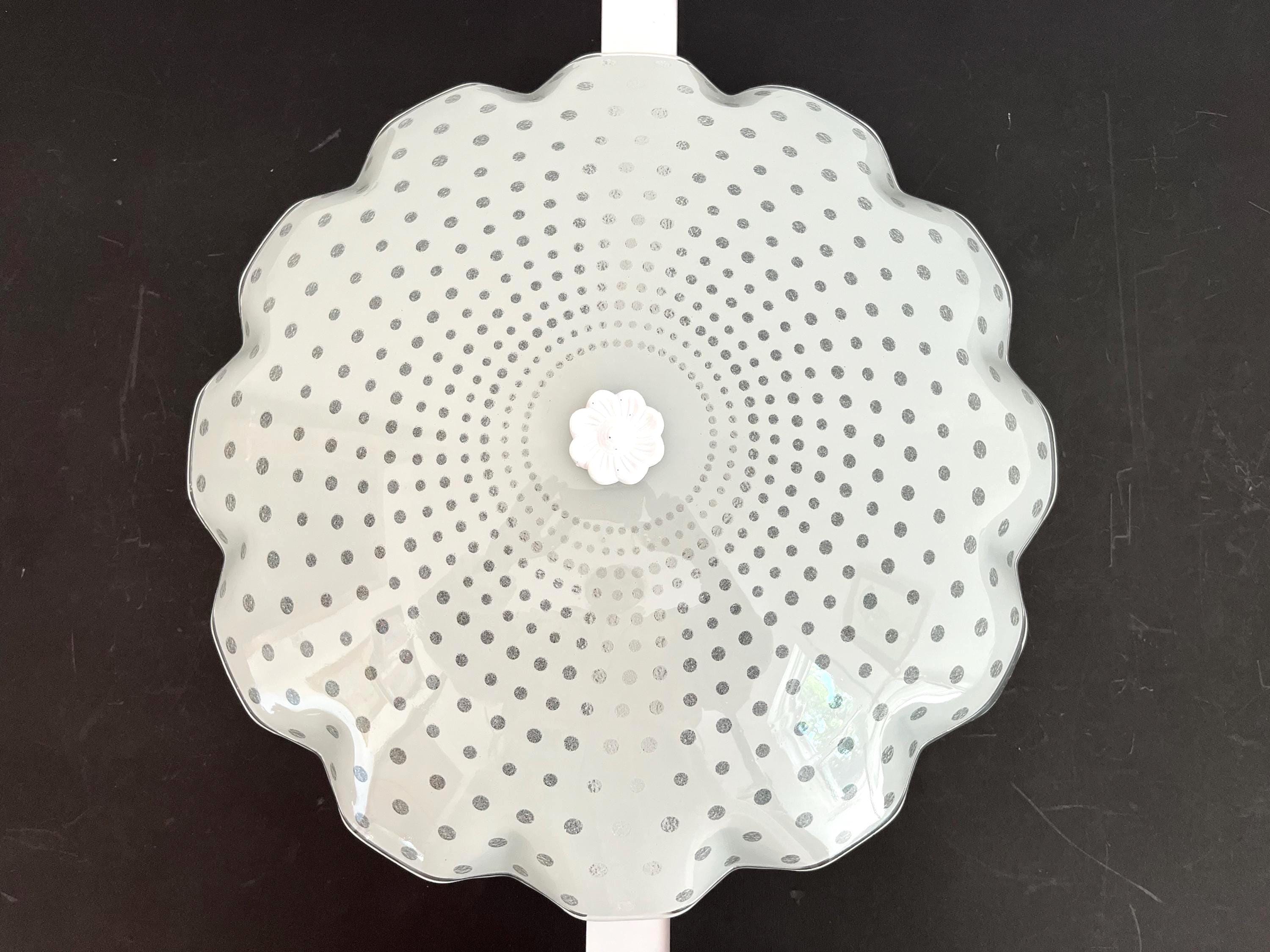 Light and airy 1950s ruffled edge polka dot flush mount ceiling light in a modern graduating circles design with chic beaded underside and two lights.