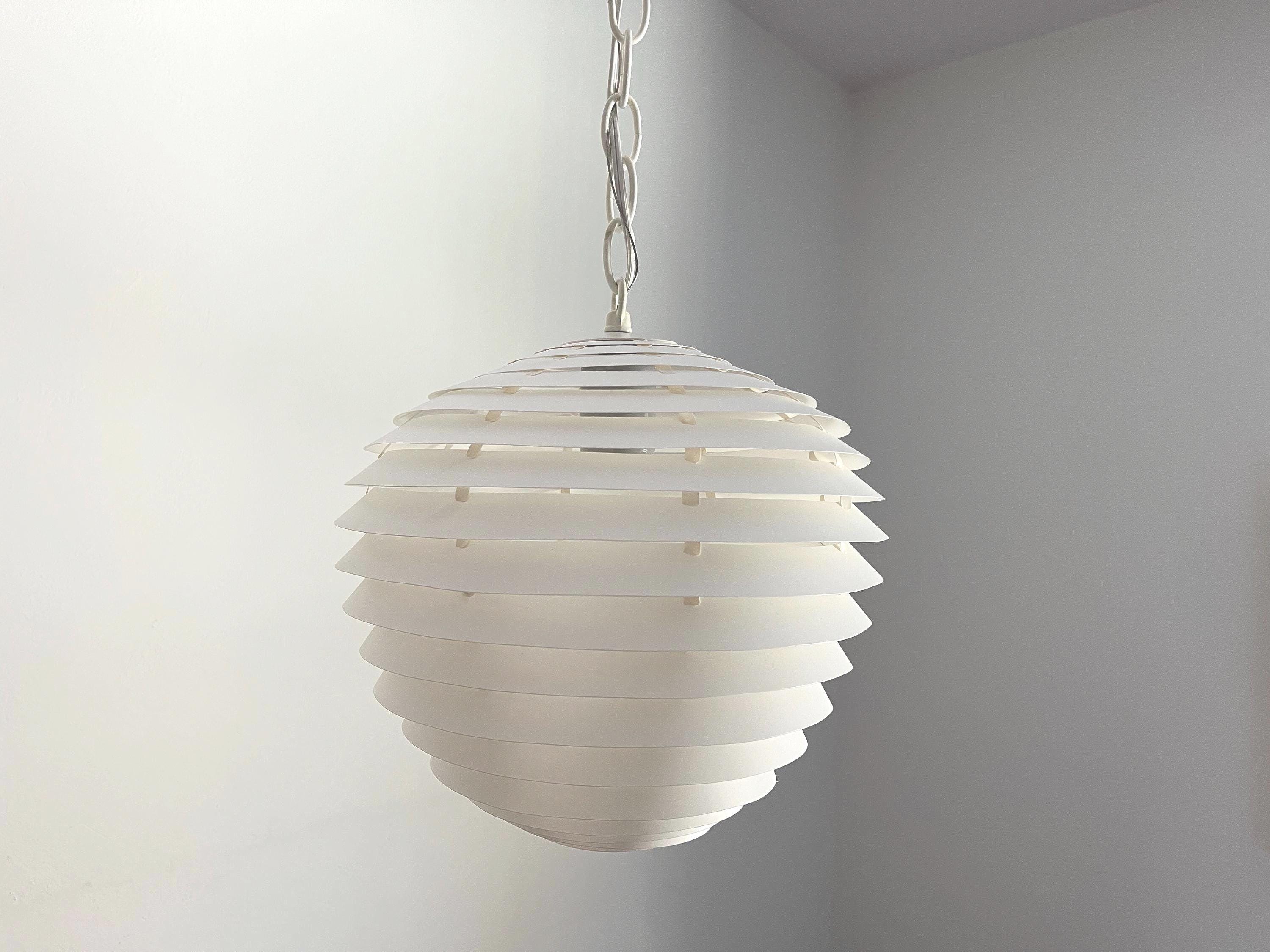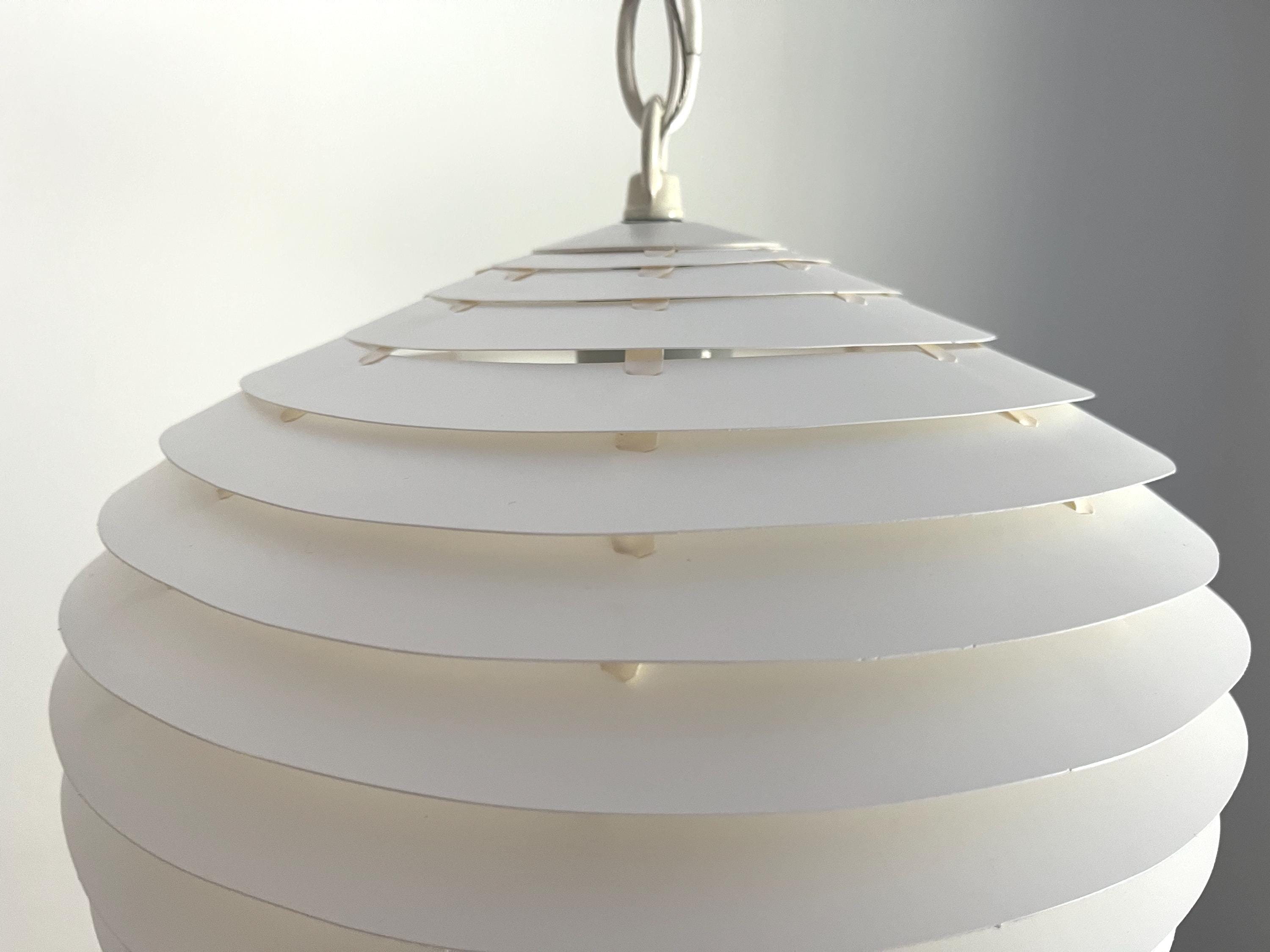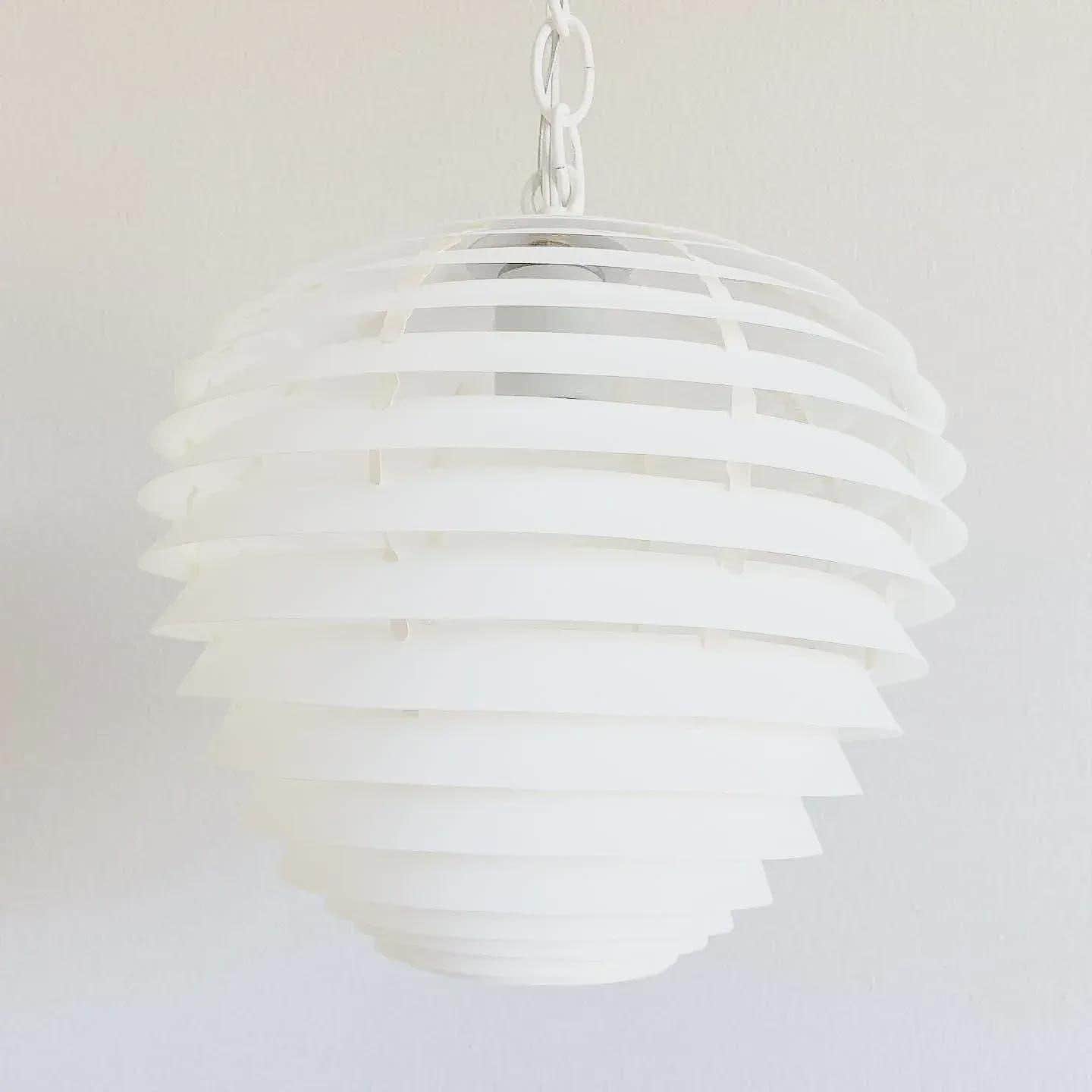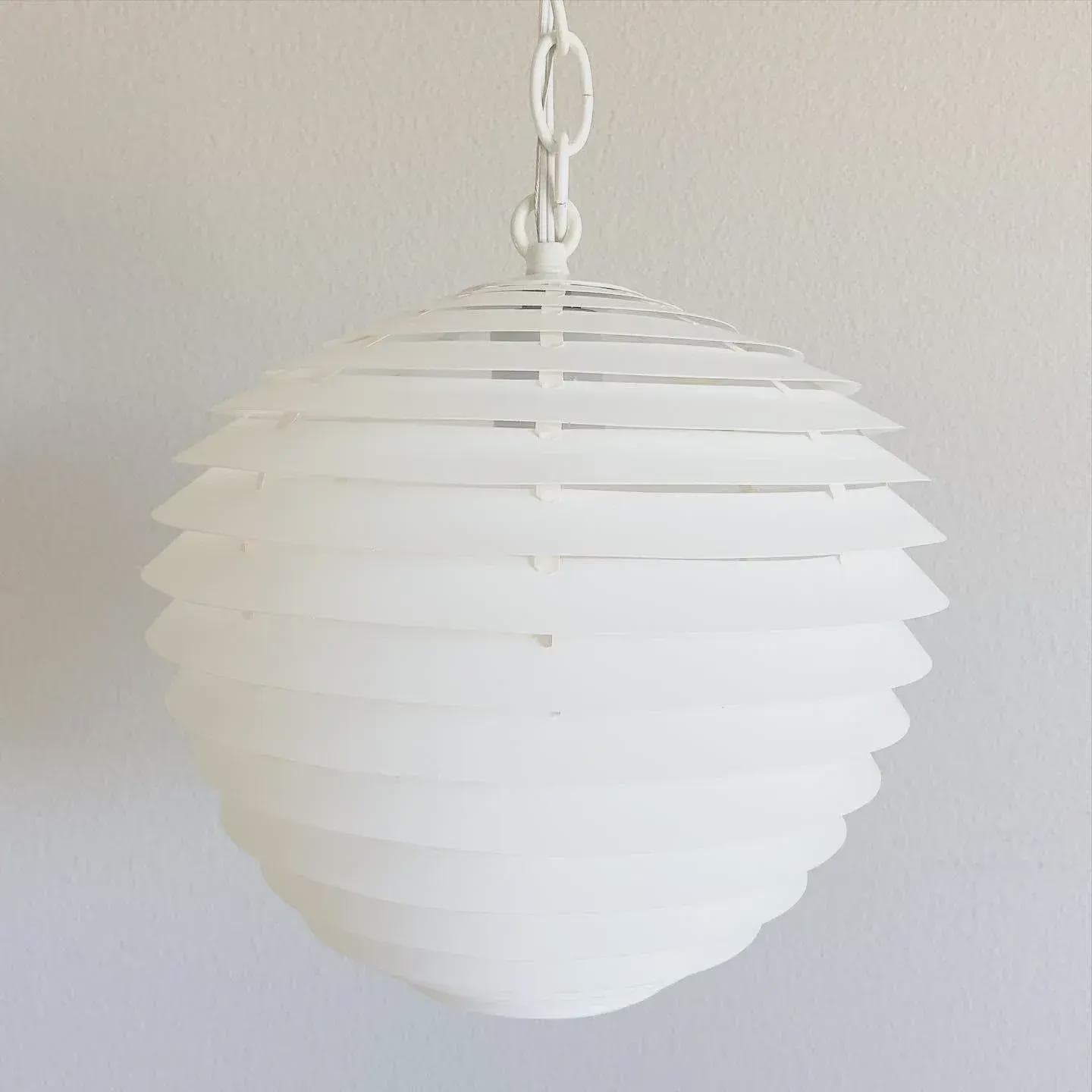 Simply stunning 1960s Danish modern louvered artichoke-shaped pendant light designed by Kokon with eighteen tiered lightweight layers in a soft creamy white with central light. Unsold store stock with original label.
