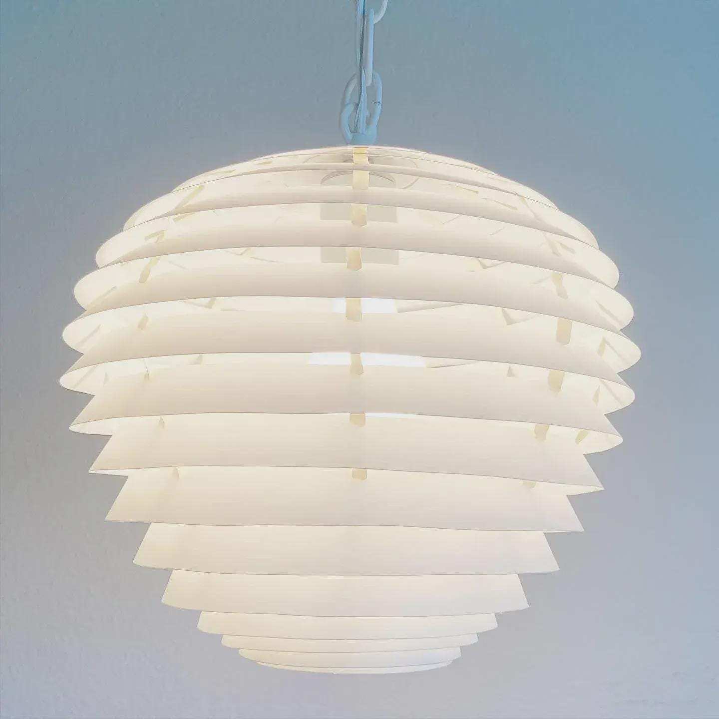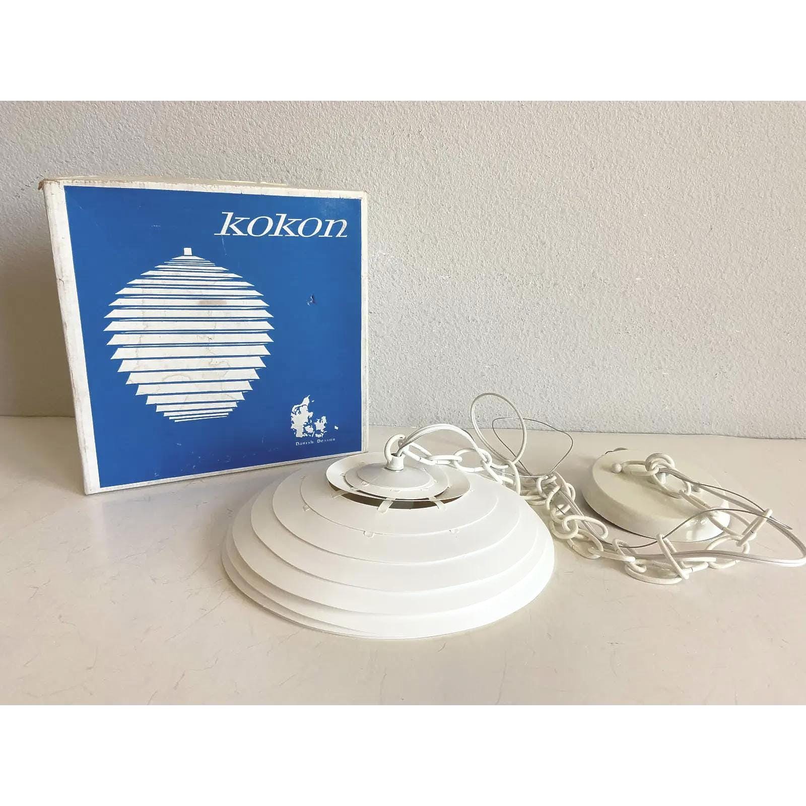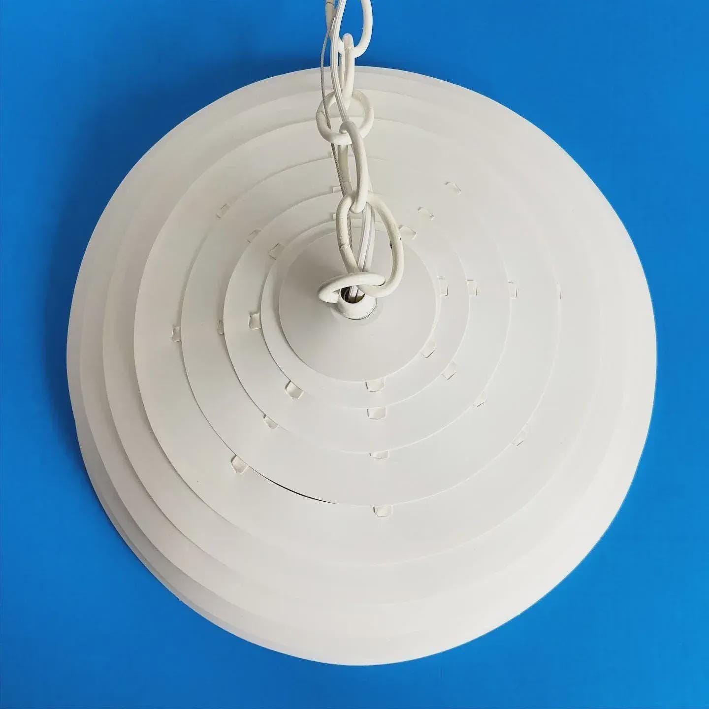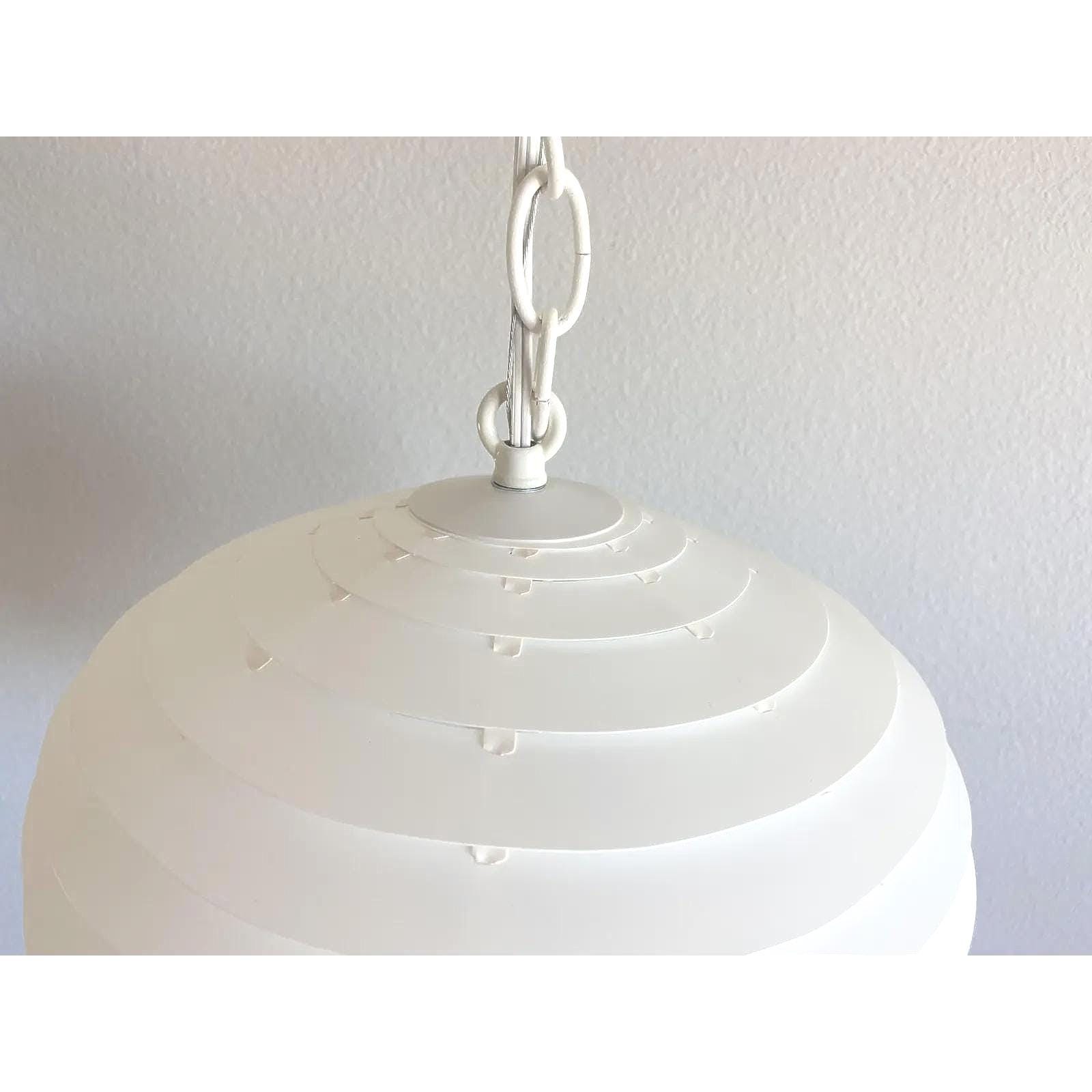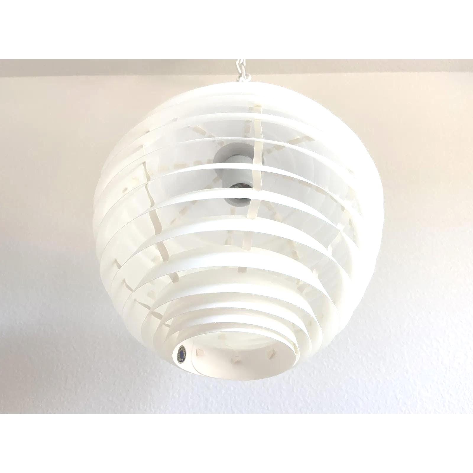 Simply stunning 1960s Danish modern louvered artichoke-shaped pendant light designed by Kokon with eighteen tiered lightweight layers in a soft creamy white with central light. Unsold store stock with original label.