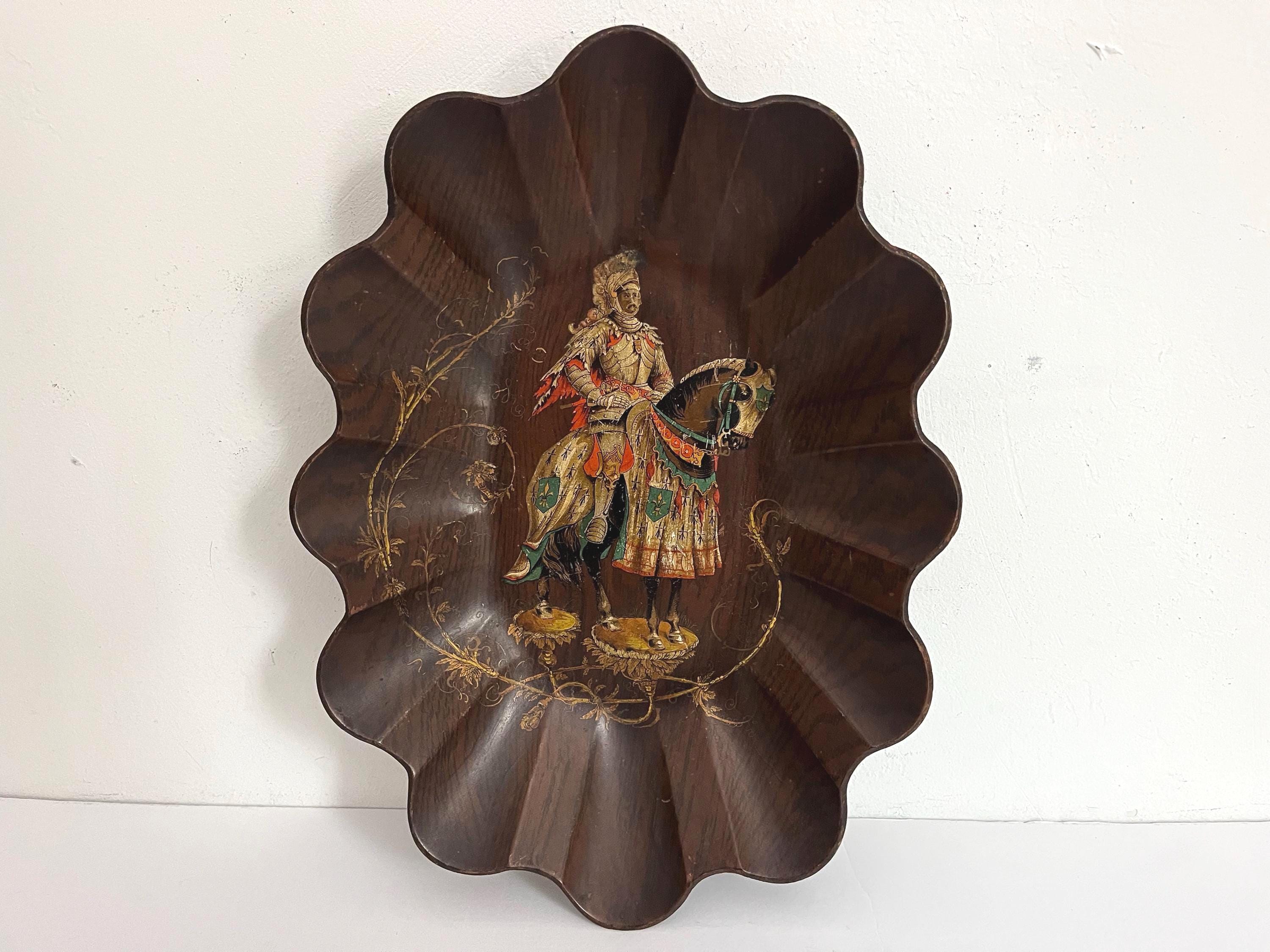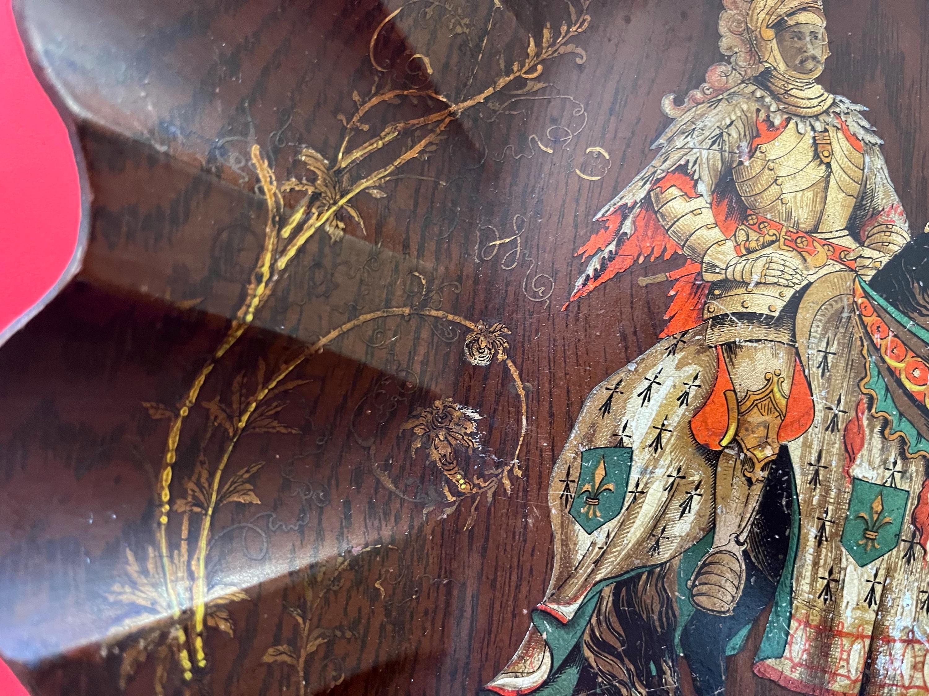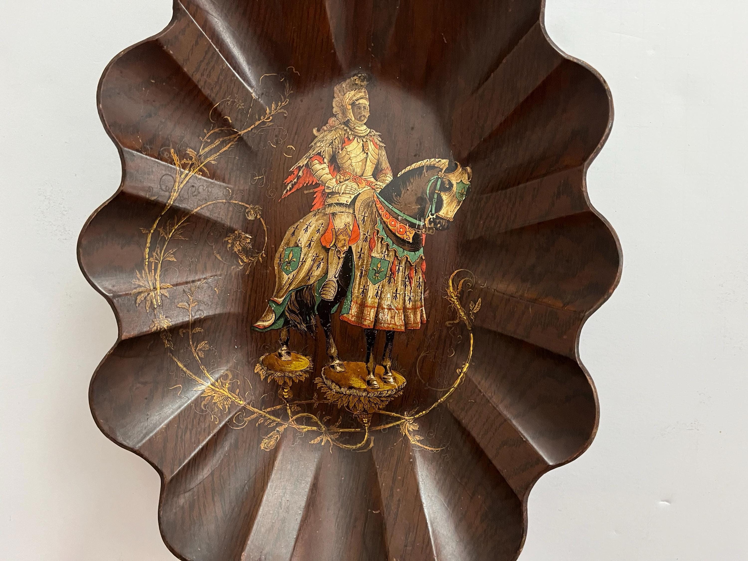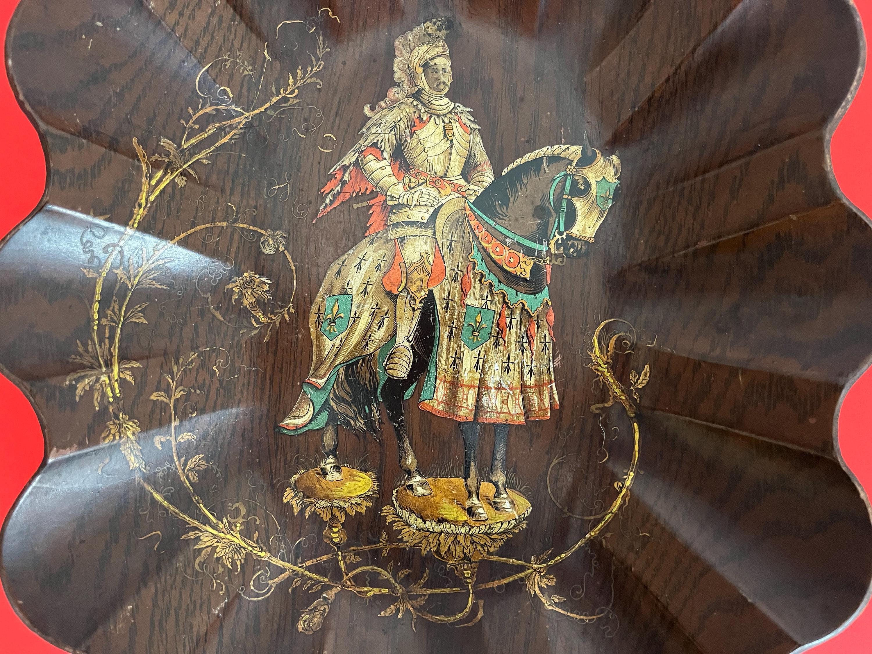 Stunning antique French paper mache` wood grain style ruffled bowl or tray hand painted with a French chevalier on horseback in full dress armor with pedestal mounts and gold leafy cartouche.