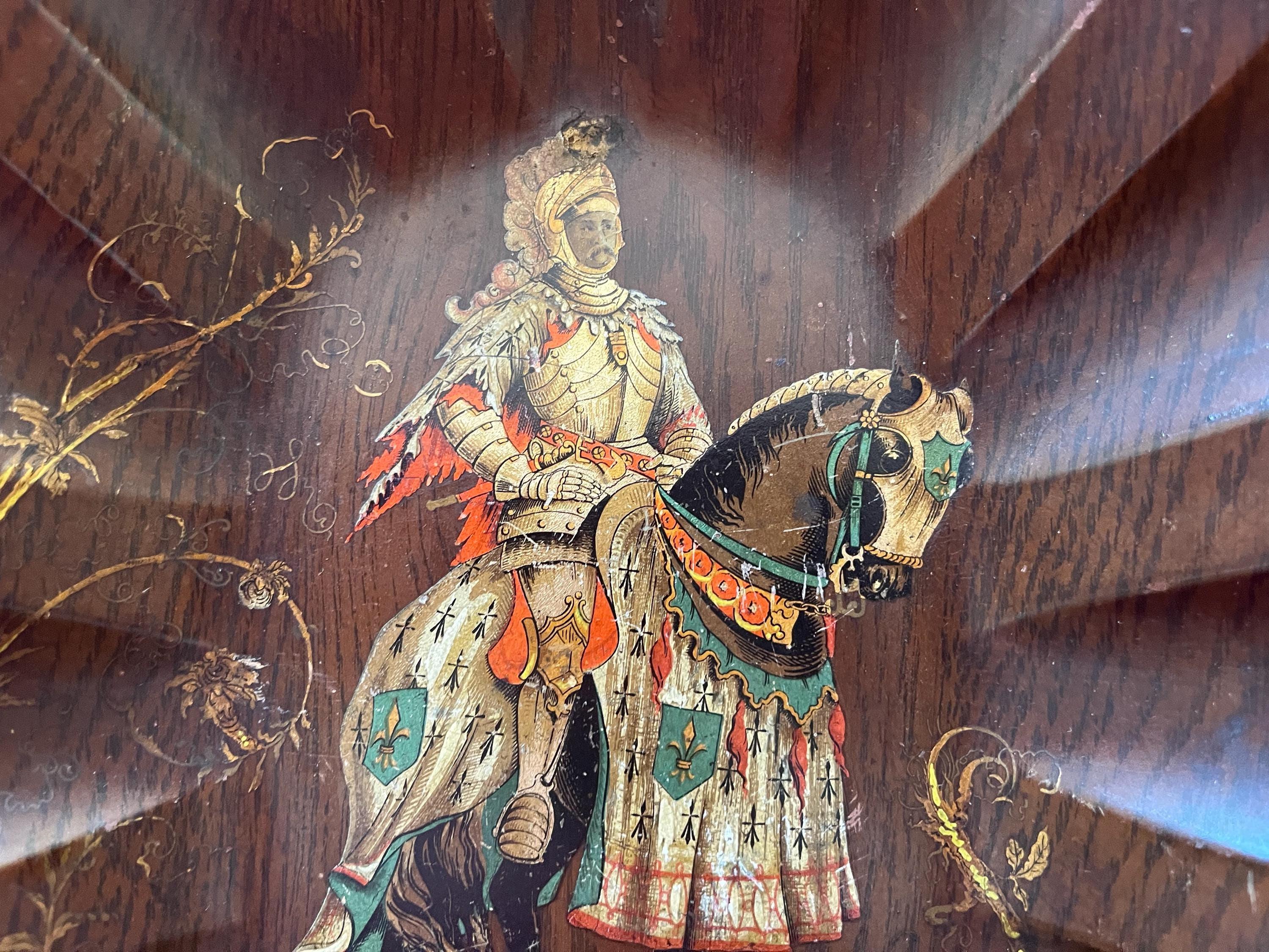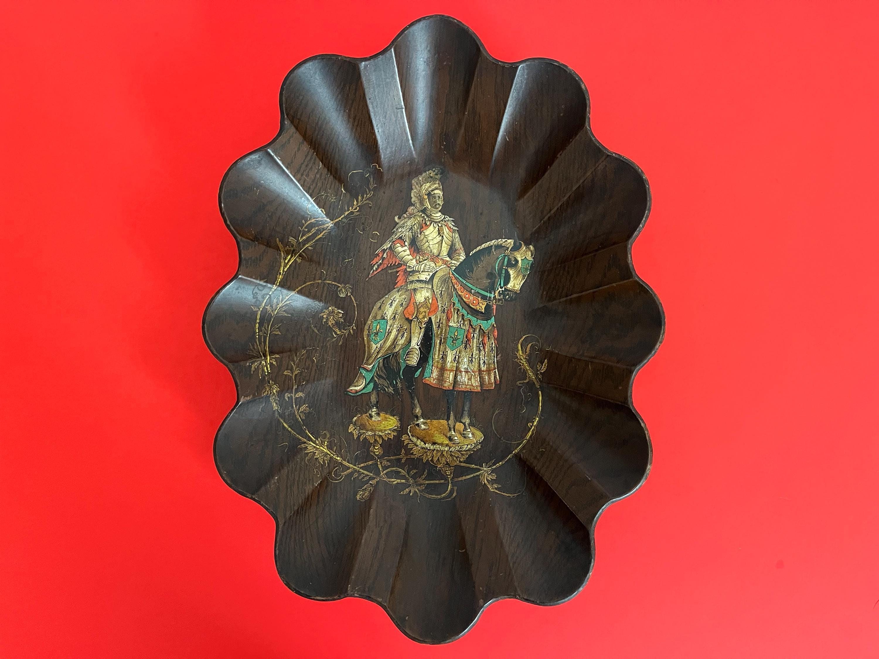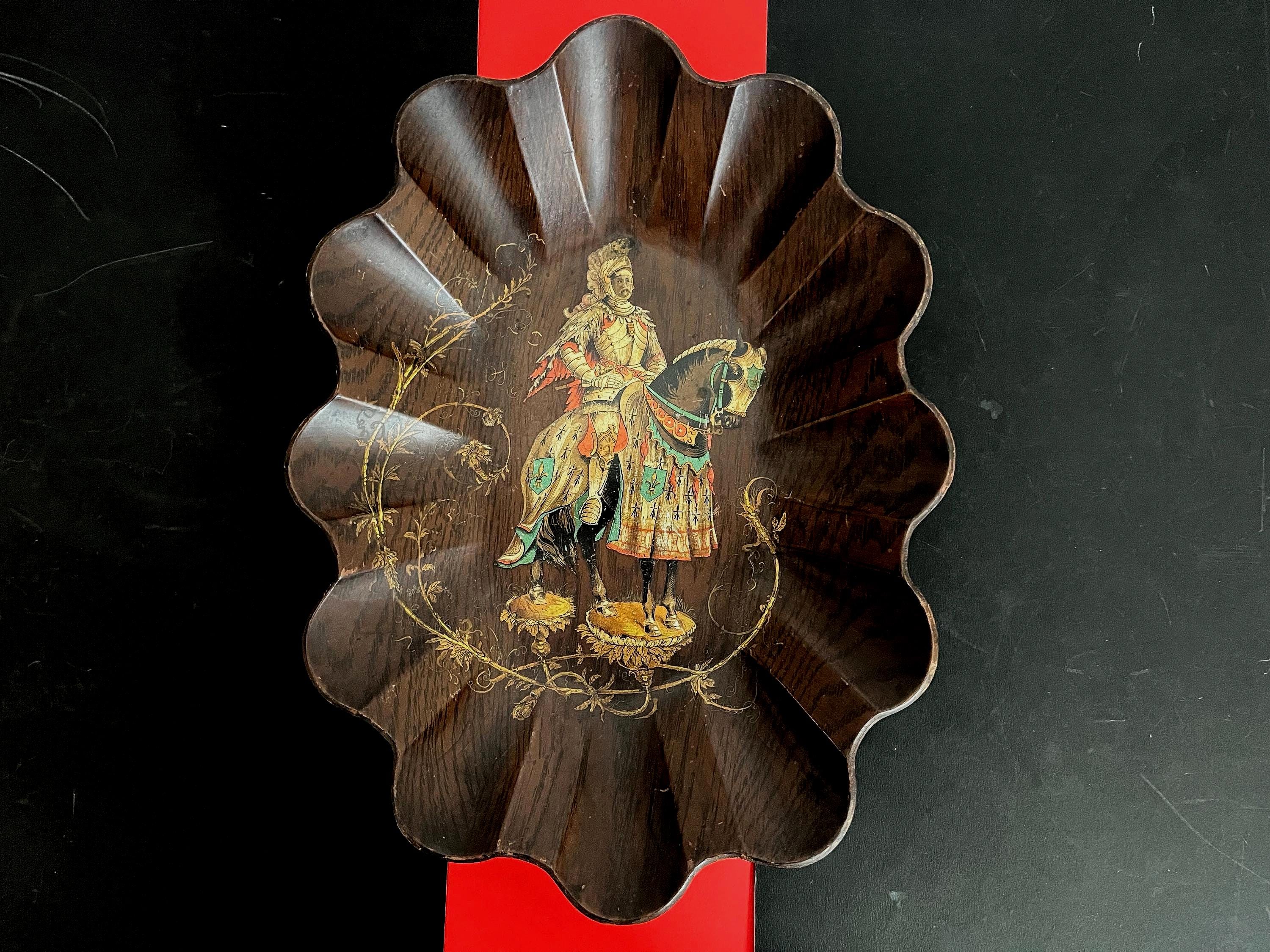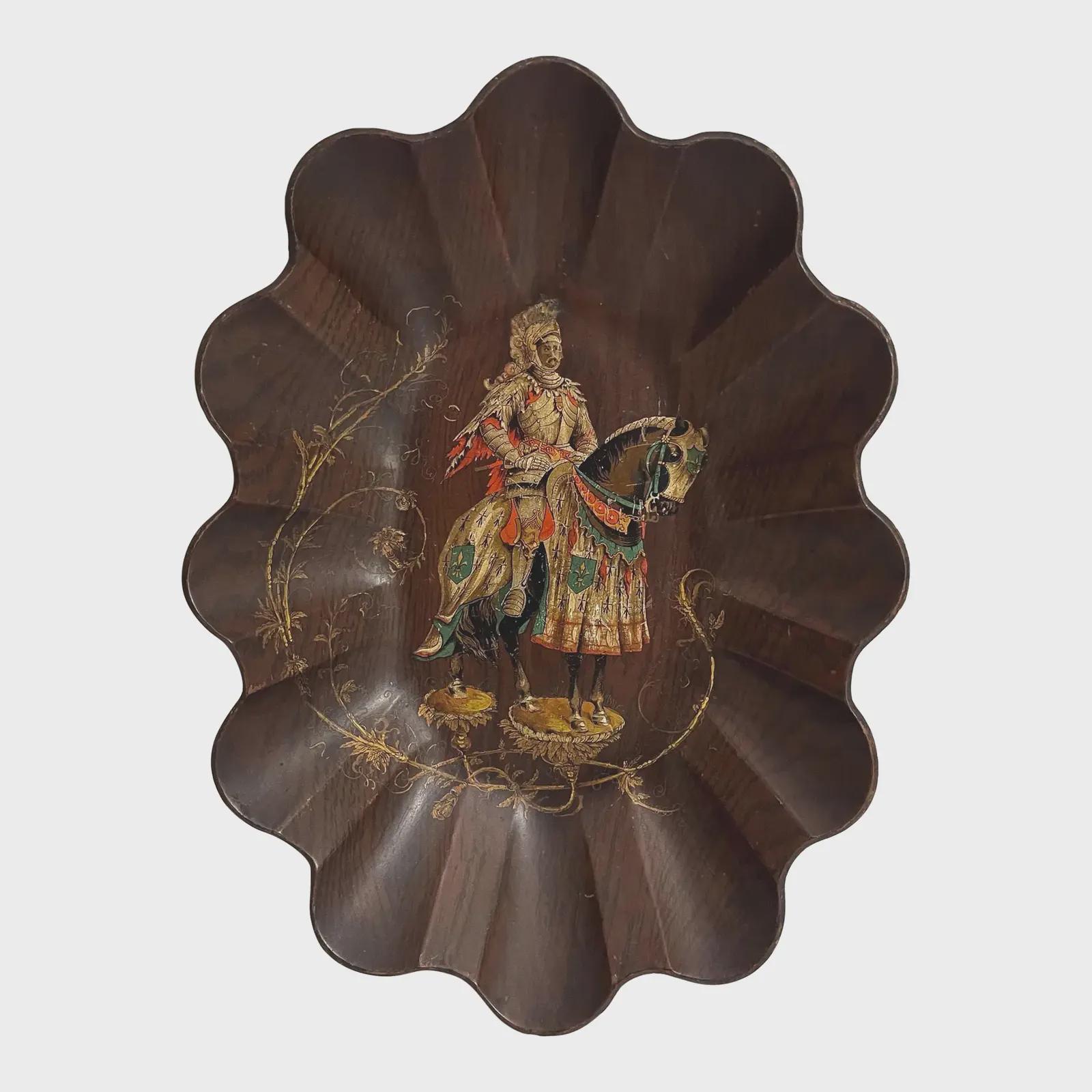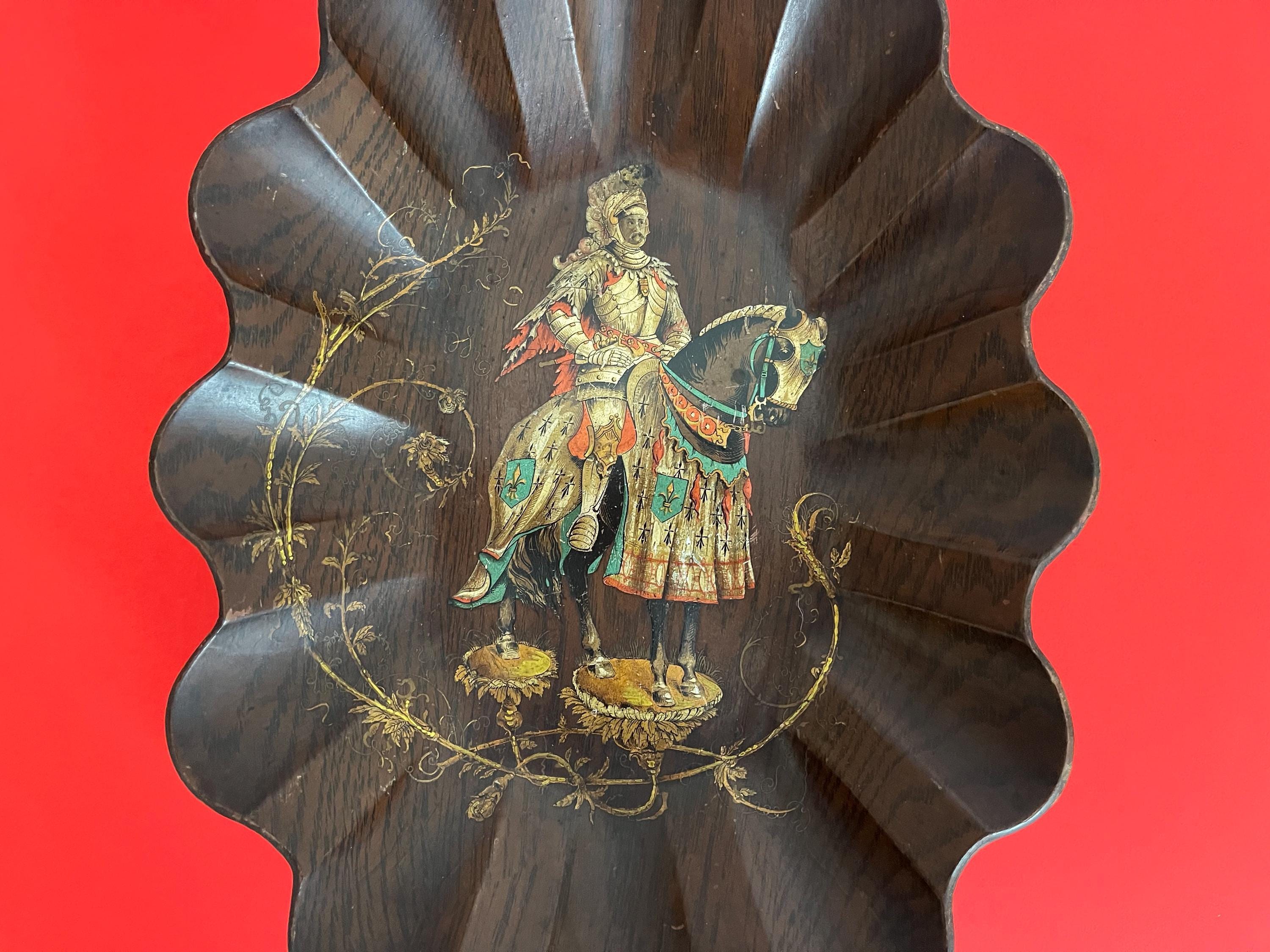 Stunning antique French paper mache` wood grain style ruffled bowl or tray hand painted with a French chevalier on horseback in full dress armor with pedestal mounts and gold leafy cartouche.