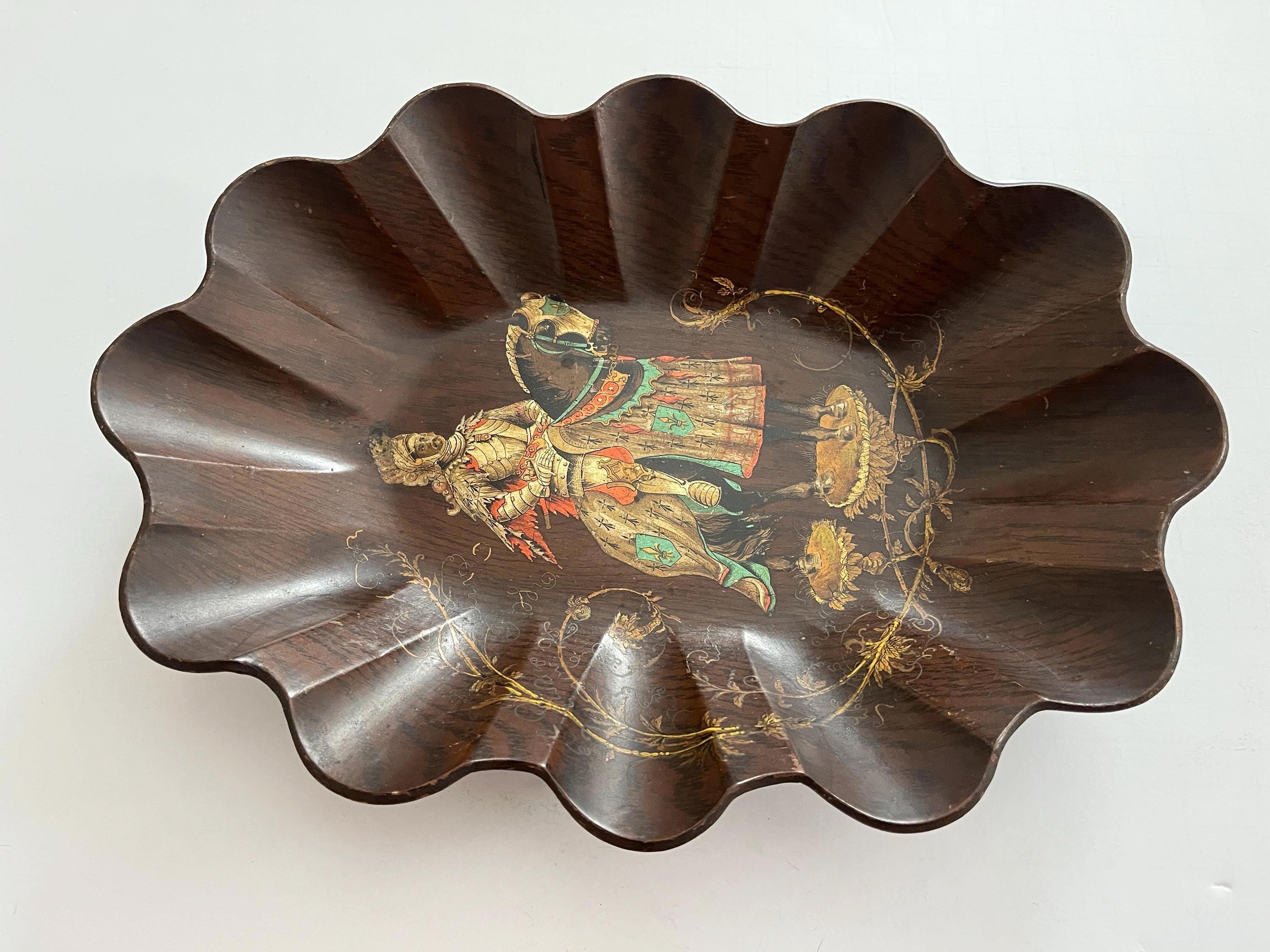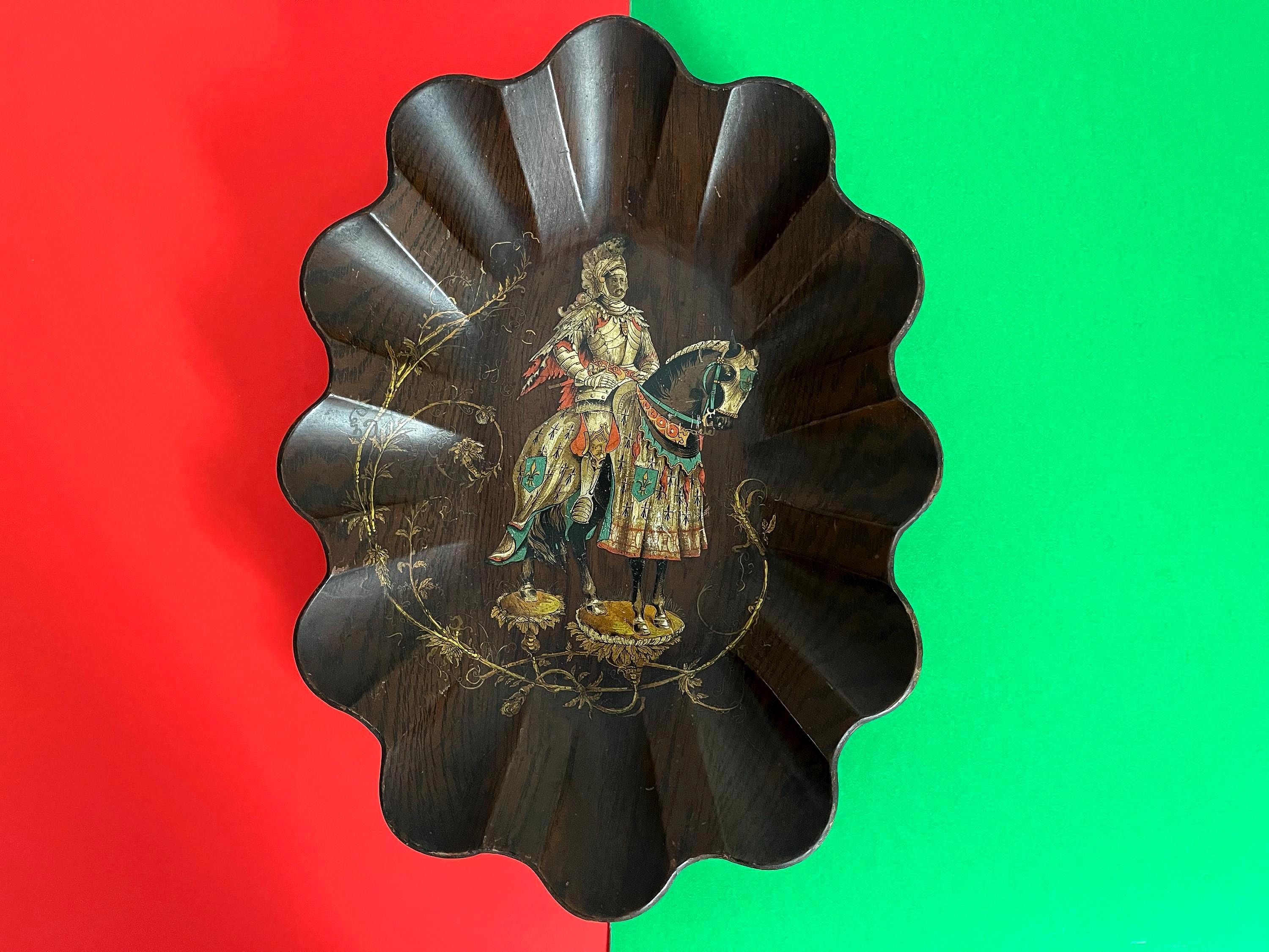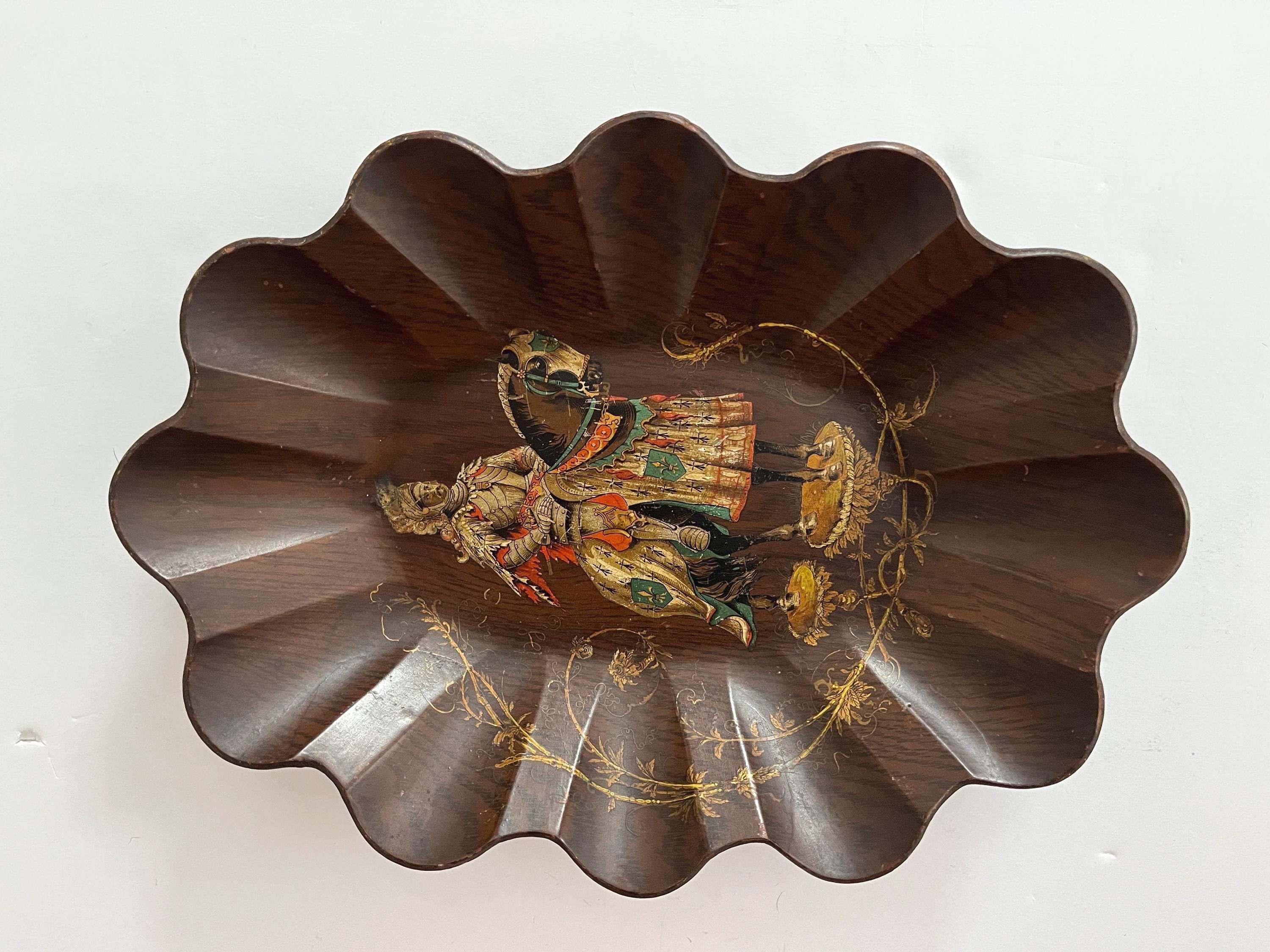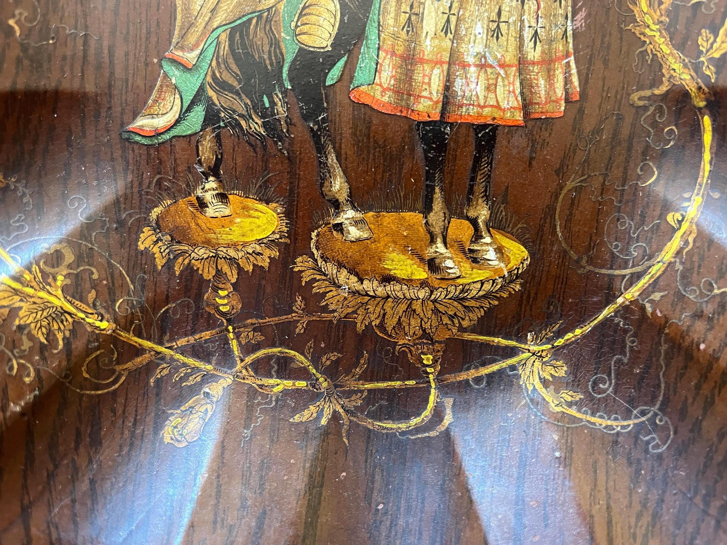 Stunning antique French paper mache` wood grain style ruffled bowl or tray hand painted with a French chevalier on horseback in full dress armor with pedestal mounts and gold leafy cartouche.