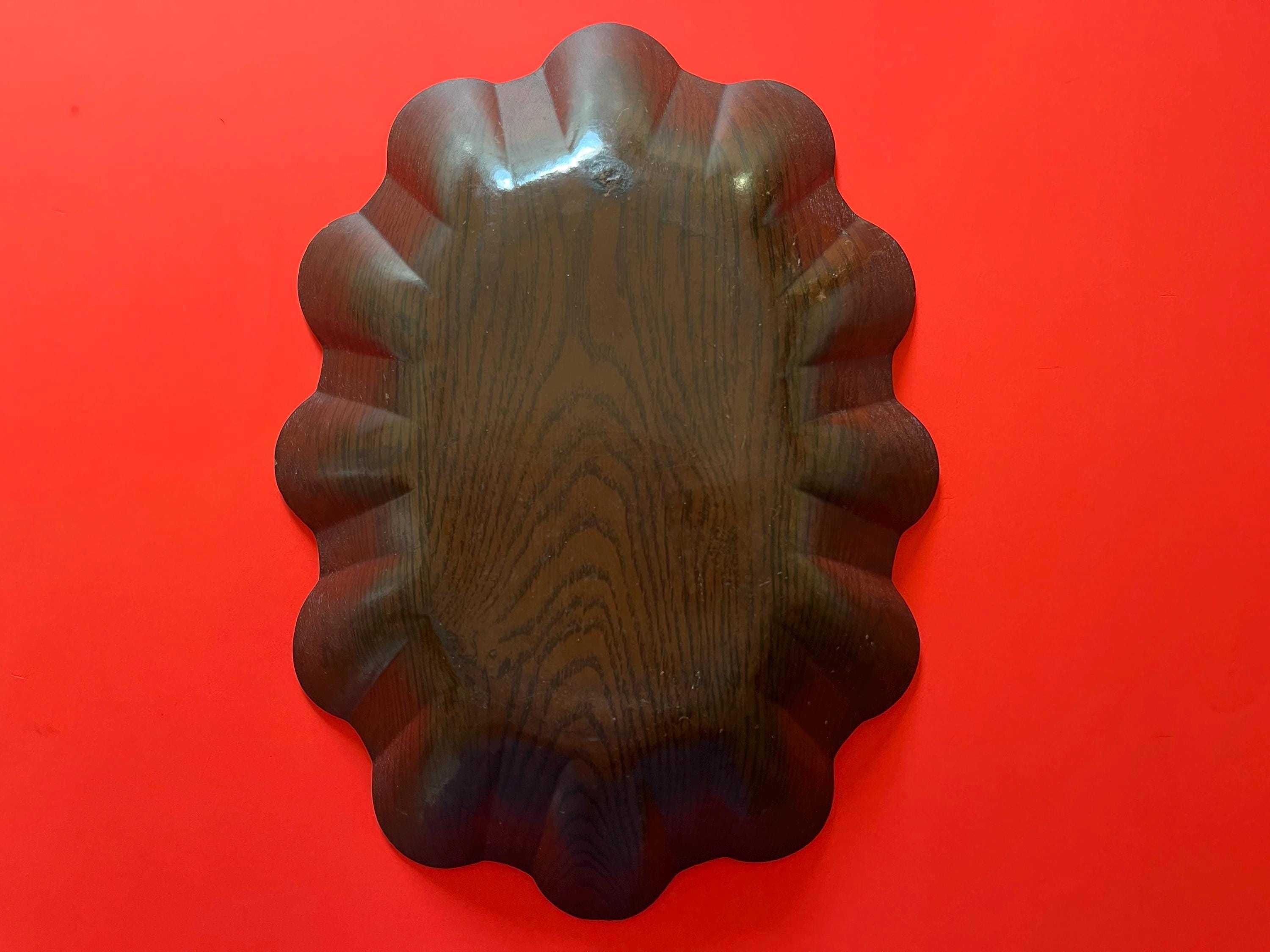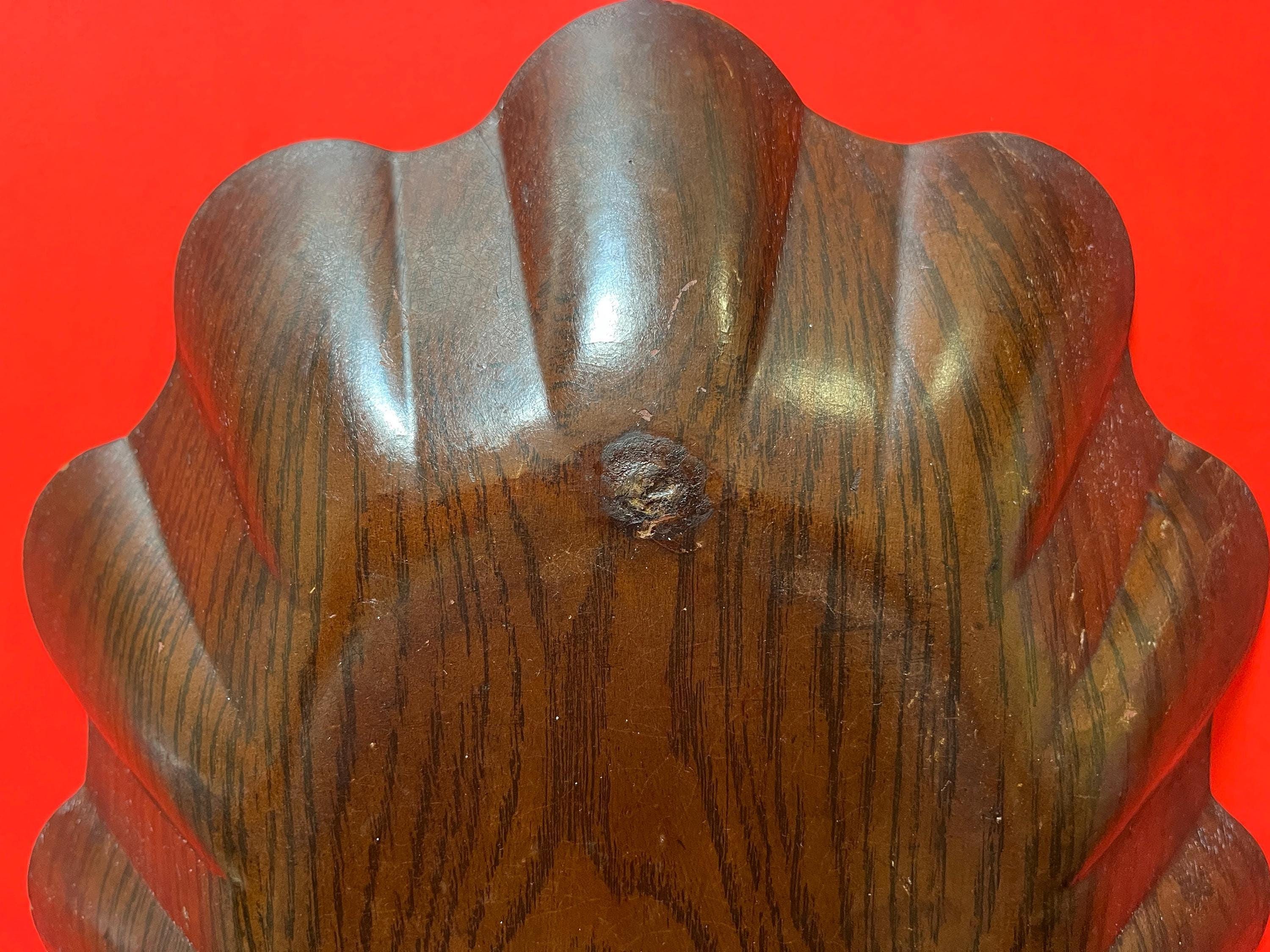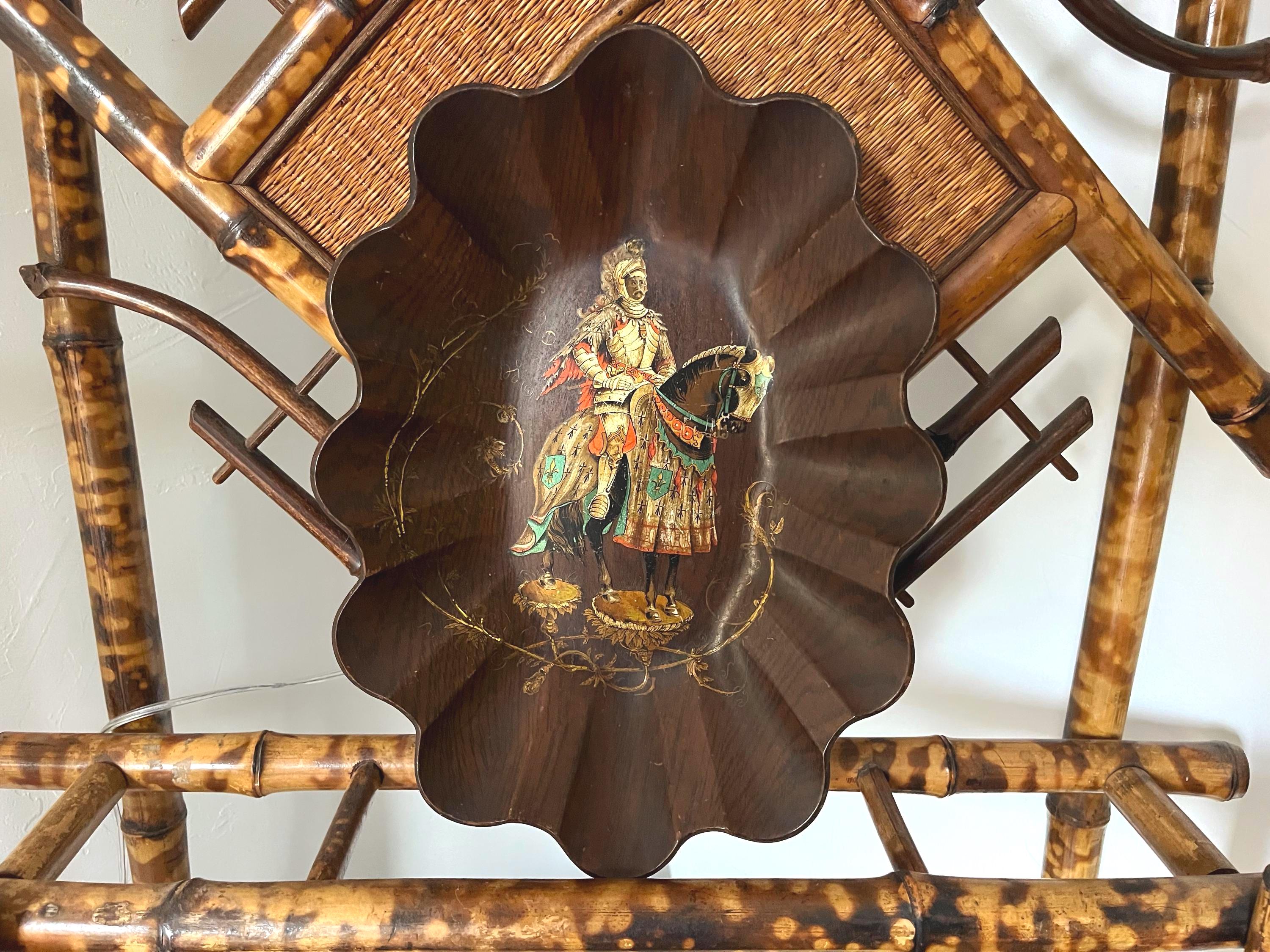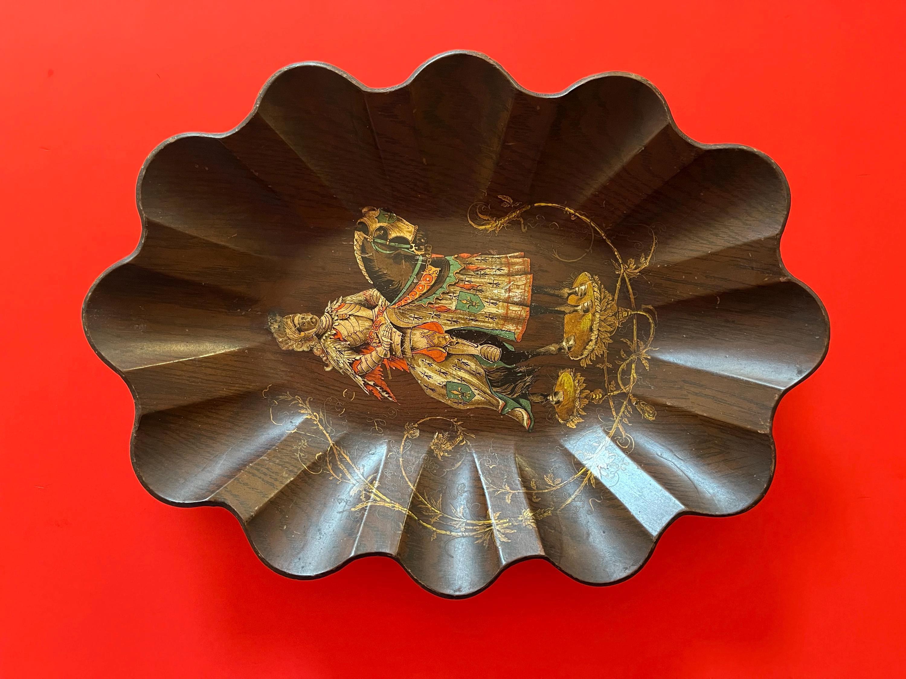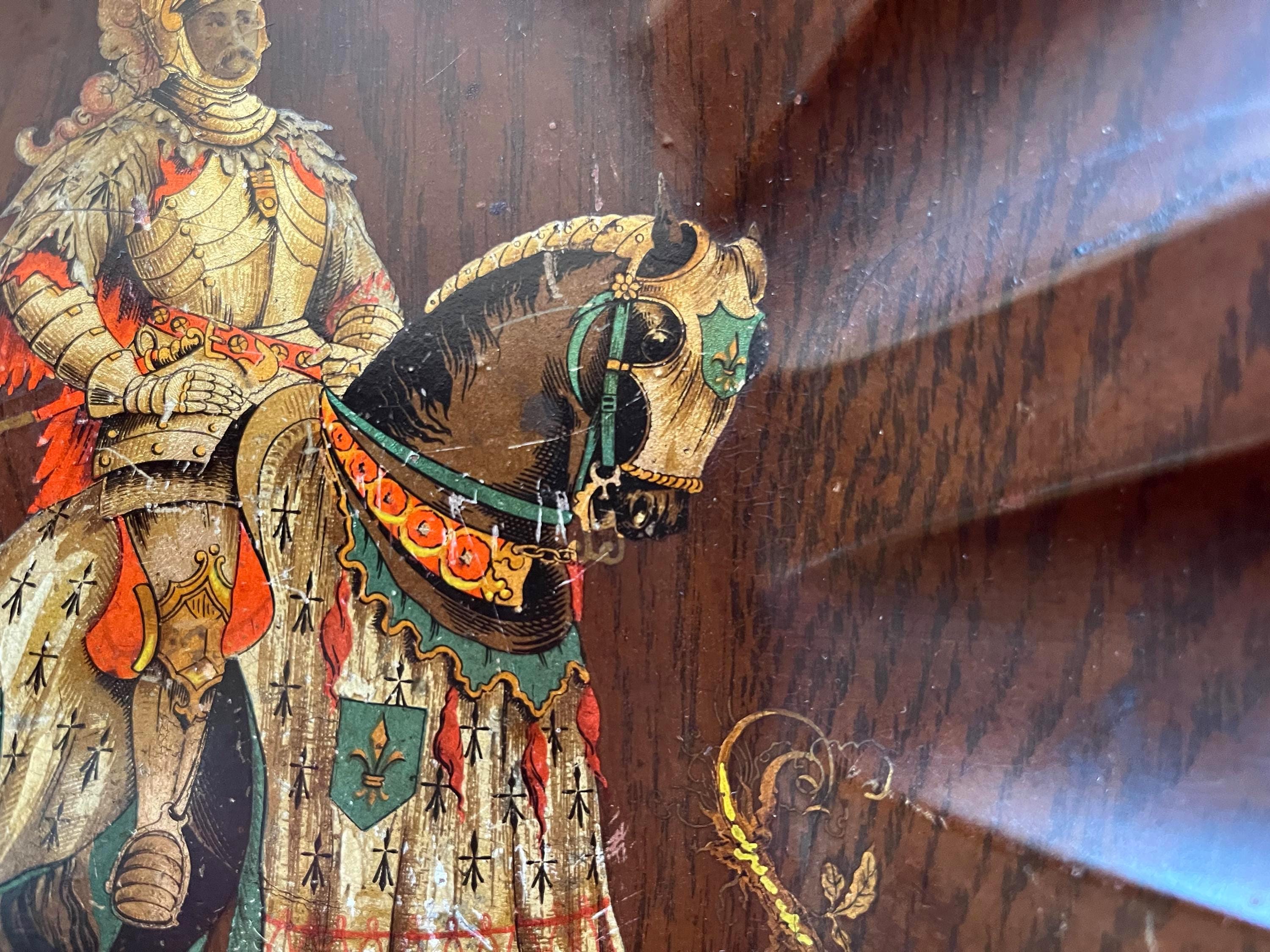 Stunning antique French paper mache` wood grain style ruffled bowl or tray hand painted with a French chevalier on horseback in full dress armor with pedestal mounts and gold leafy cartouche.