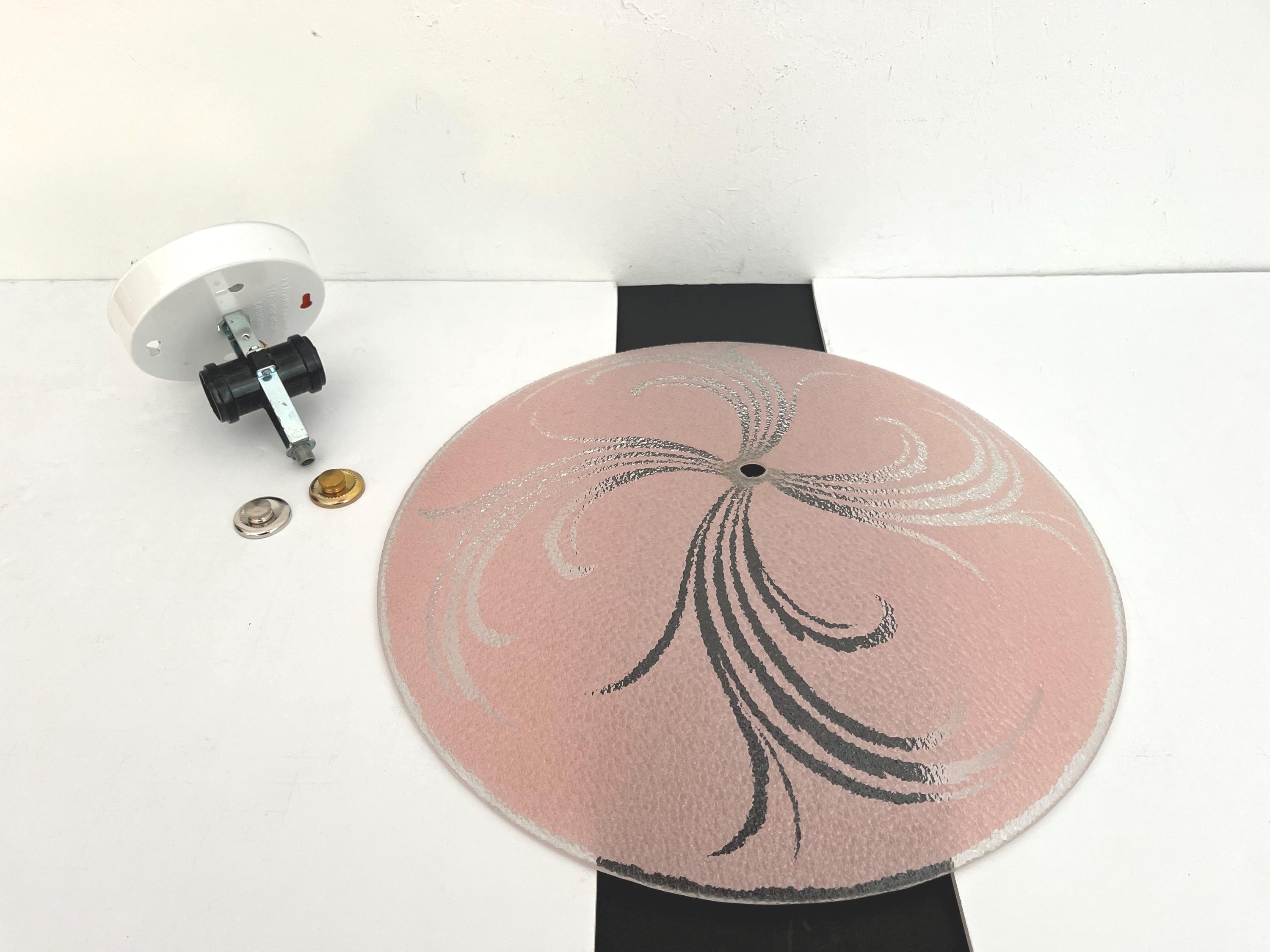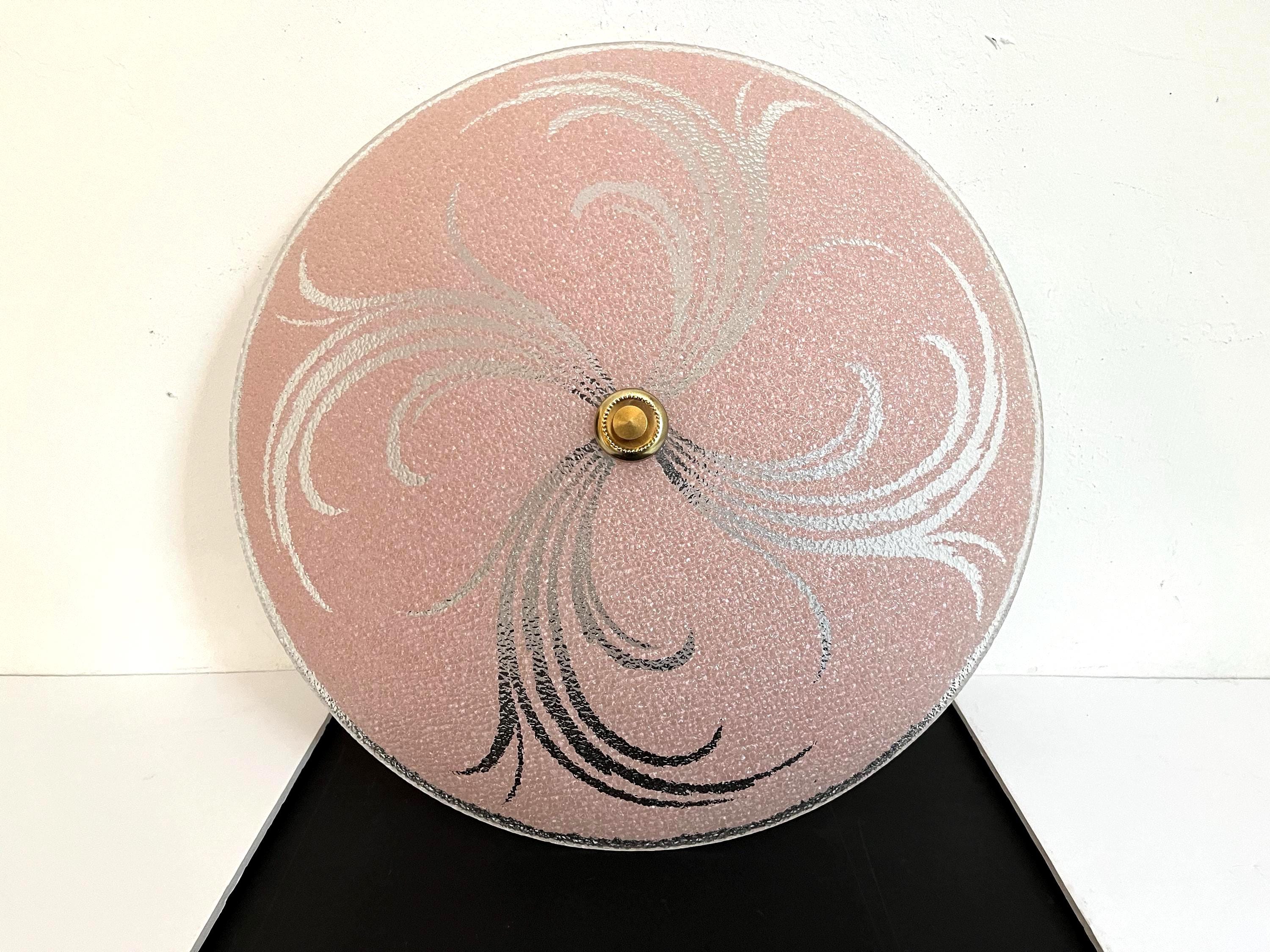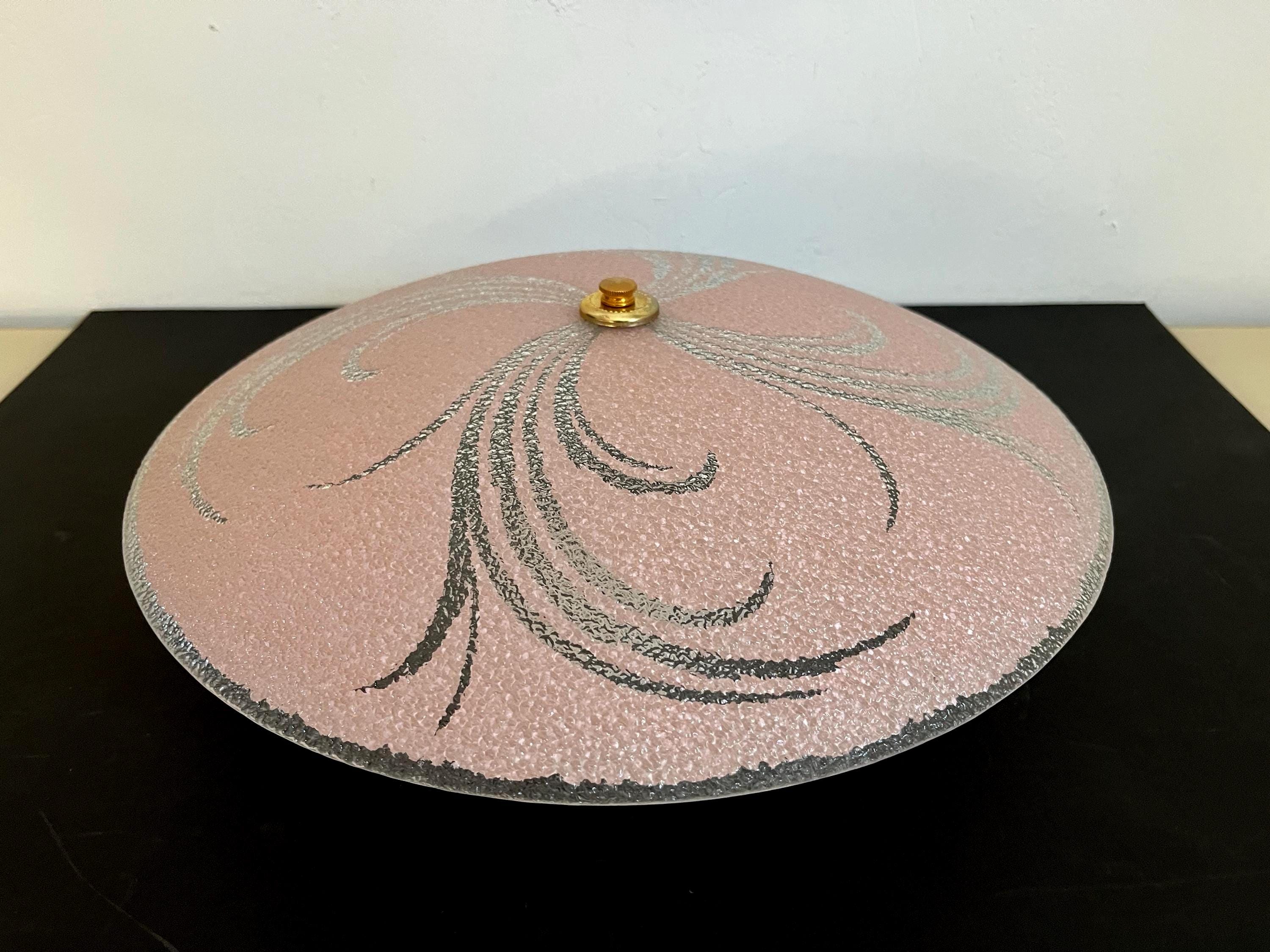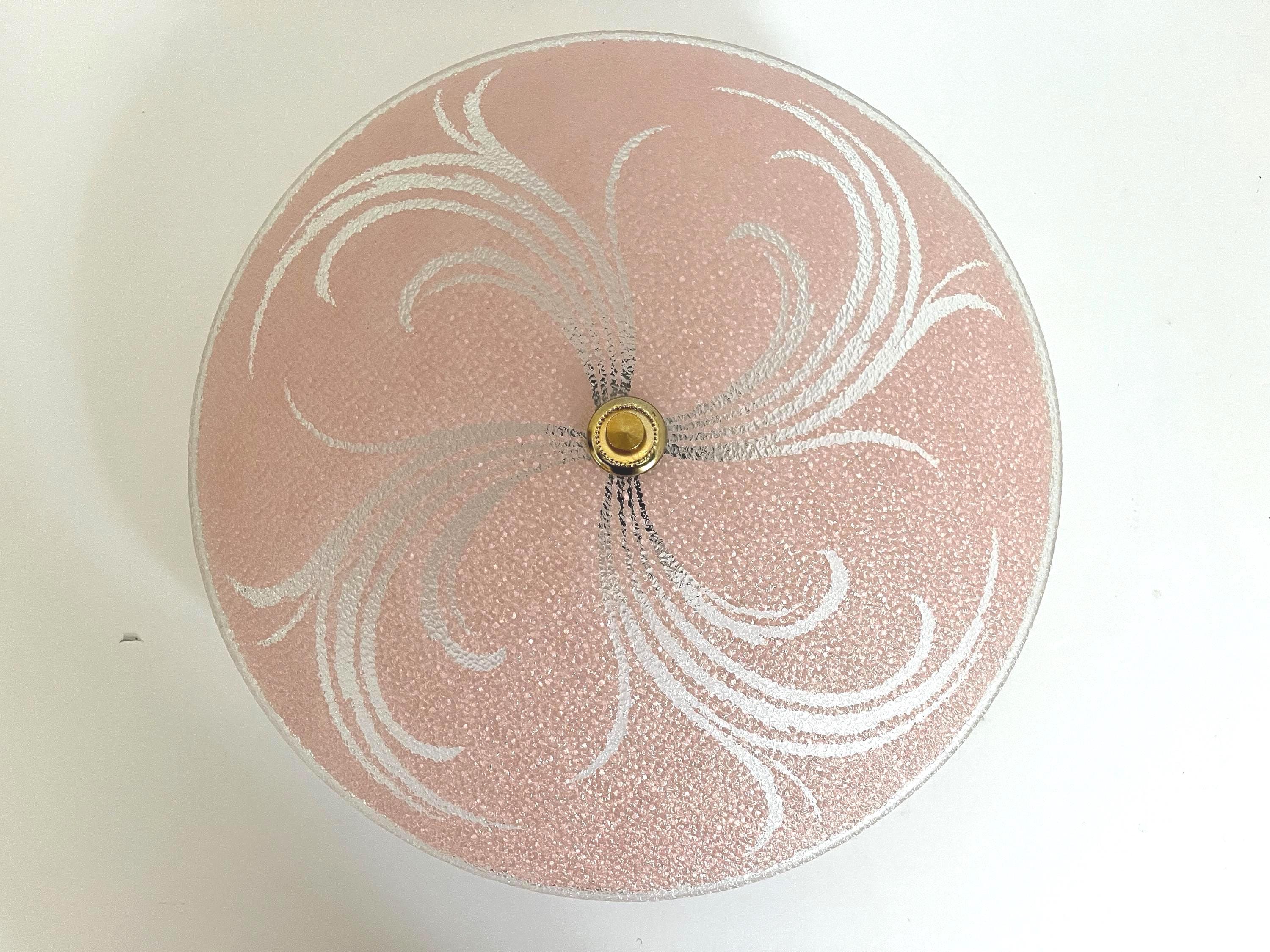 Sparkling 1950s Hollywood Regency style textured glass ceiling light in soft pink with radiant transparent leaf sprays and border.
