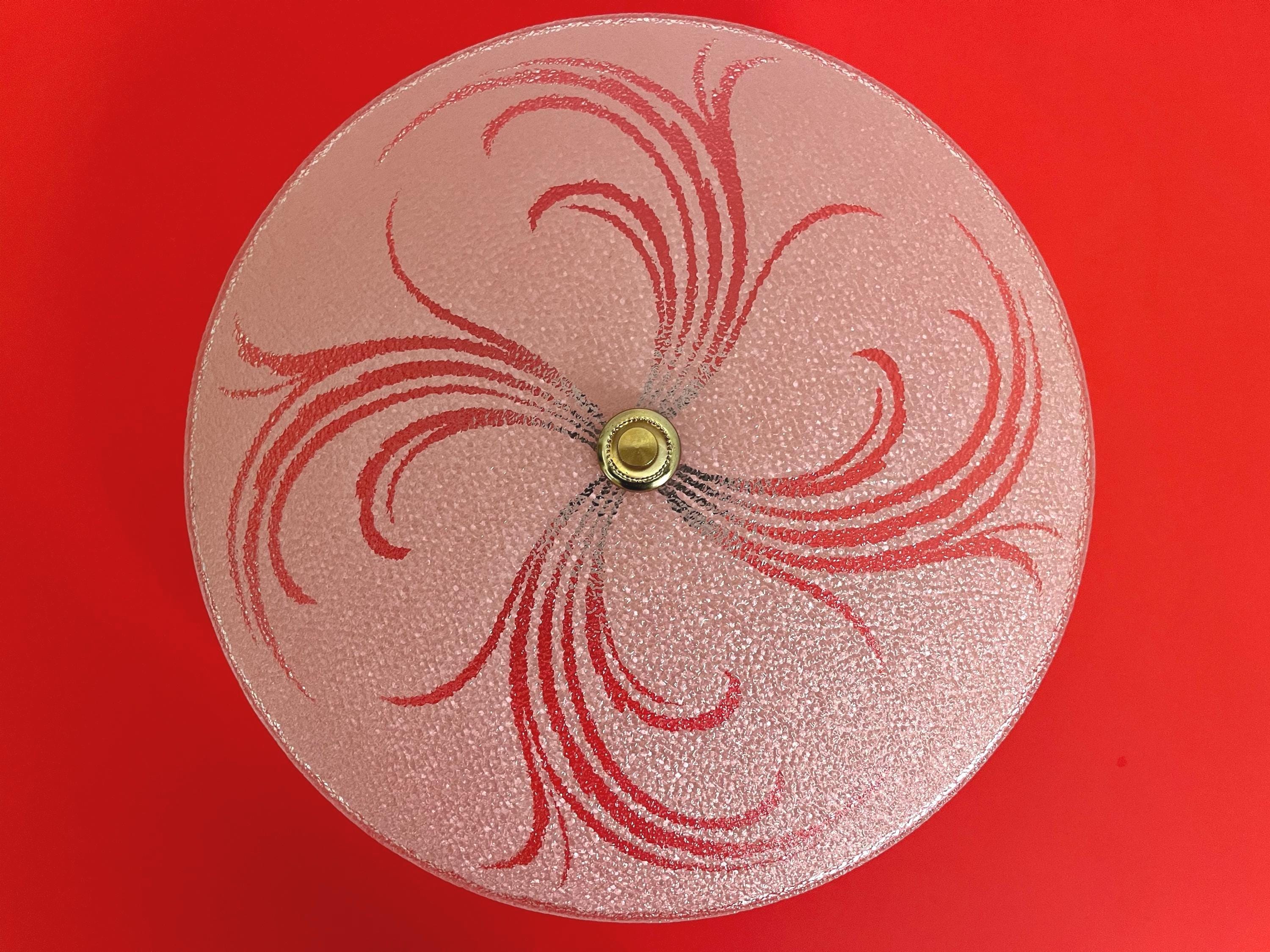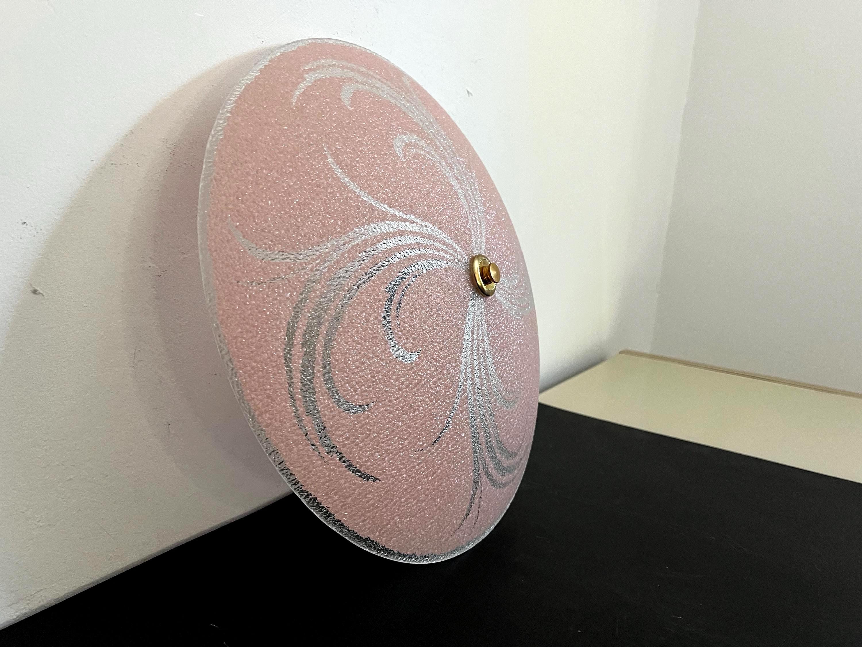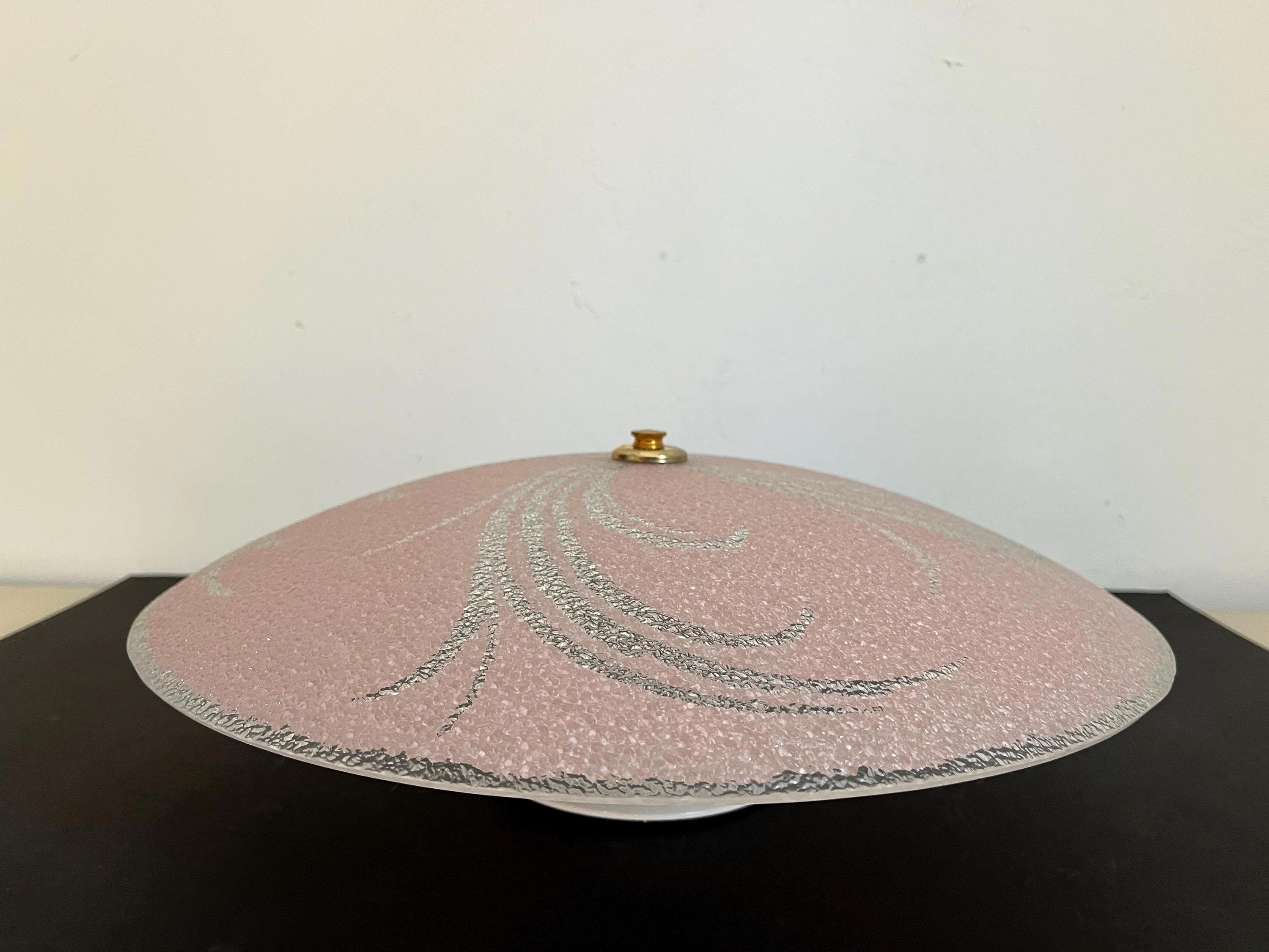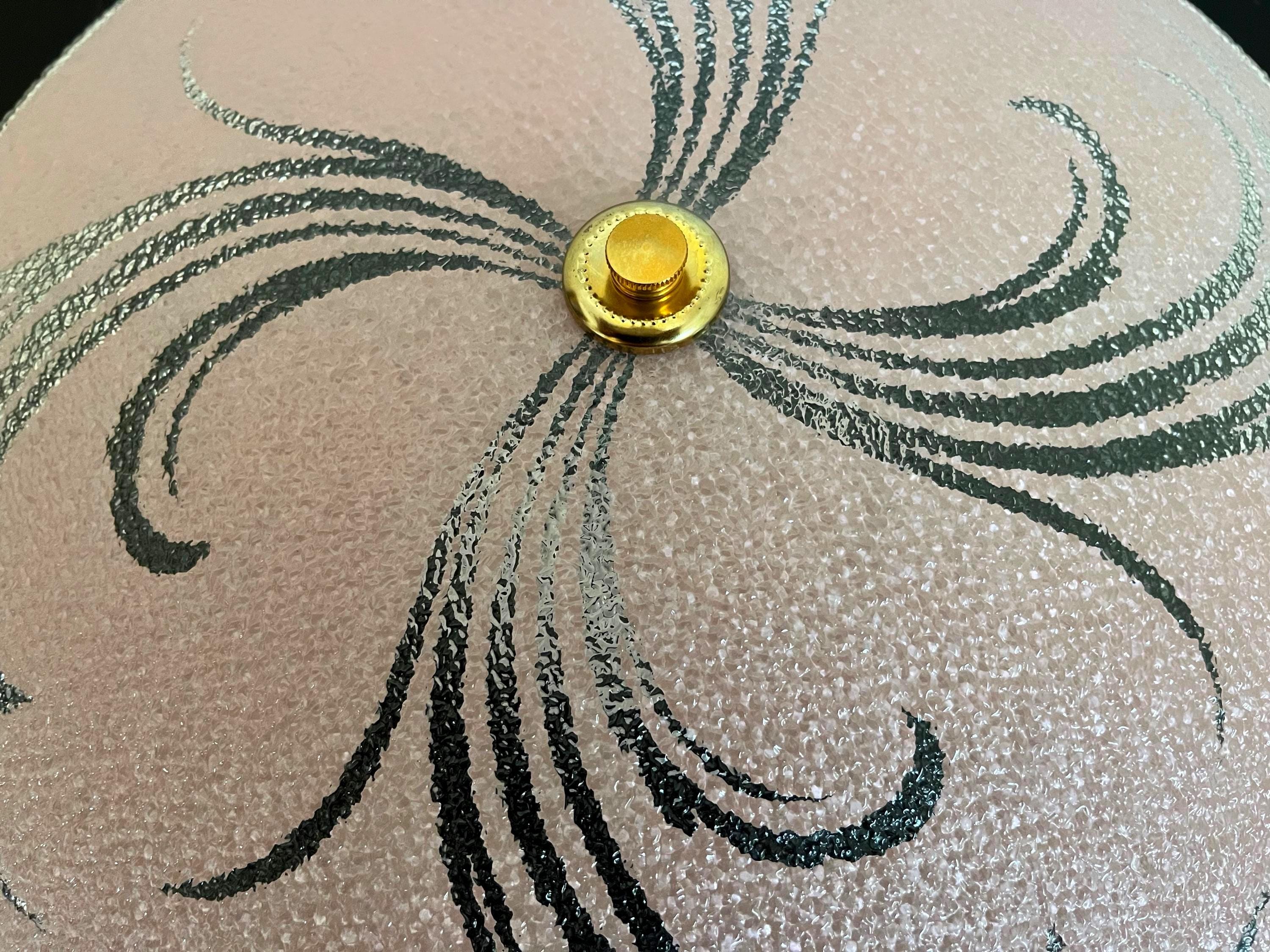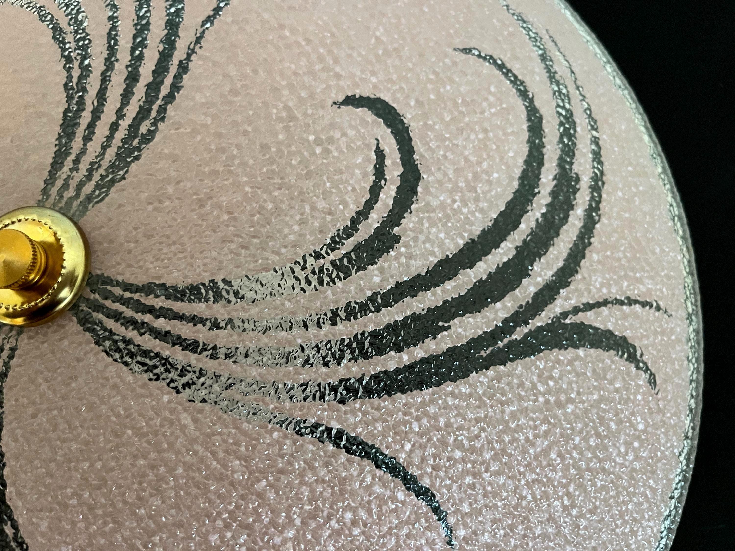Sparkling 1950s Hollywood Regency style textured glass ceiling light in soft pink with radiant transparent leaf sprays and border.