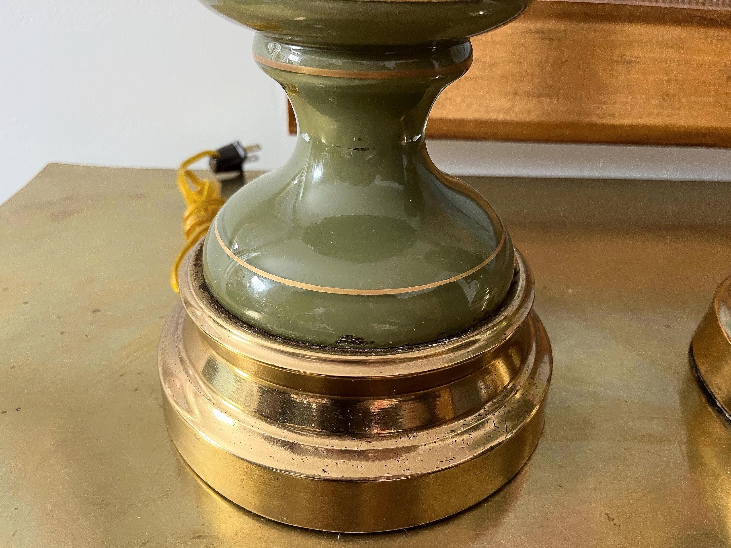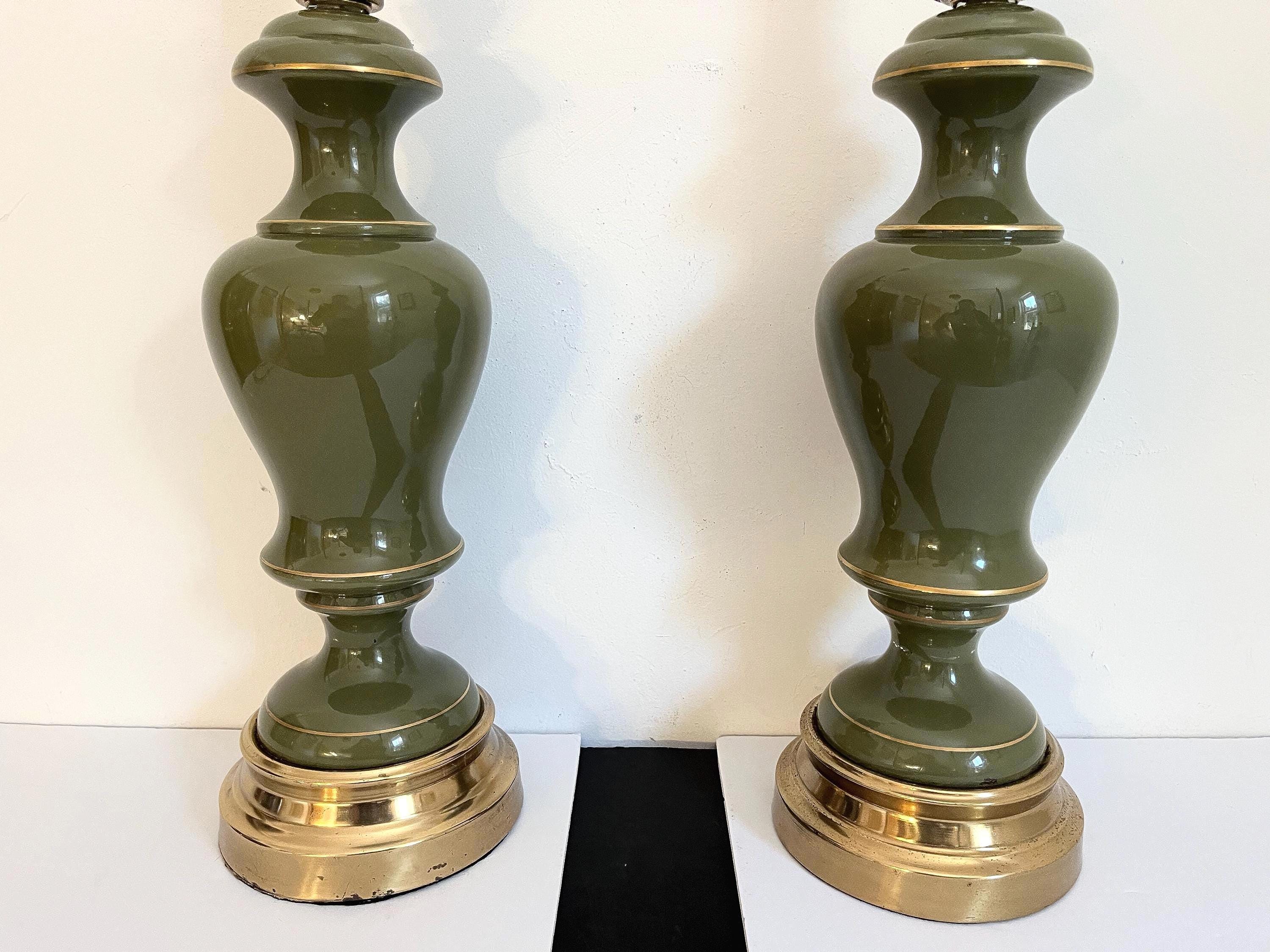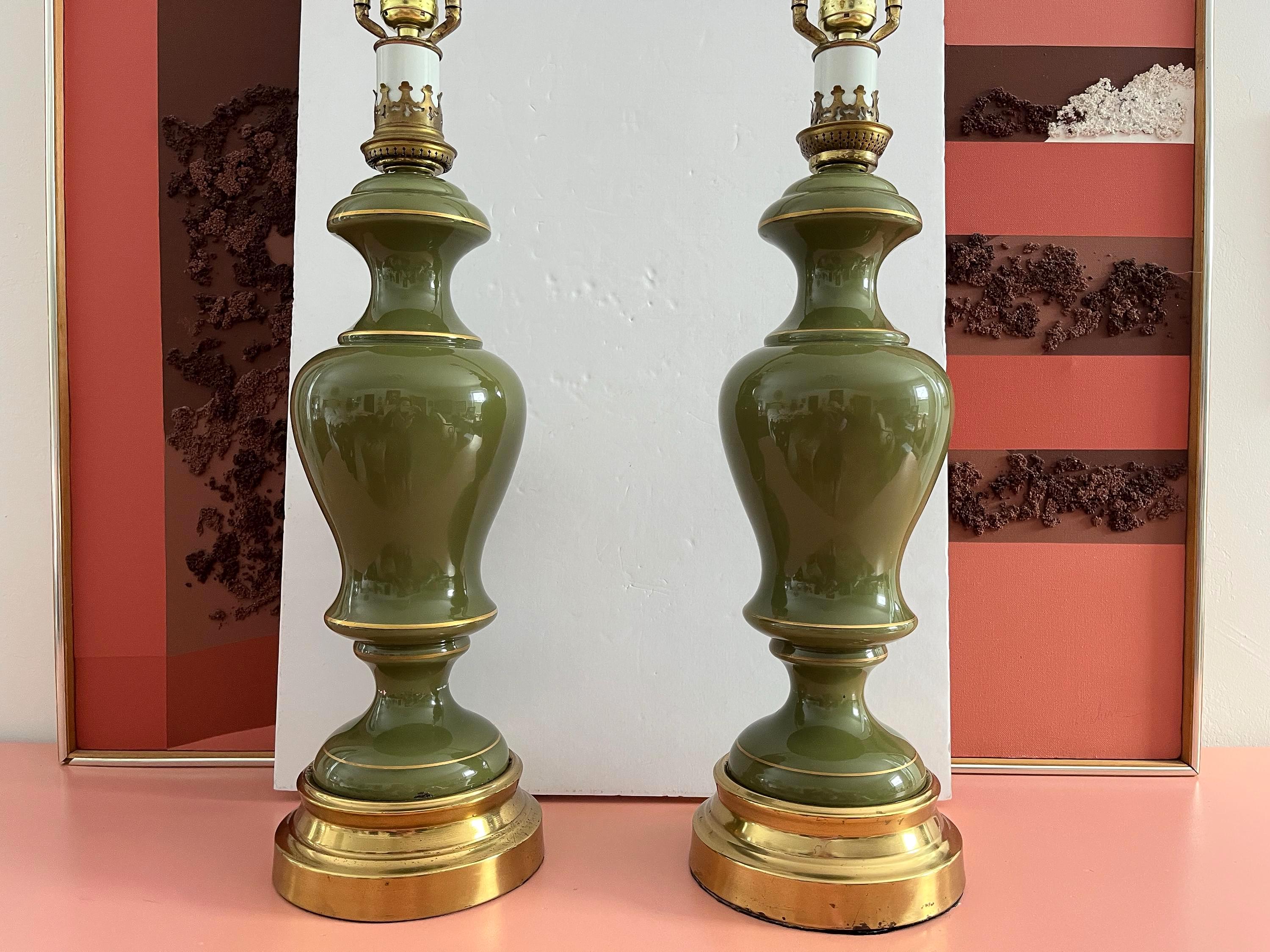 Huge 1960s Neoclassical style cased glass column lamps in a saturated mossy green accented by gold rings and crown-like necks on tiered gold metal bases. Necks are slightly different, as pictured.