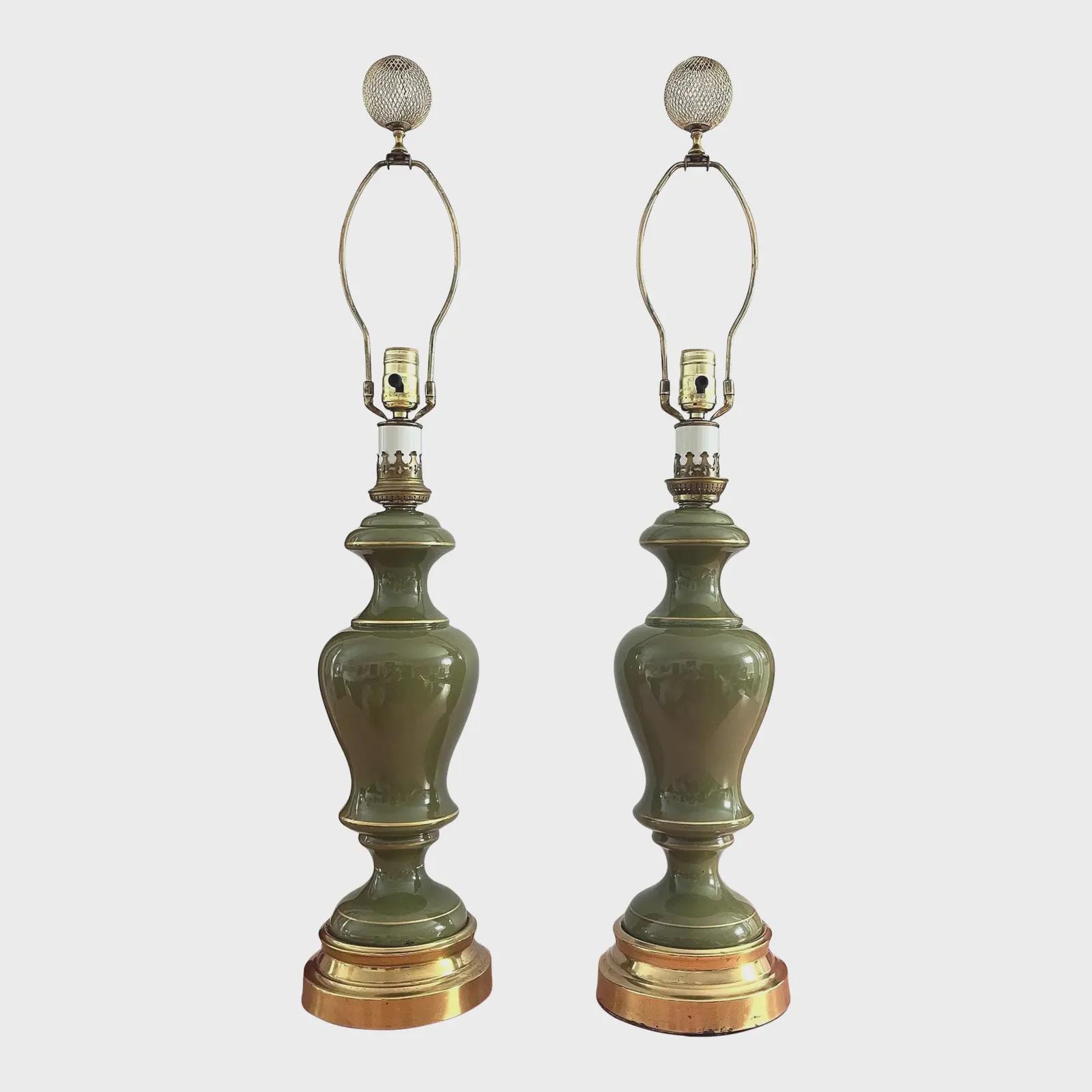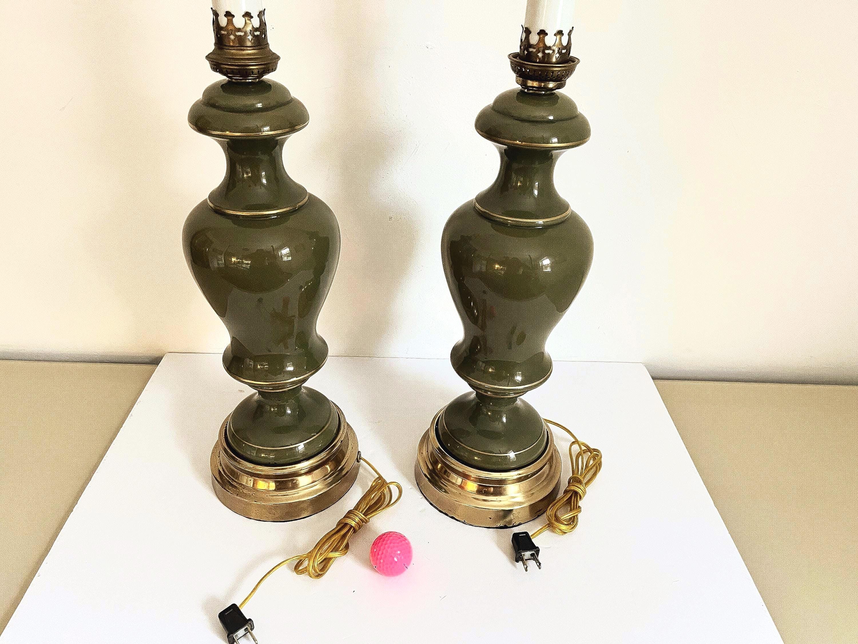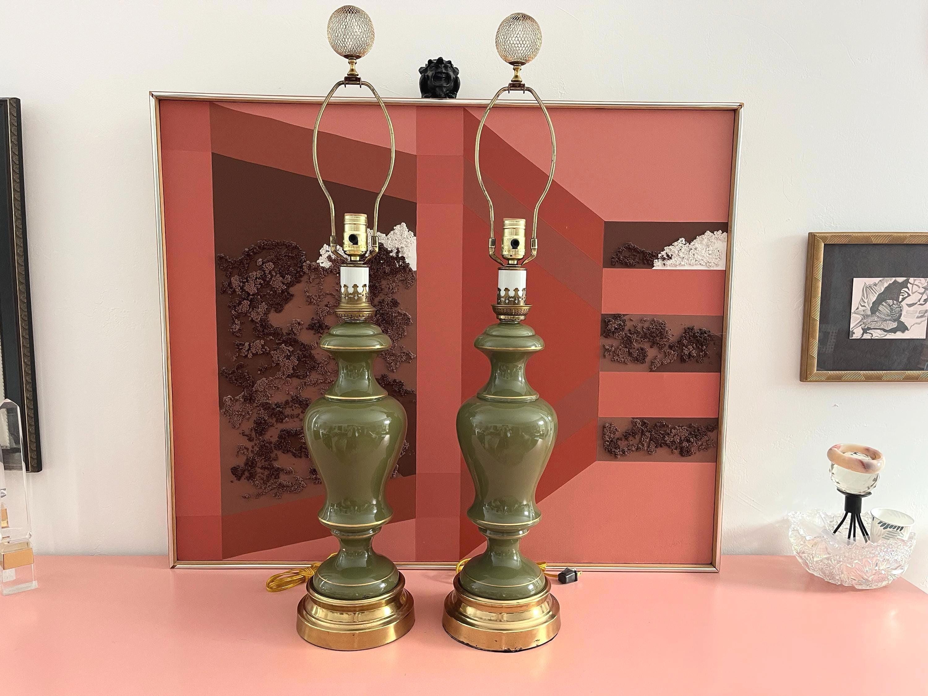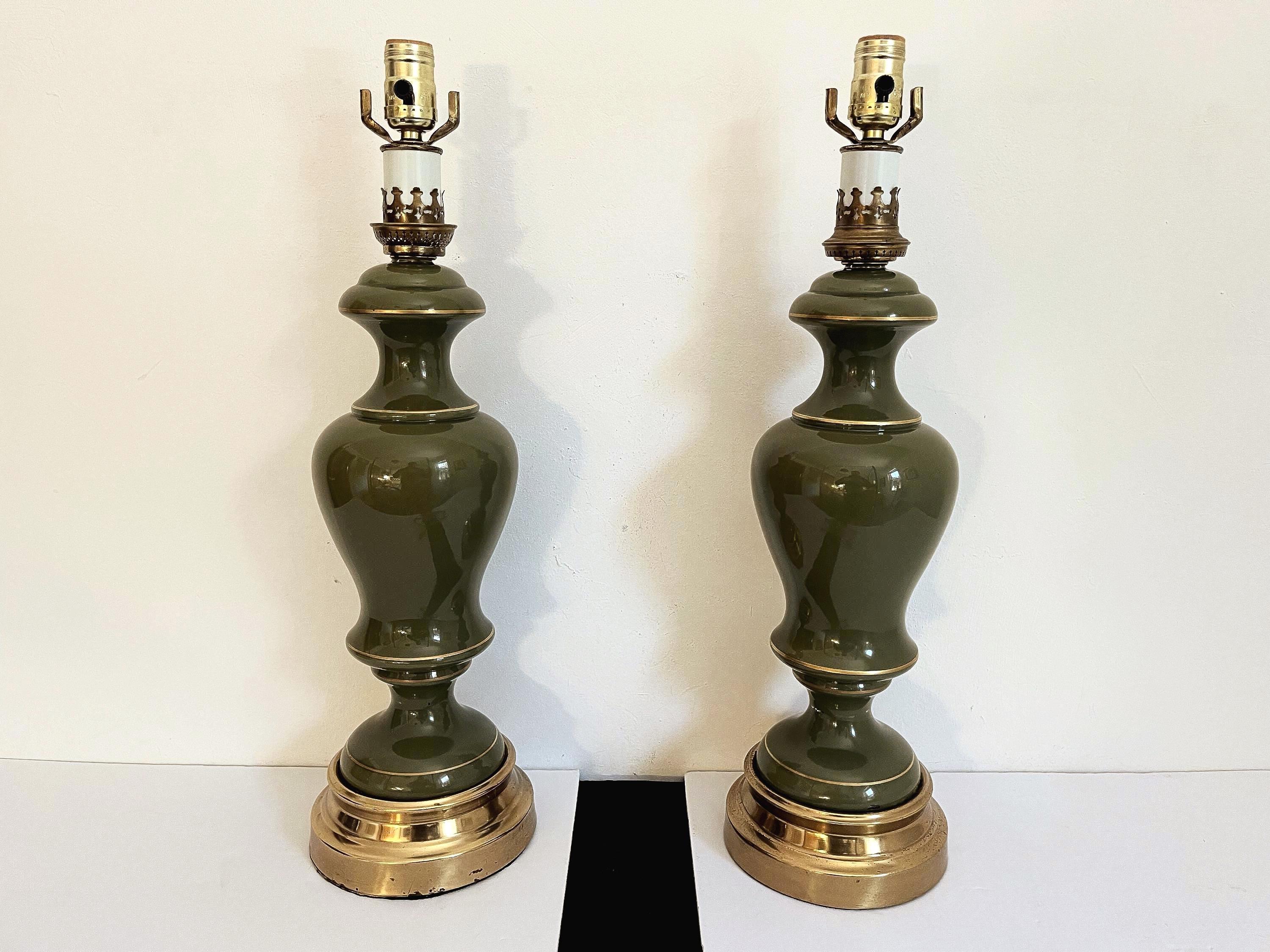 Huge 1960s Neoclassical style cased glass column lamps in a saturated mossy green accented by gold rings and crown-like necks on tiered gold metal bases. Necks are slightly different, as pictured.