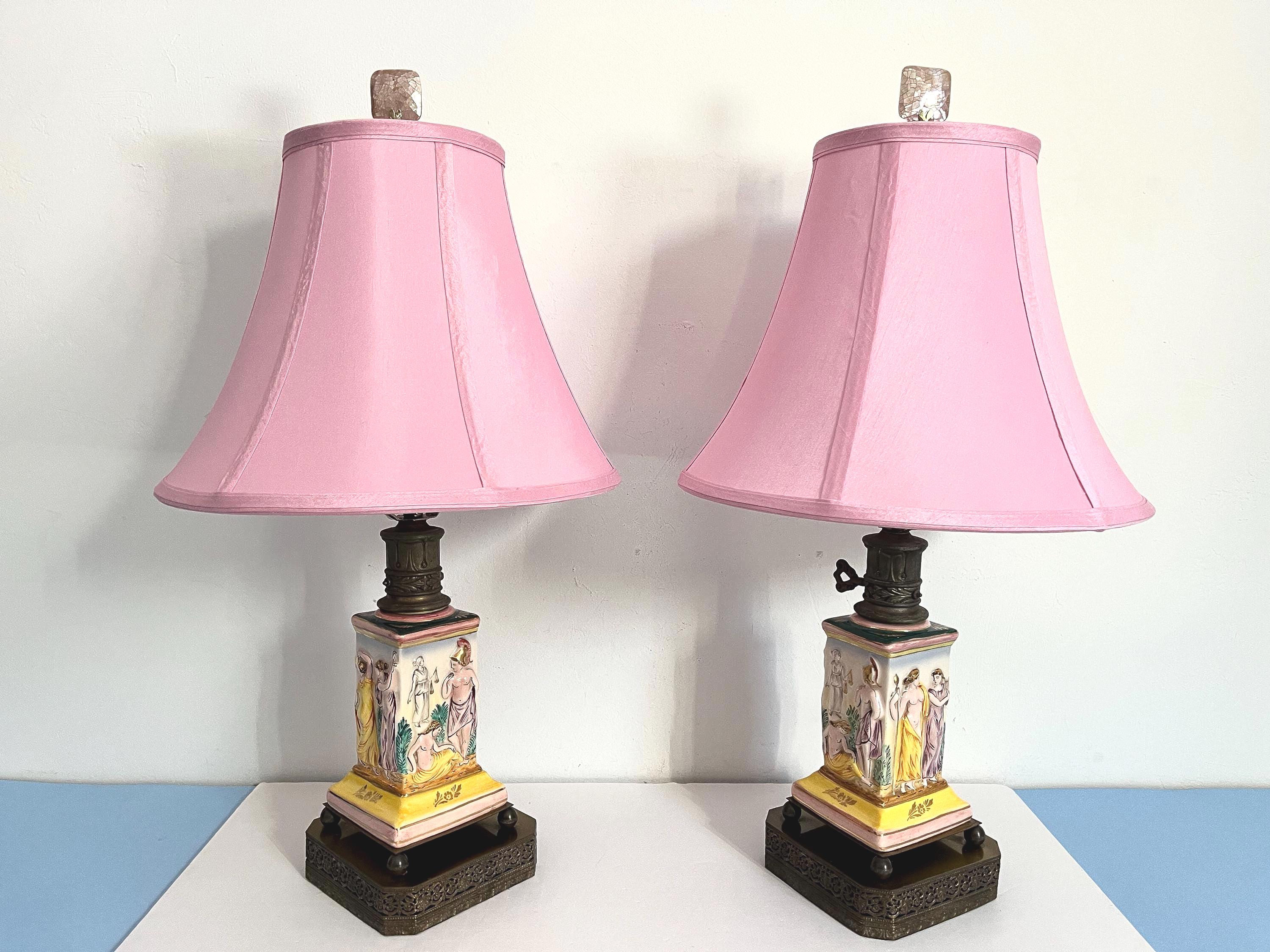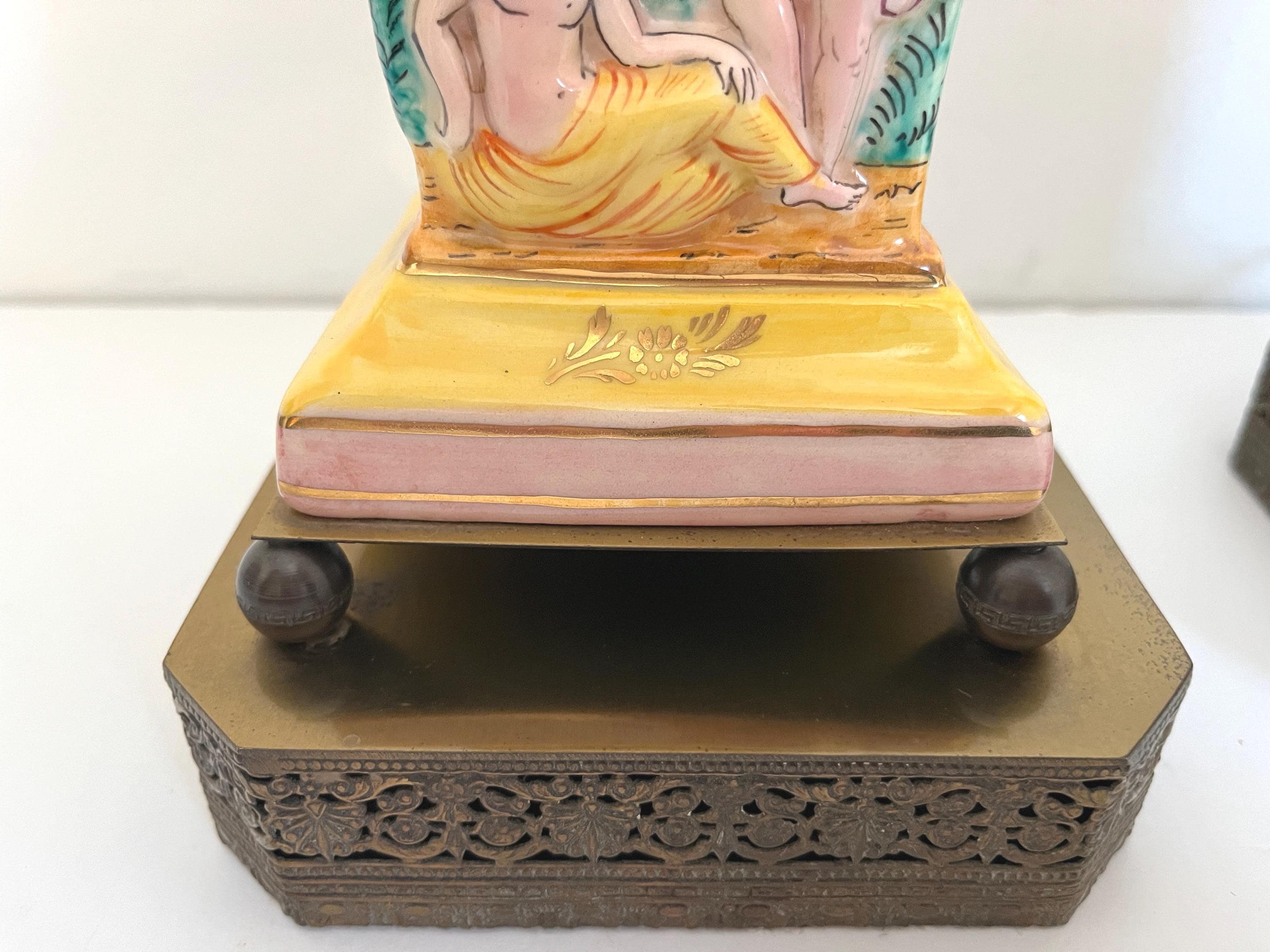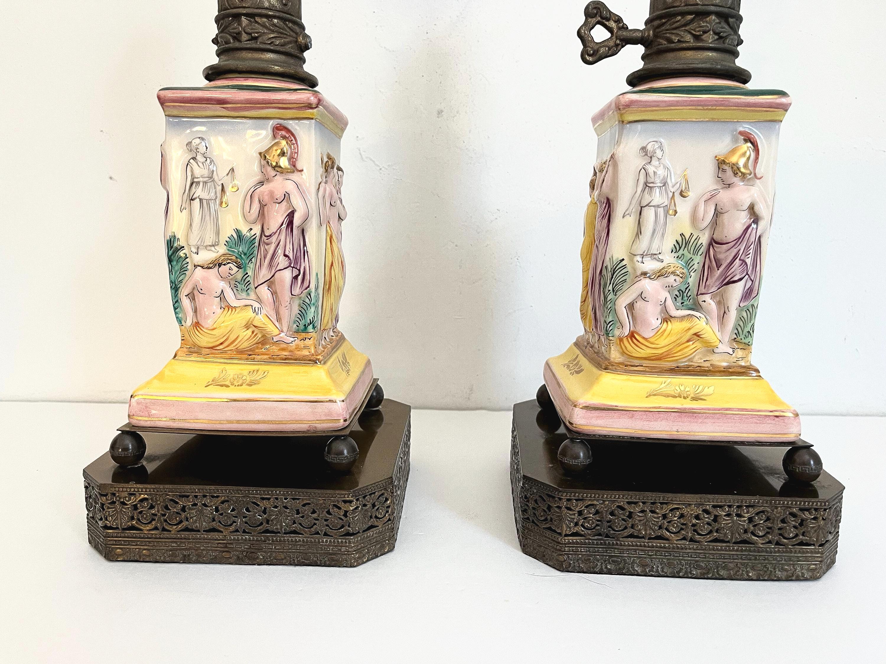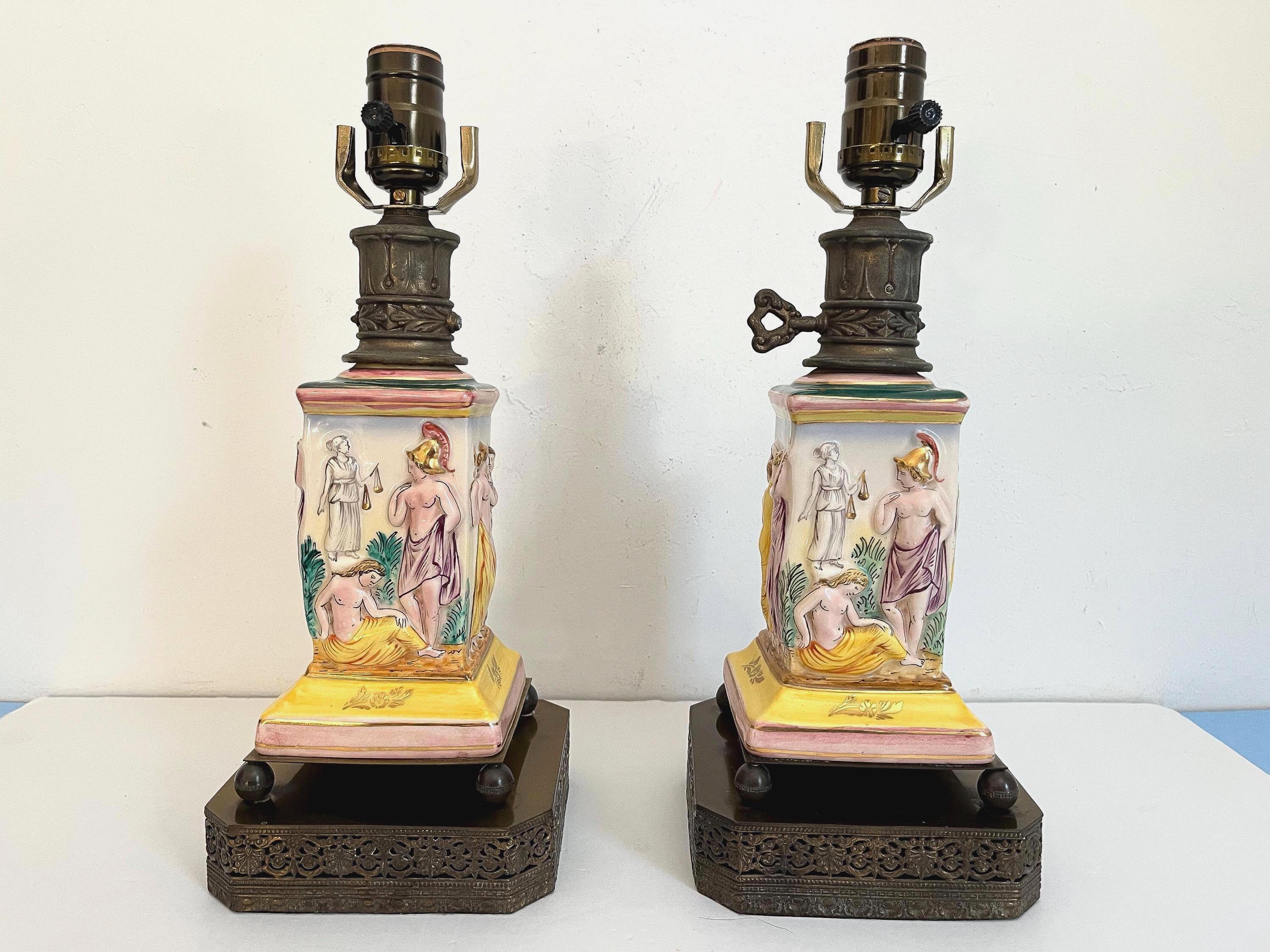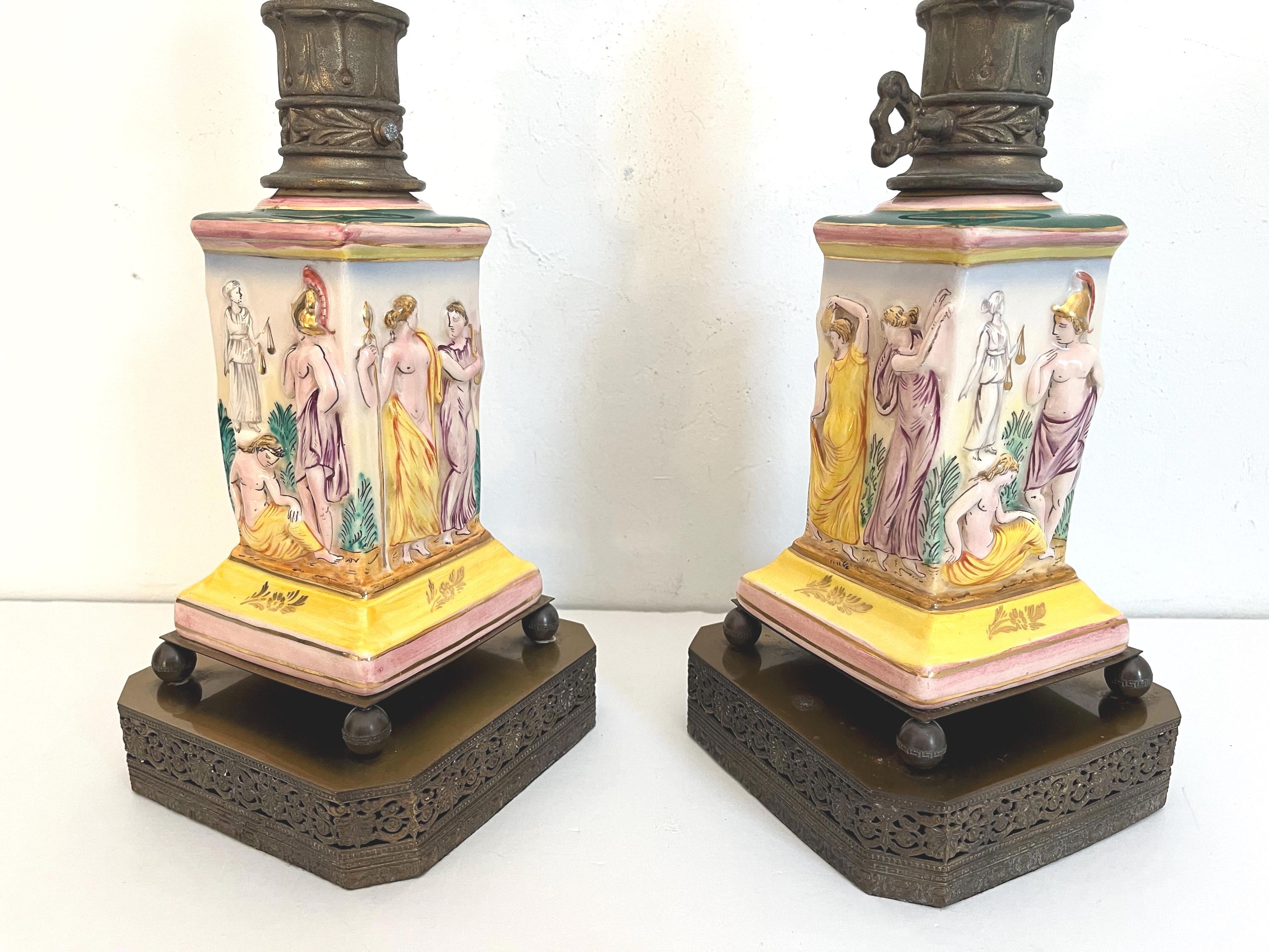 Gorgeous pair of 1940s glazed porcelain lamps in classical Greco-Roman style with hand painted dimensional mythological figures set into squared columns in saturated shades of green, gold, pink, and yellow accented by gold leaf flowers and leaves on elevated ball feet and gold metal bases.
