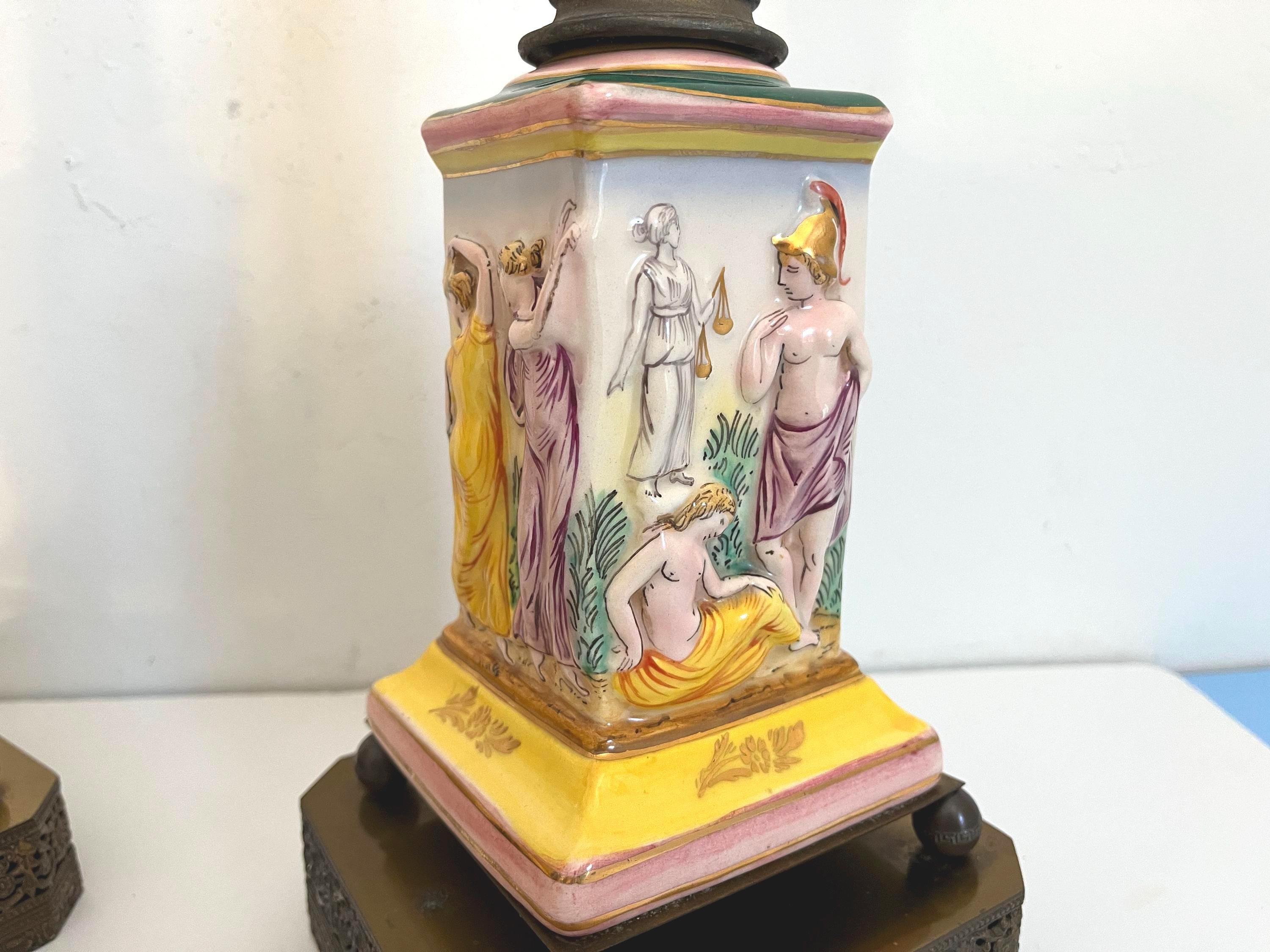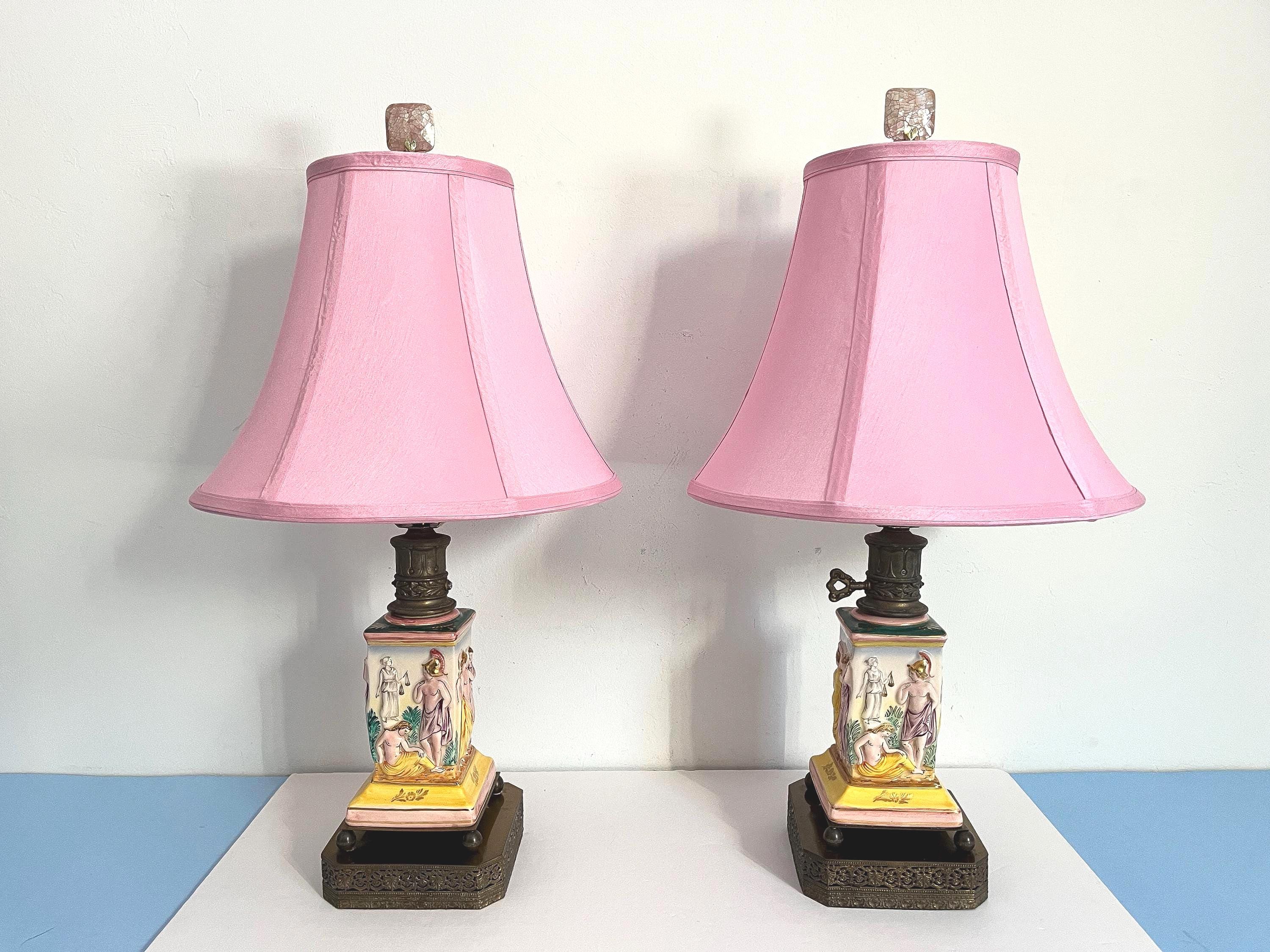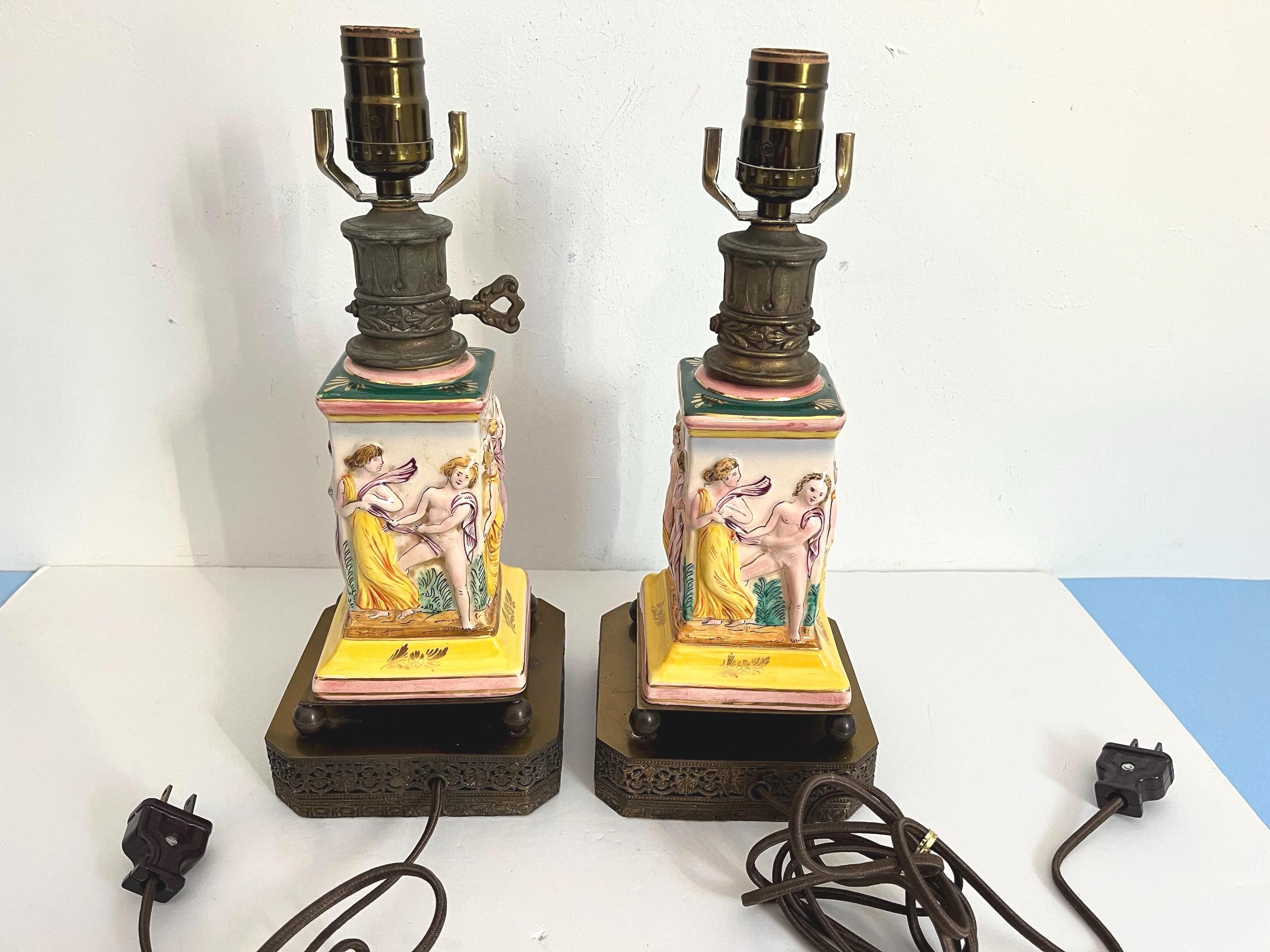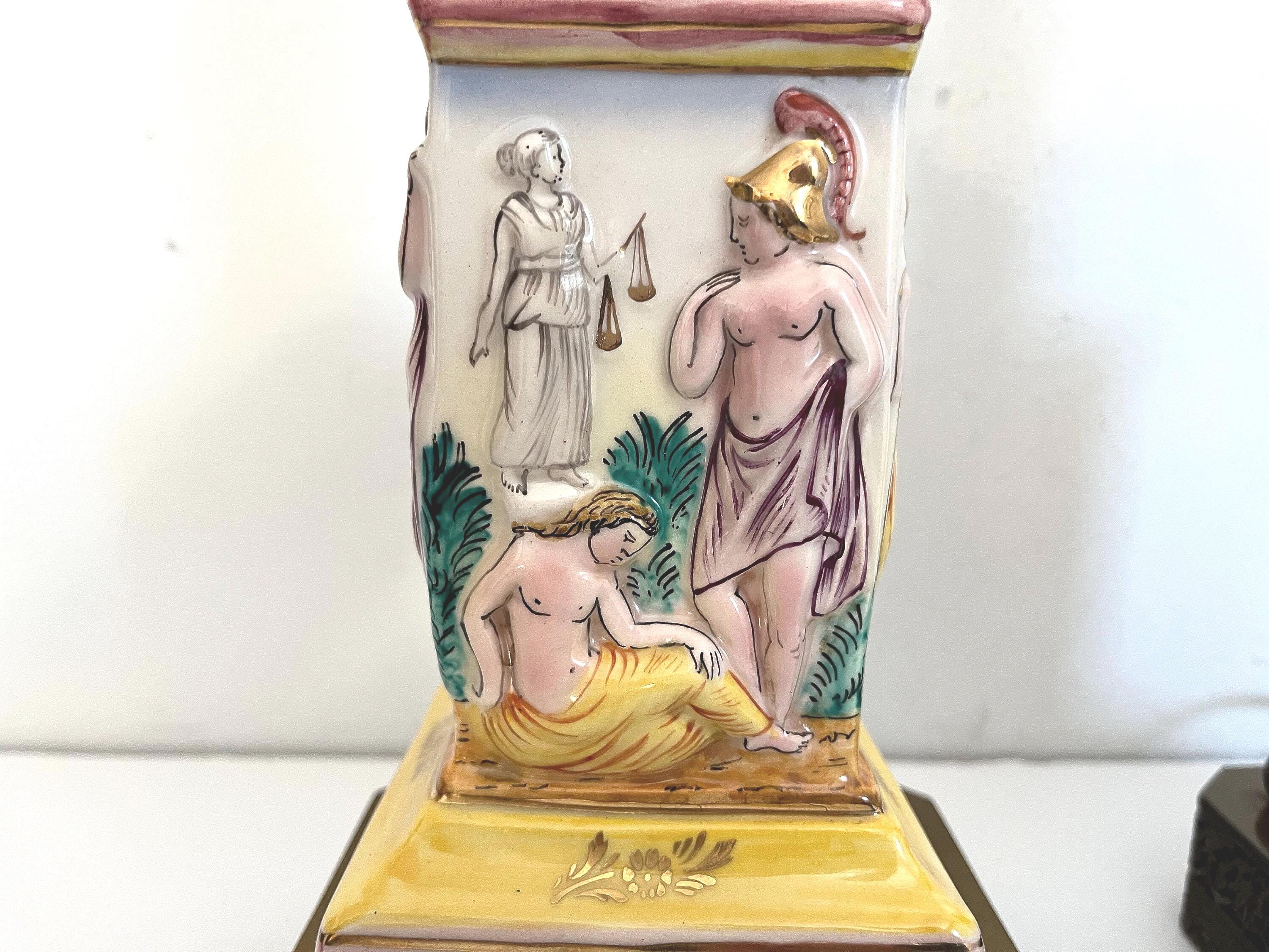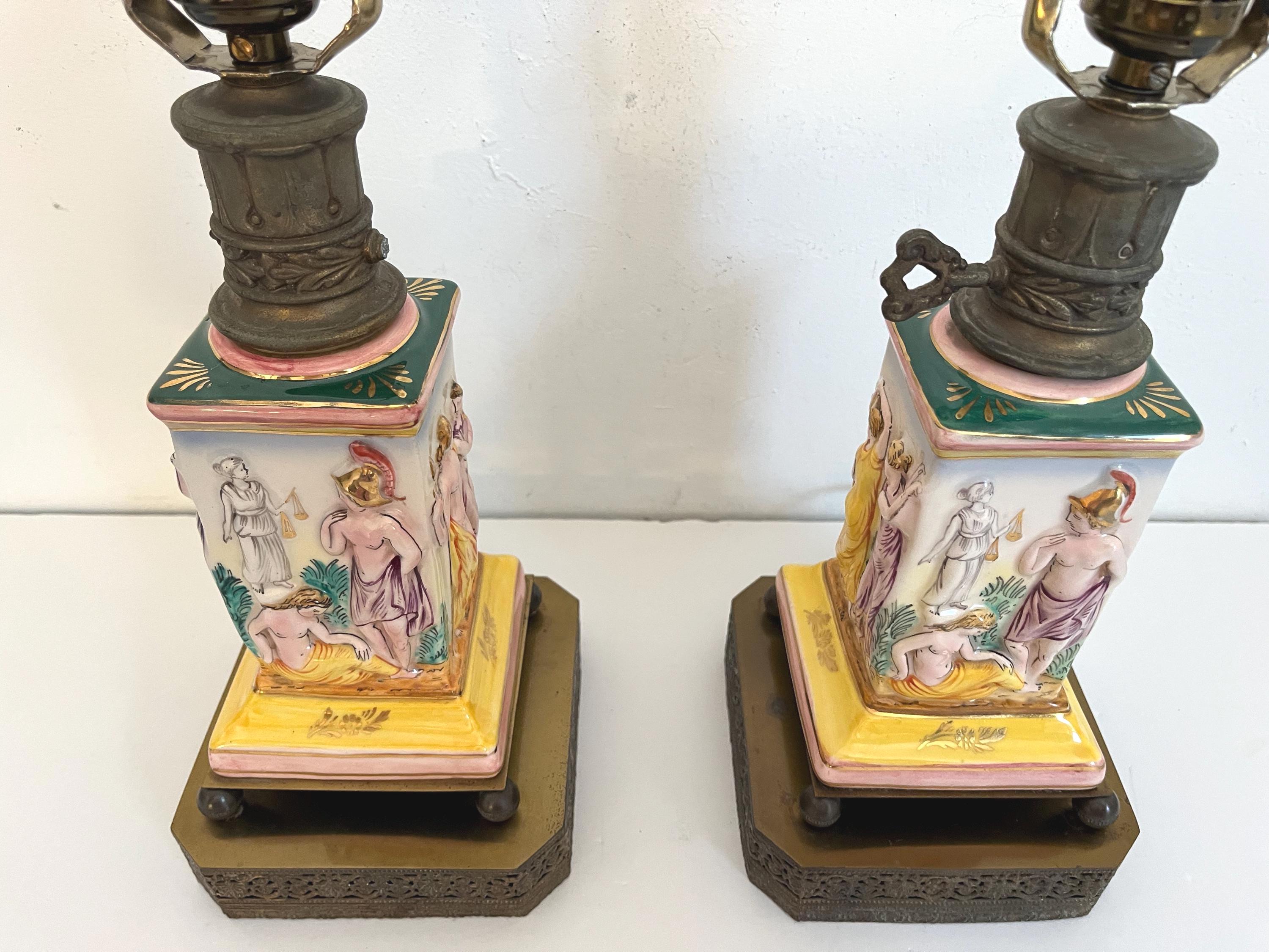 Gorgeous pair of 1940s glazed porcelain lamps in classical Greco-Roman style with hand painted dimensional mythological figures set into squared columns in saturated shades of green, gold, pink, and yellow accented by gold leaf flowers and leaves on elevated ball feet and gold metal bases.