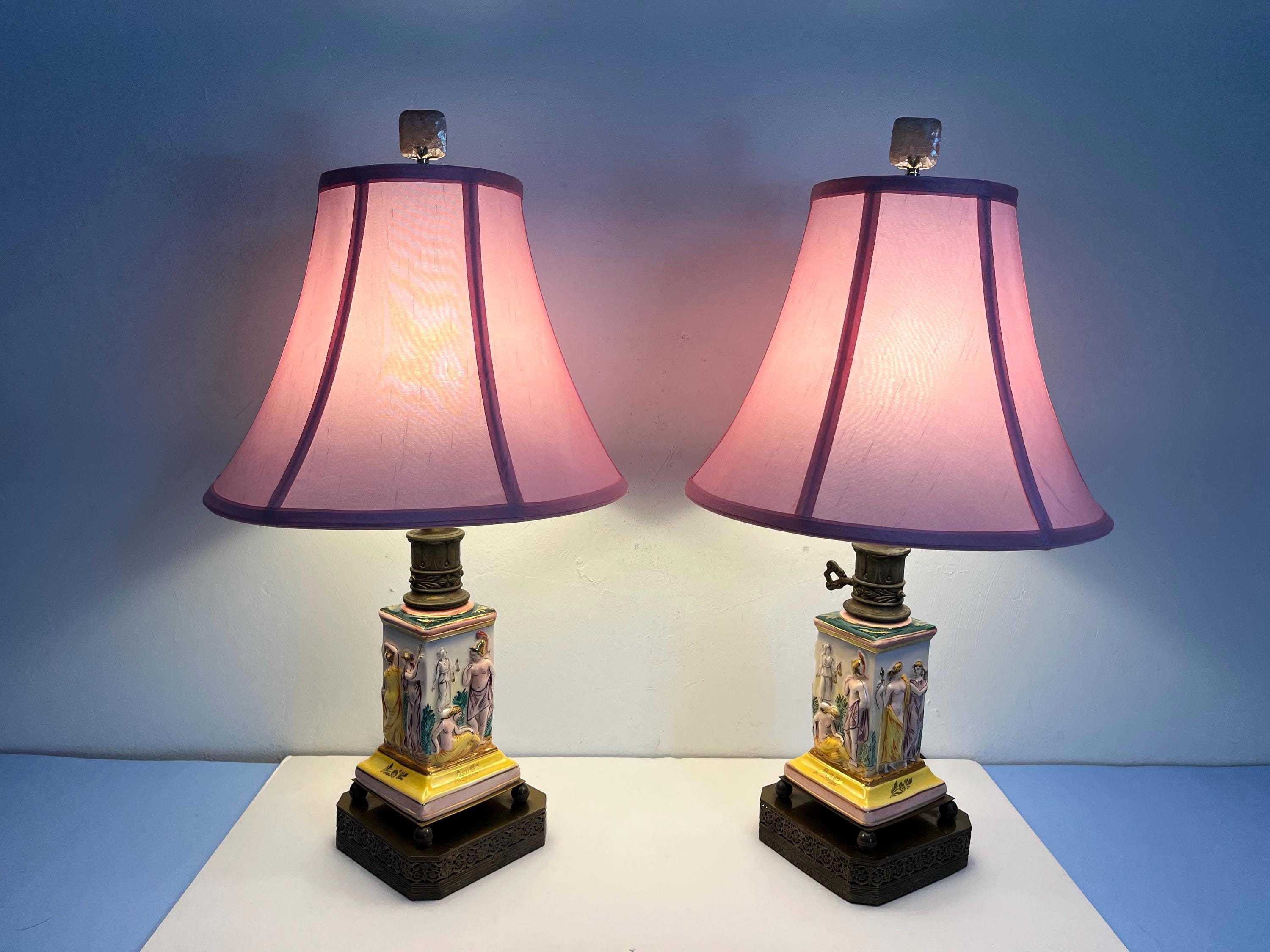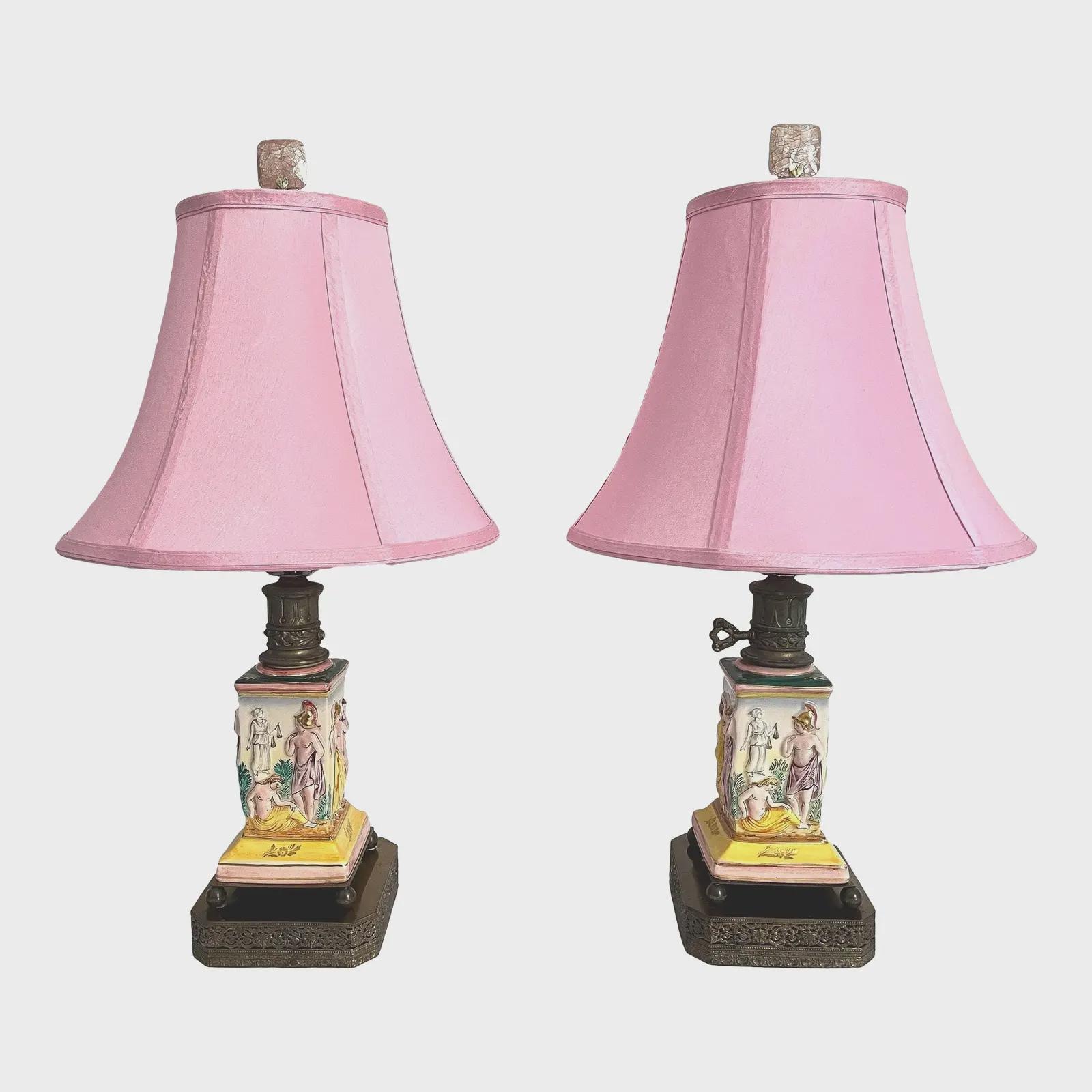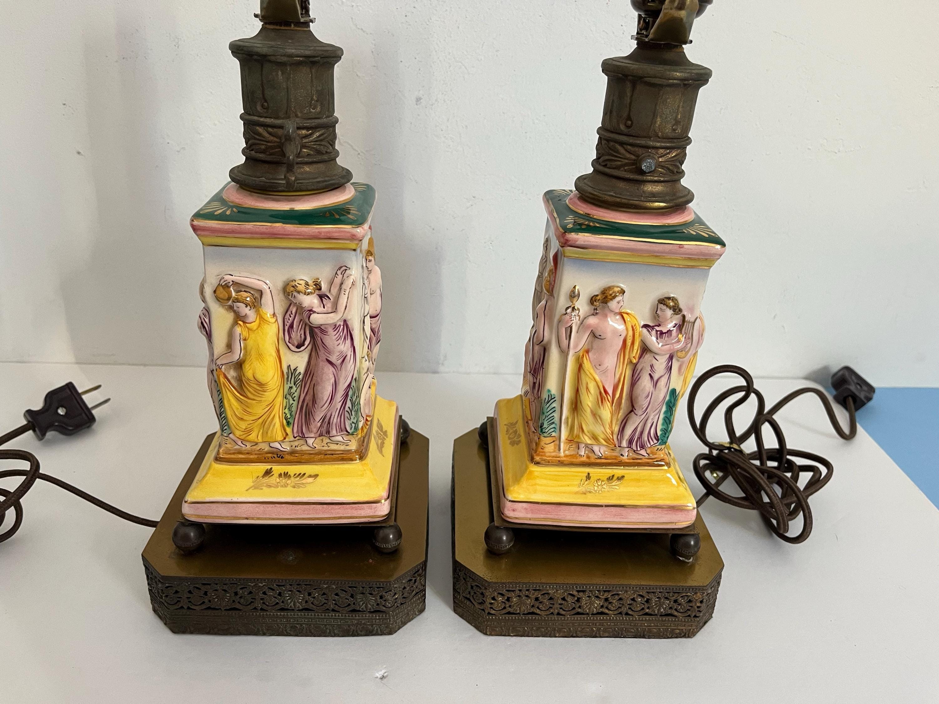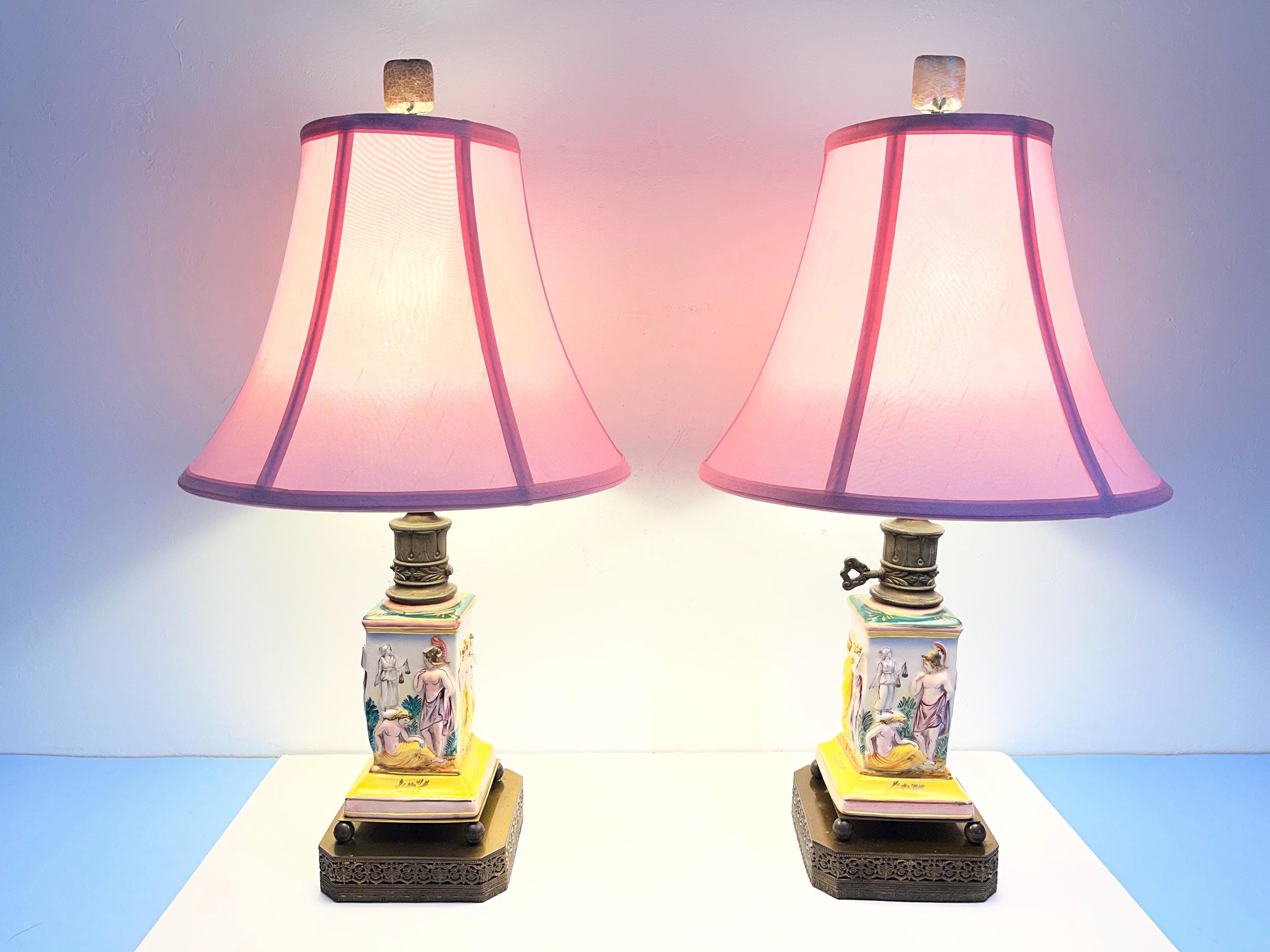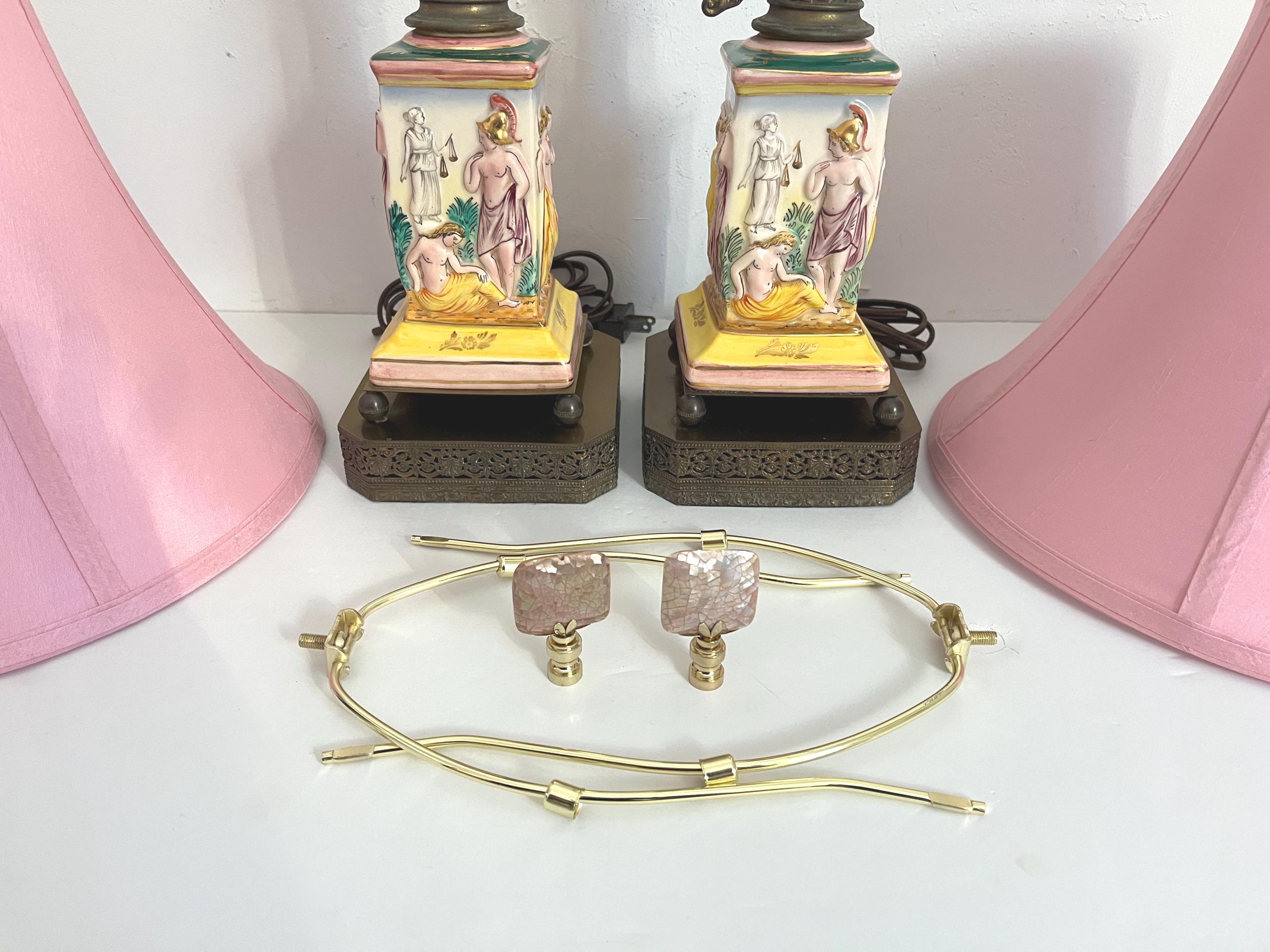 Gorgeous pair of 1940s glazed porcelain lamps in classical Greco-Roman style with hand painted dimensional mythological figures set into squared columns in saturated shades of green, gold, pink, and yellow accented by gold leaf flowers and leaves on elevated ball feet and gold metal bases.