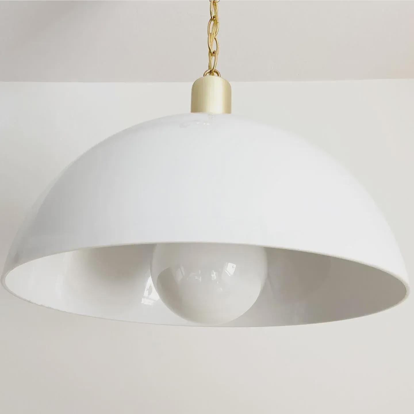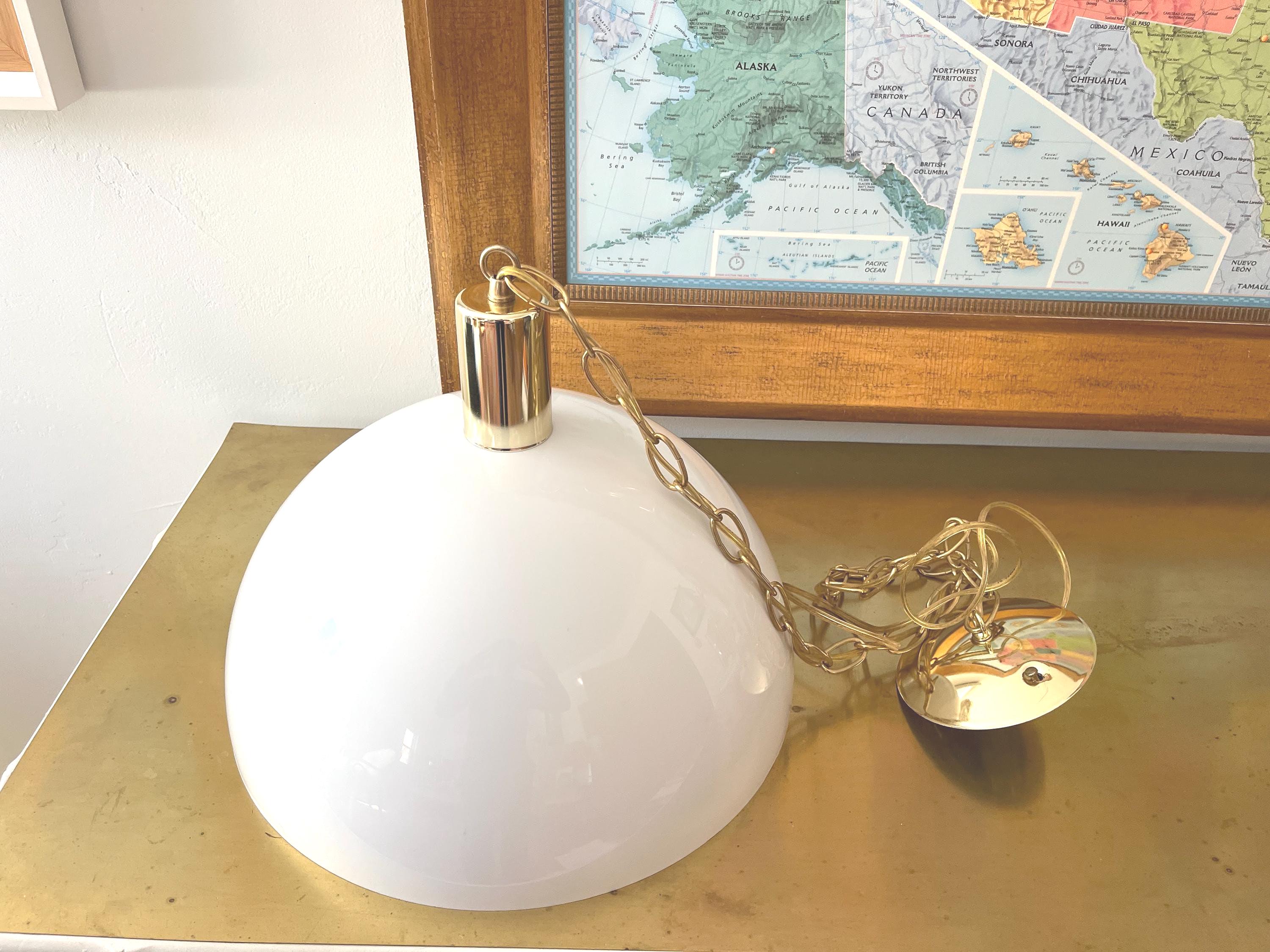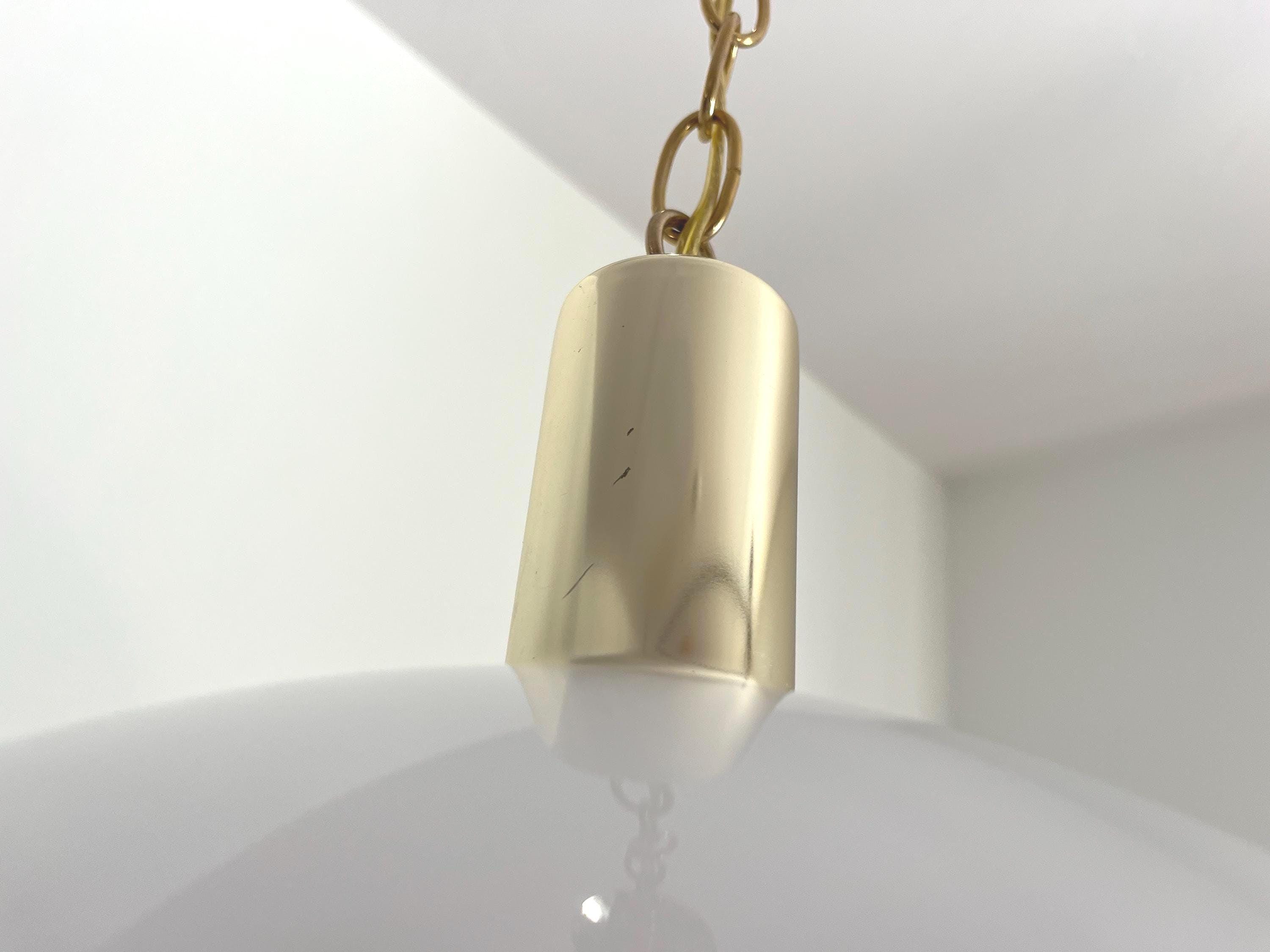 Modern minimalist domed white acrylic pendant light by Artcraft Montreal from the seventies with simple gold metal finial and central light. Retains original labeled ceiling canopy.