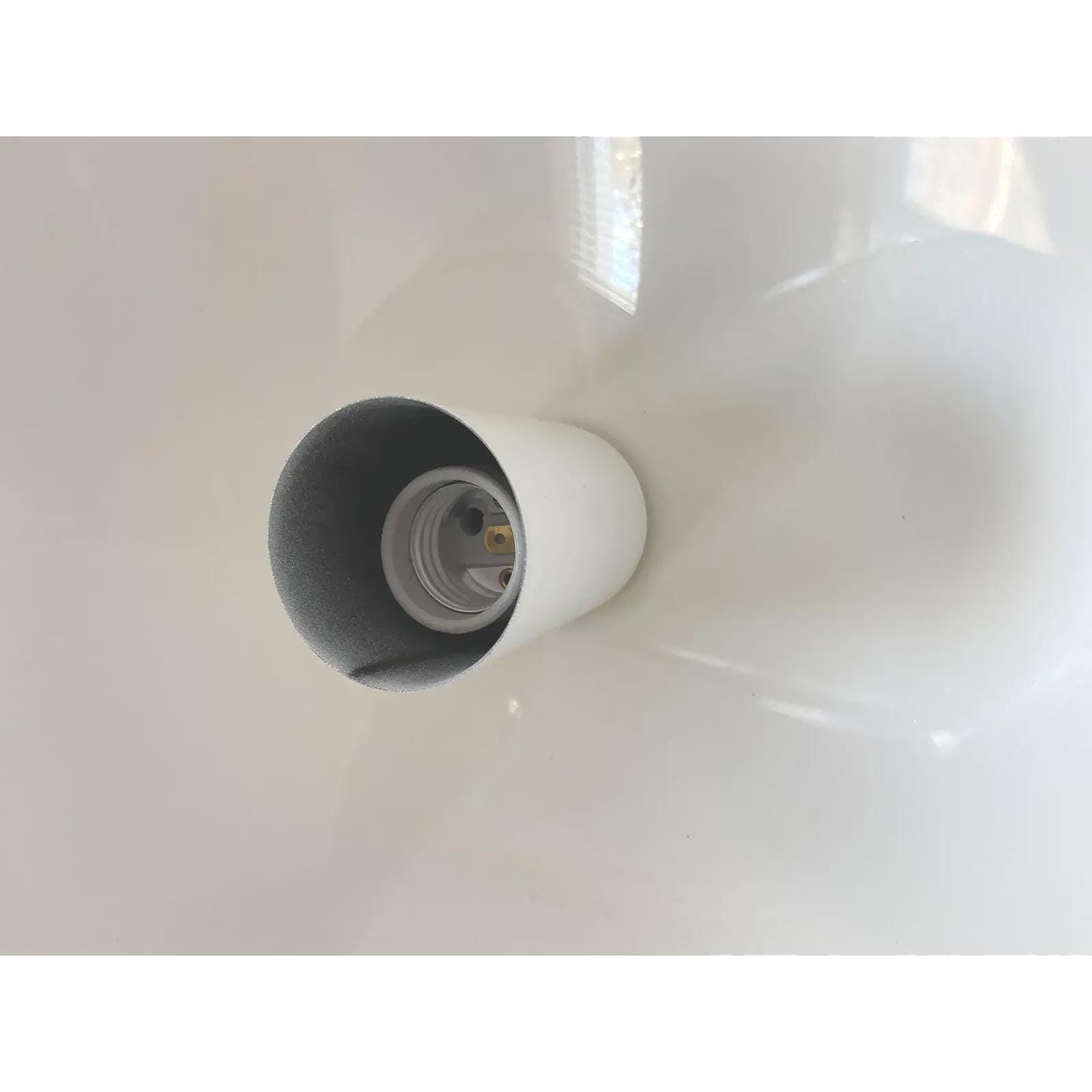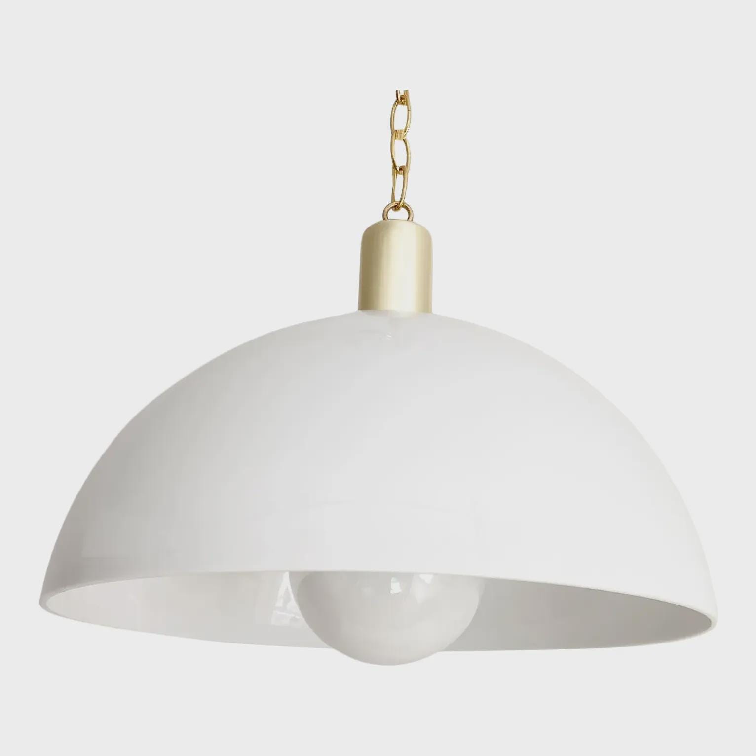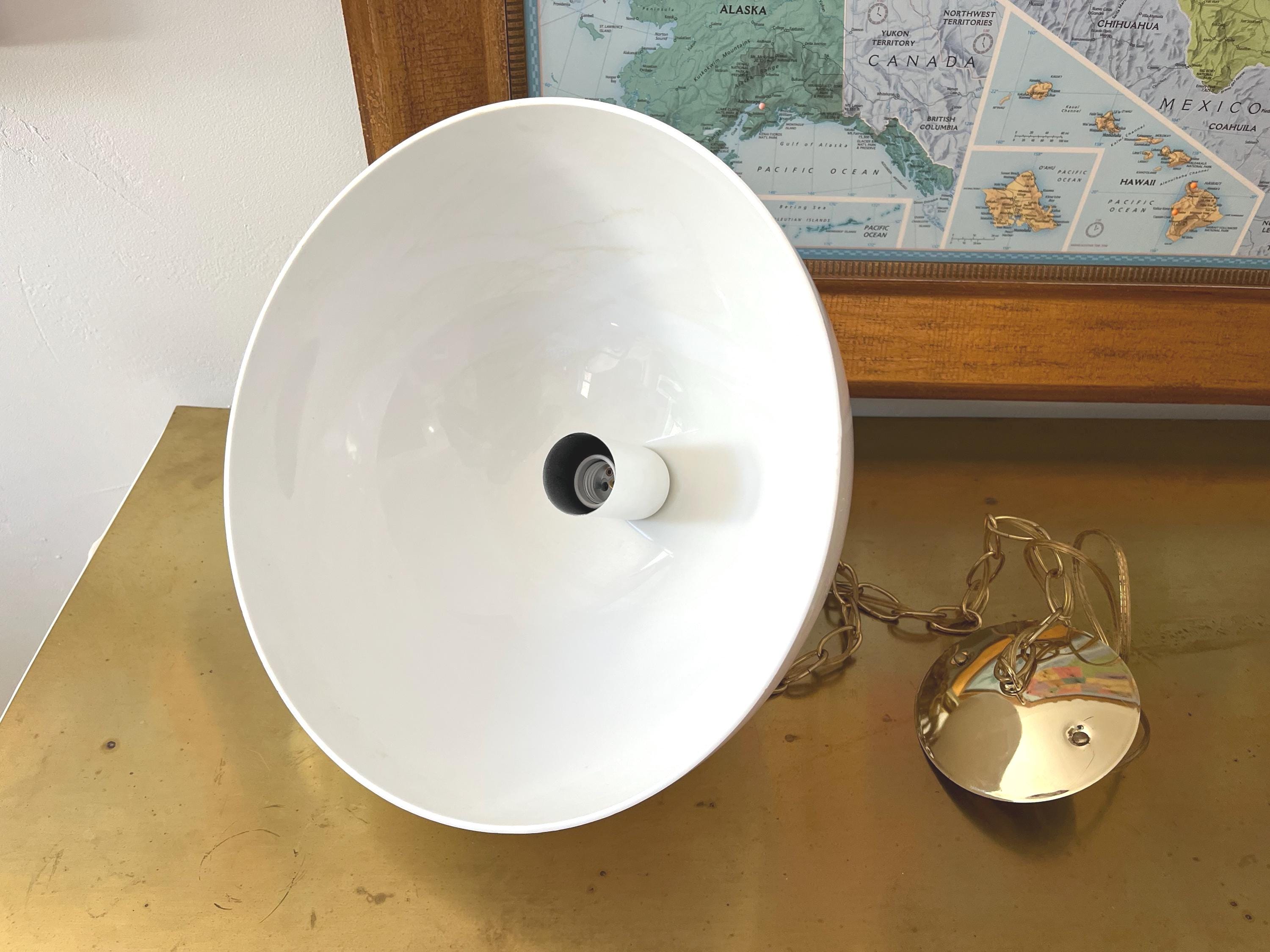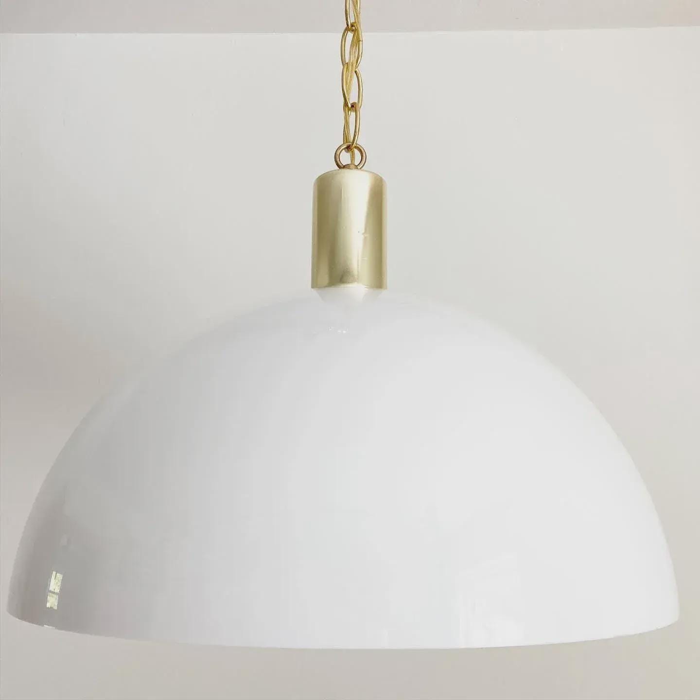Modern minimalist domed white acrylic pendant light by Artcraft Montreal from the seventies with simple gold metal finial and central light. Retains original labeled ceiling canopy.