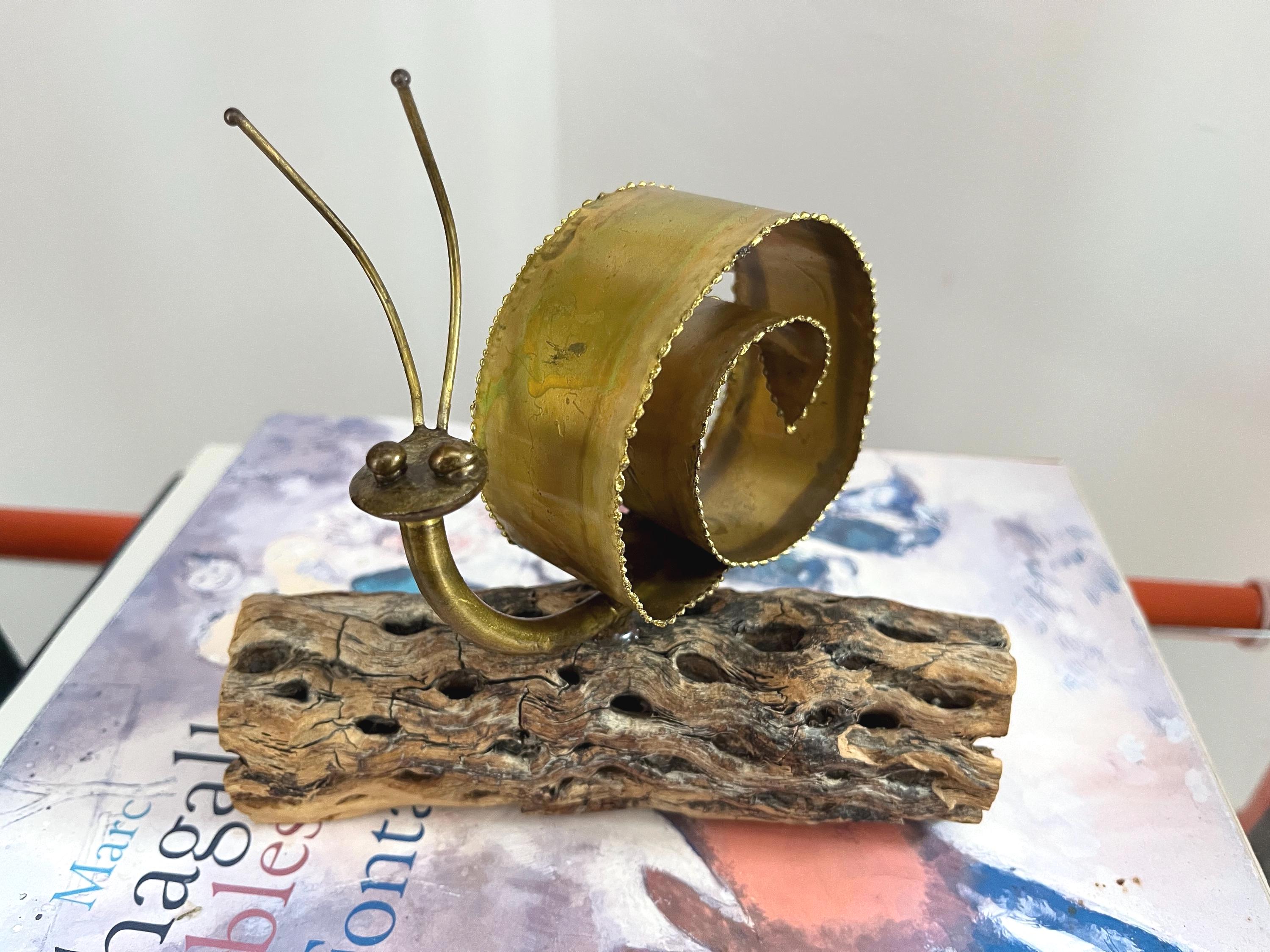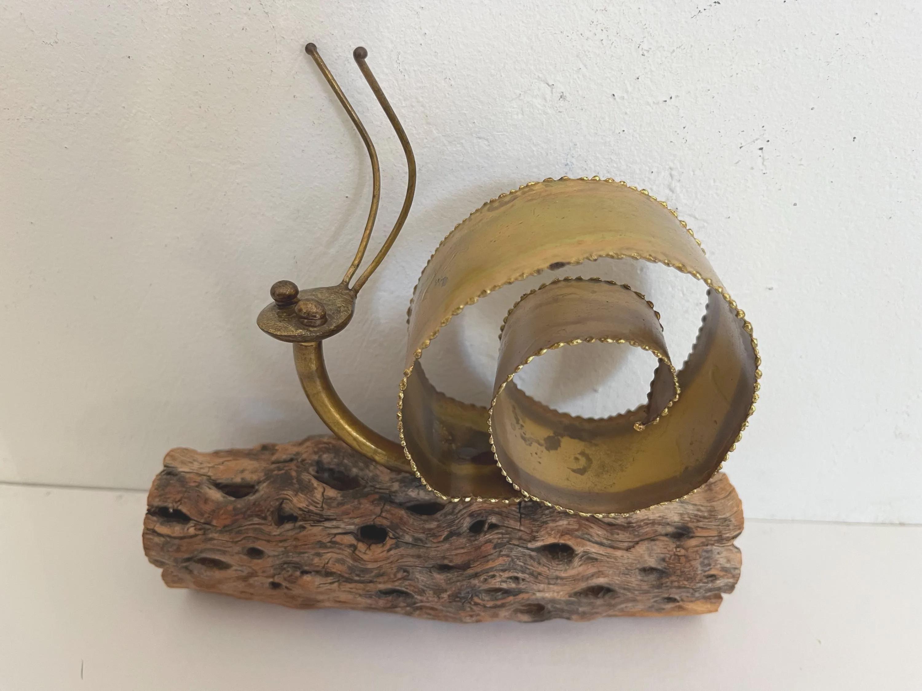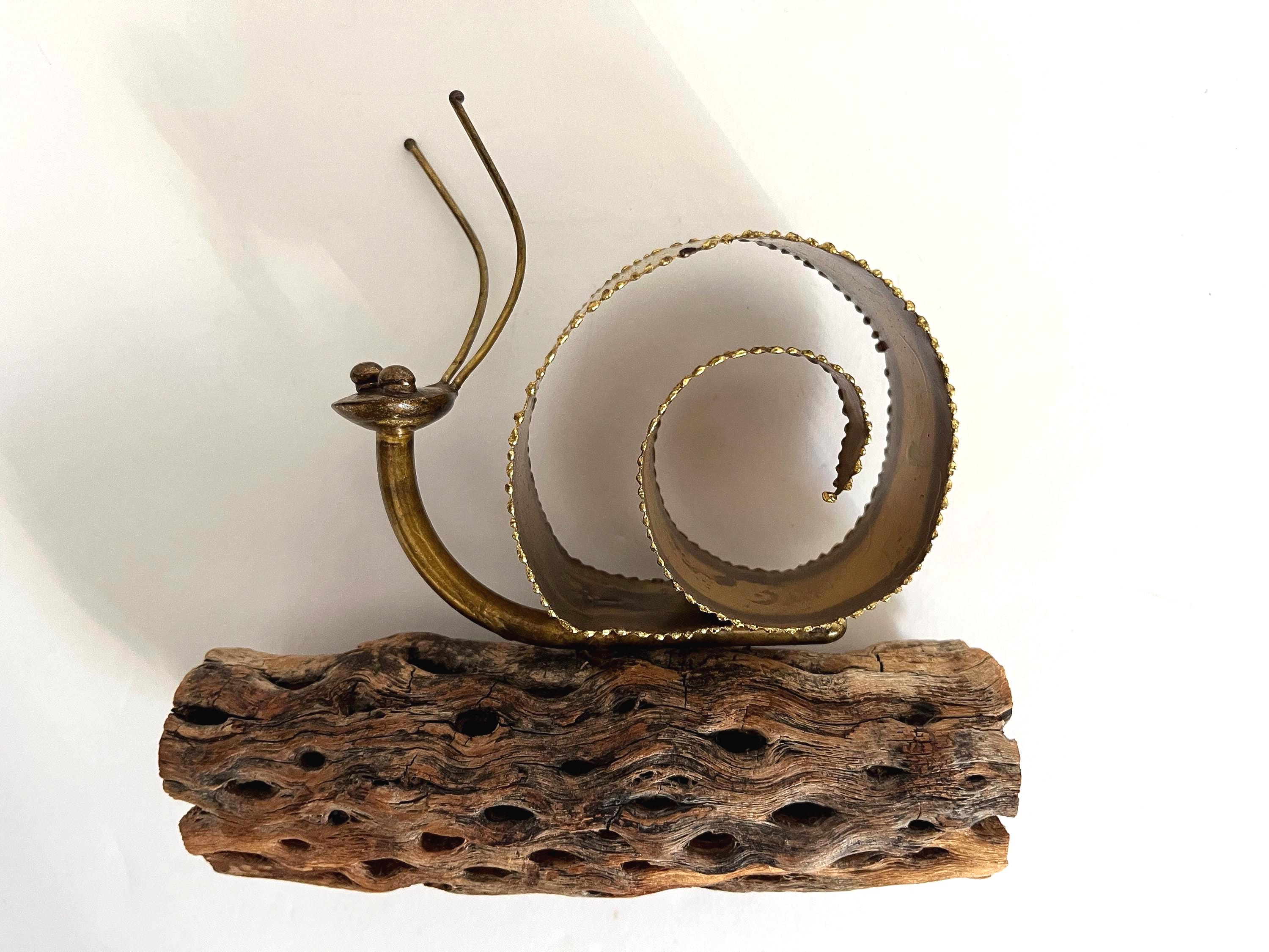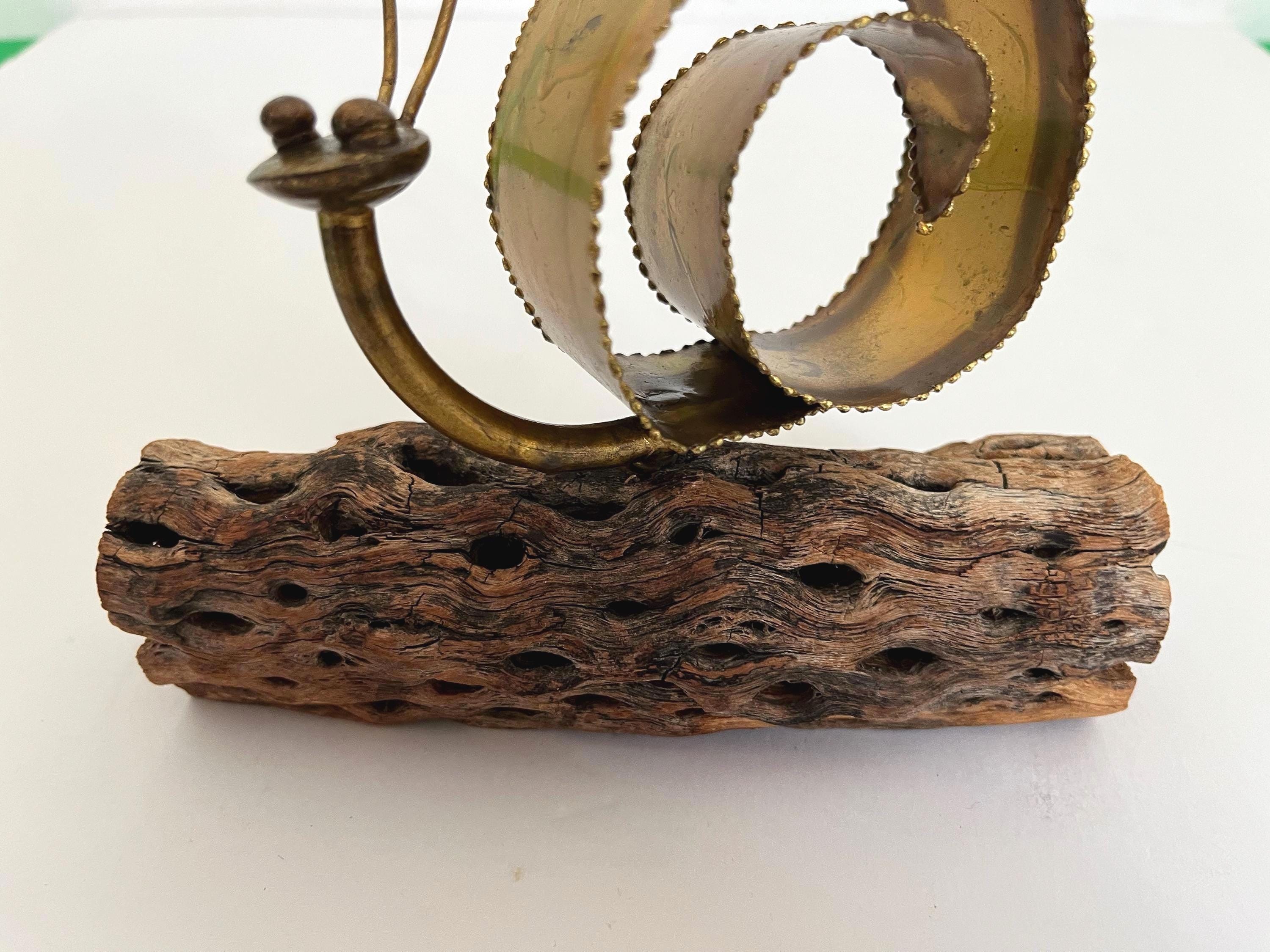 Adorable 1970s snail sculpture hand crafted of torch cut metal in coppery gold with a flexible kinetic ribbon shell and gold metal body on a cholla wood base. Body and antennae are poseable.