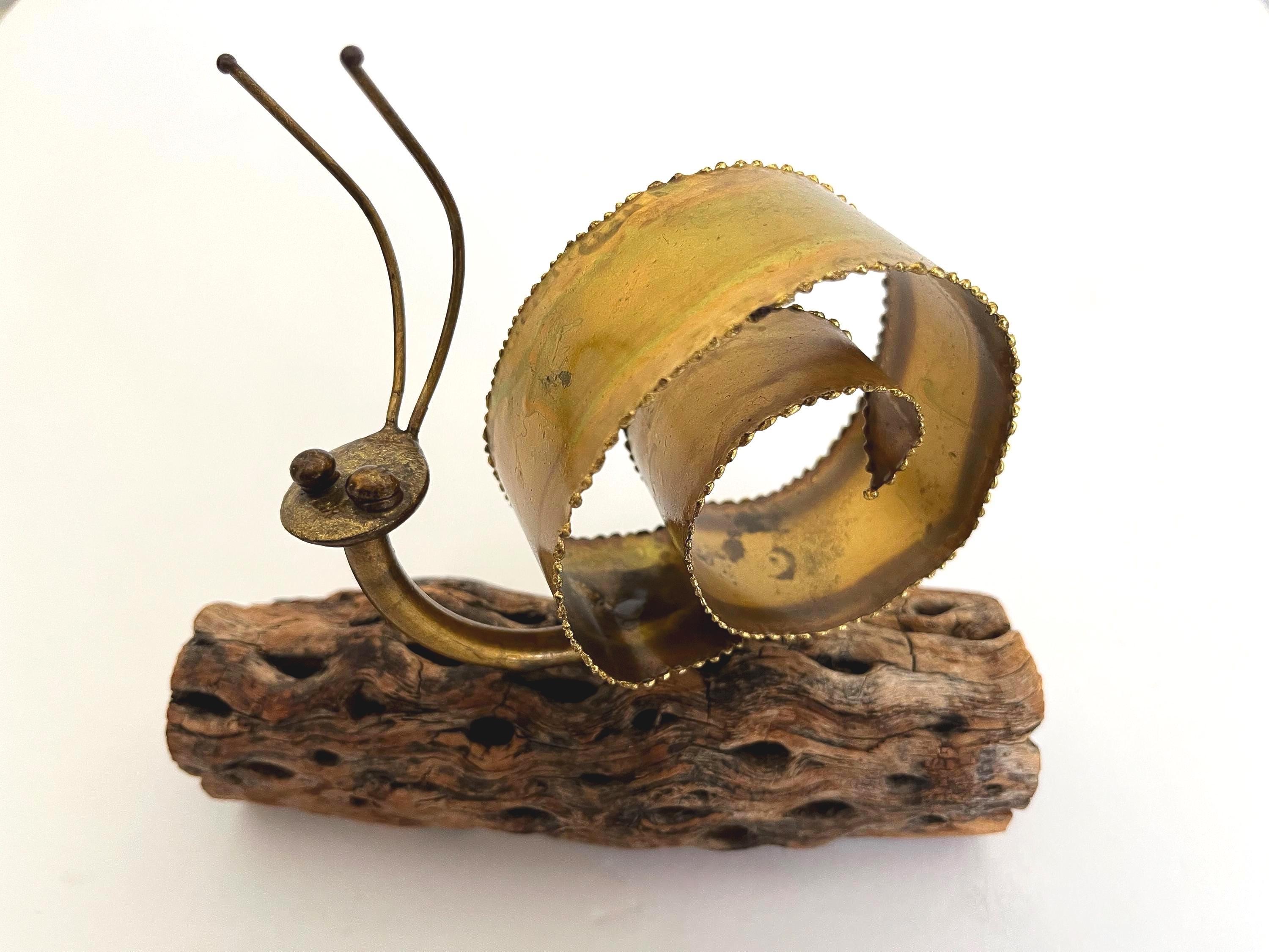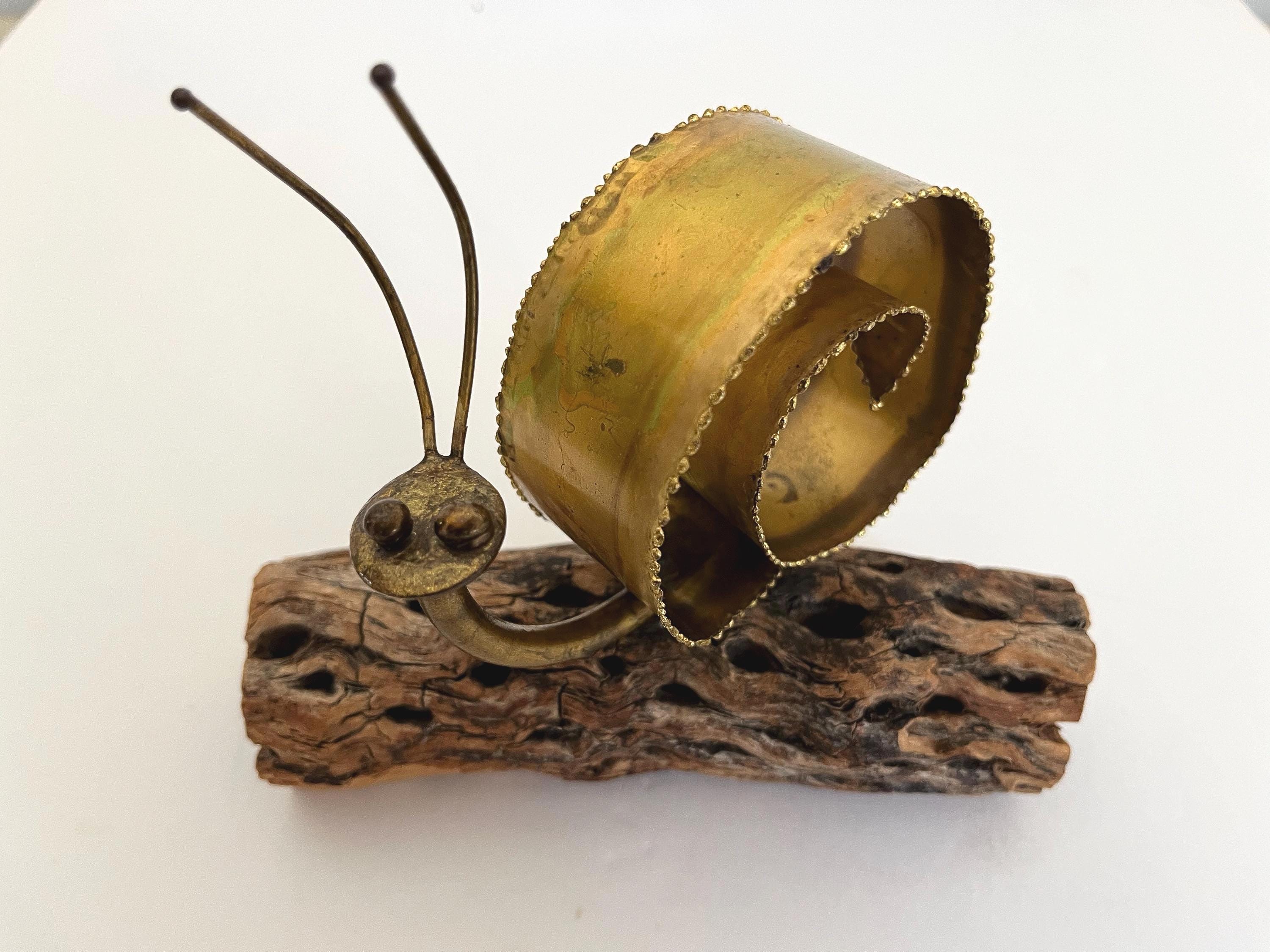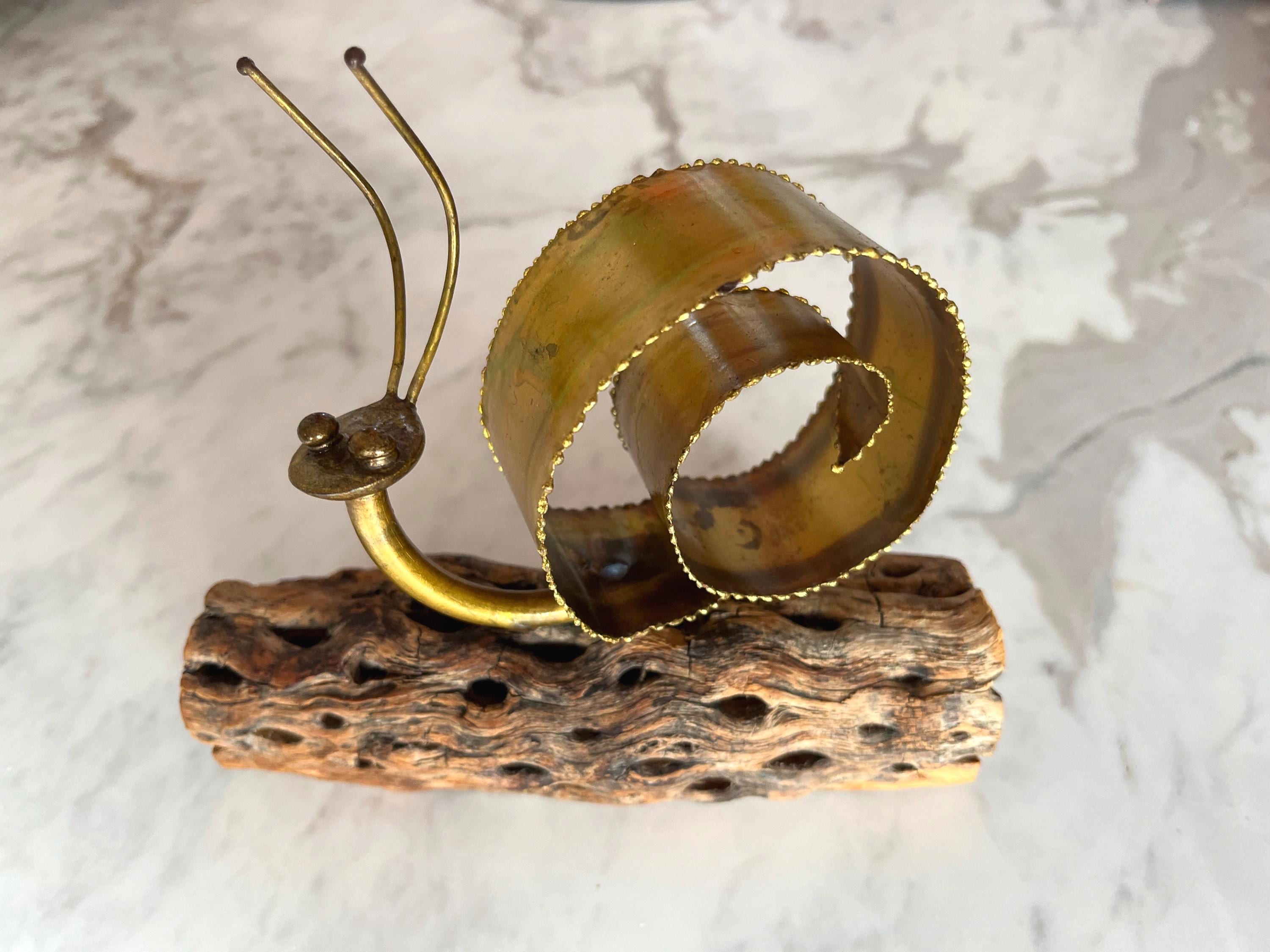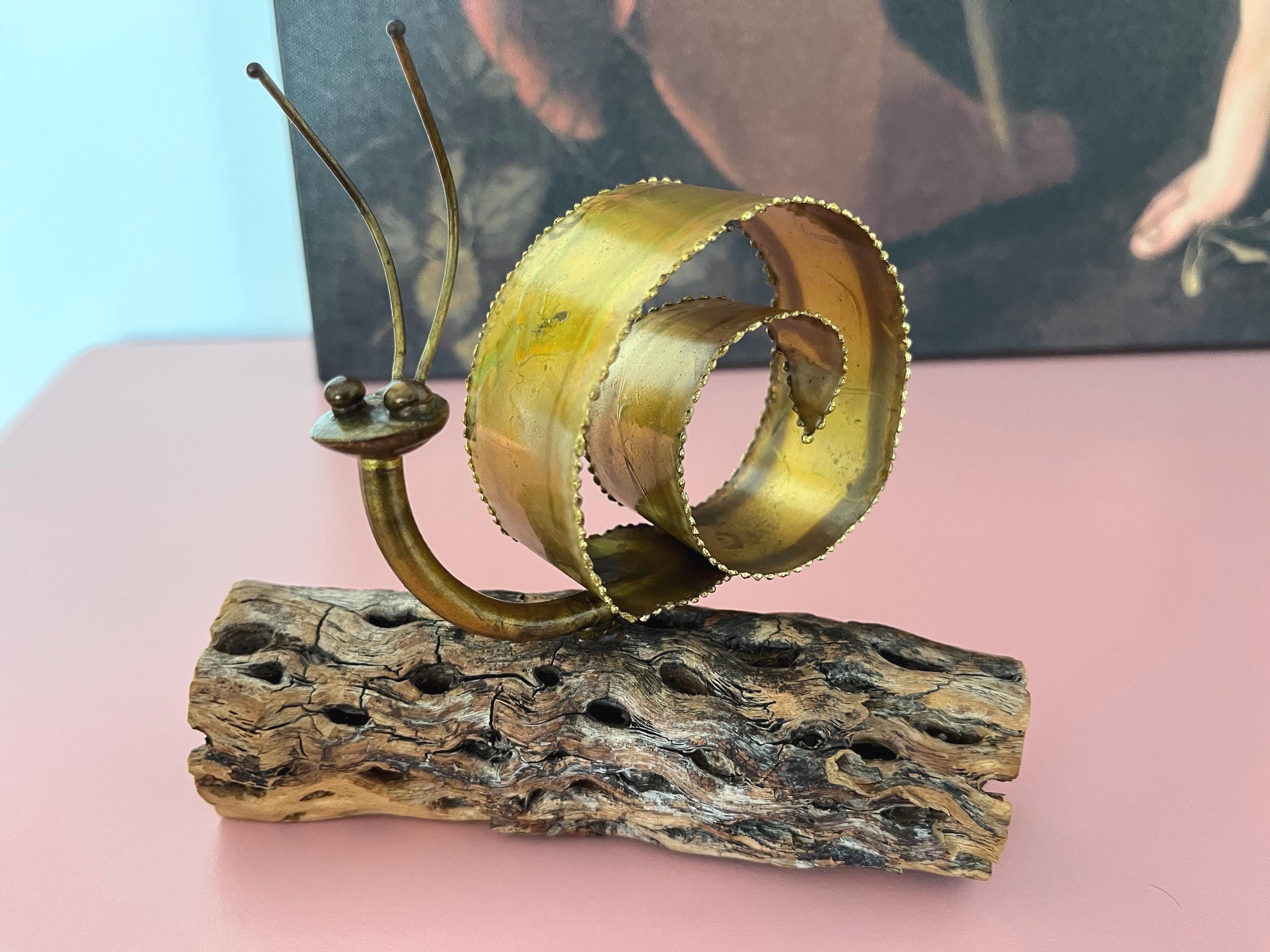 Adorable 1970s snail sculpture hand crafted of torch cut metal in coppery gold with a flexible kinetic ribbon shell and gold metal body on a cholla wood base. Body and antennae are poseable.