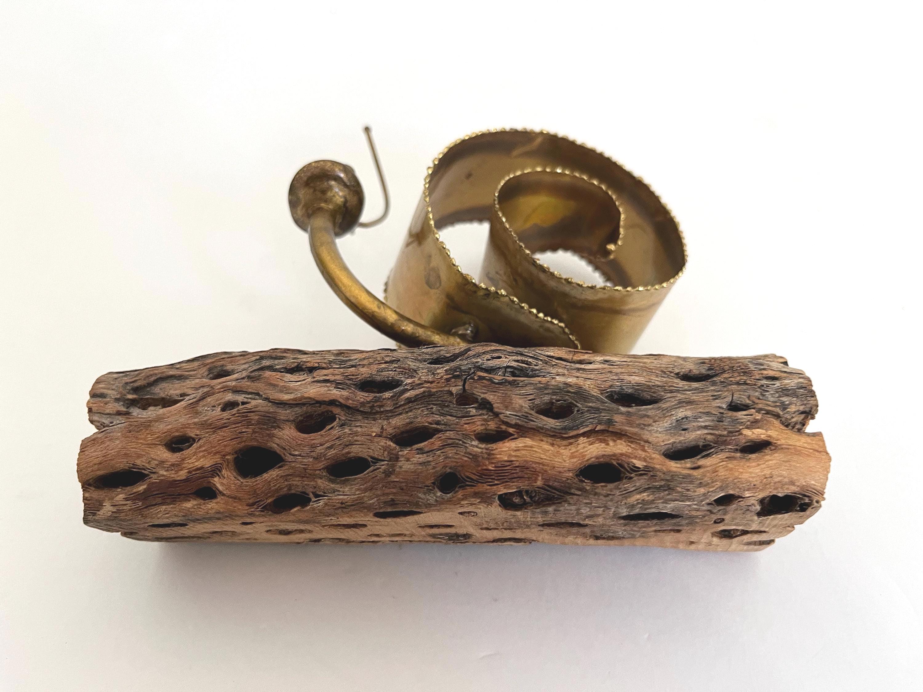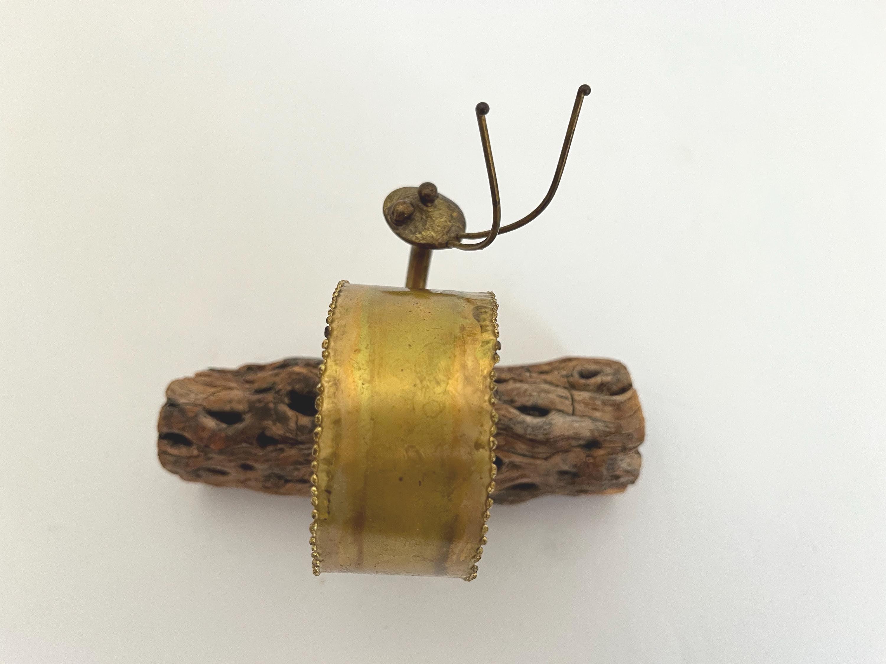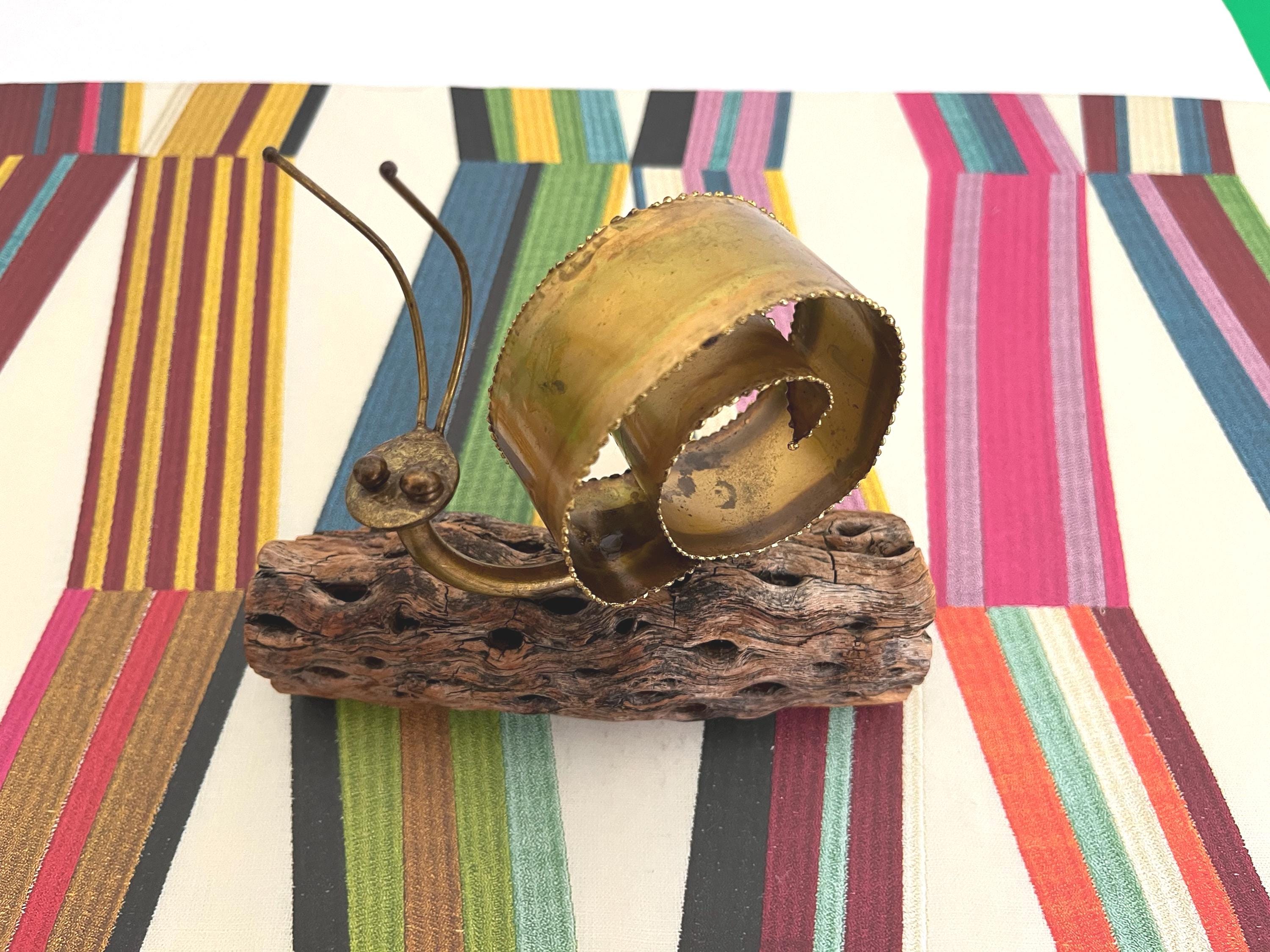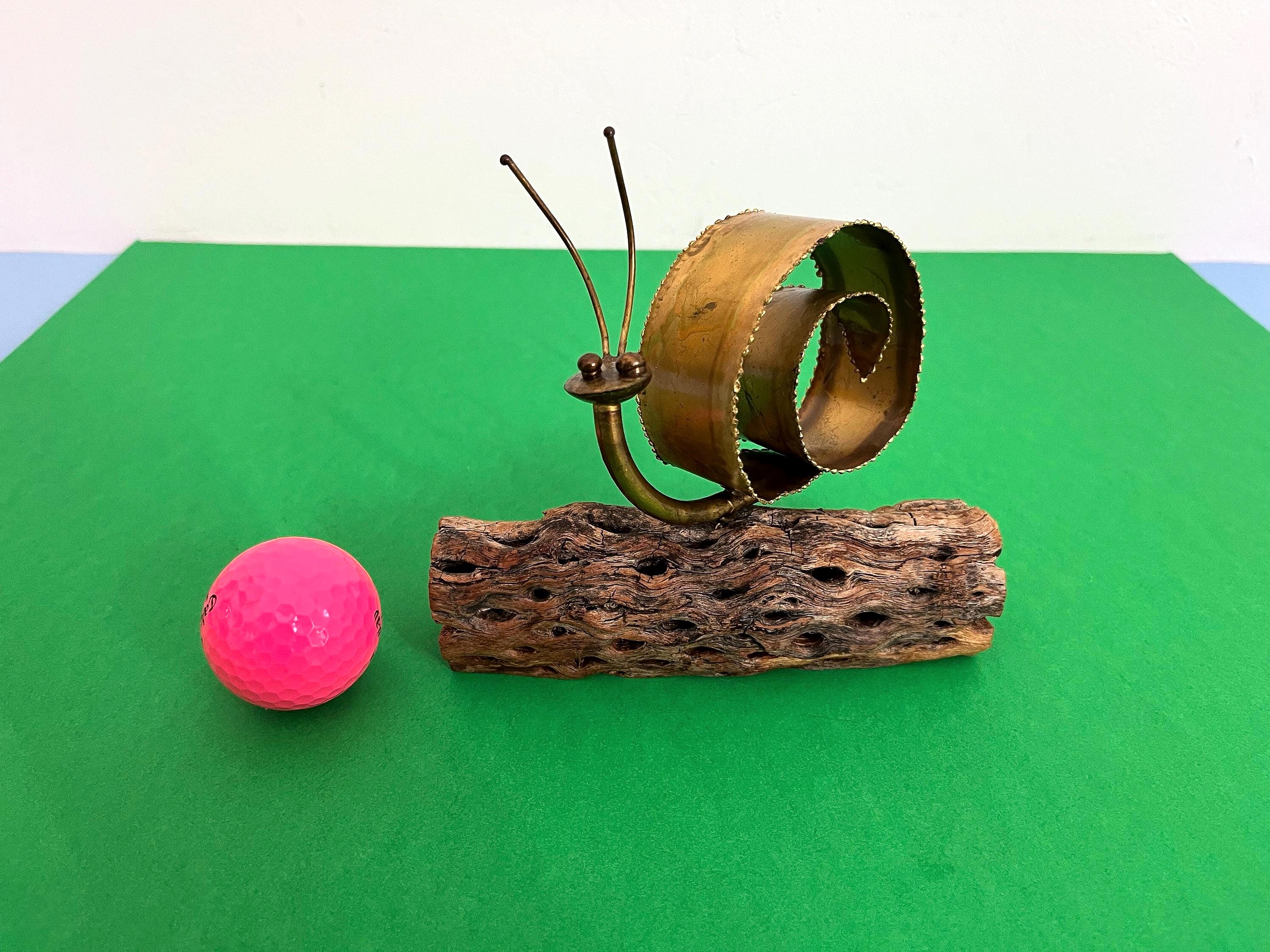 Adorable 1970s snail sculpture hand crafted of torch cut metal in coppery gold with a flexible kinetic ribbon shell and gold metal body on a cholla wood base. Body and antennae are poseable.