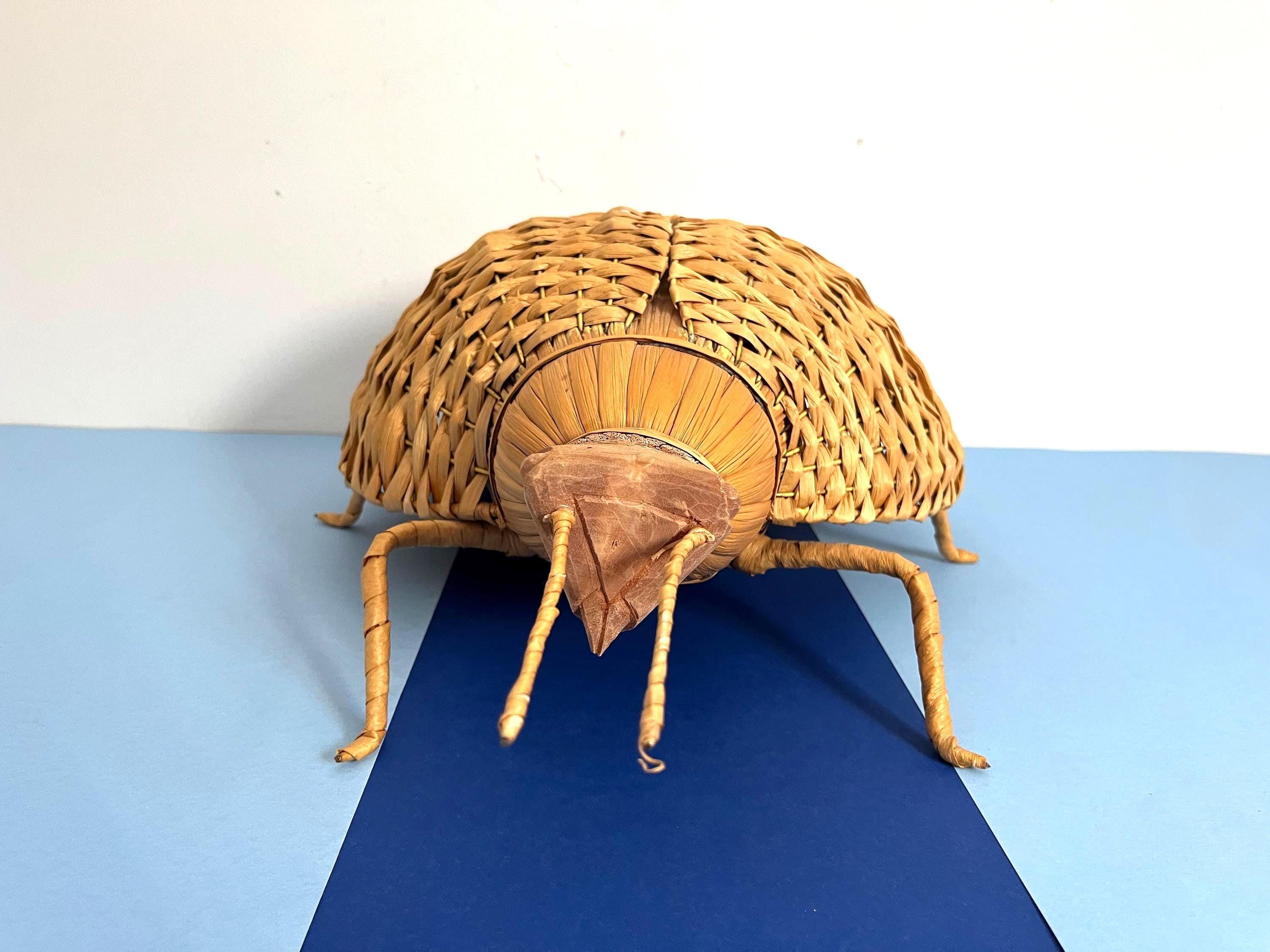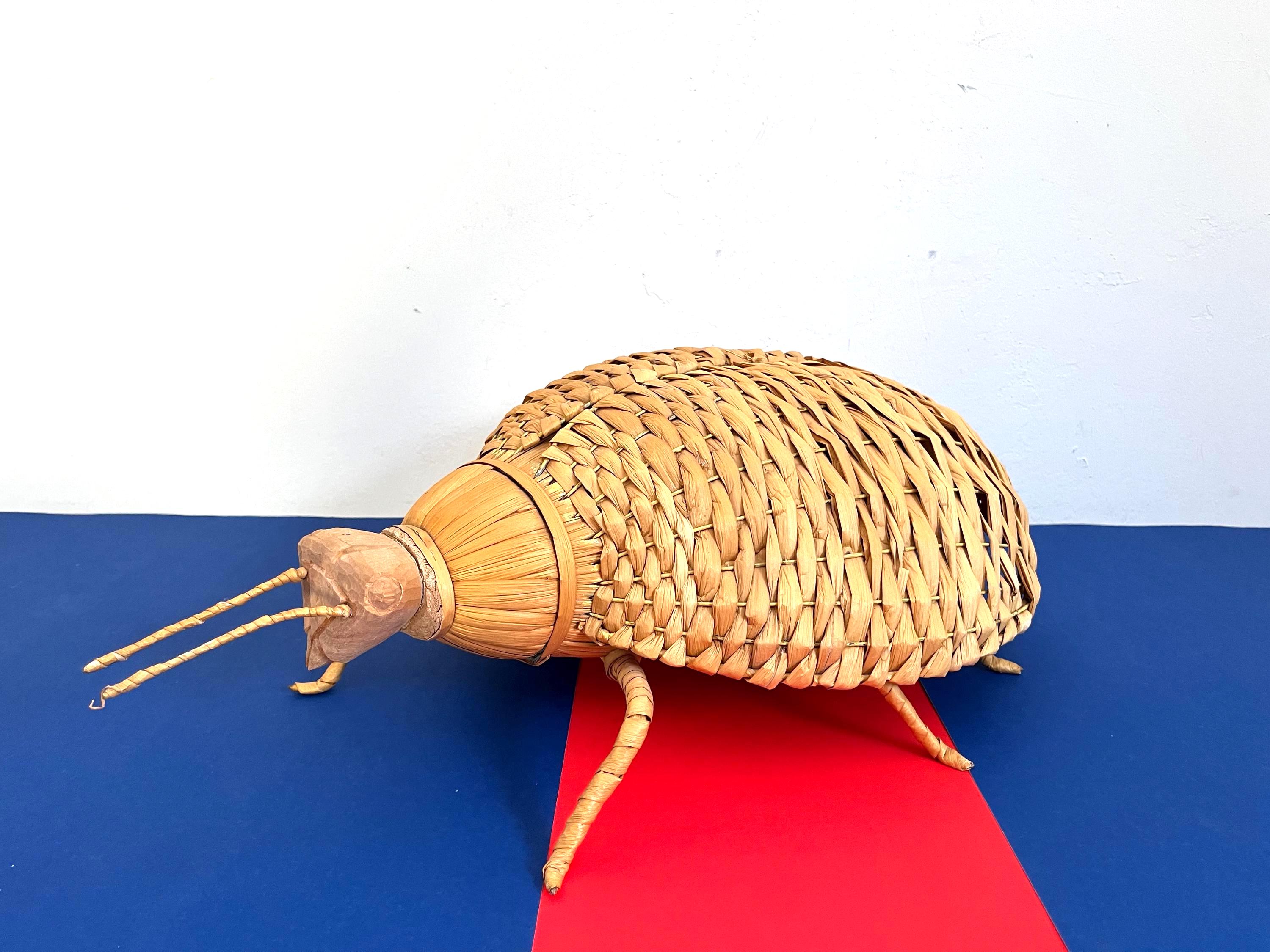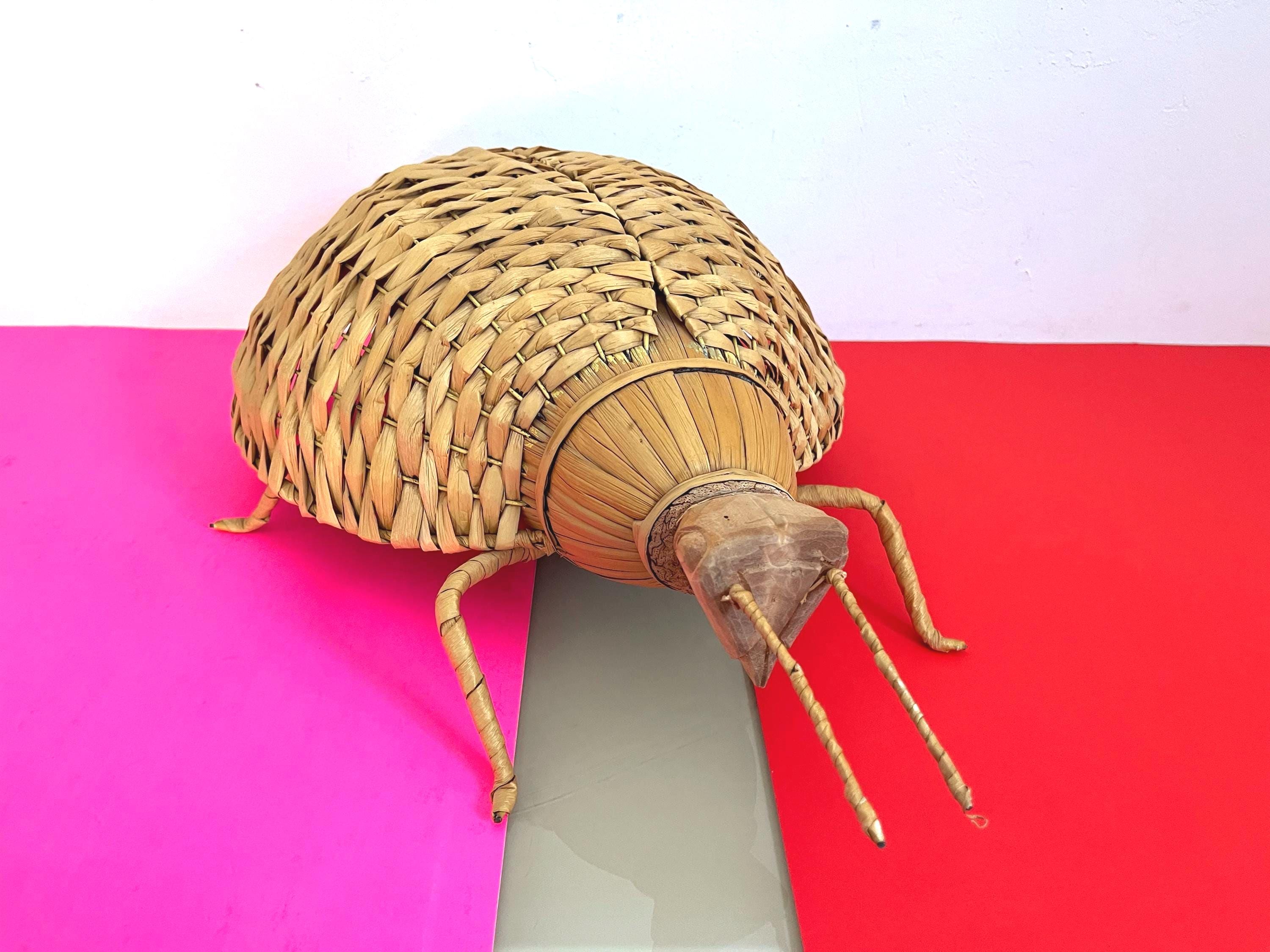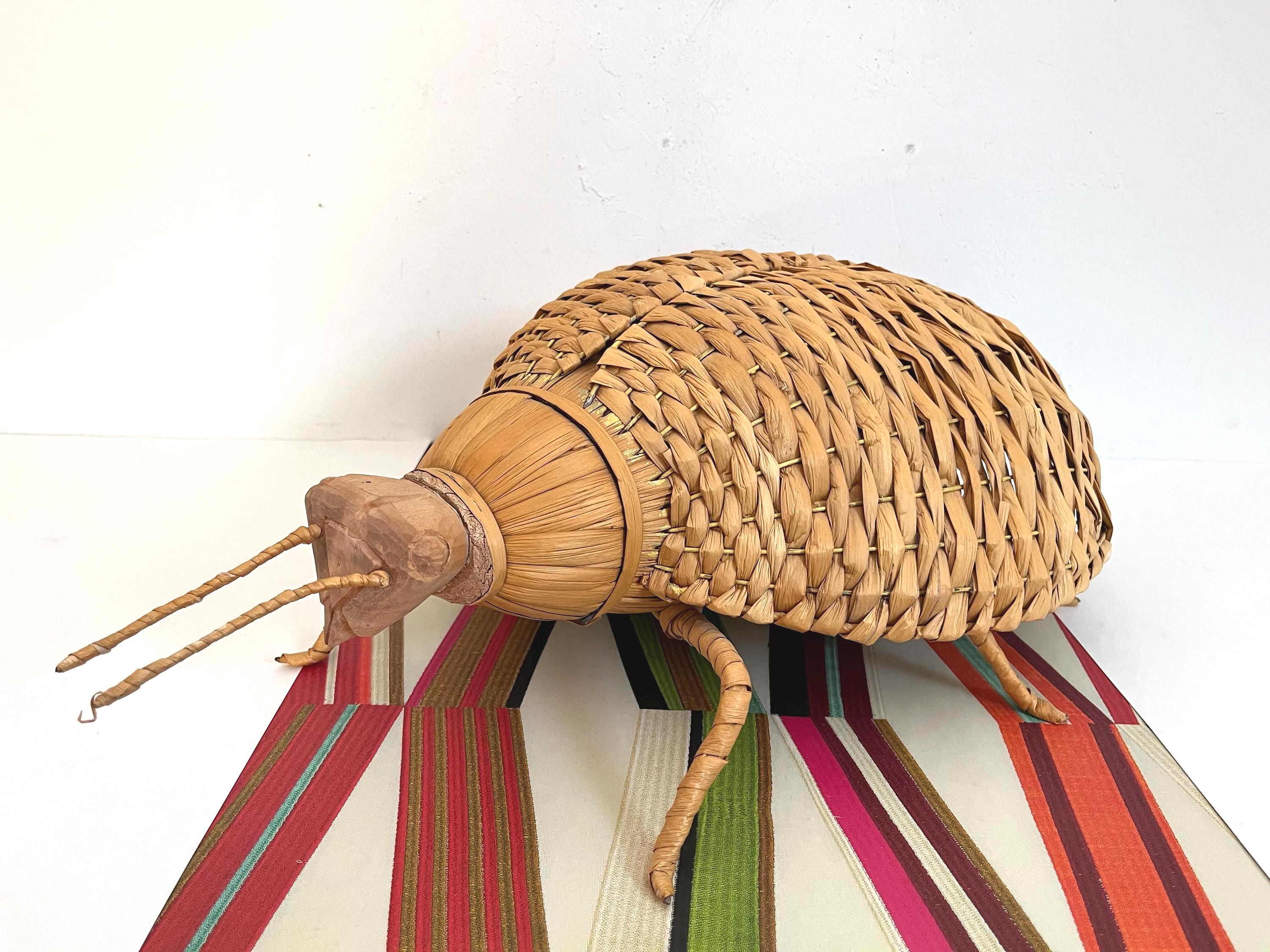 Huge 1970s wicker beetle hand crafted of natural reeds and carved wood woven around a metal frame with lifelike antennae, carapace, legs, and abdomen. Imported from the Philippines.