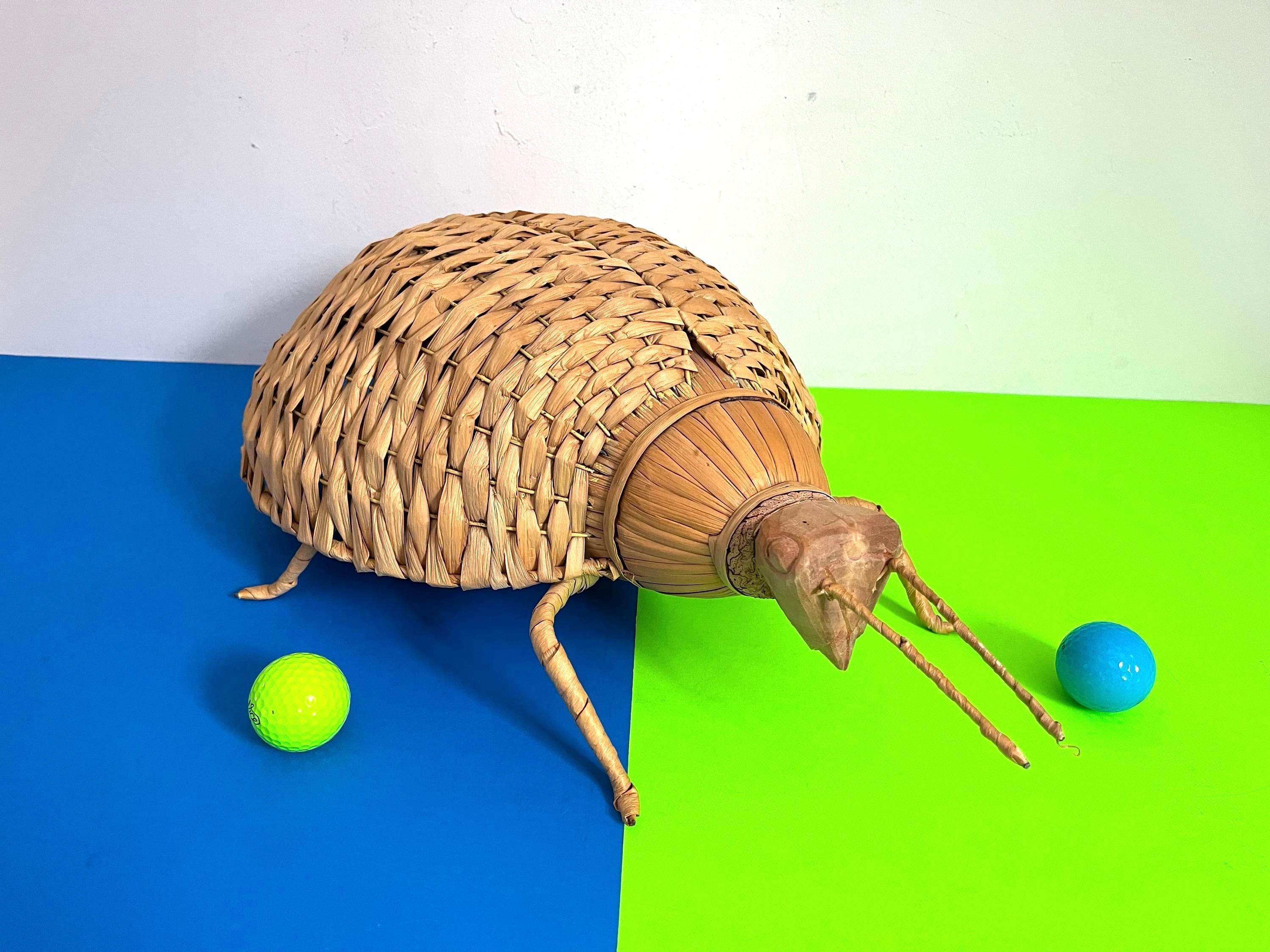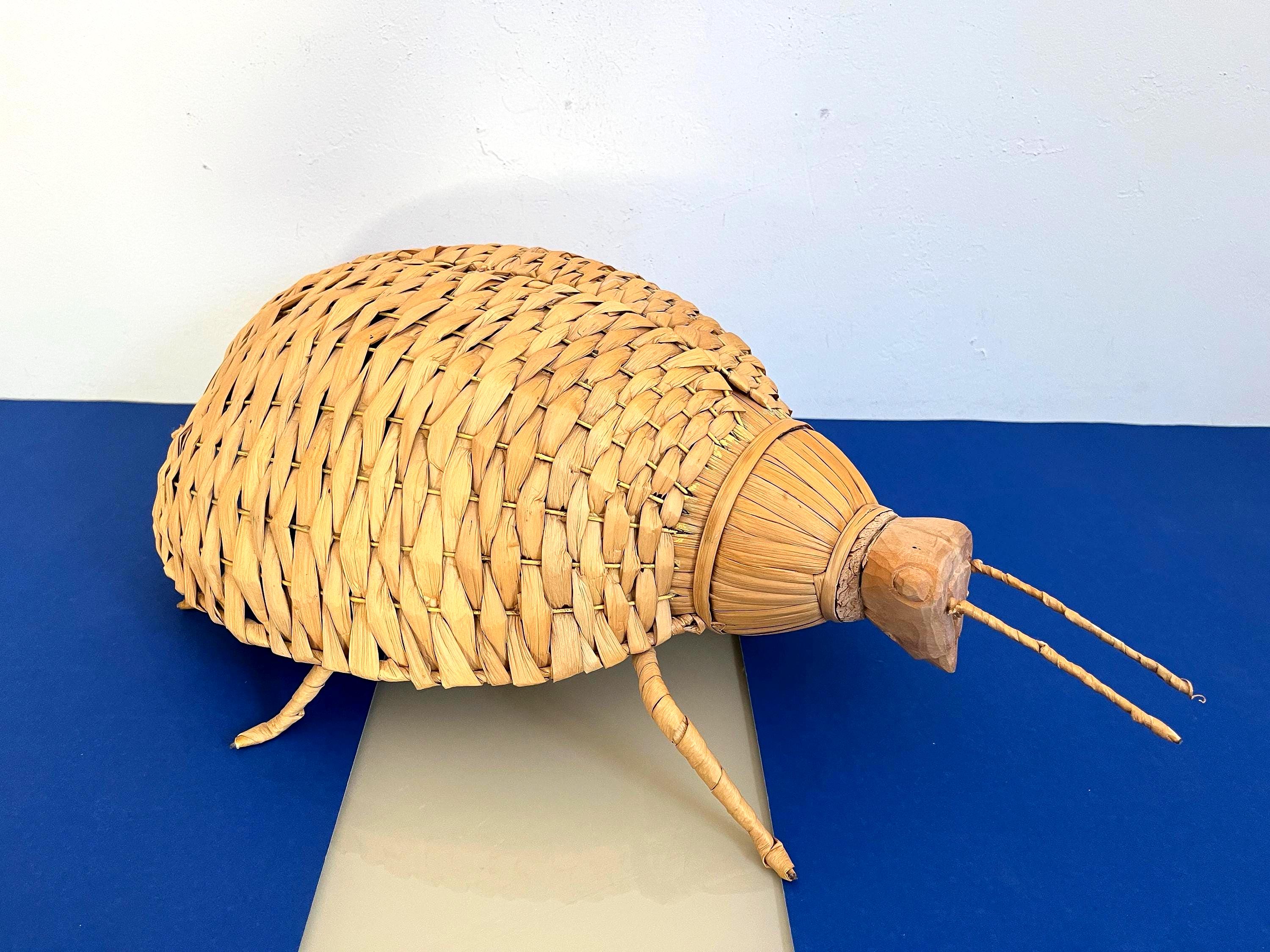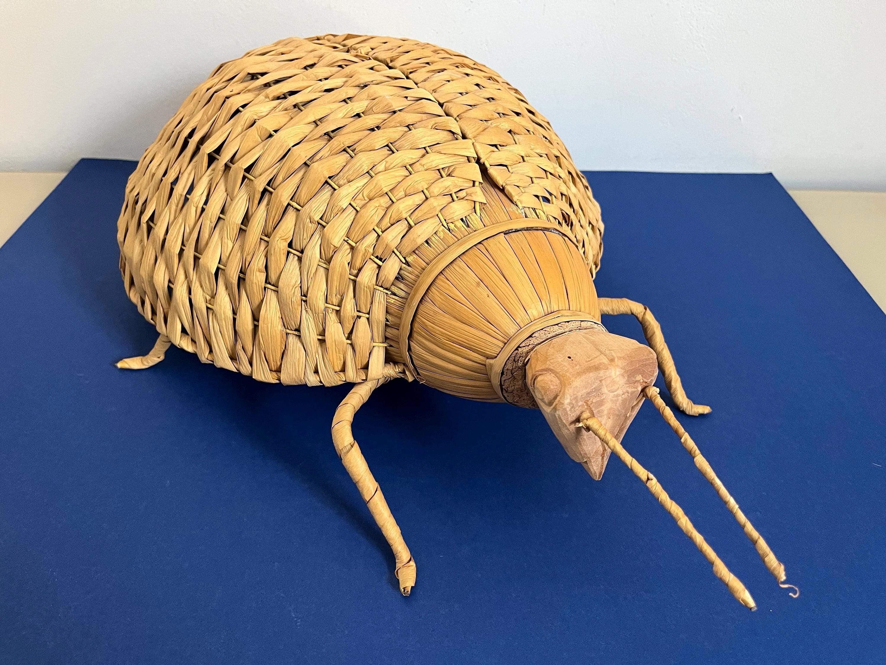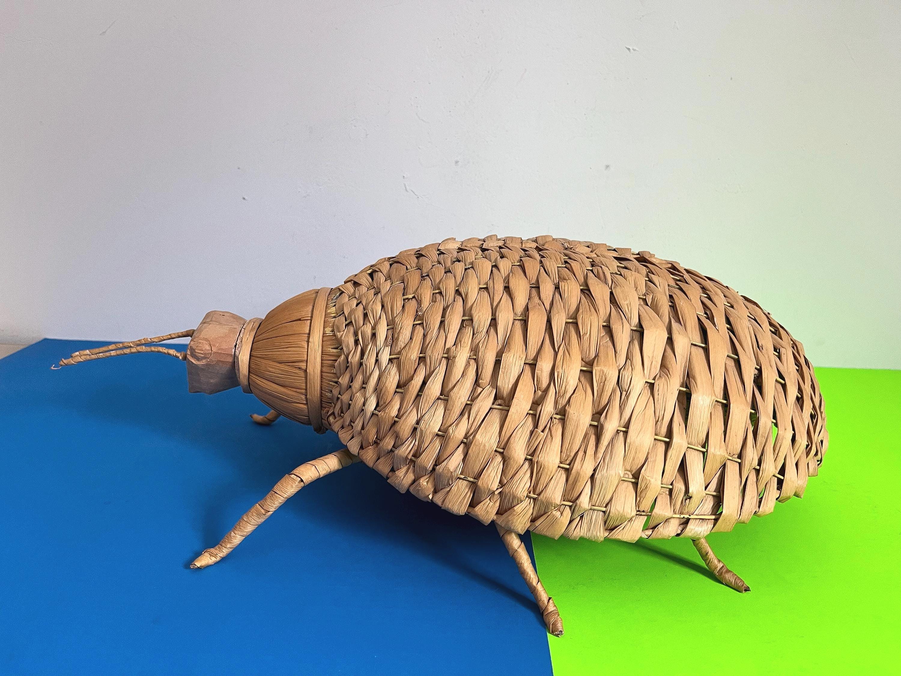Huge 1970s wicker beetle hand crafted of natural reeds and carved wood woven around a metal frame with lifelike antennae, carapace, legs, and abdomen. Imported from the Philippines.