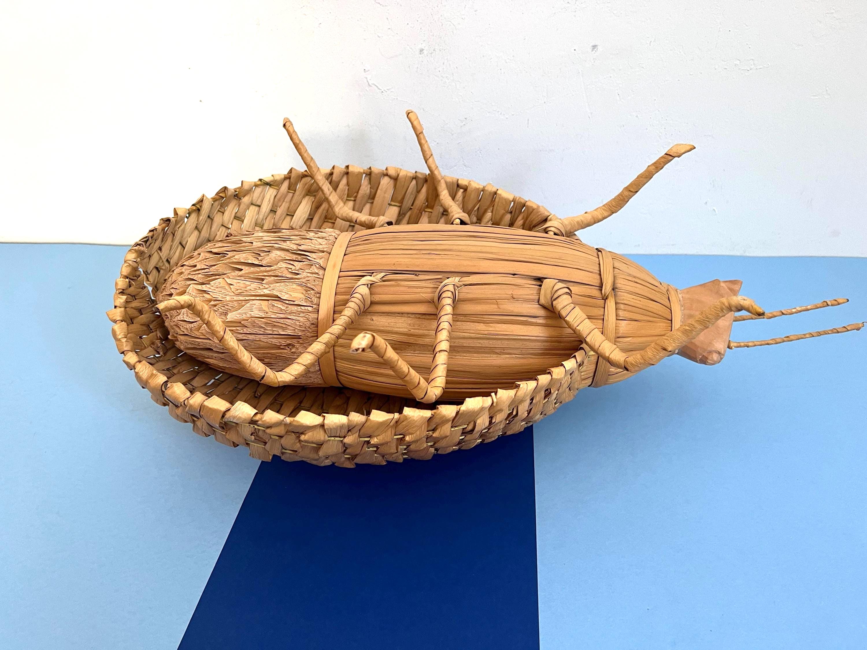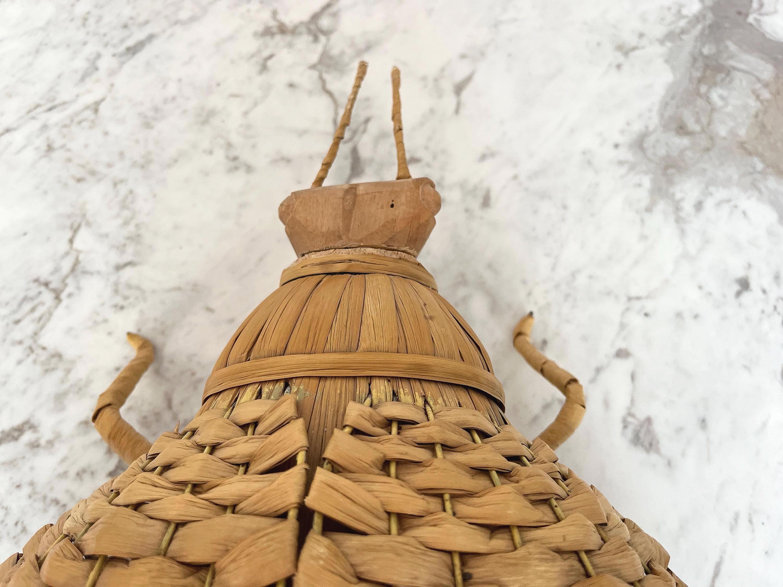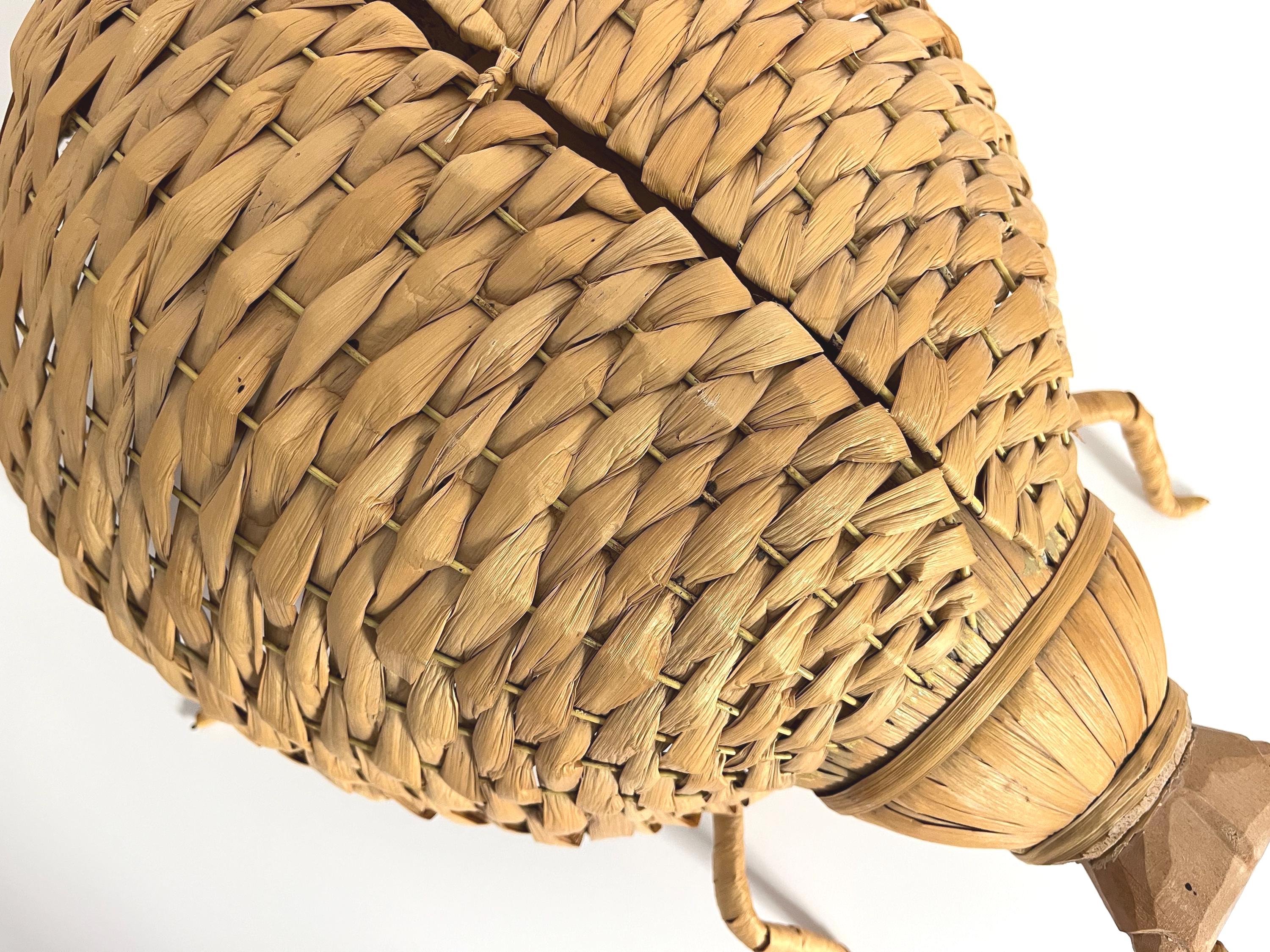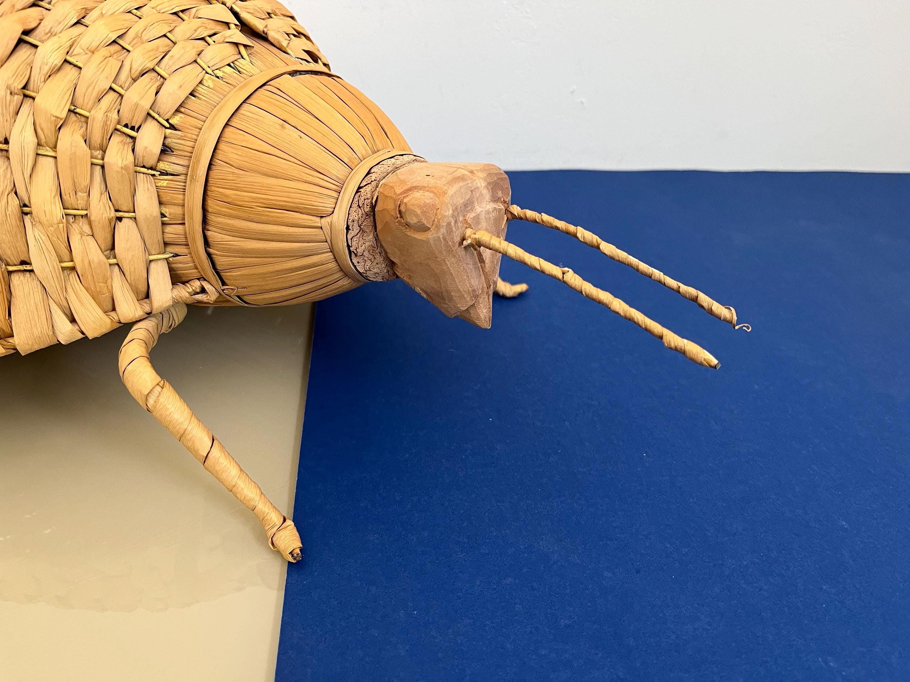 Huge 1970s wicker beetle hand crafted of natural reeds and carved wood woven around a metal frame with lifelike antennae, carapace, legs, and abdomen. Imported from the Philippines.