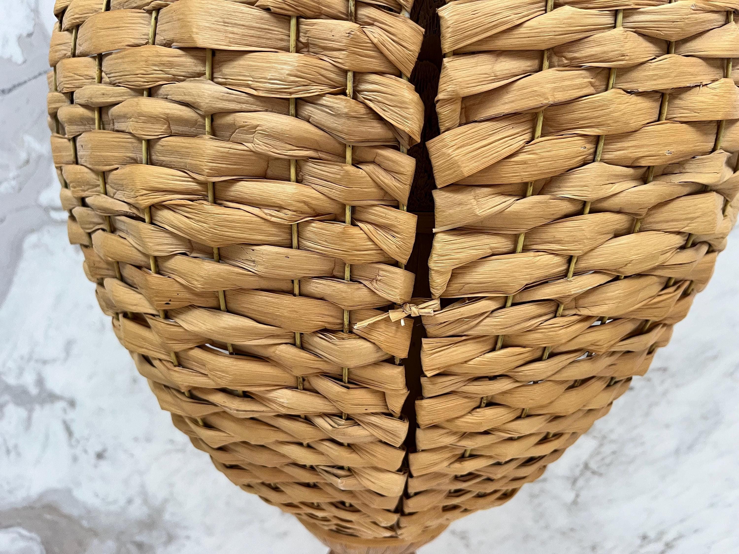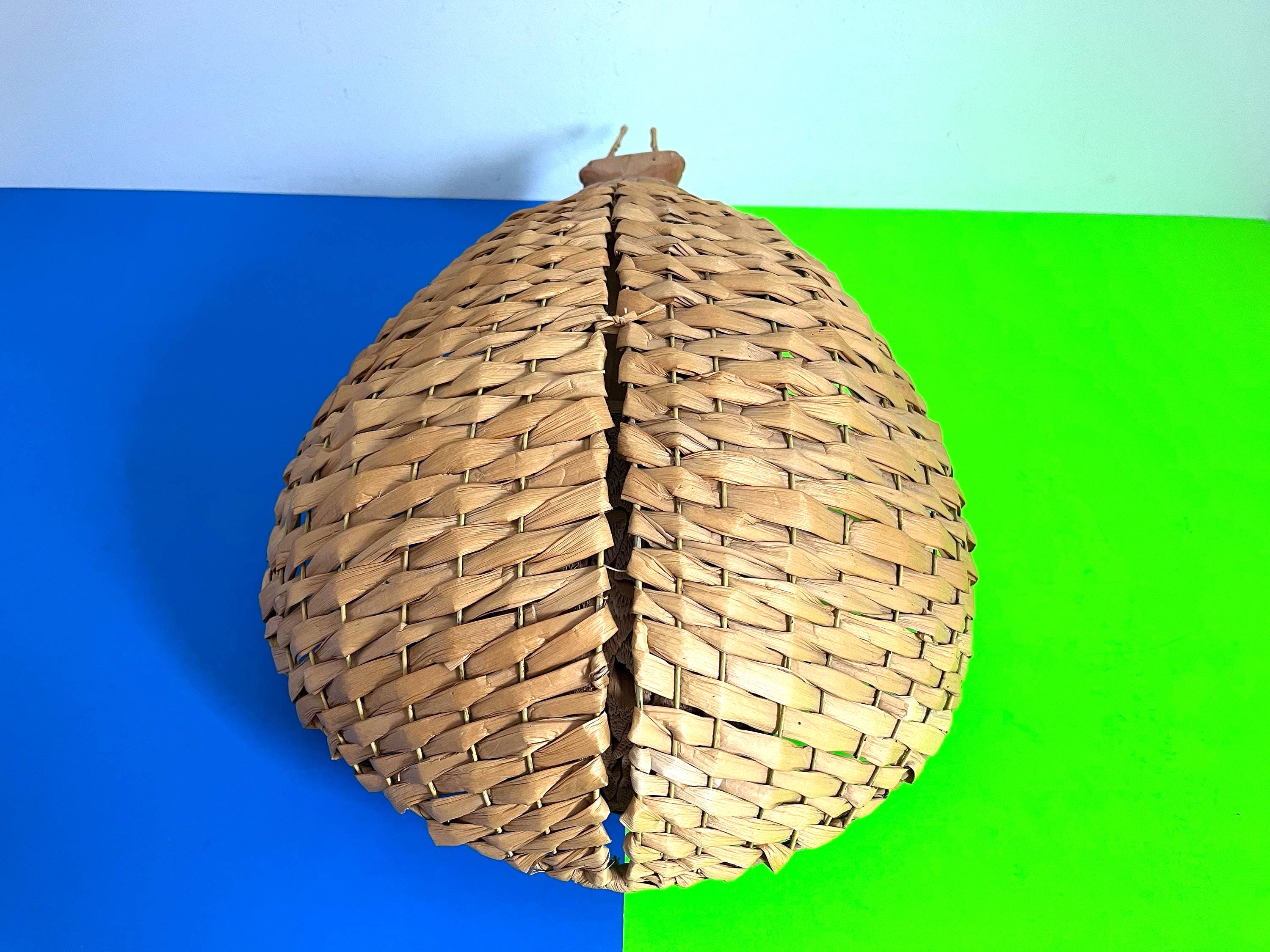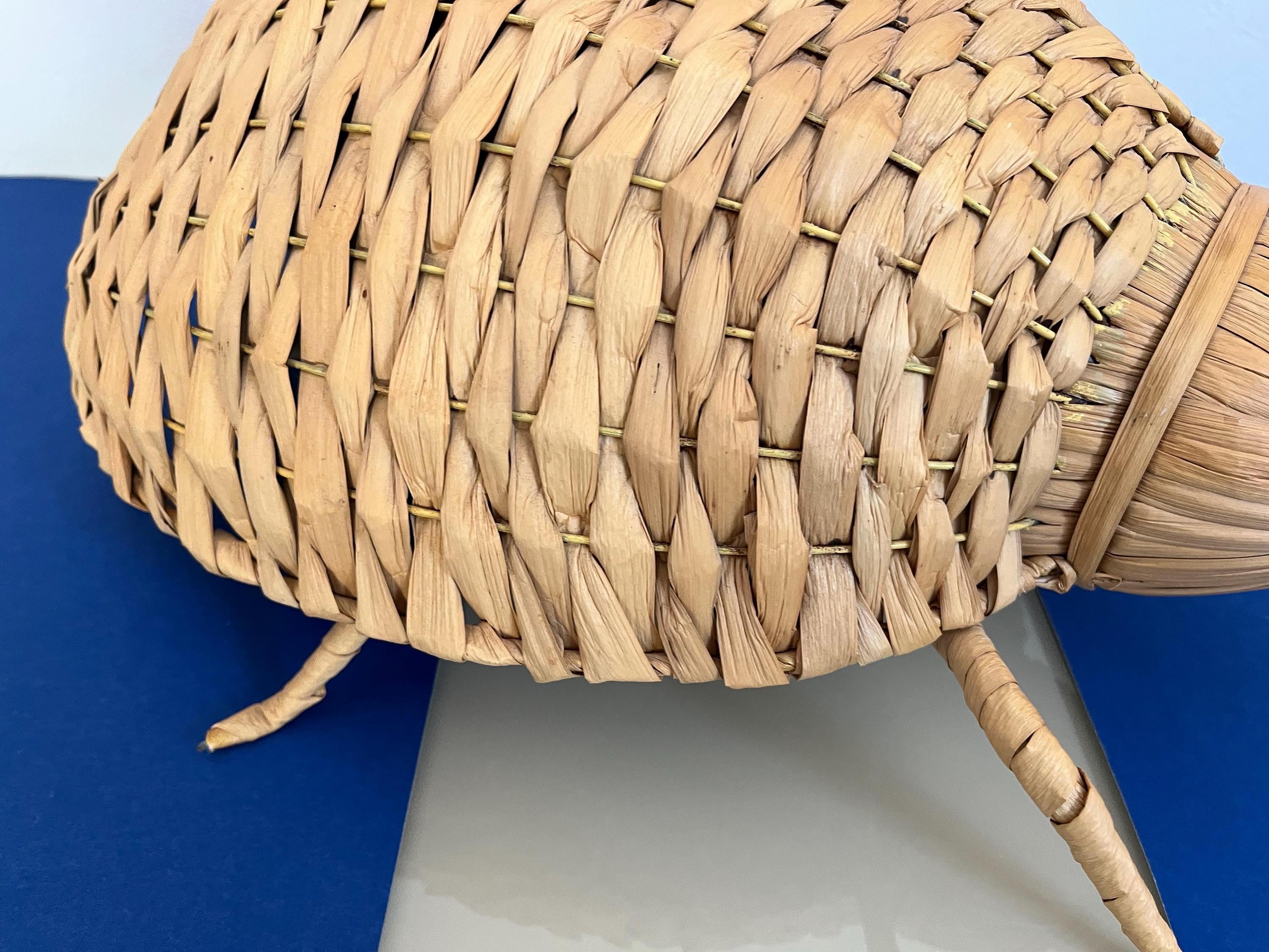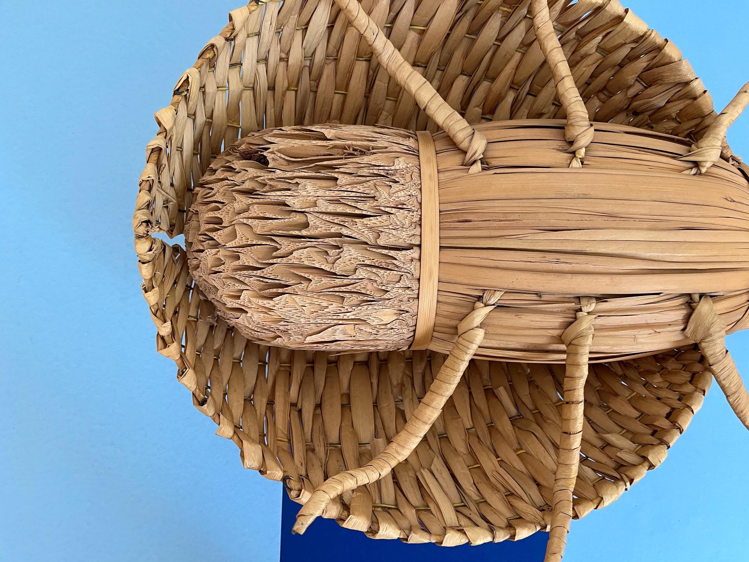 Huge 1970s wicker beetle hand crafted of natural reeds and carved wood woven around a metal frame with lifelike antennae, carapace, legs, and abdomen. Imported from the Philippines.