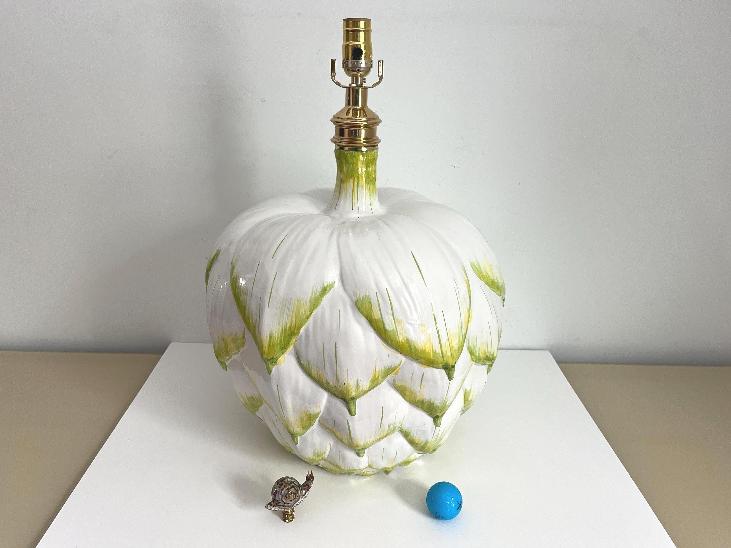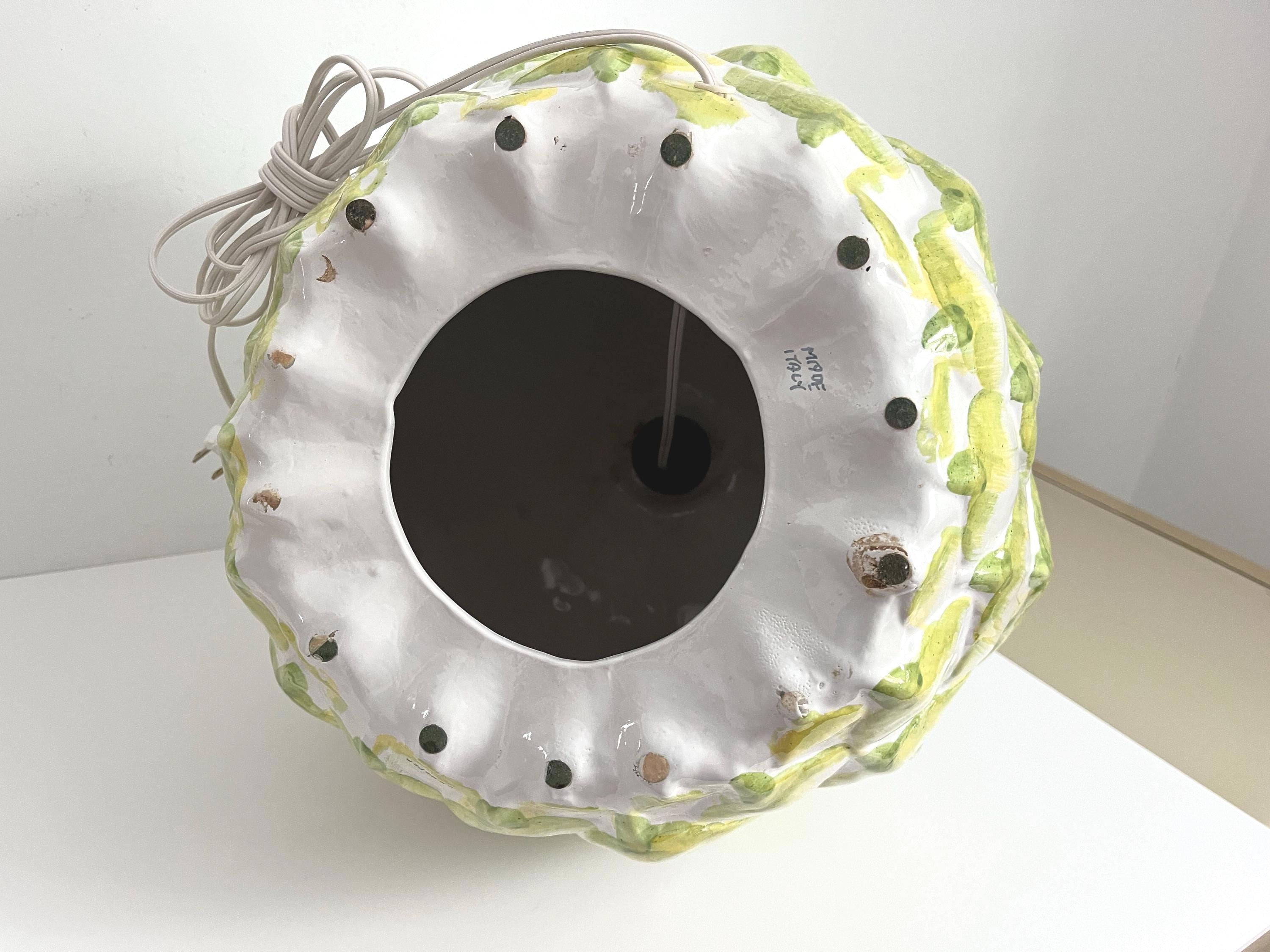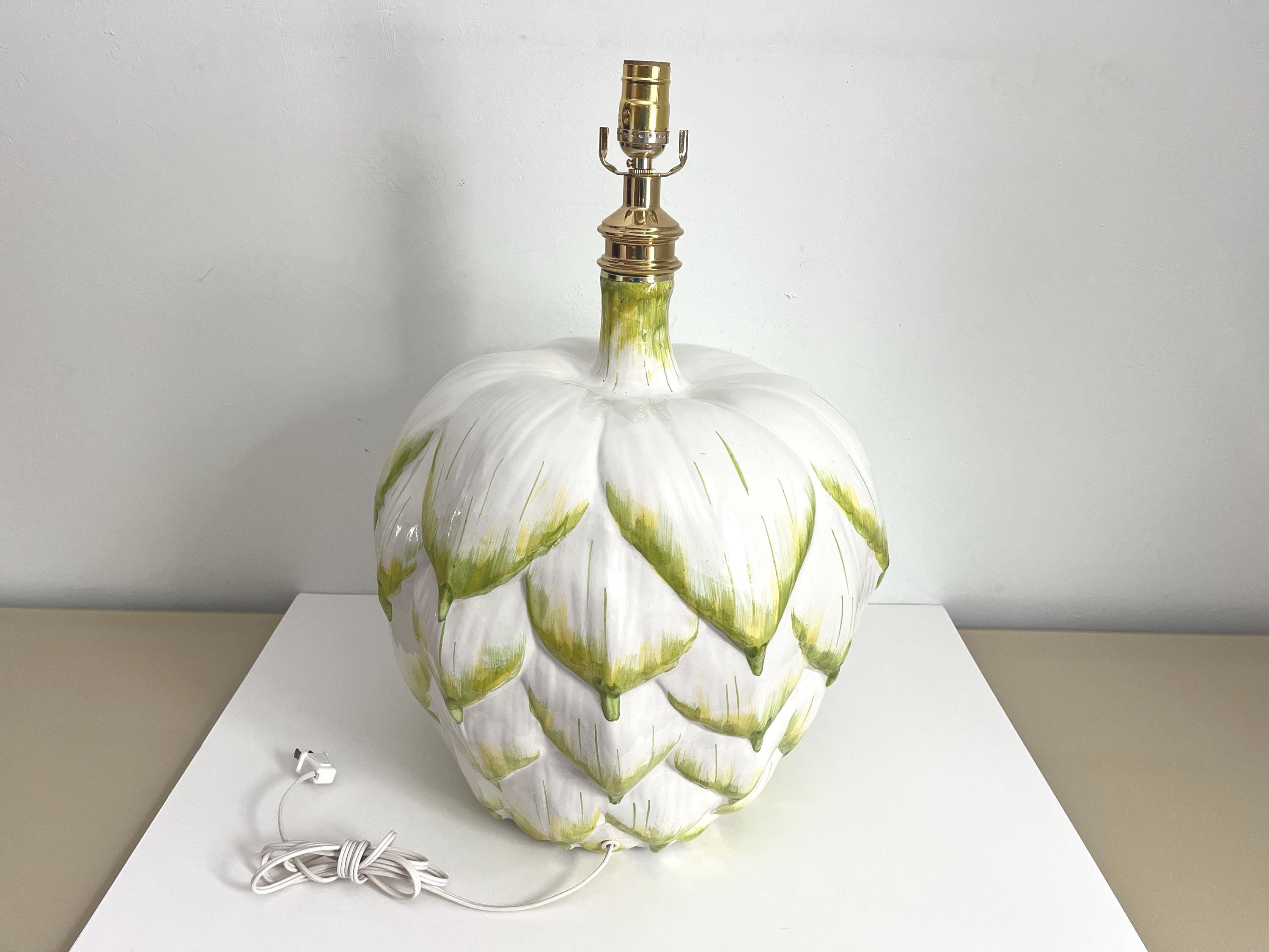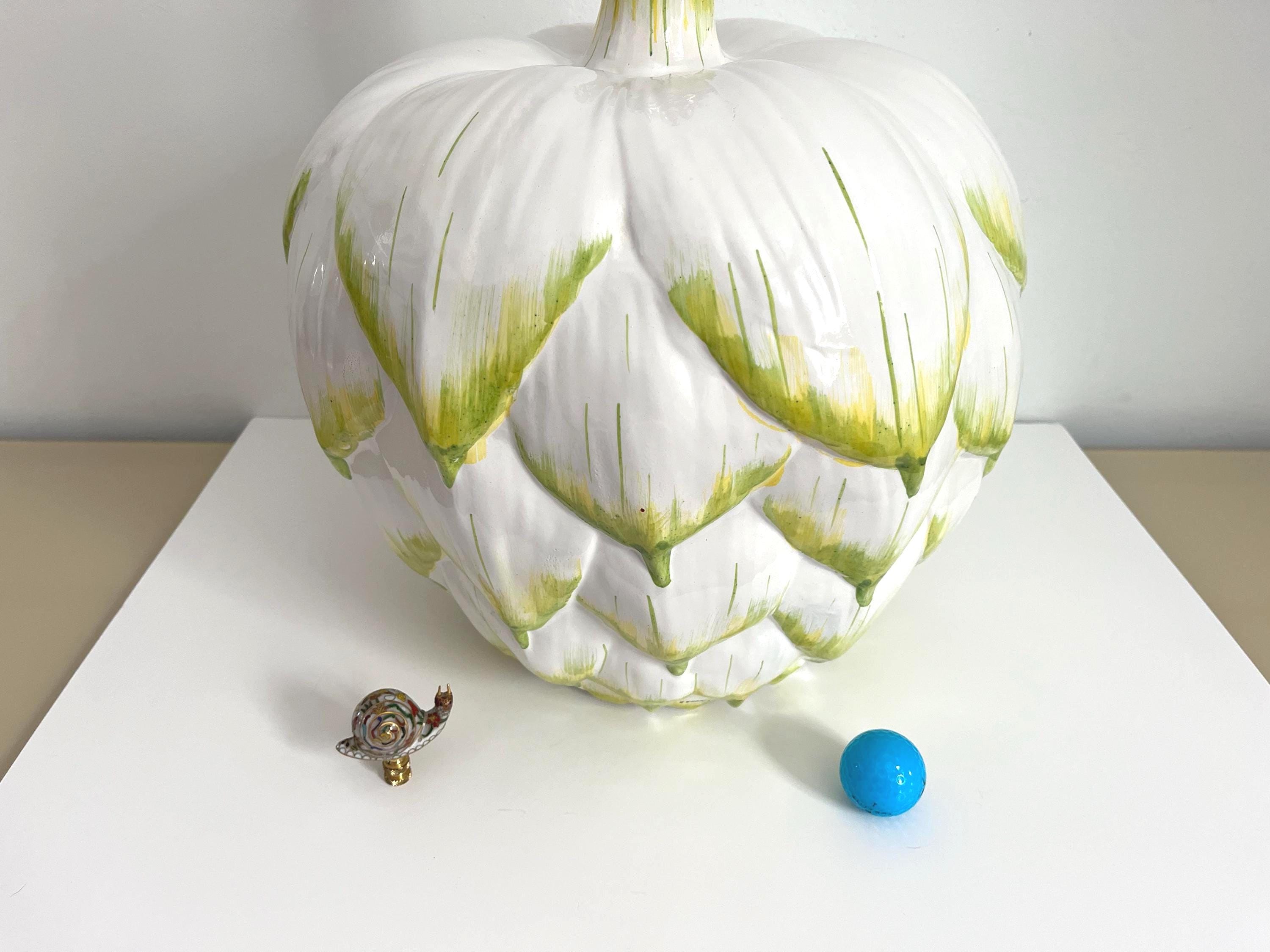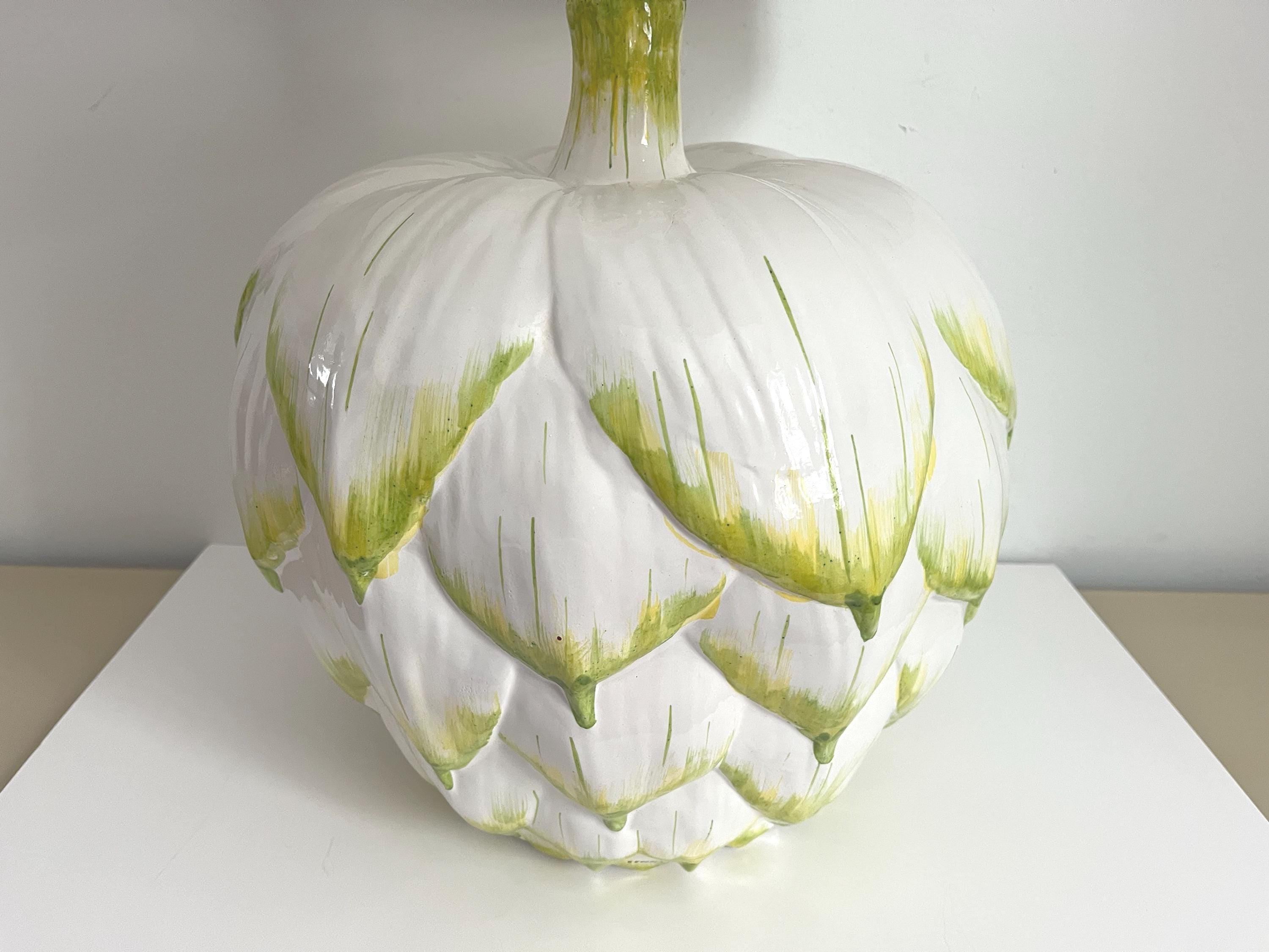Huge mid century Italian glazed ceramic artichoke lamp whimiscally designed like the real thing in saturated shades of green over white with overlapping layers of green tipped leaves. Marked Italy and F. Cooper.