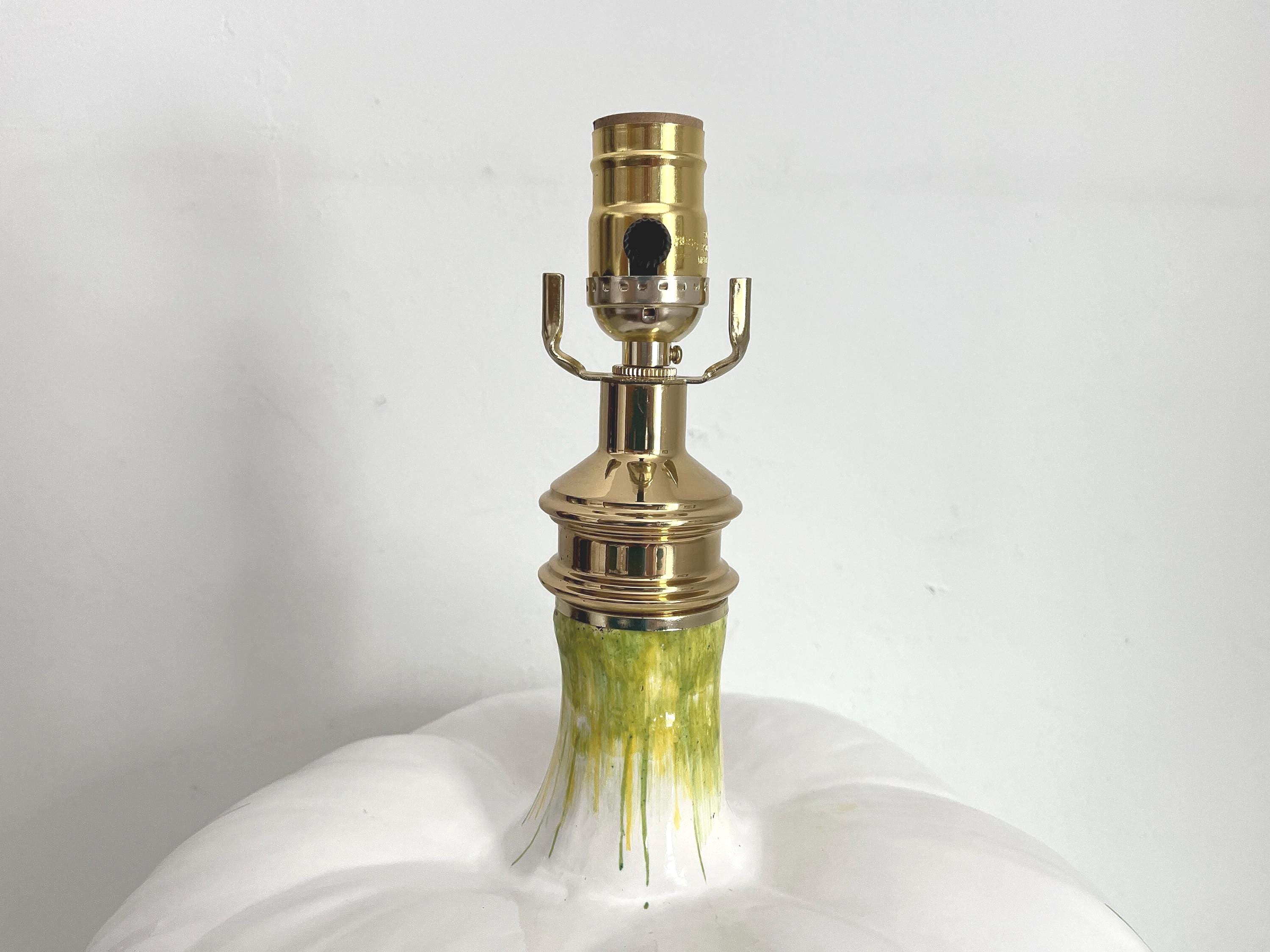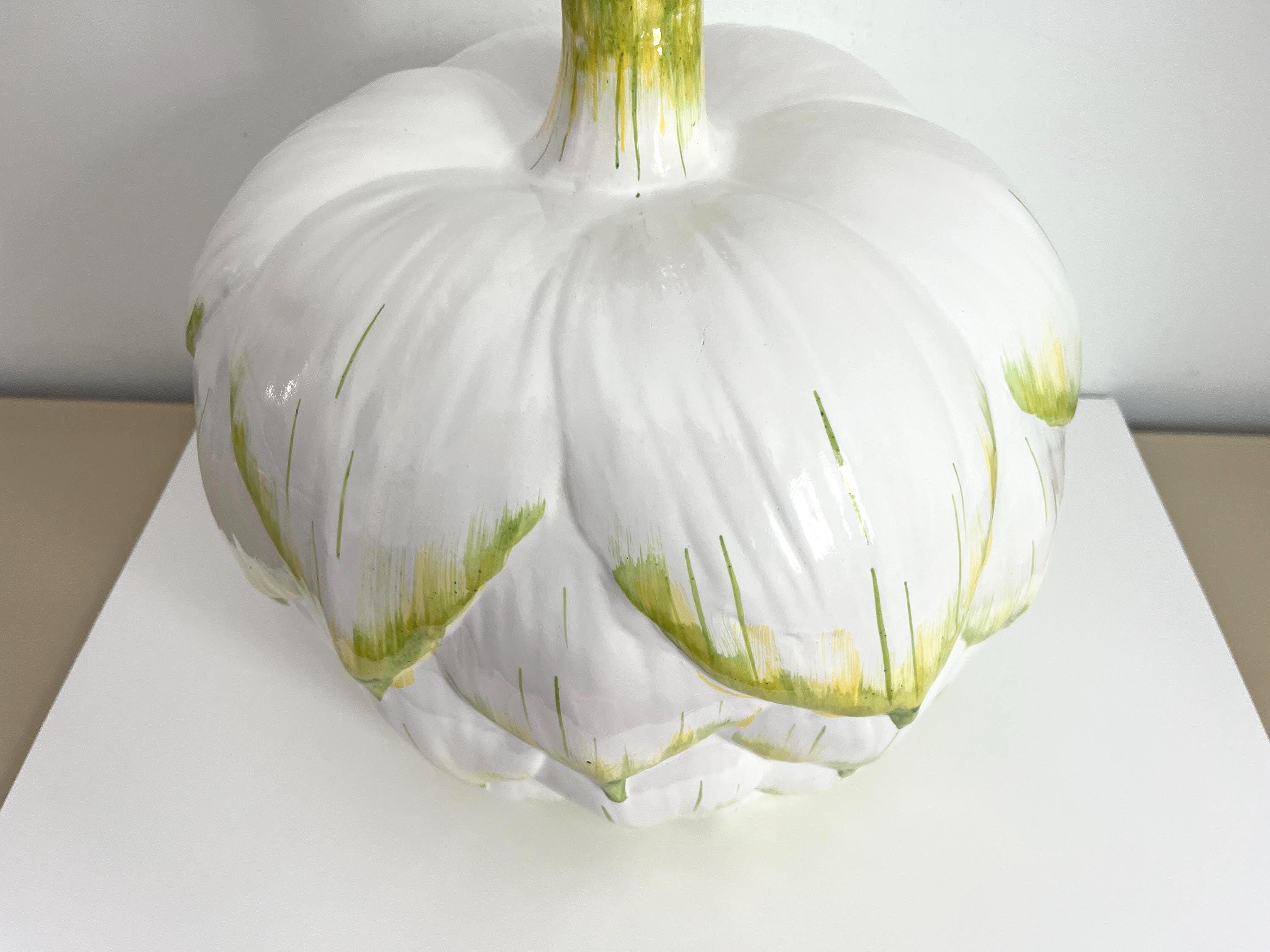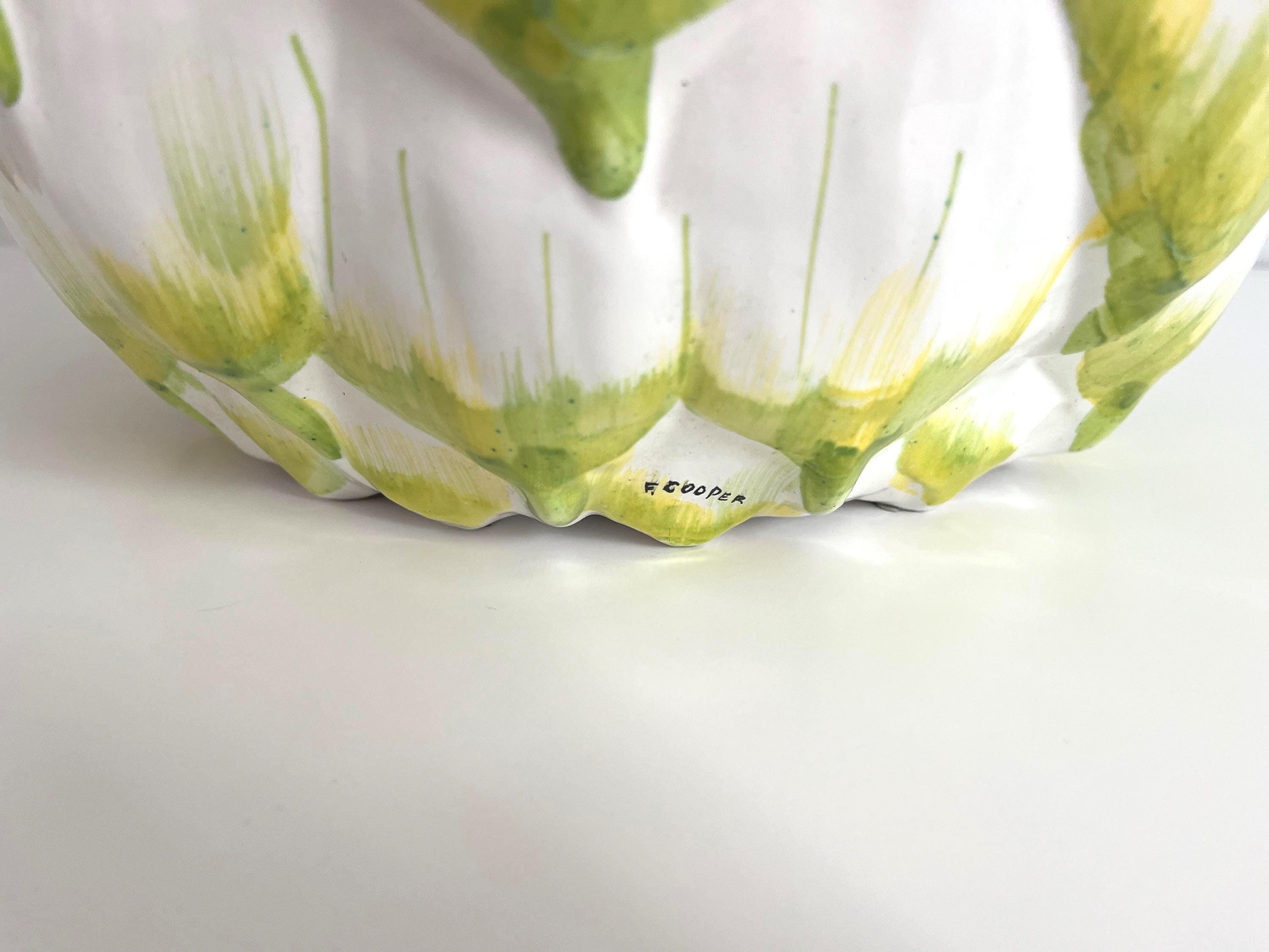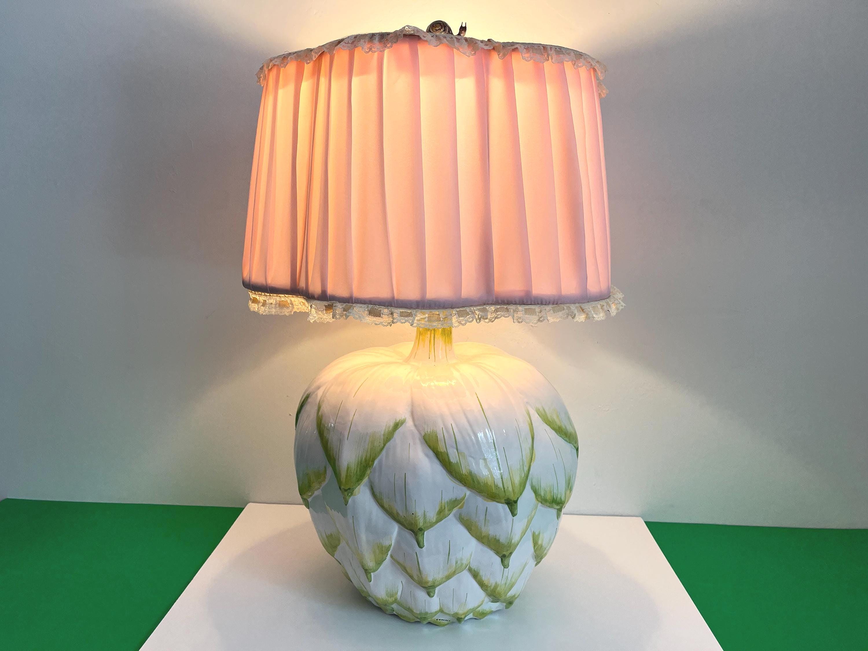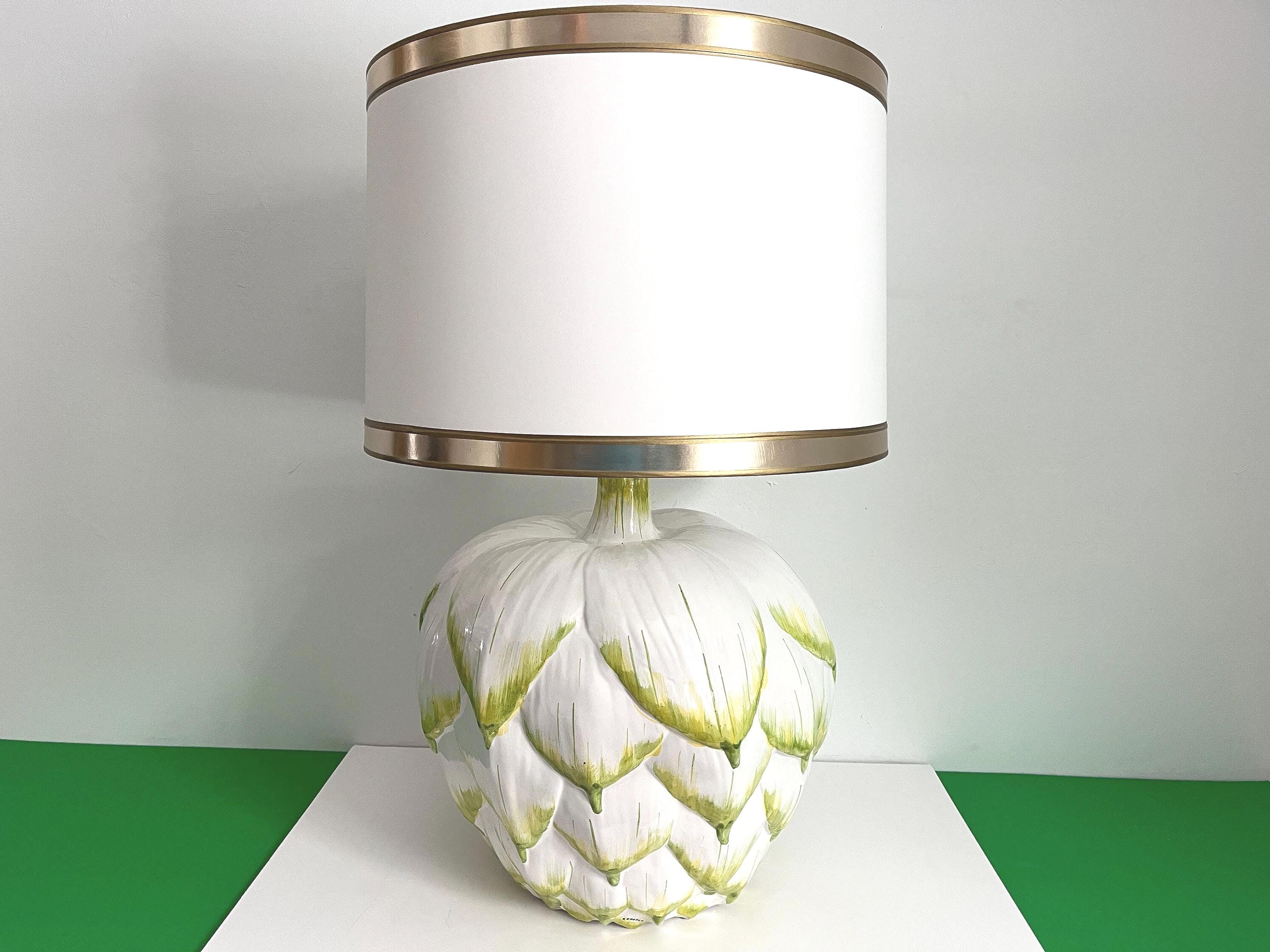 Huge mid century Italian glazed ceramic artichoke lamp whimiscally designed like the real thing in saturated shades of green over white with overlapping layers of green tipped leaves. Marked Italy and F. Cooper.