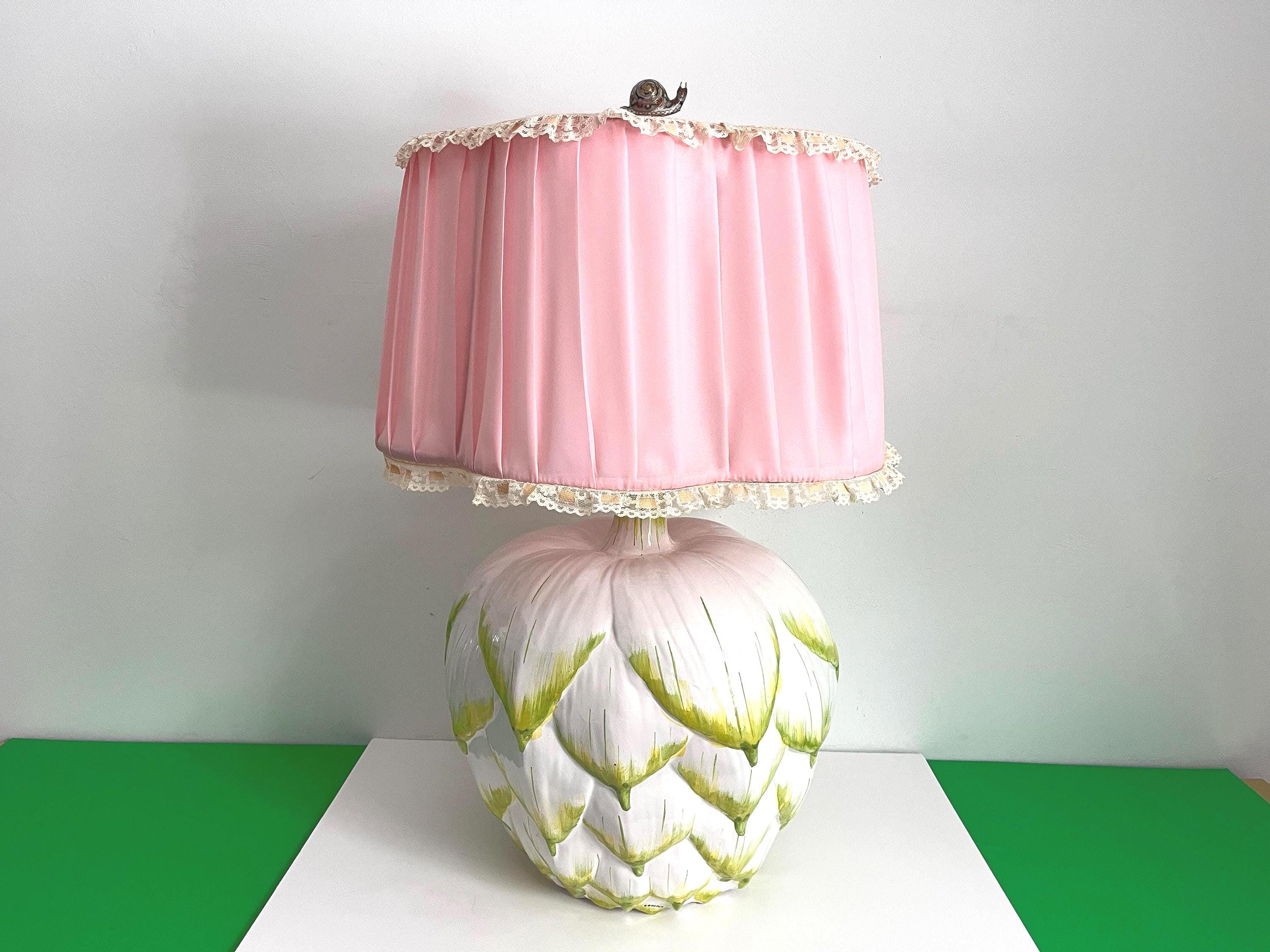 In great VINTAGE condition with light marks and imperfections under the glaze. Pink shade has patina, wear, marks, and makes this big piece happy and fun. But if you want to elevate the lamp, or put it in a formal setting, a more refined shade would make sense.