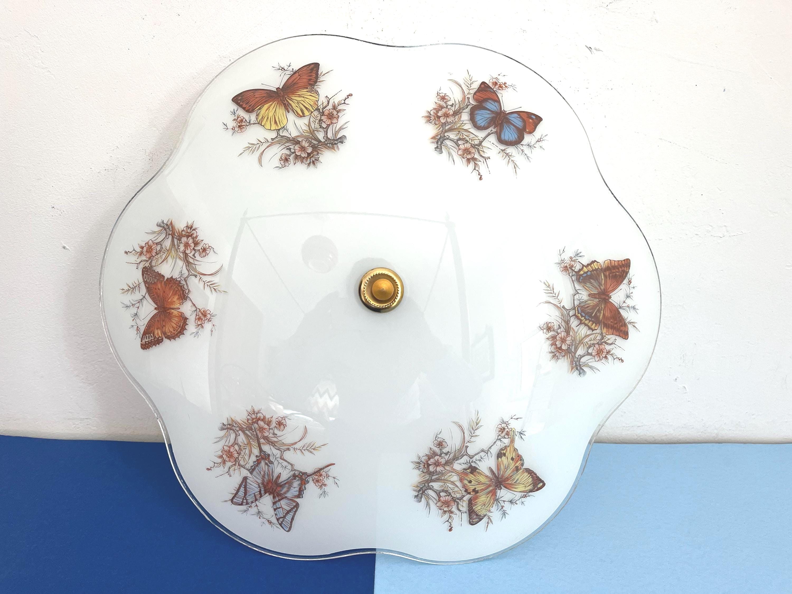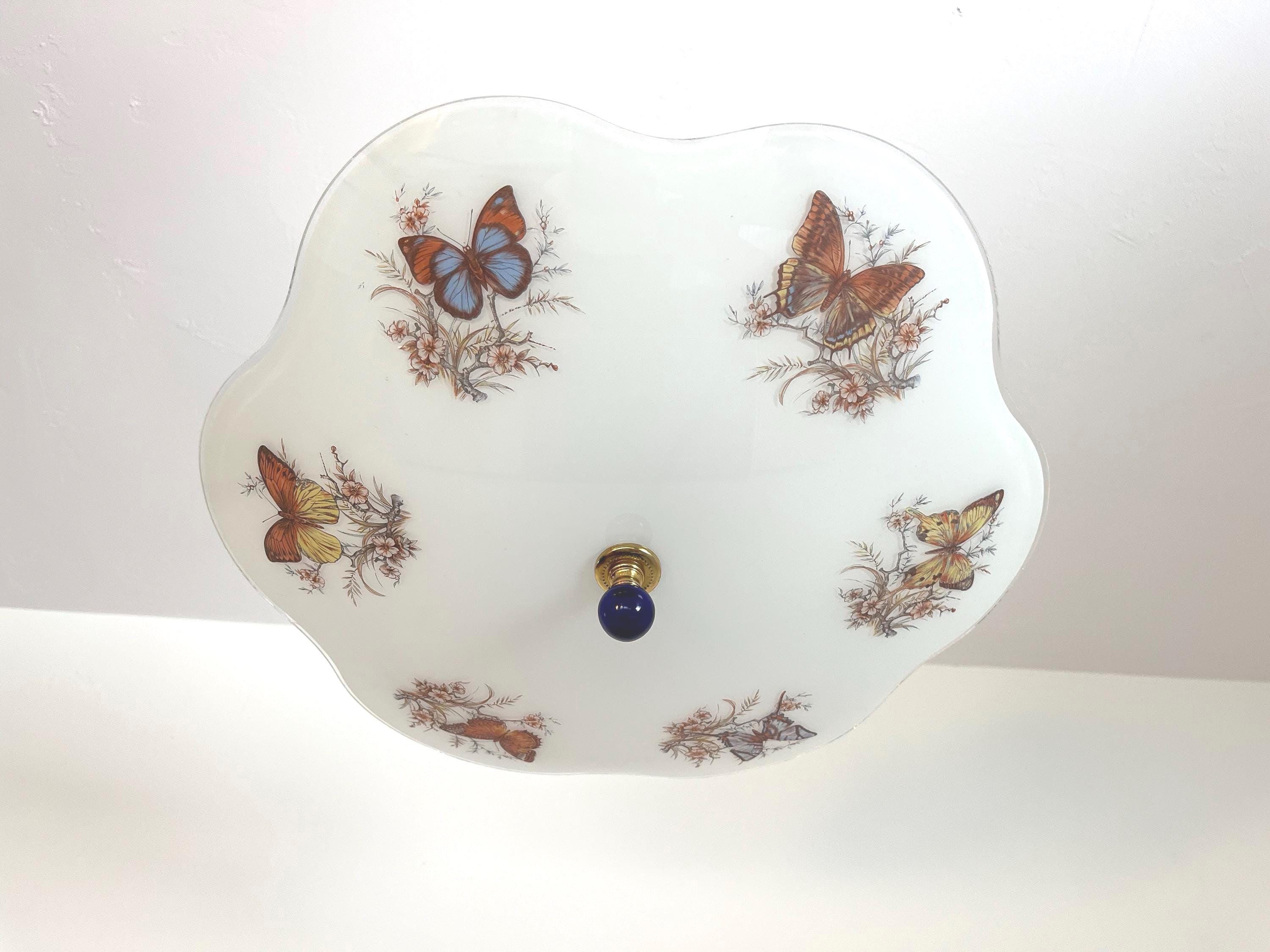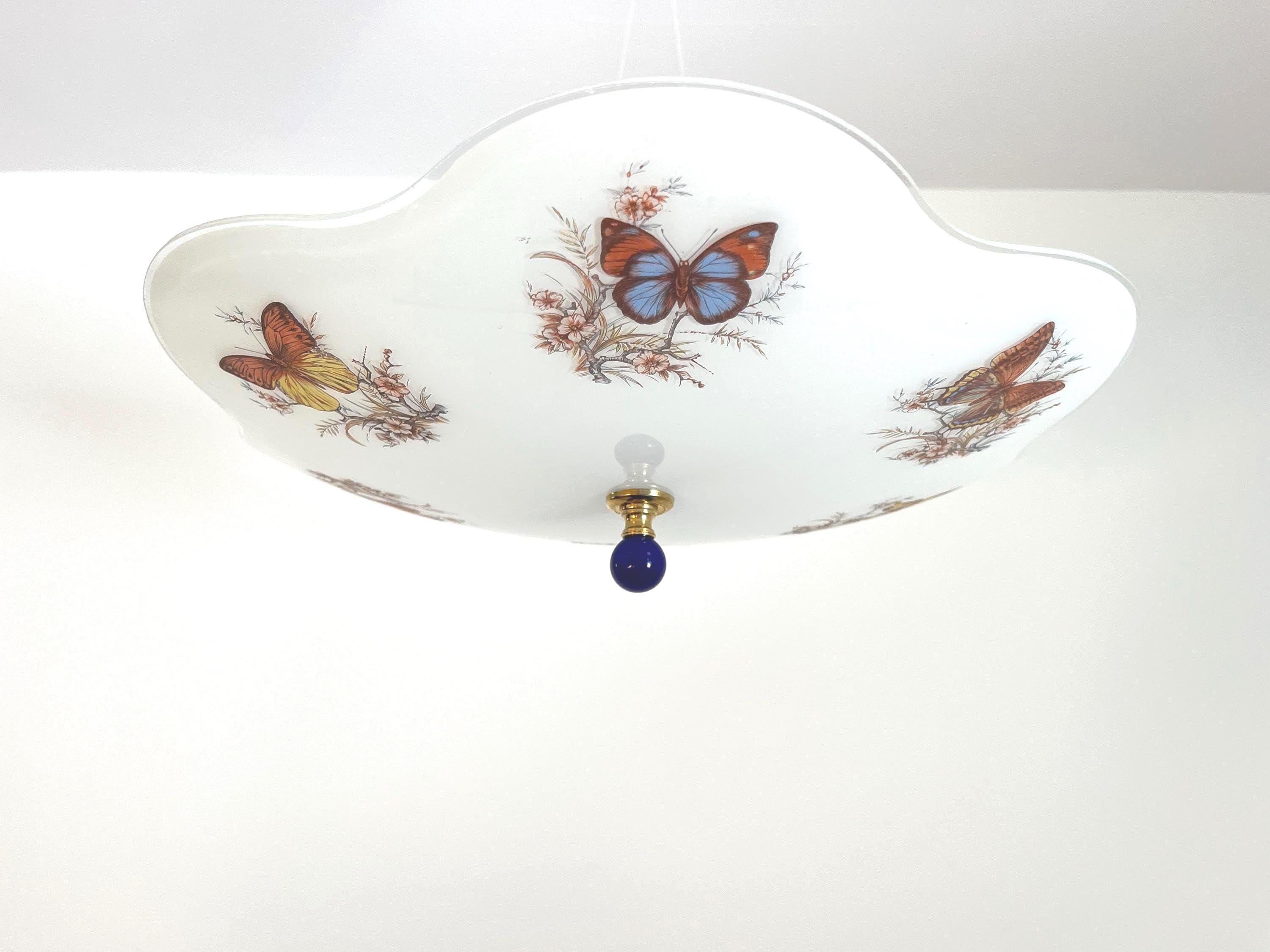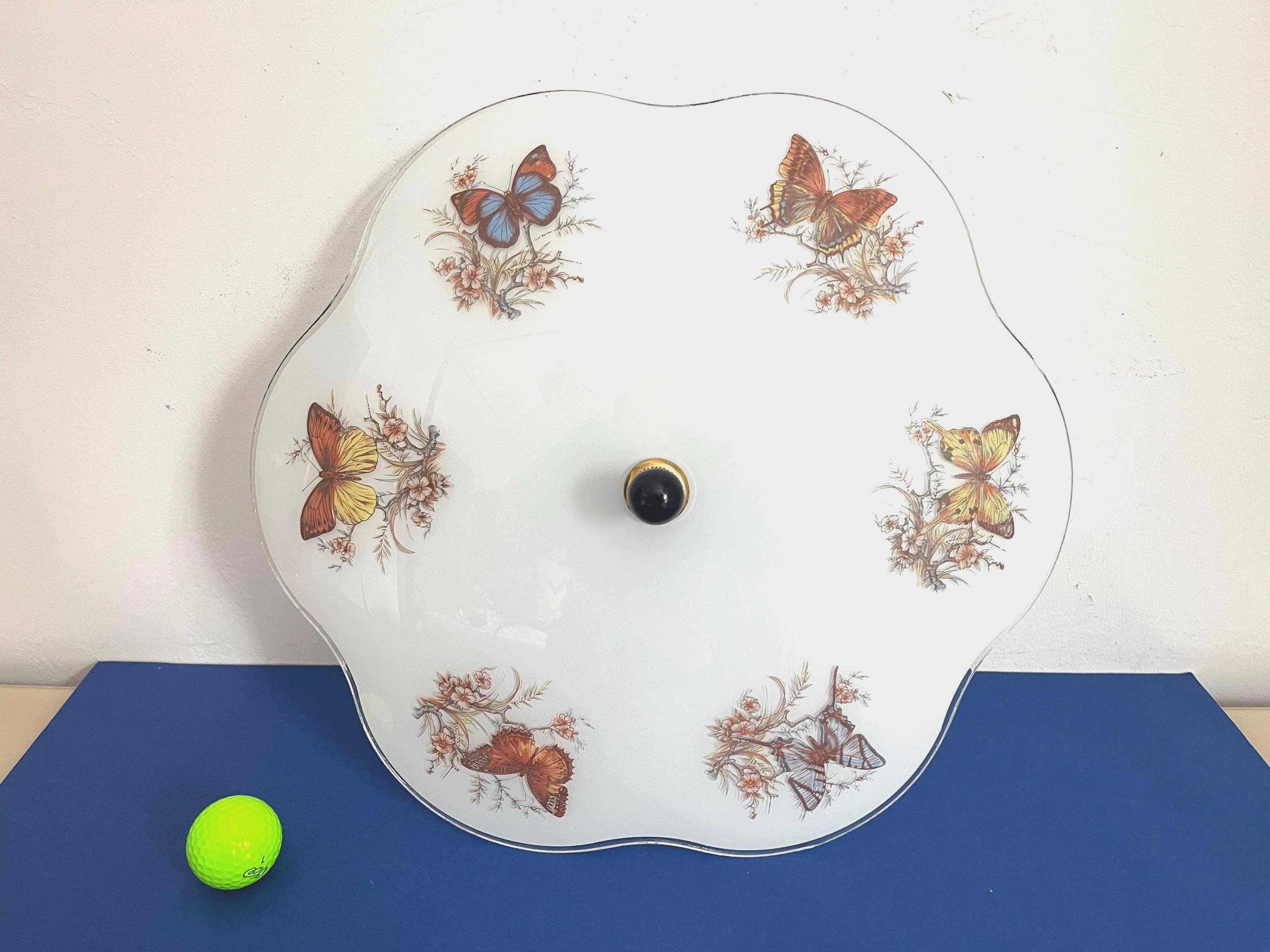 Lovely mid century frosted glass ceiling light accented by a ring of colorful butterfly specimens on flowering branches with airy ruffled transparent border and two lights.