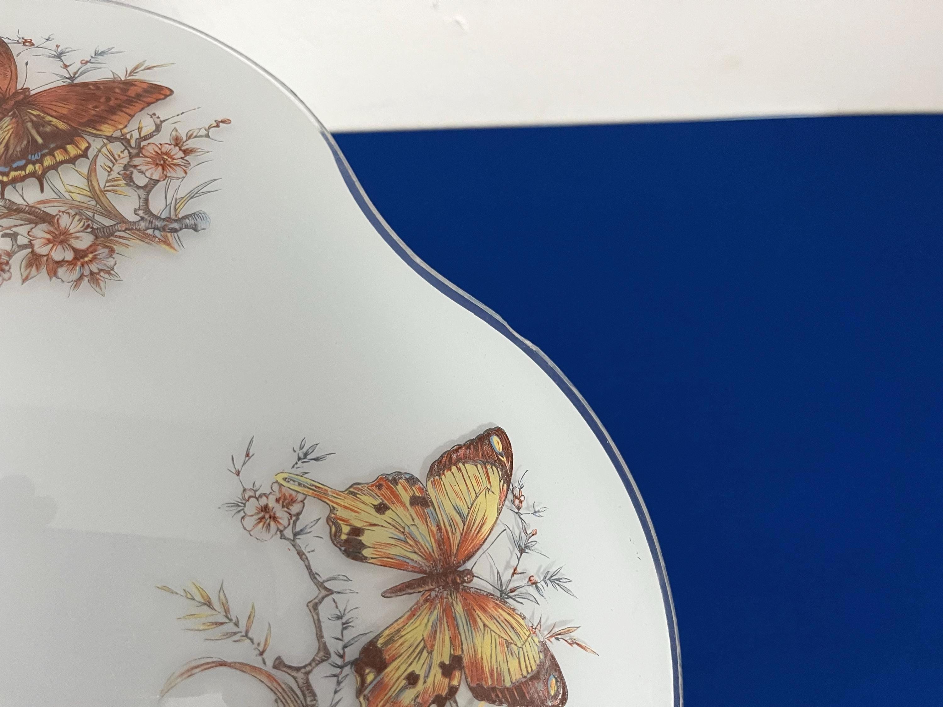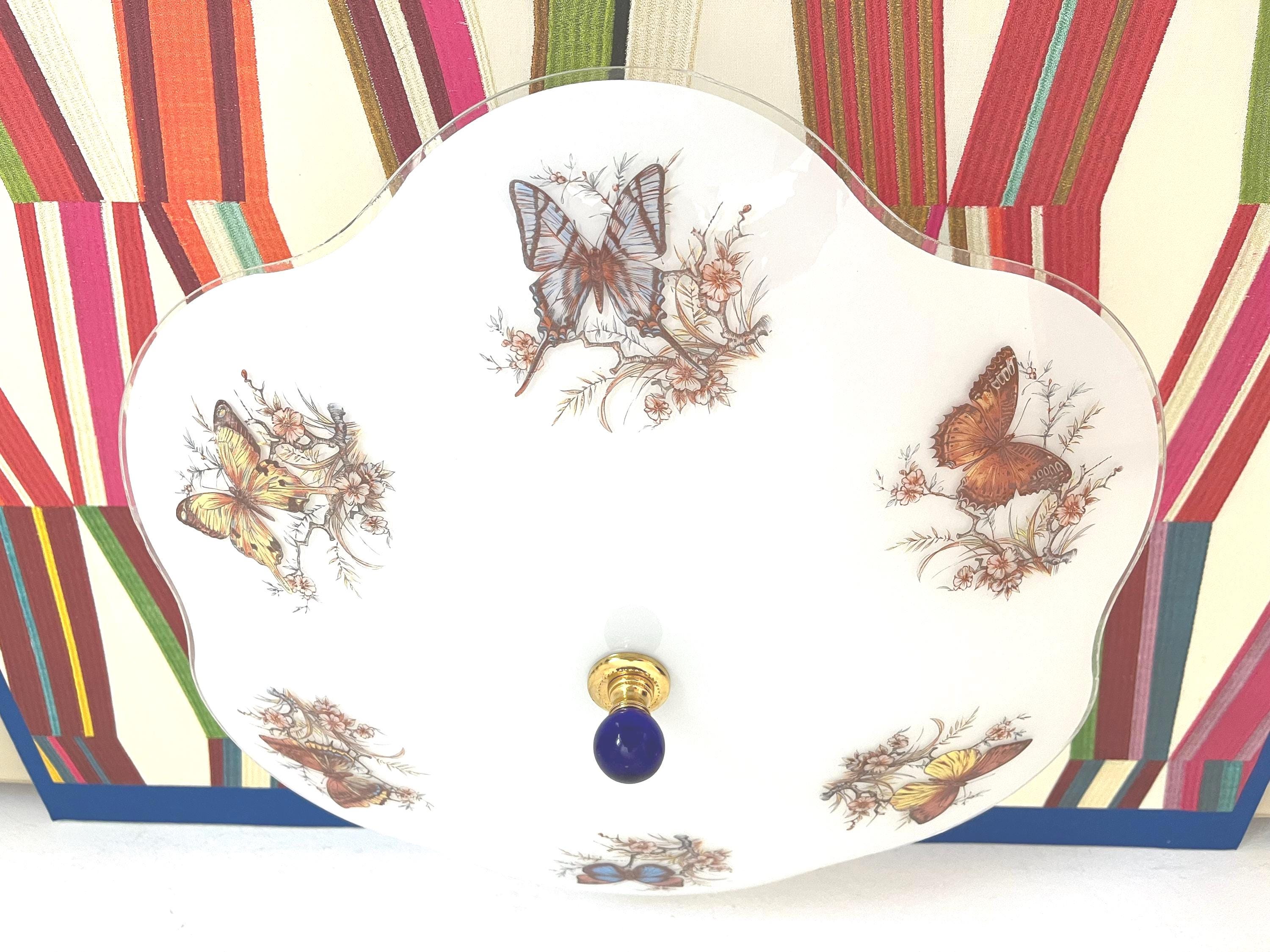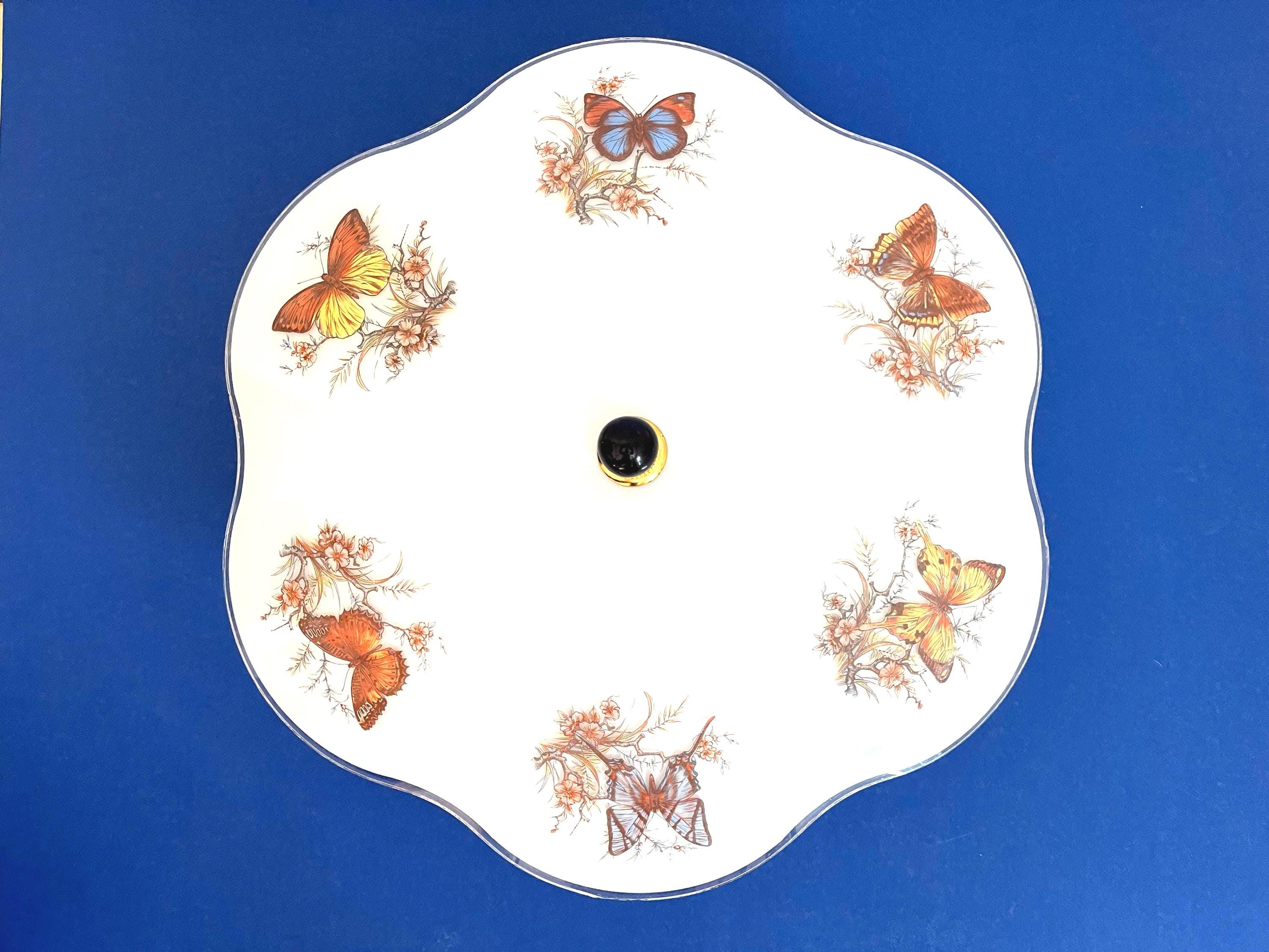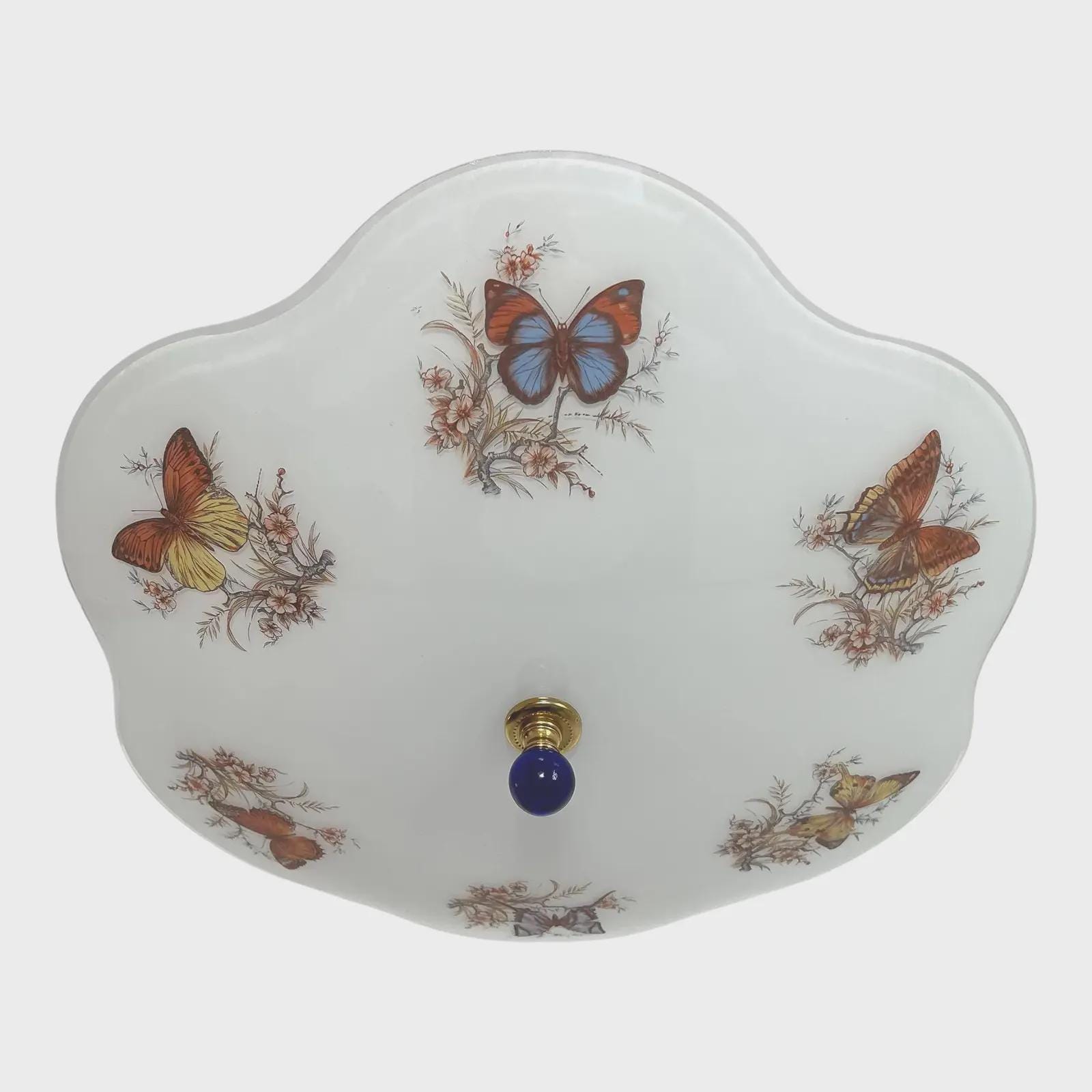 Lovely mid century frosted glass ceiling light accented by a ring of colorful butterfly specimens on flowering branches with airy ruffled transparent border and two lights.