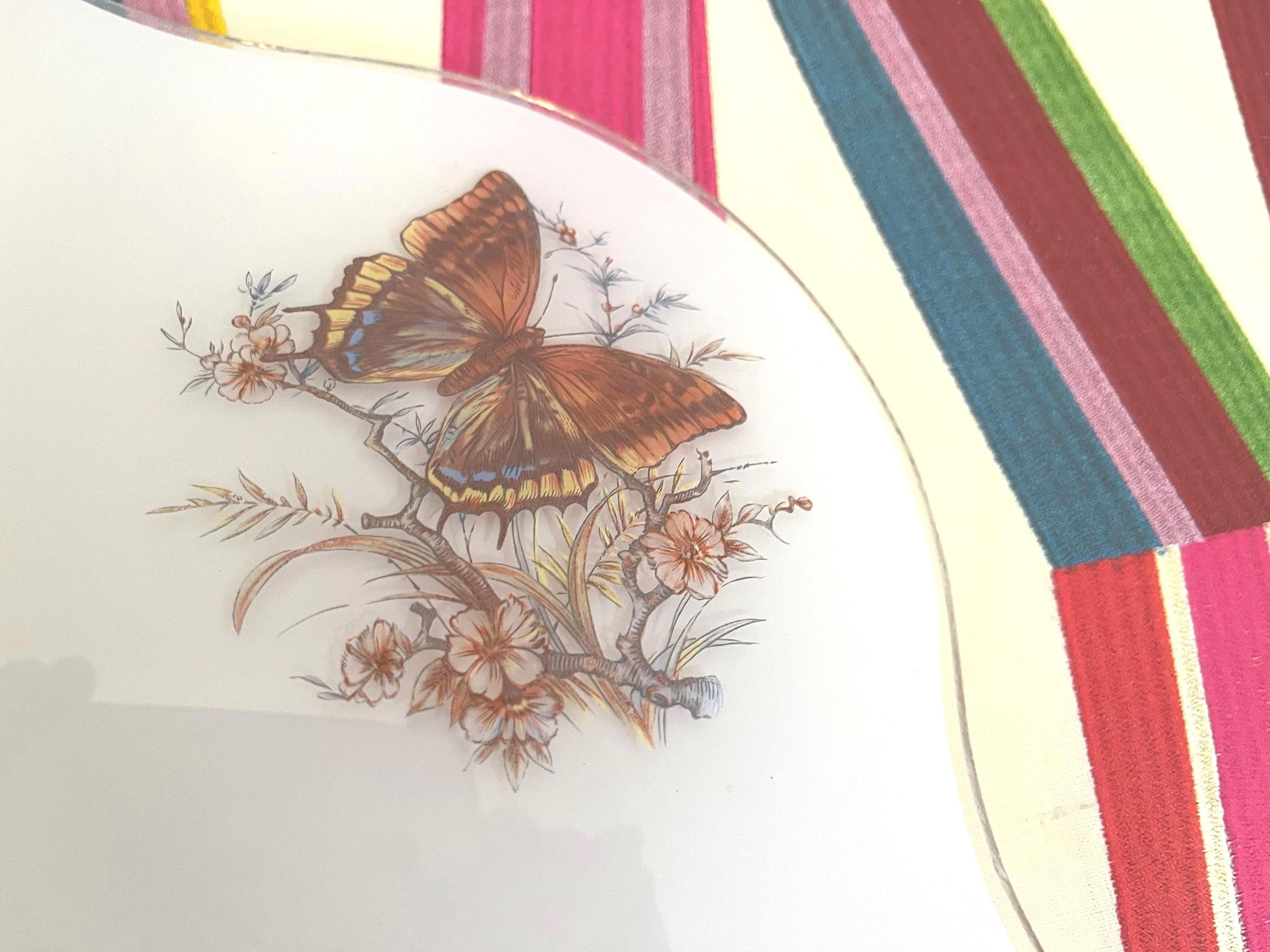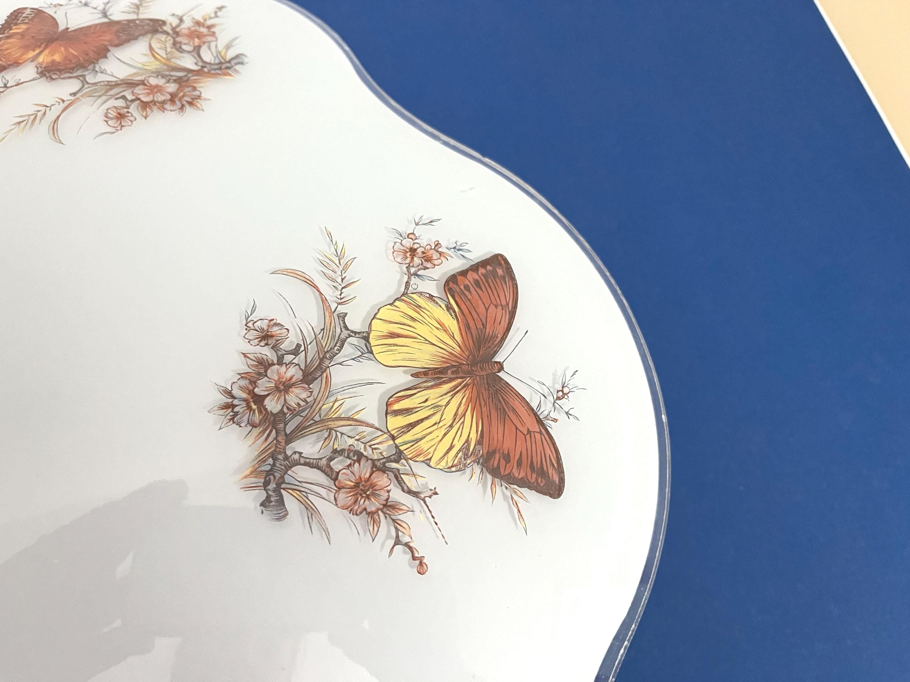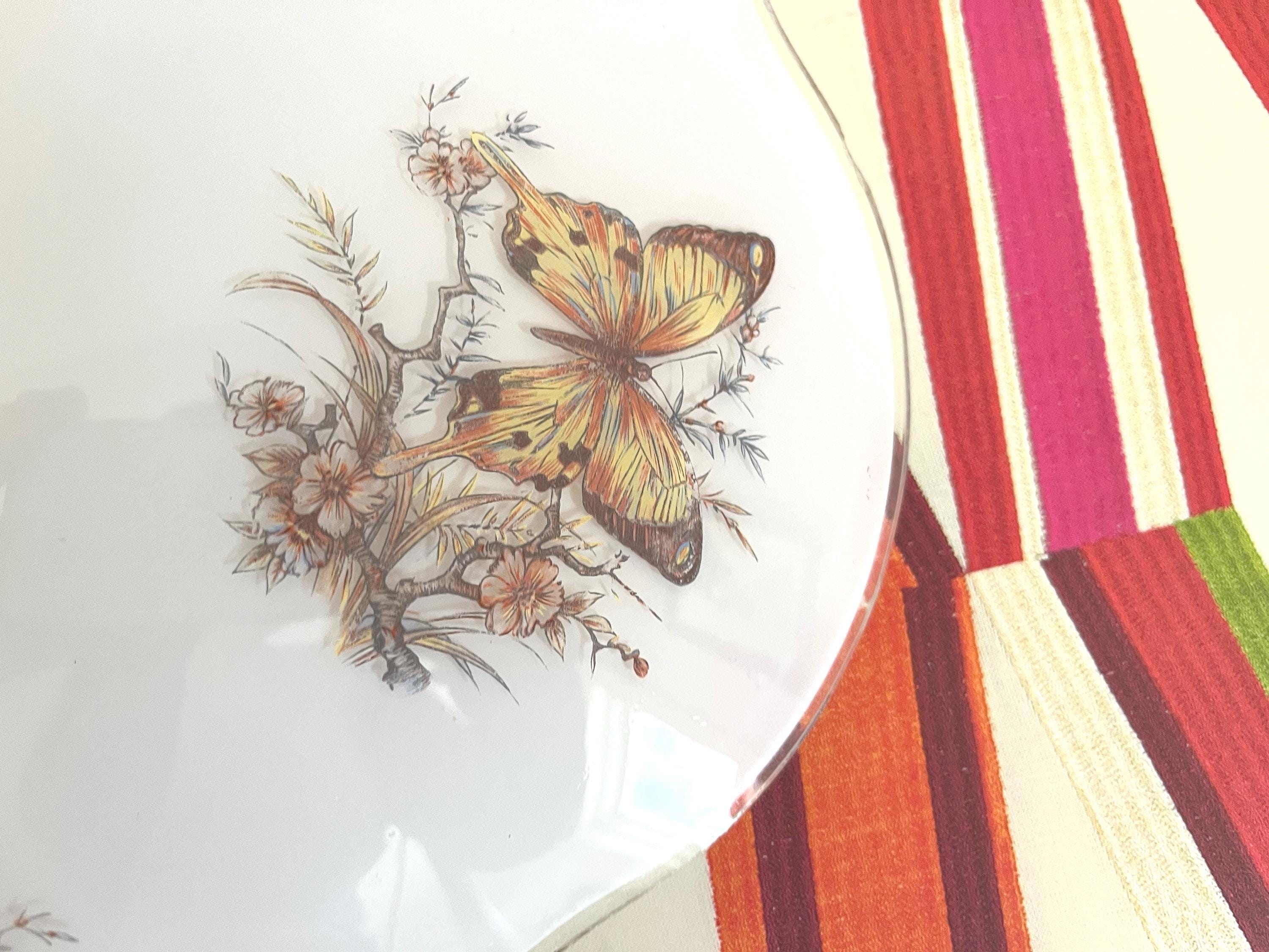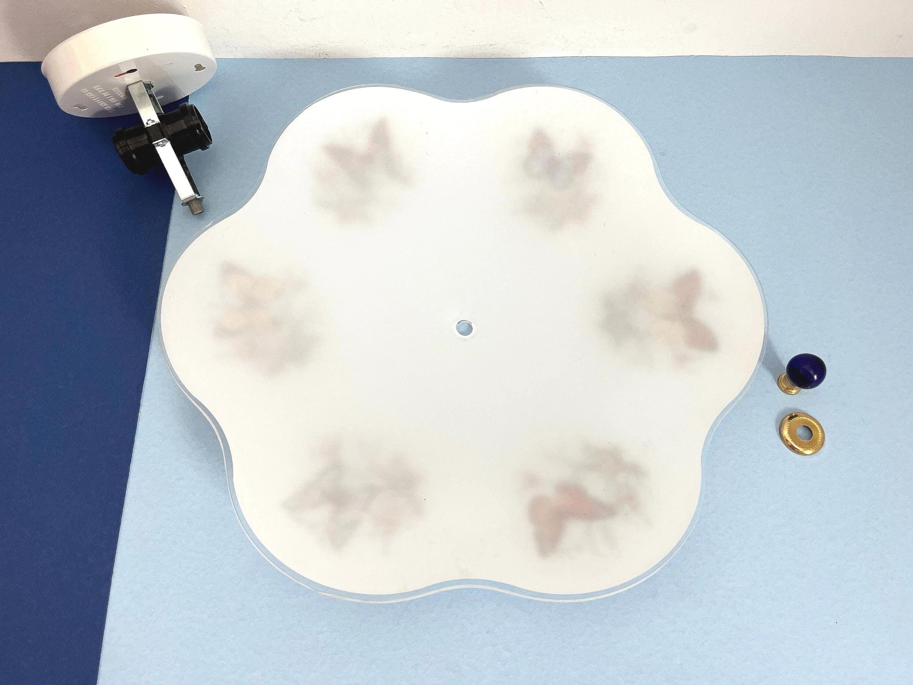 Lovely mid century frosted glass ceiling light accented by a ring of colorful butterfly specimens on flowering branches with airy ruffled transparent border and two lights.