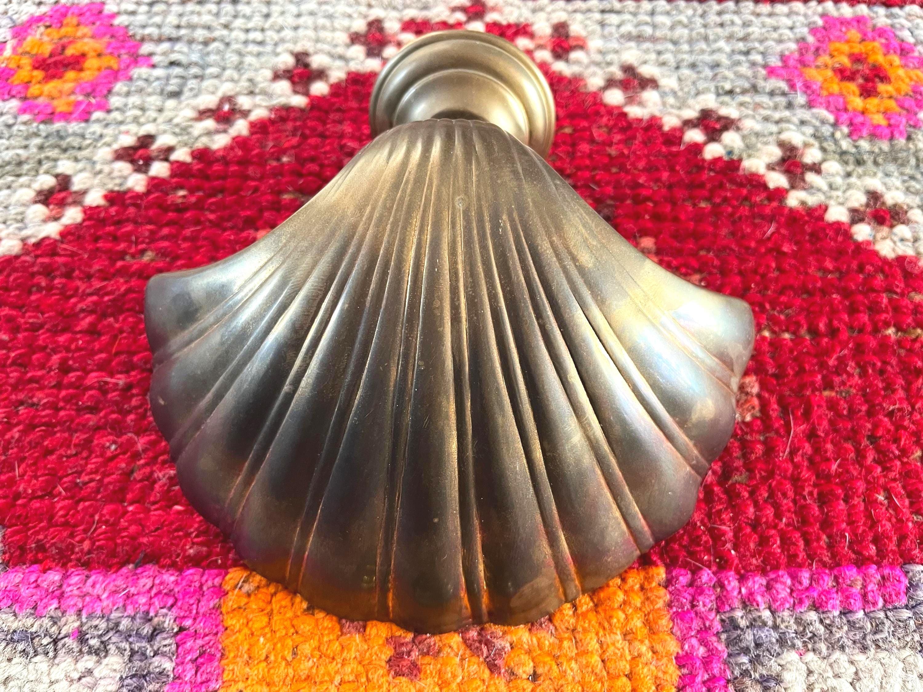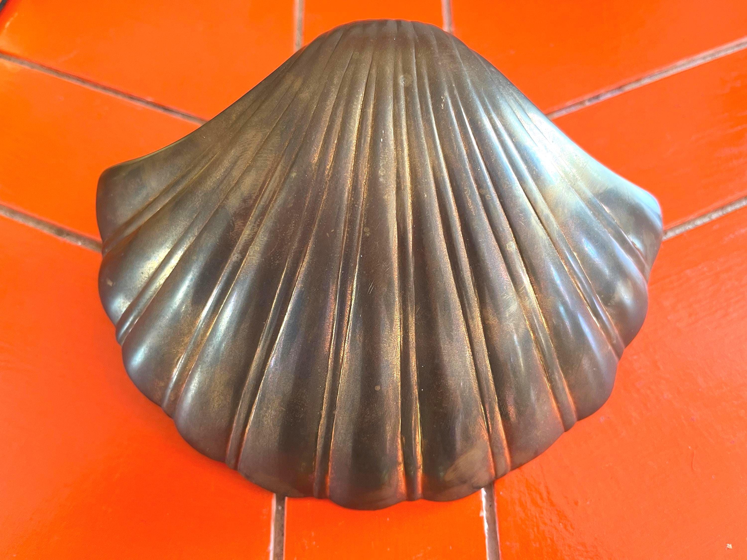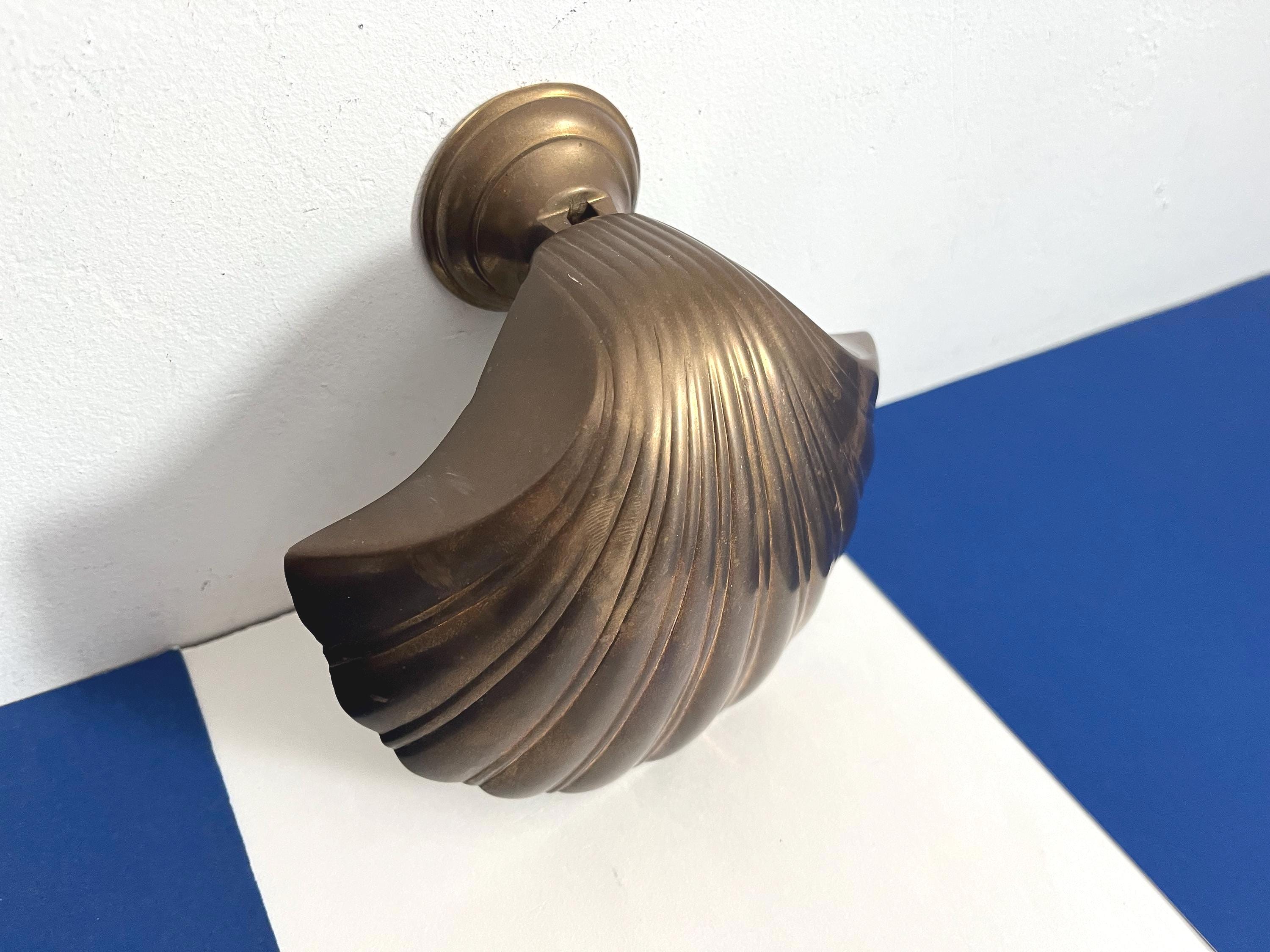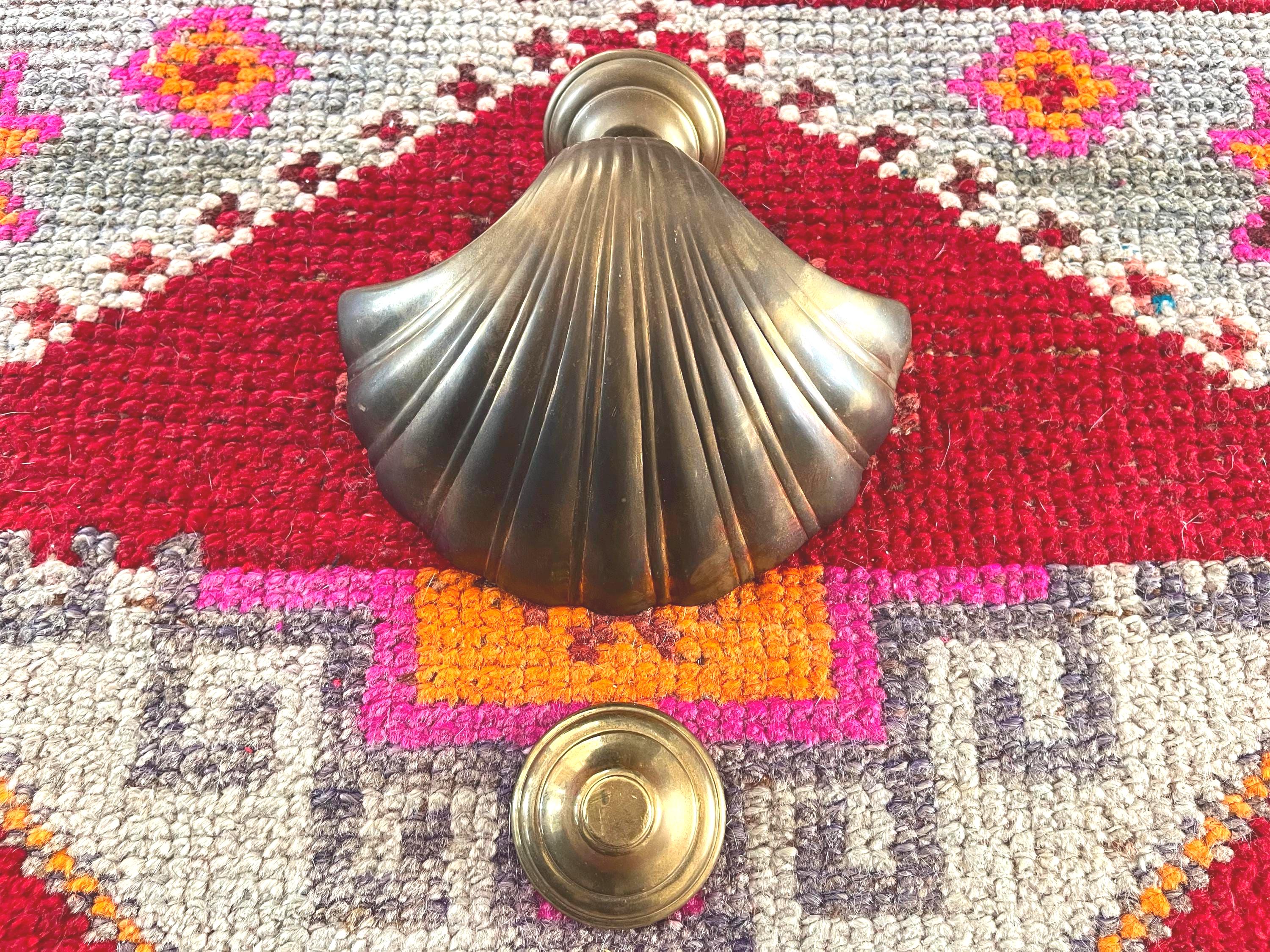 Big beautiful brass clam shell door knocker from the 1960s/70s with sleek incised curvy lines, aged finish, and original strike plate. Marked, made in India.