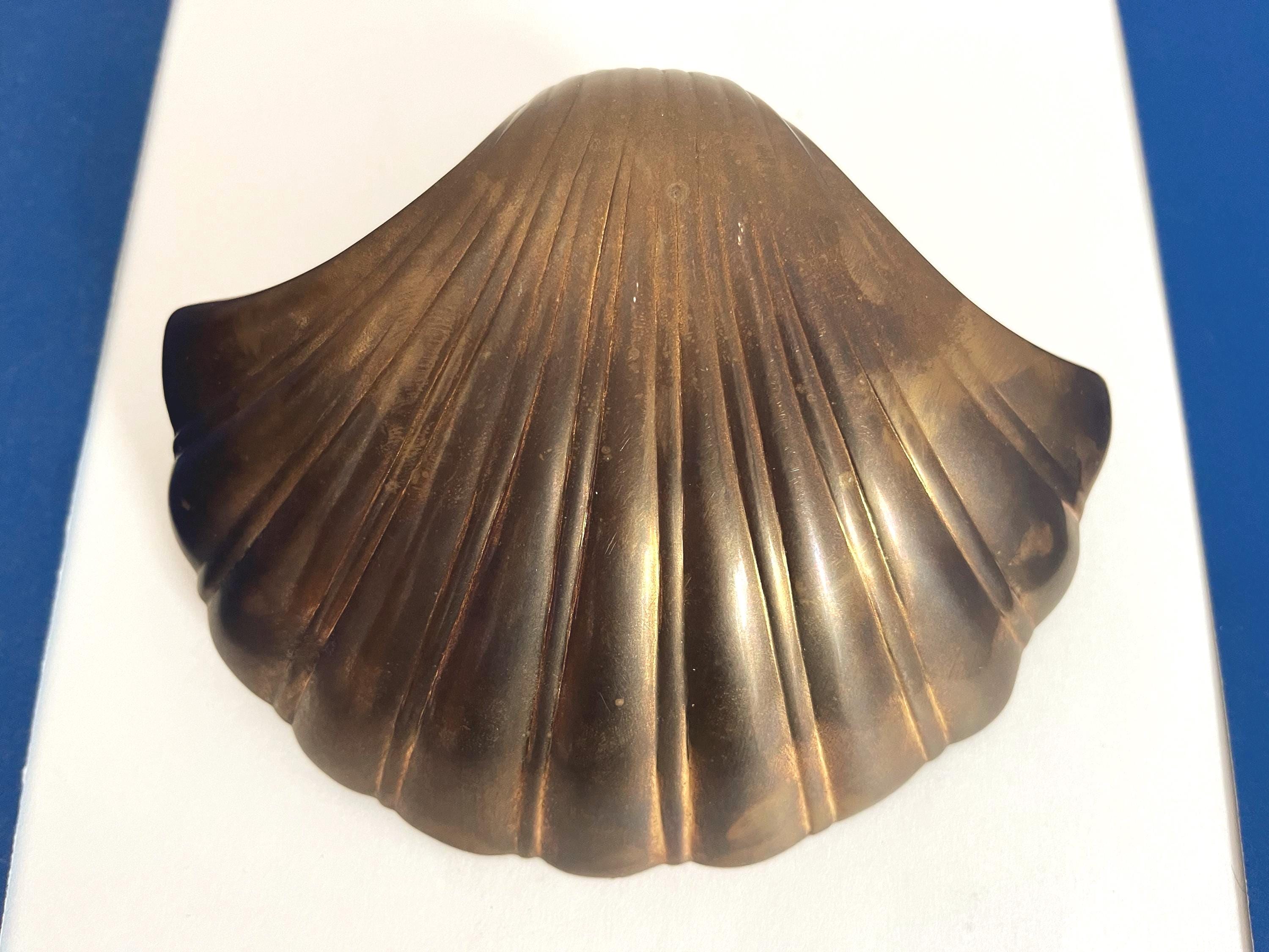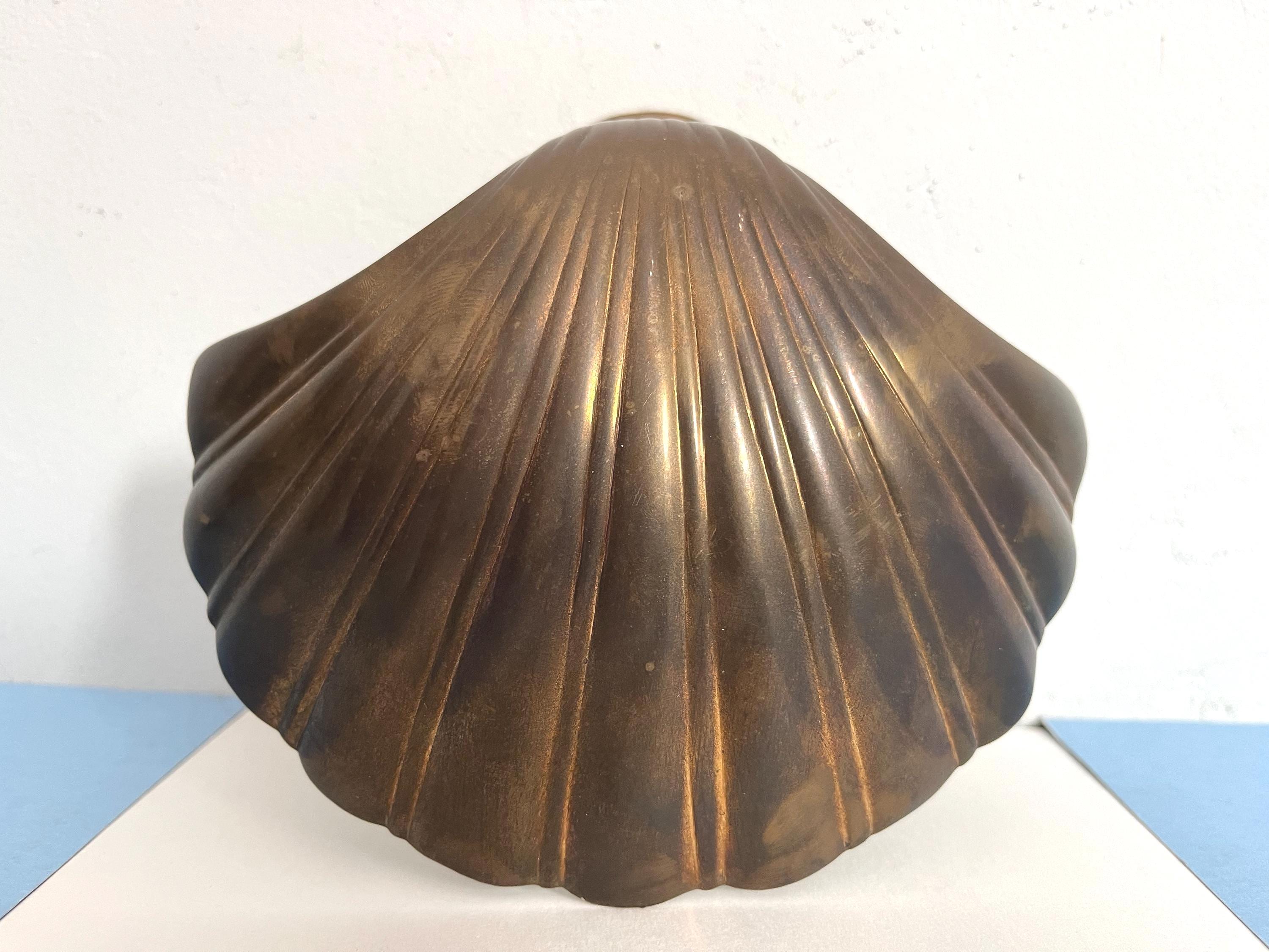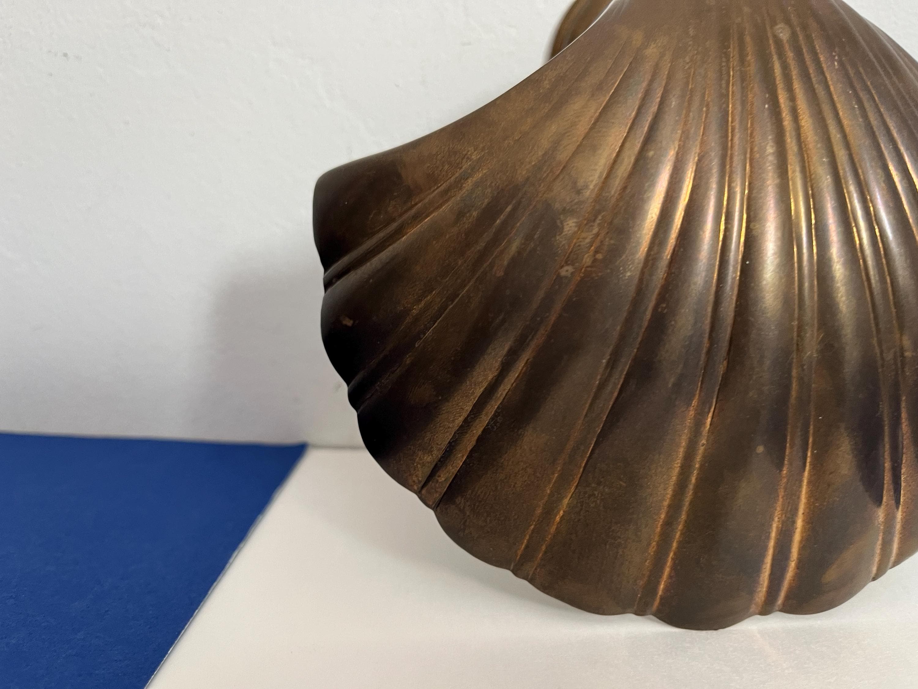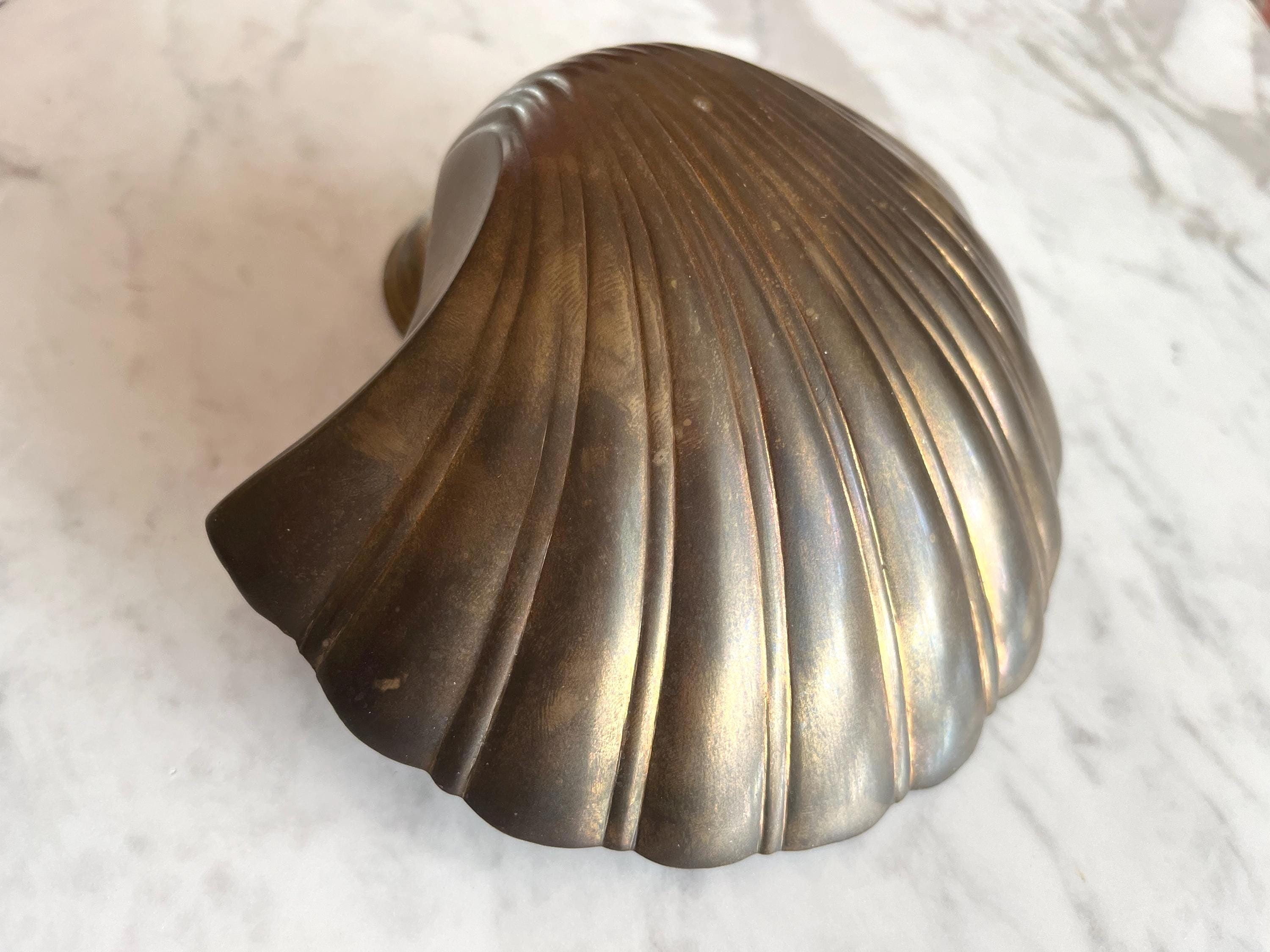 Big beautiful brass clam shell door knocker from the 1960s/70s with sleek incised curvy lines, aged finish, and original strike plate. Marked, made in India.