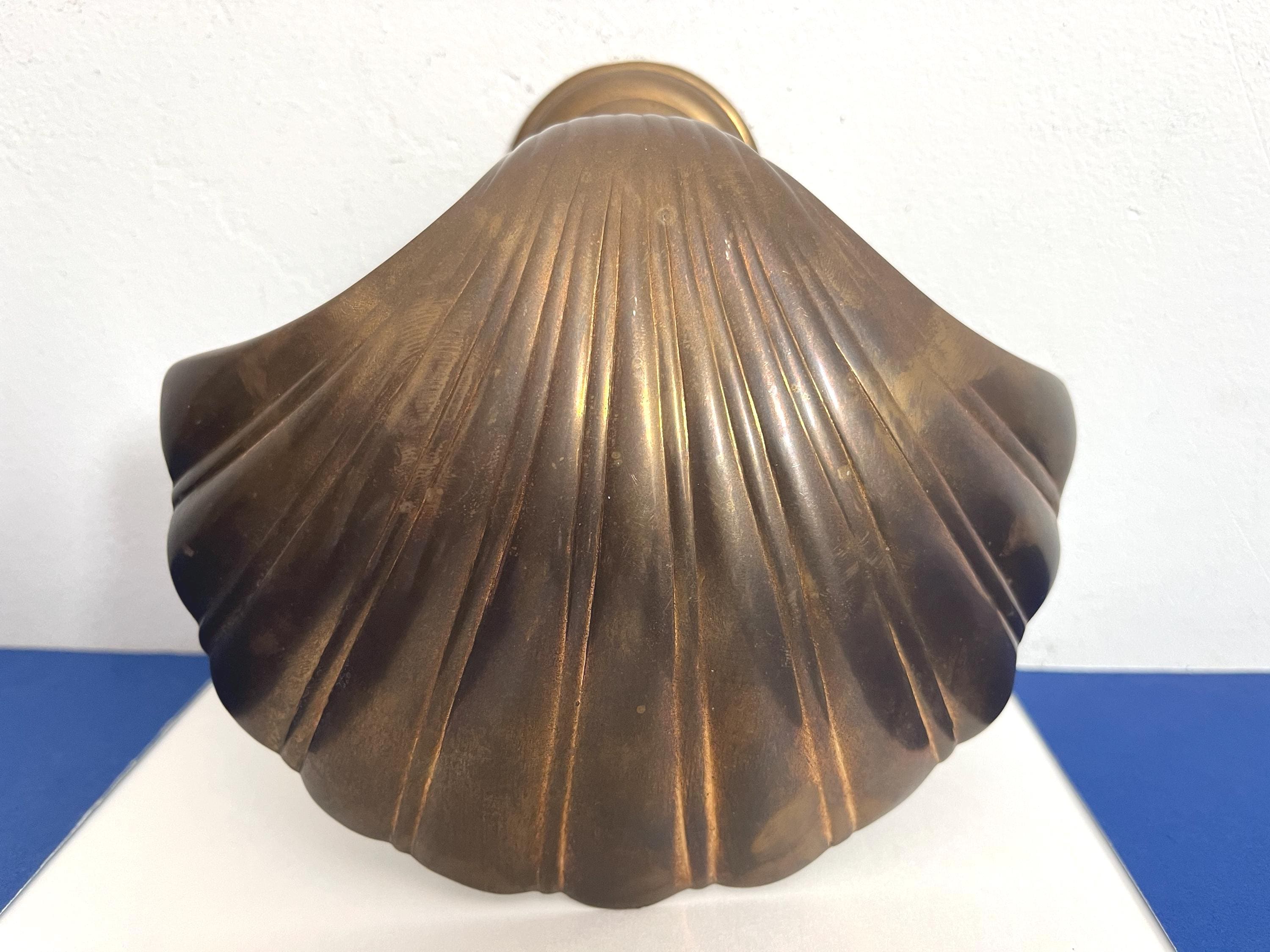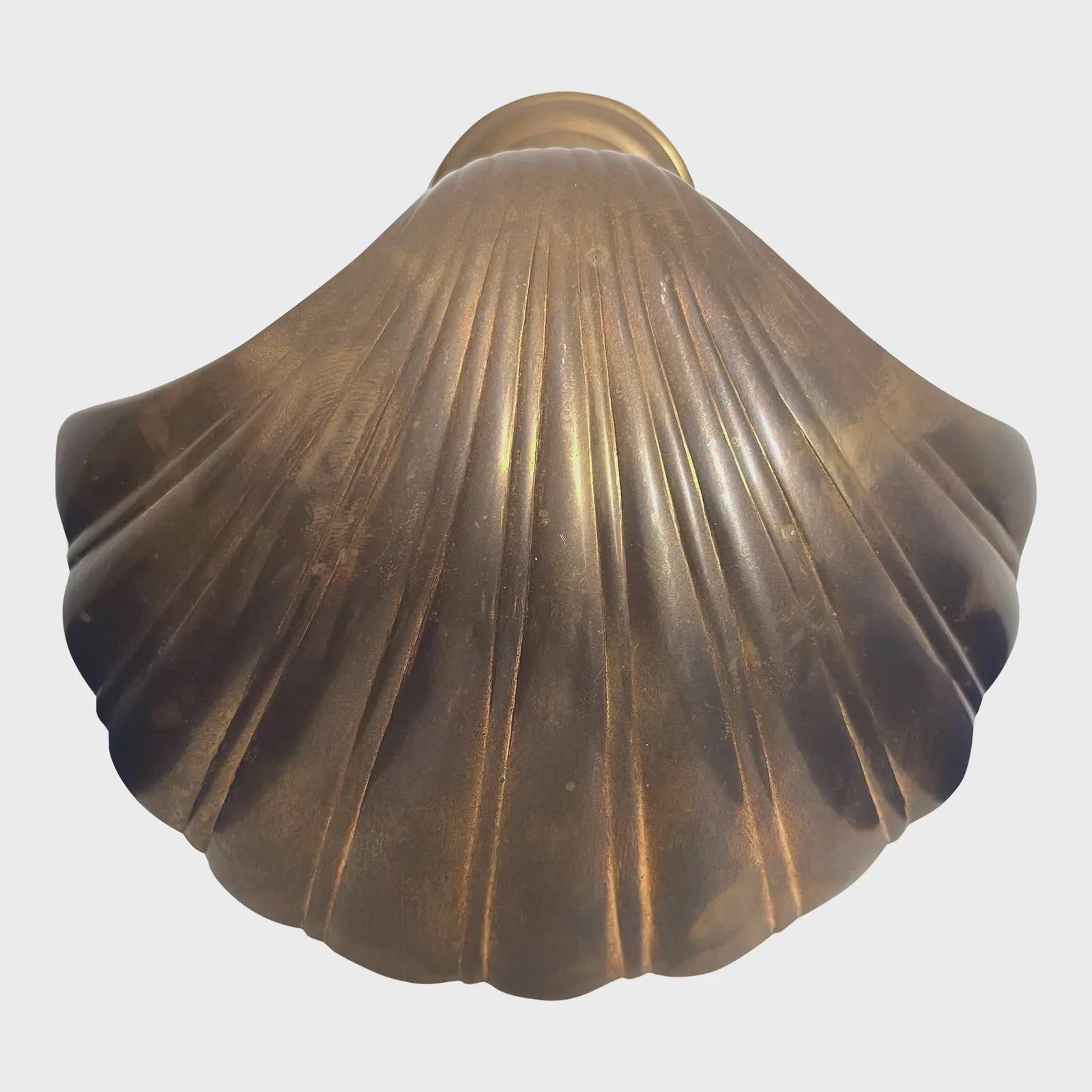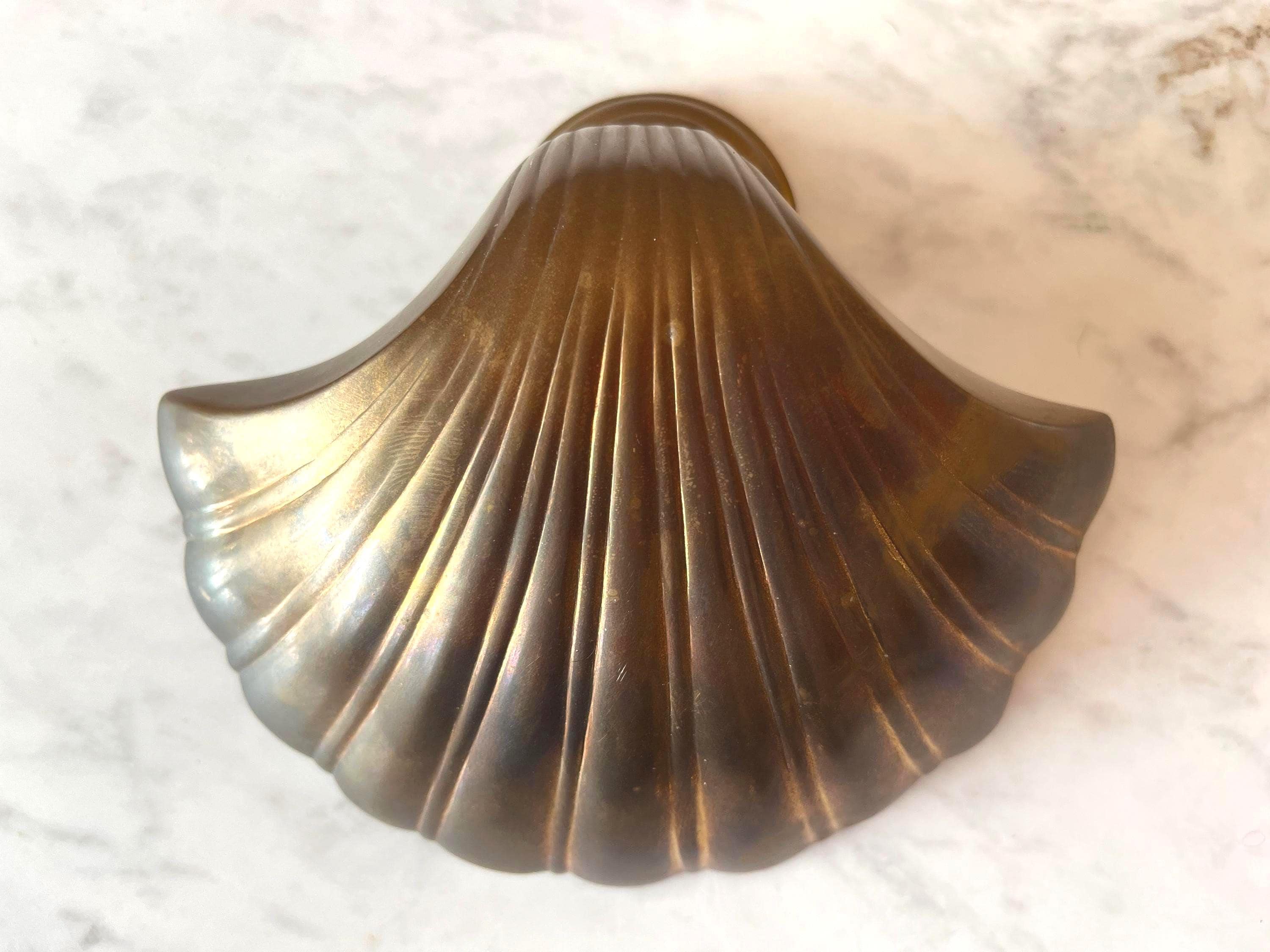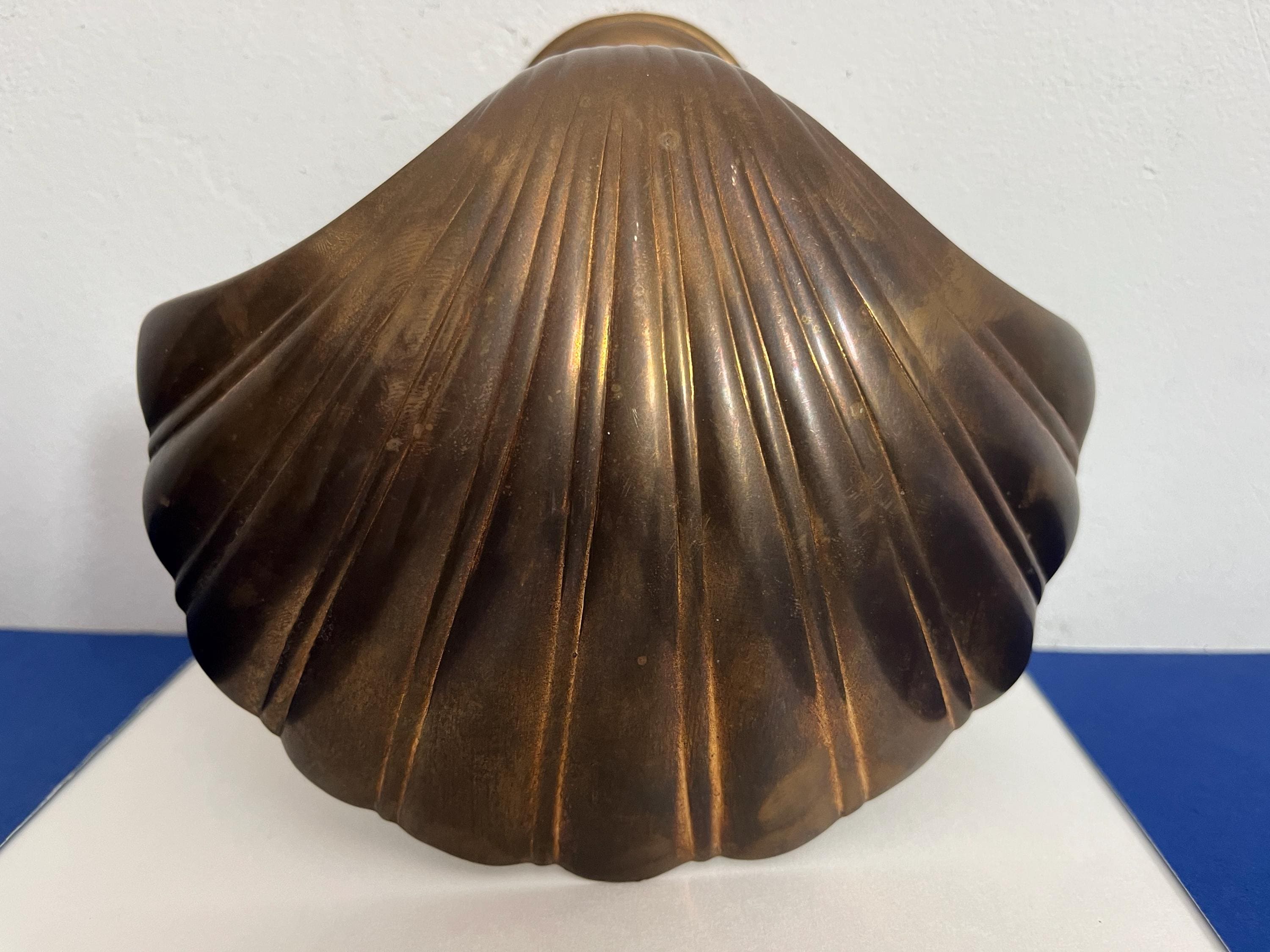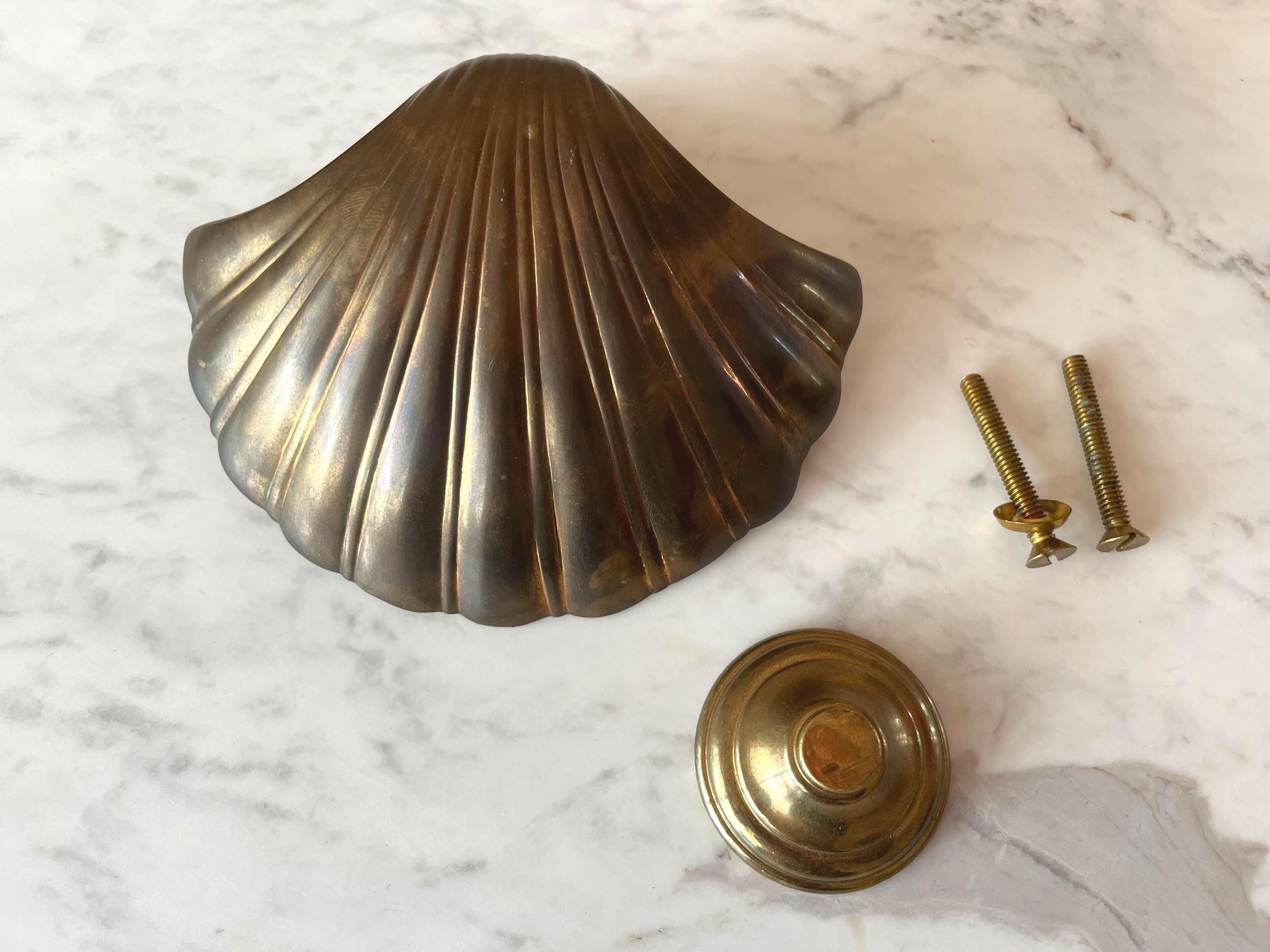 Big beautiful brass clam shell door knocker from the 1960s/70s with sleek incised curvy lines, aged finish, and original strike plate. Marked, made in India.